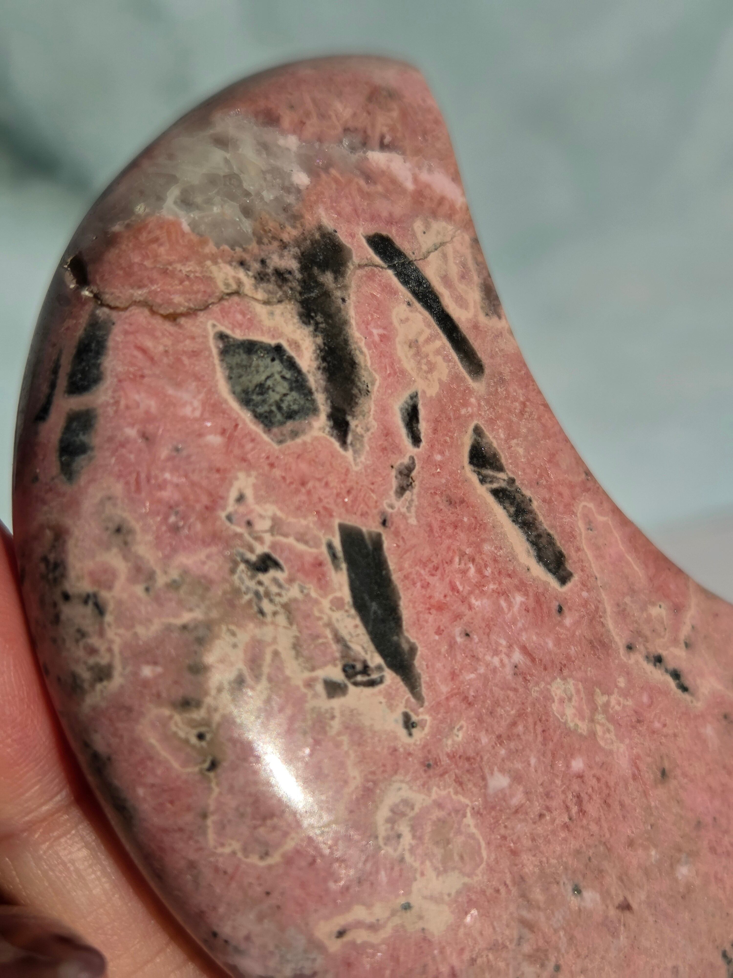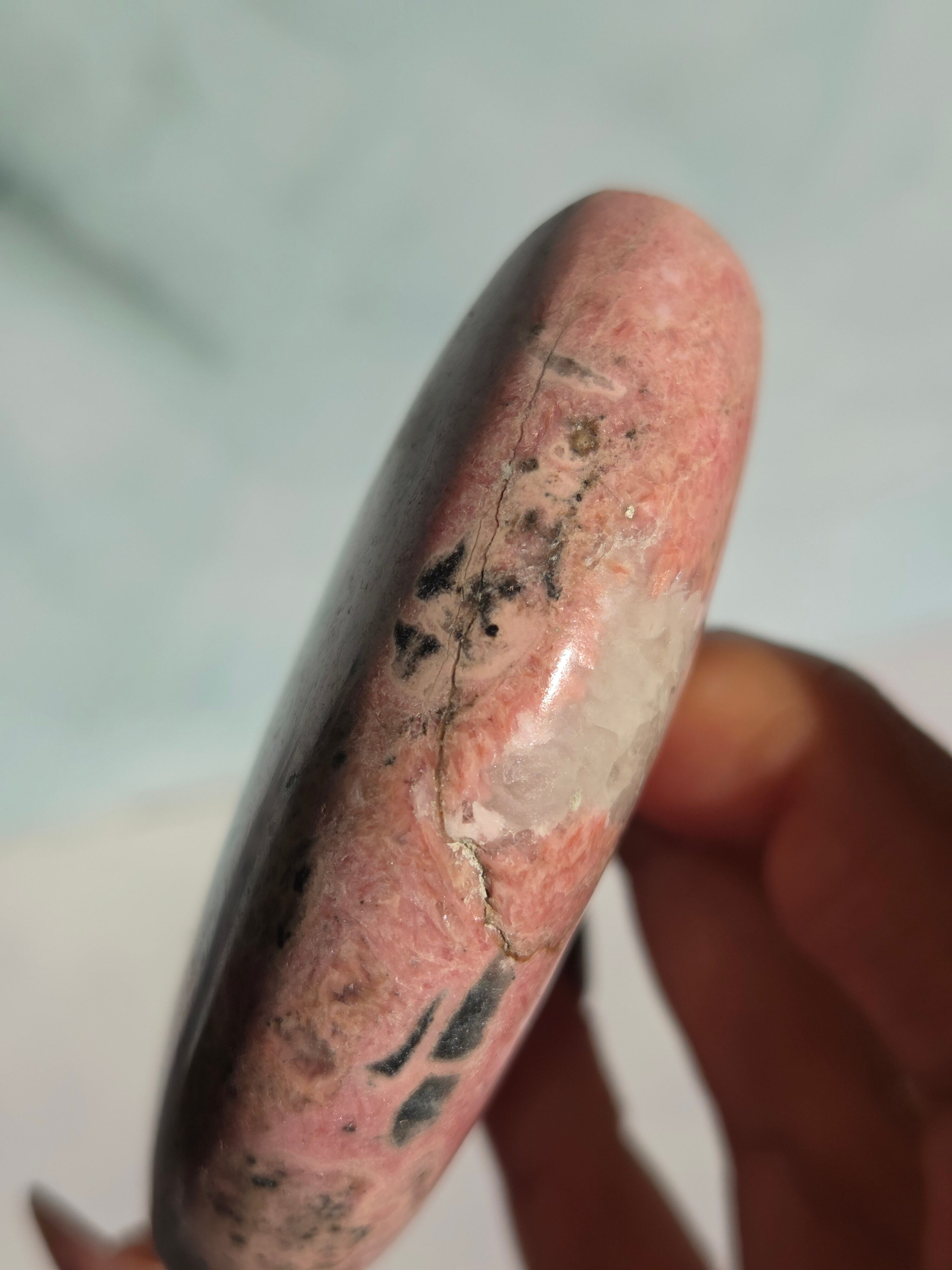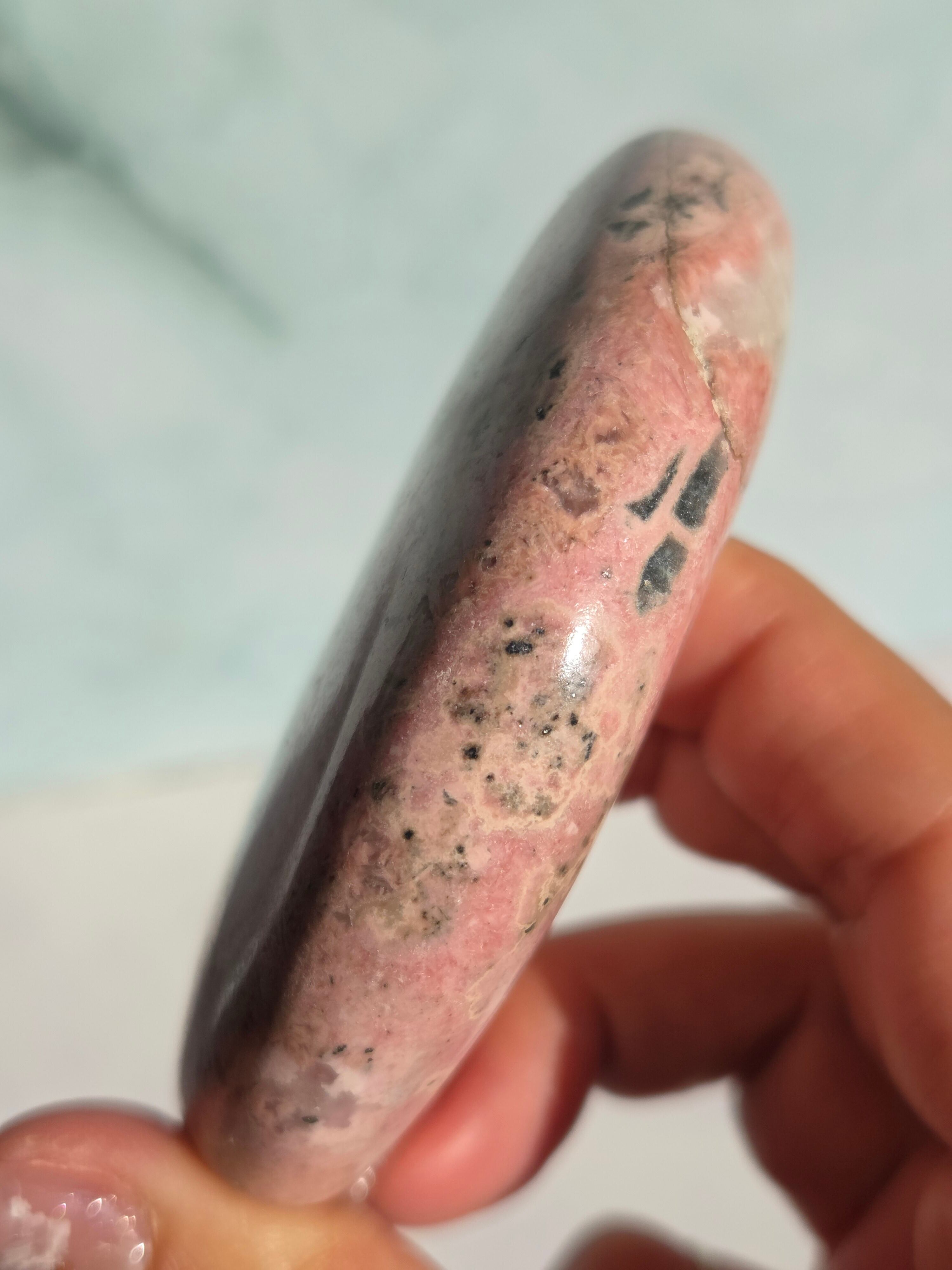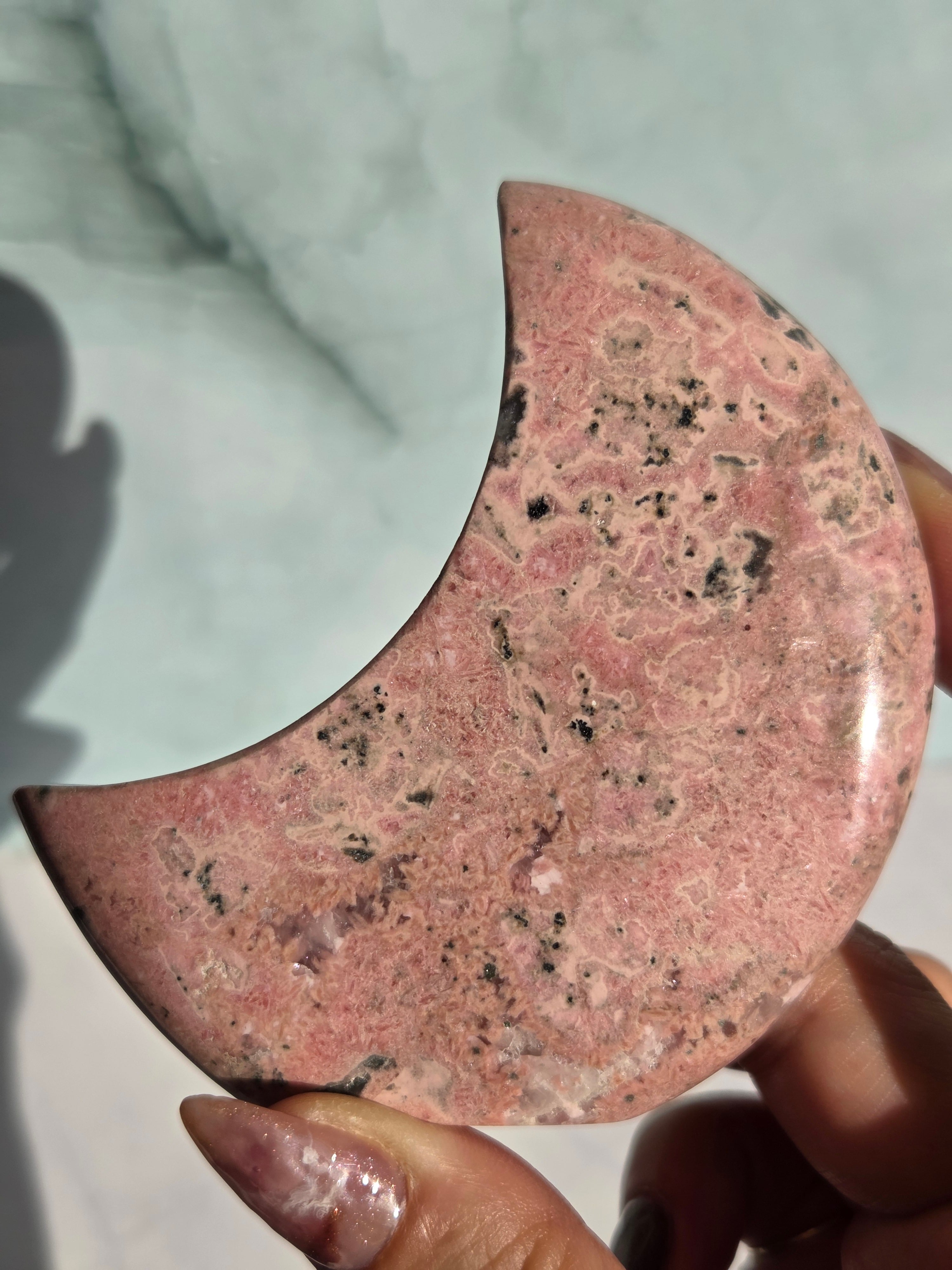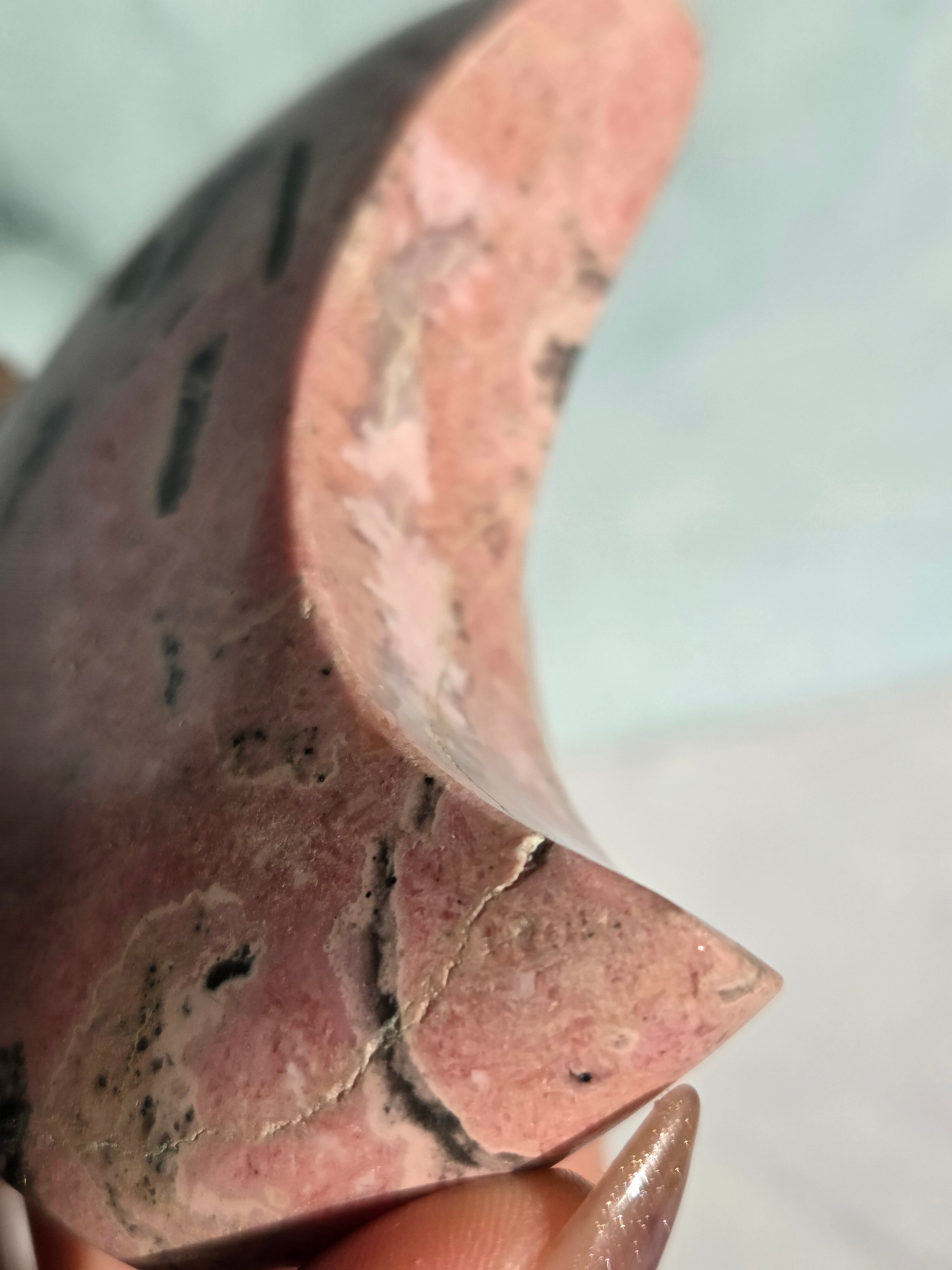 苺ミルクのような色合いがとても可愛い、月形のオブジェです。自立してそのままインテリア出来るようカービングしてます。