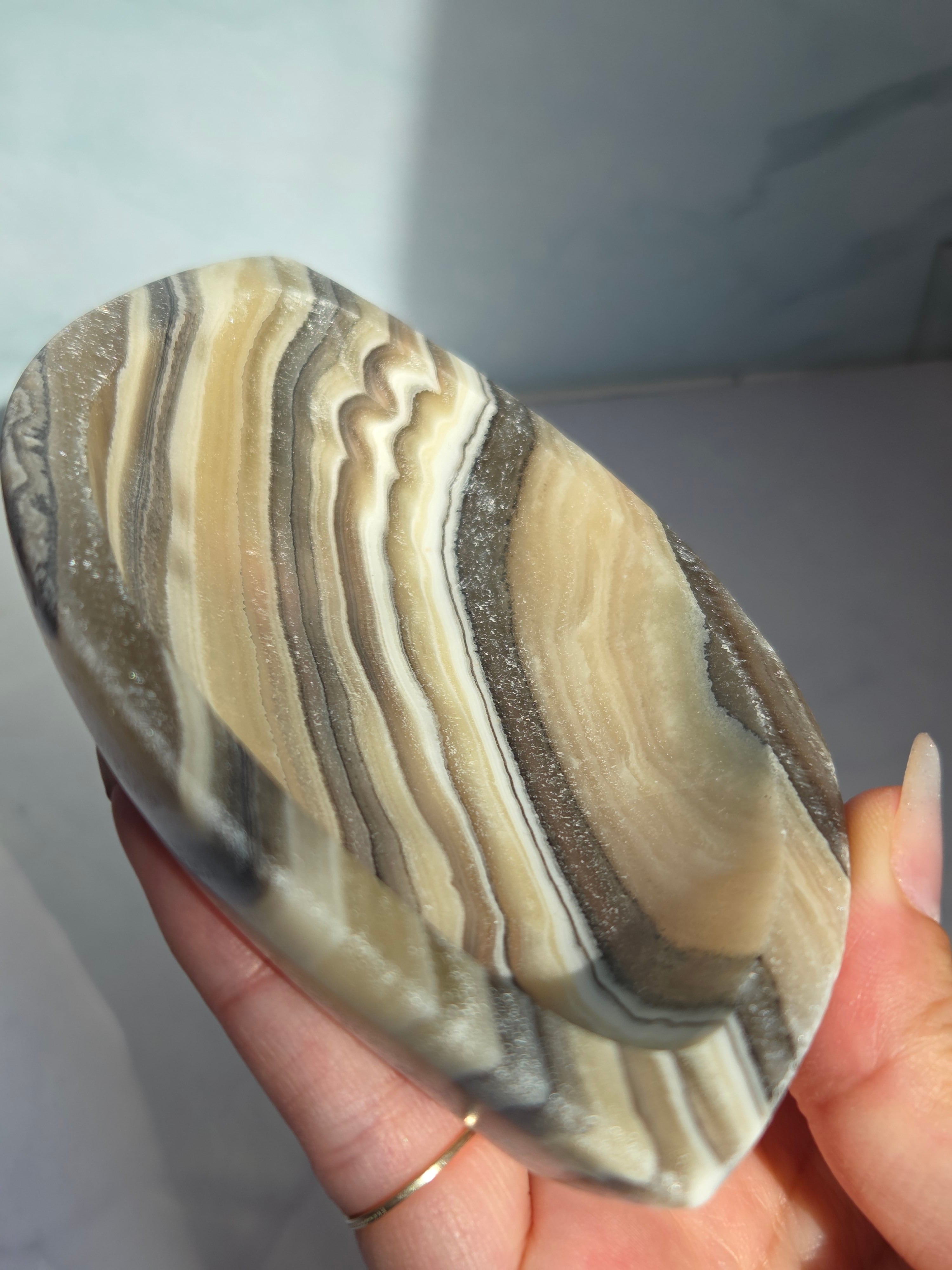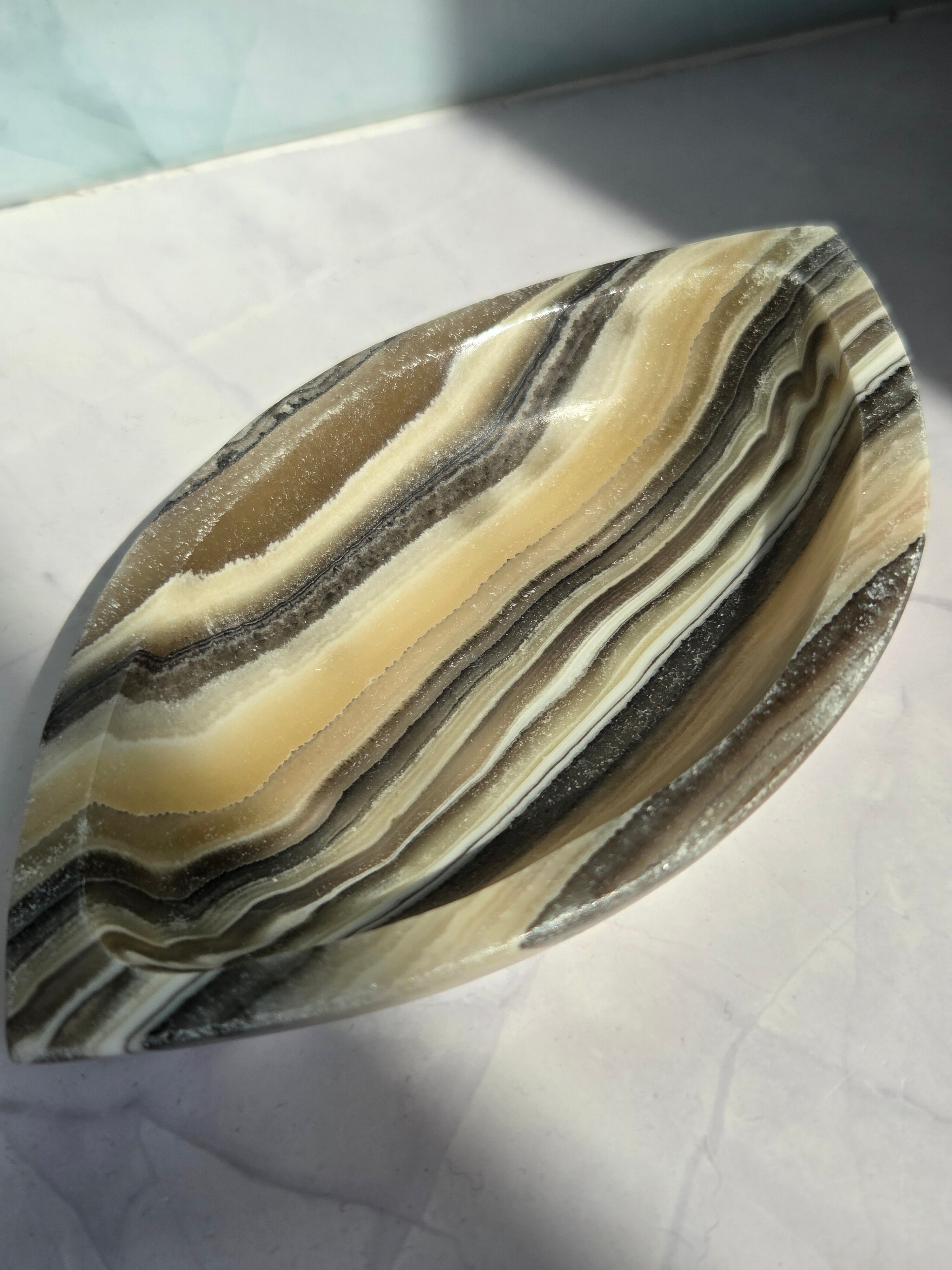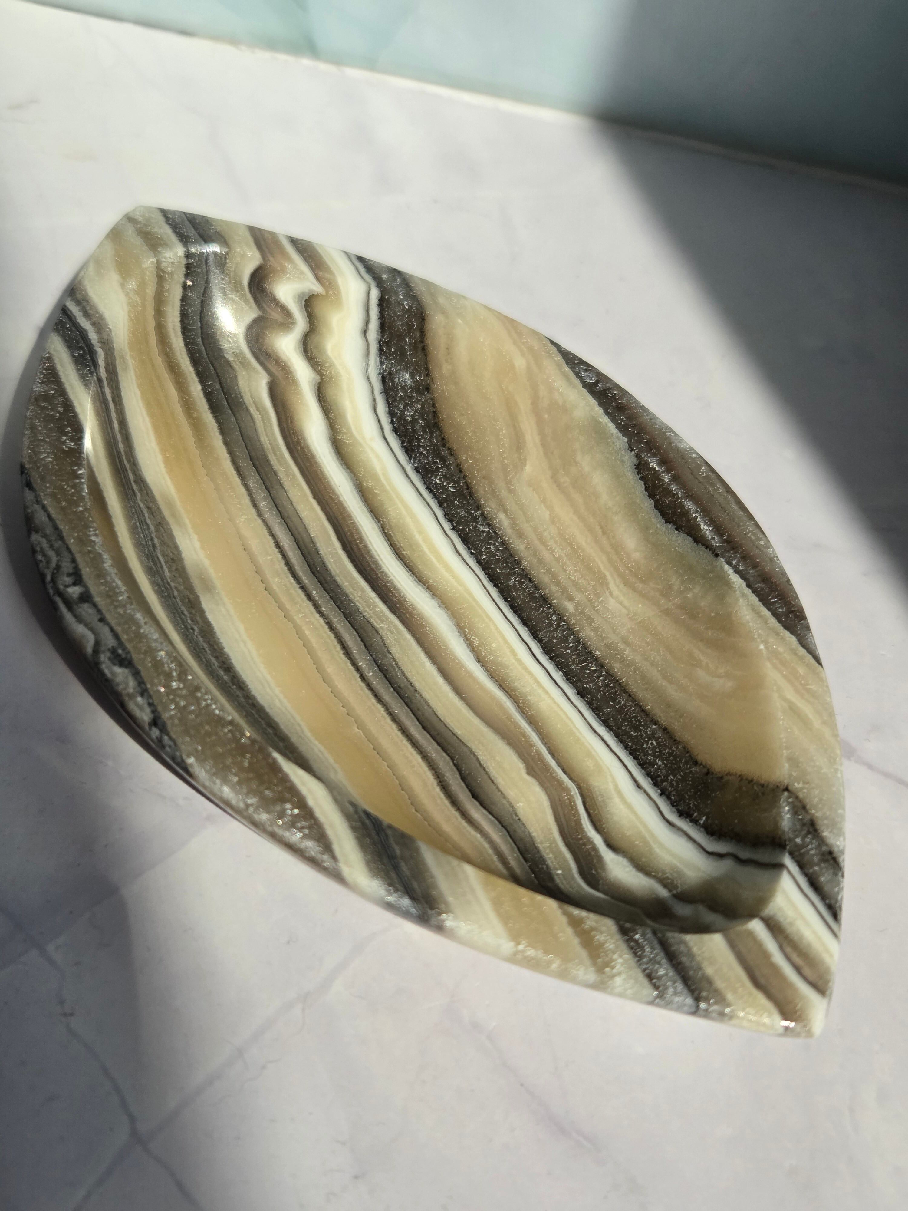 アートスティックな模様がかっこいいゼブラカルサイトをスタイリッシュな形に仕上げたアクセサリートレイです。