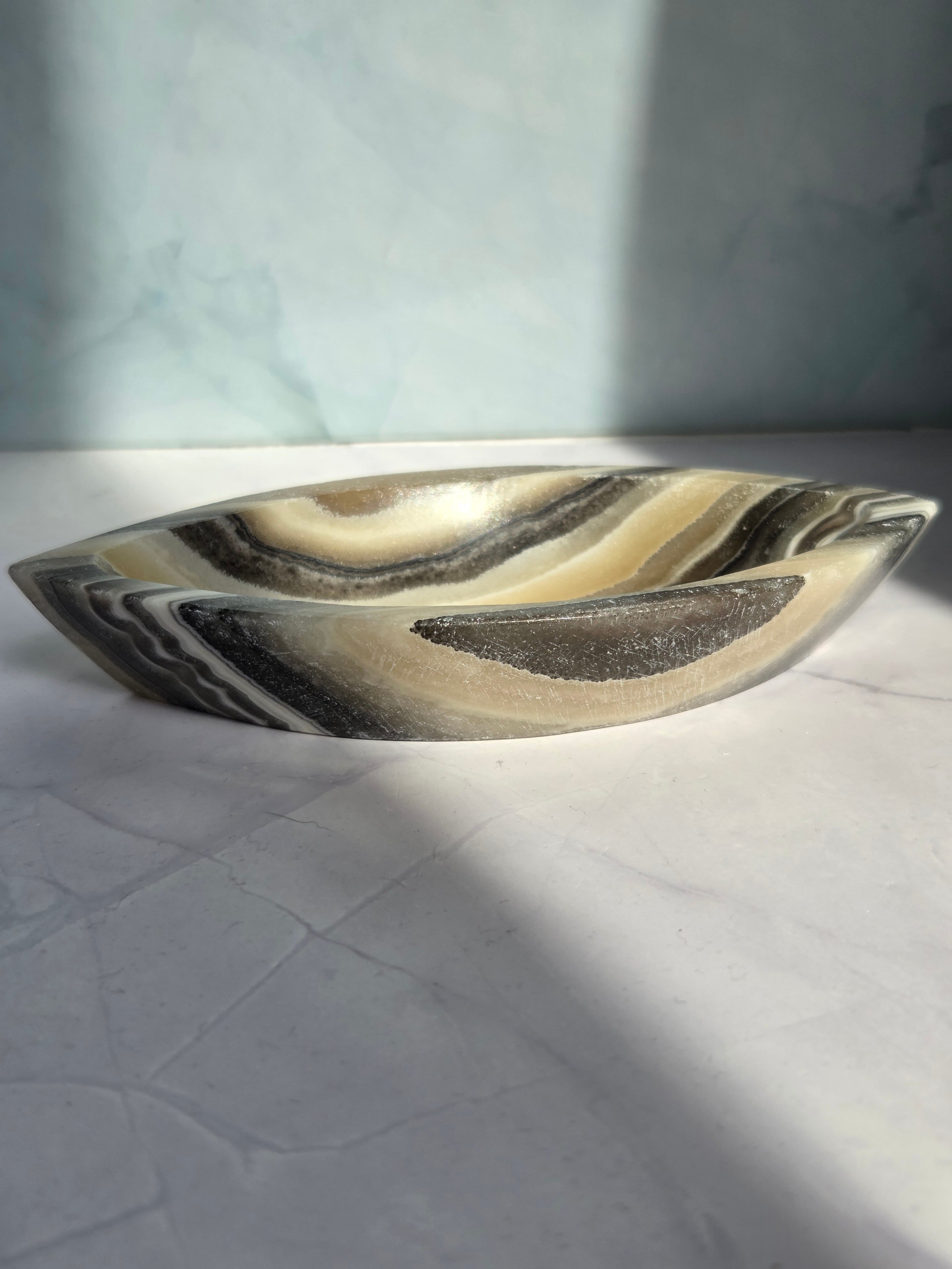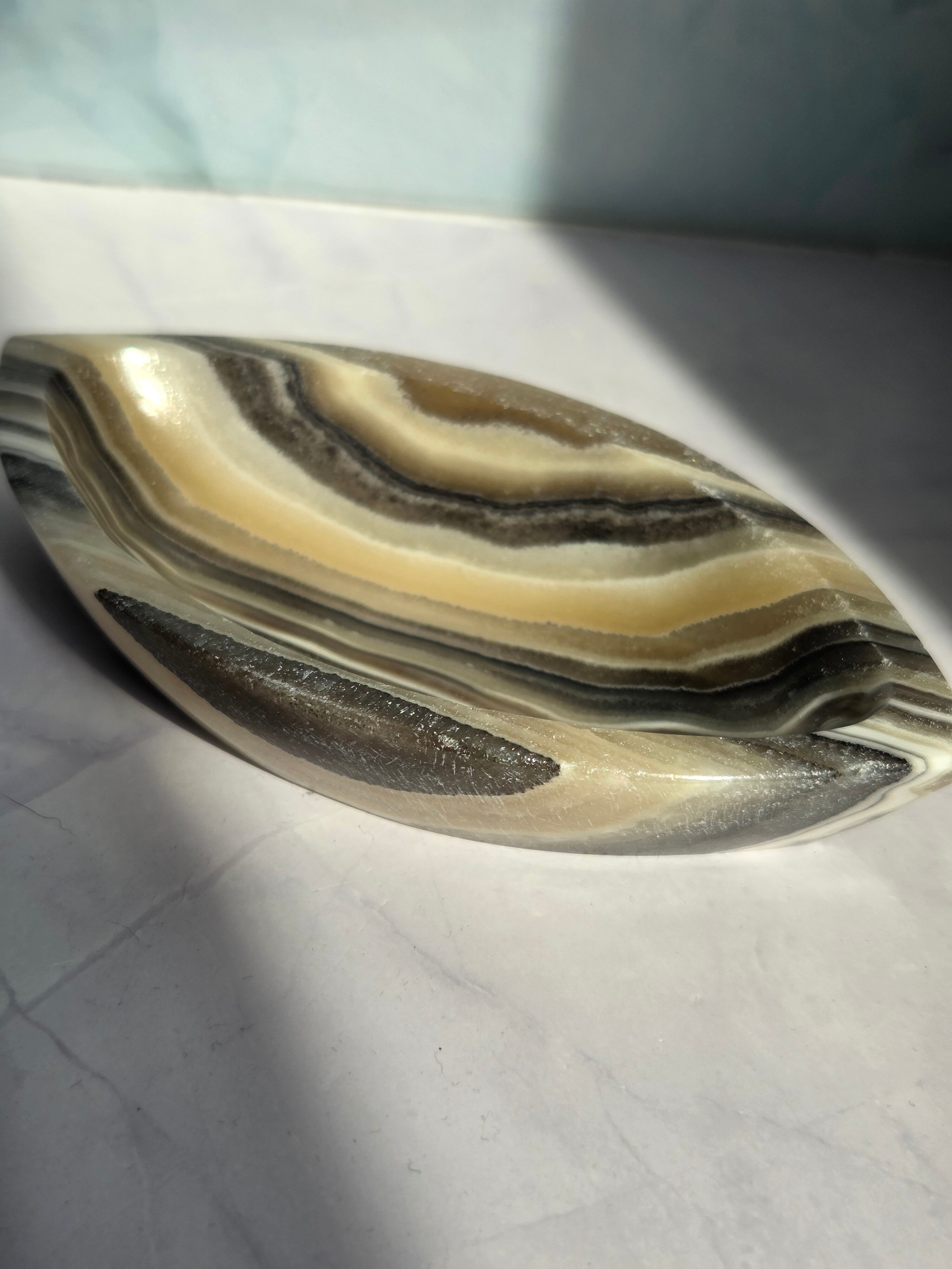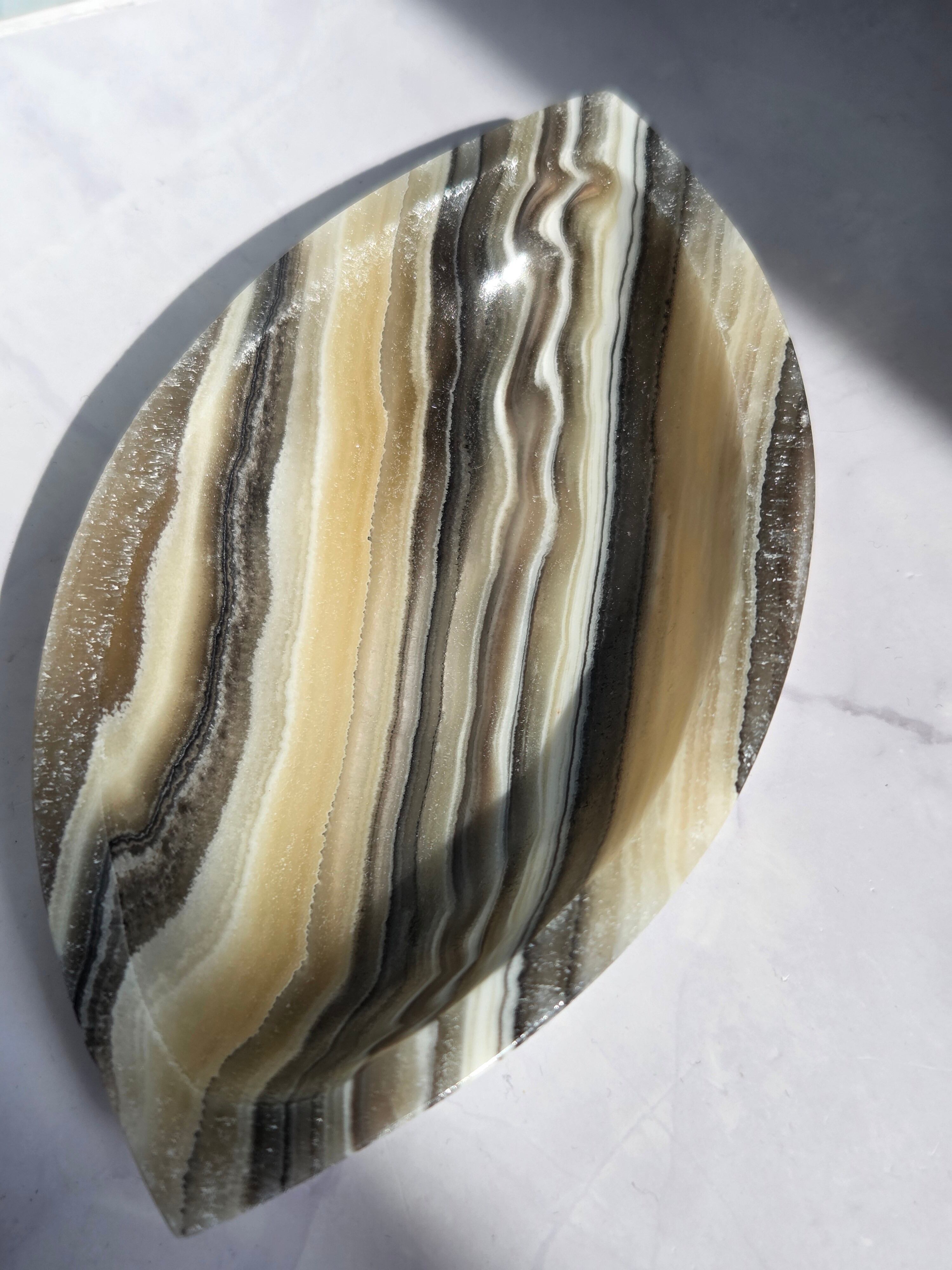 アートスティックな模様がかっこいいゼブラカルサイトをスタイリッシュな形に仕上げたアクセサリートレイです。