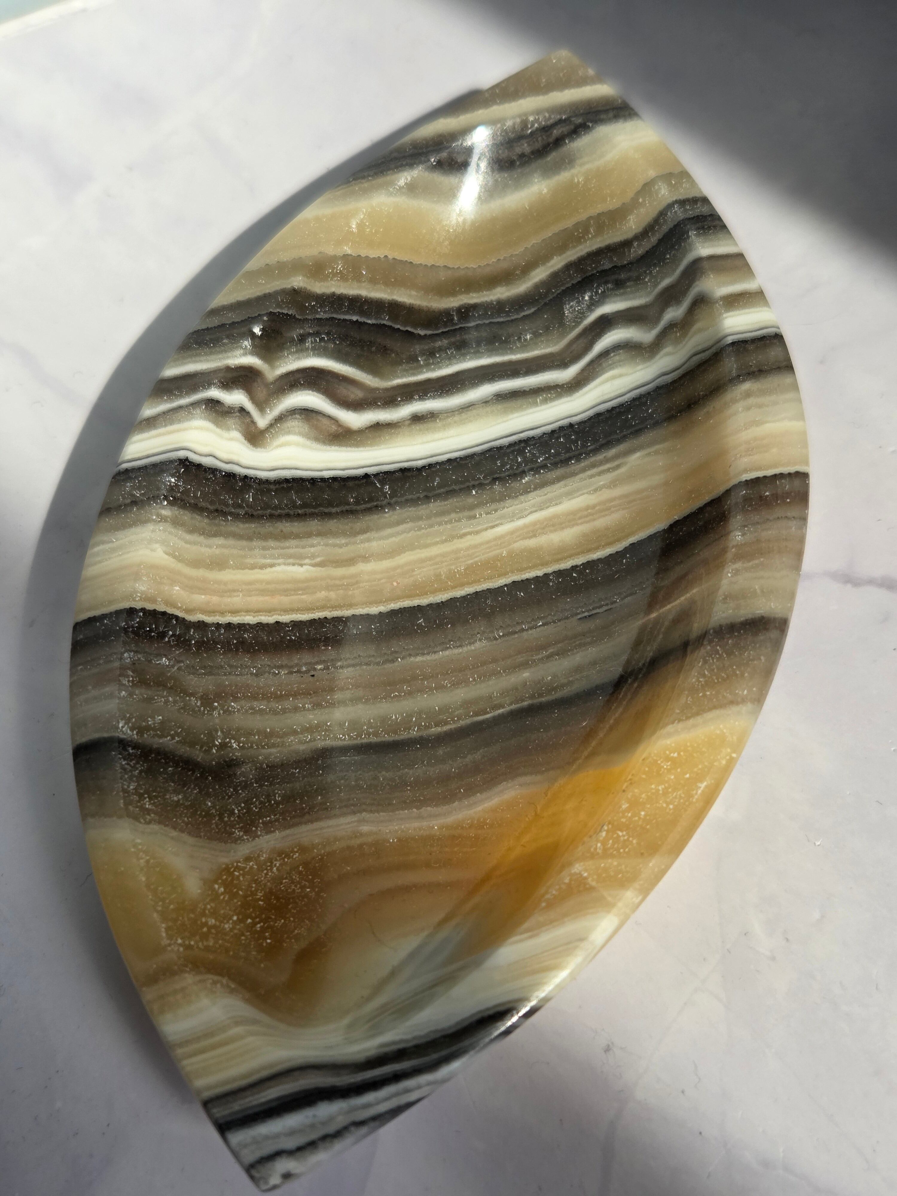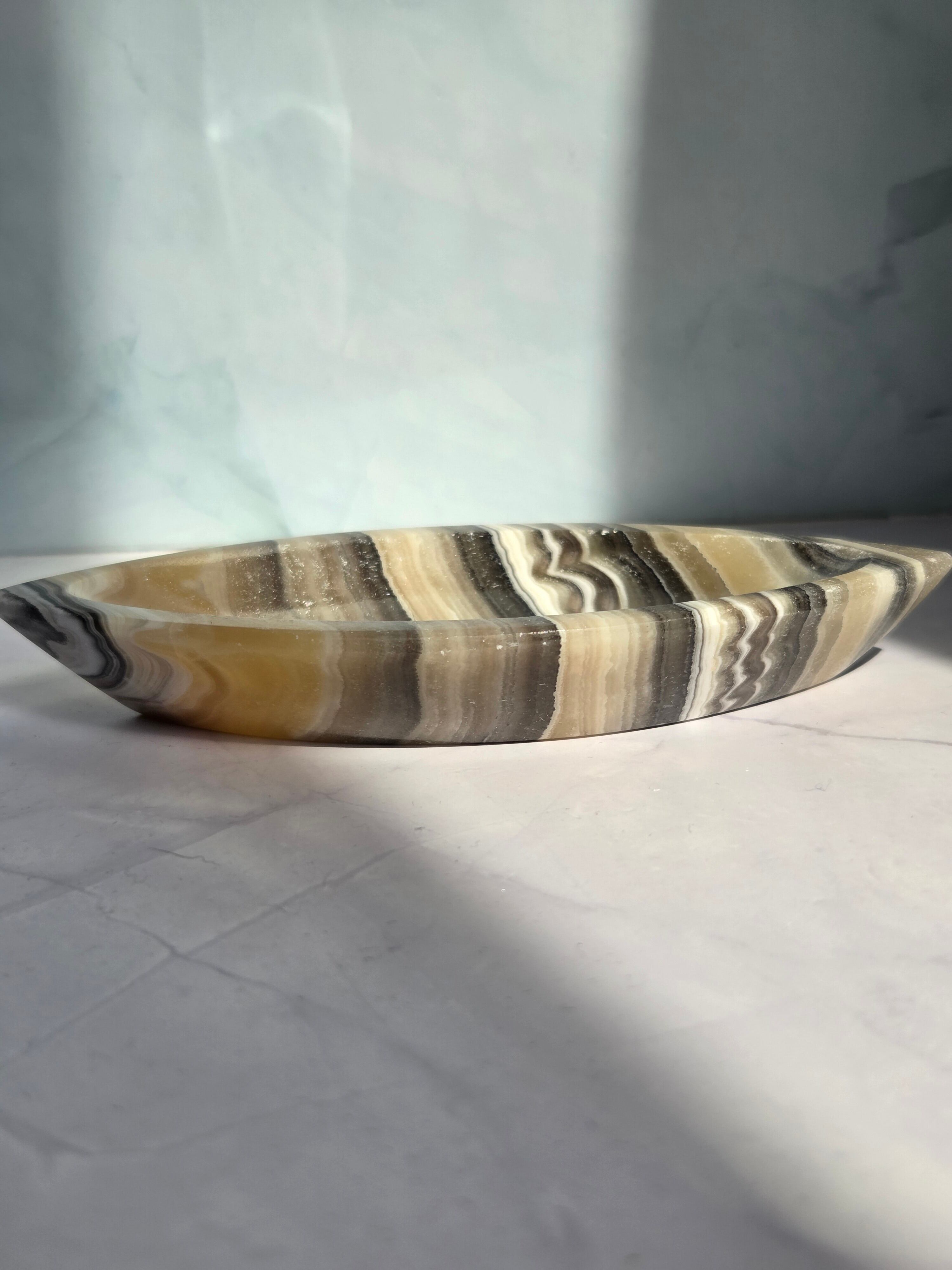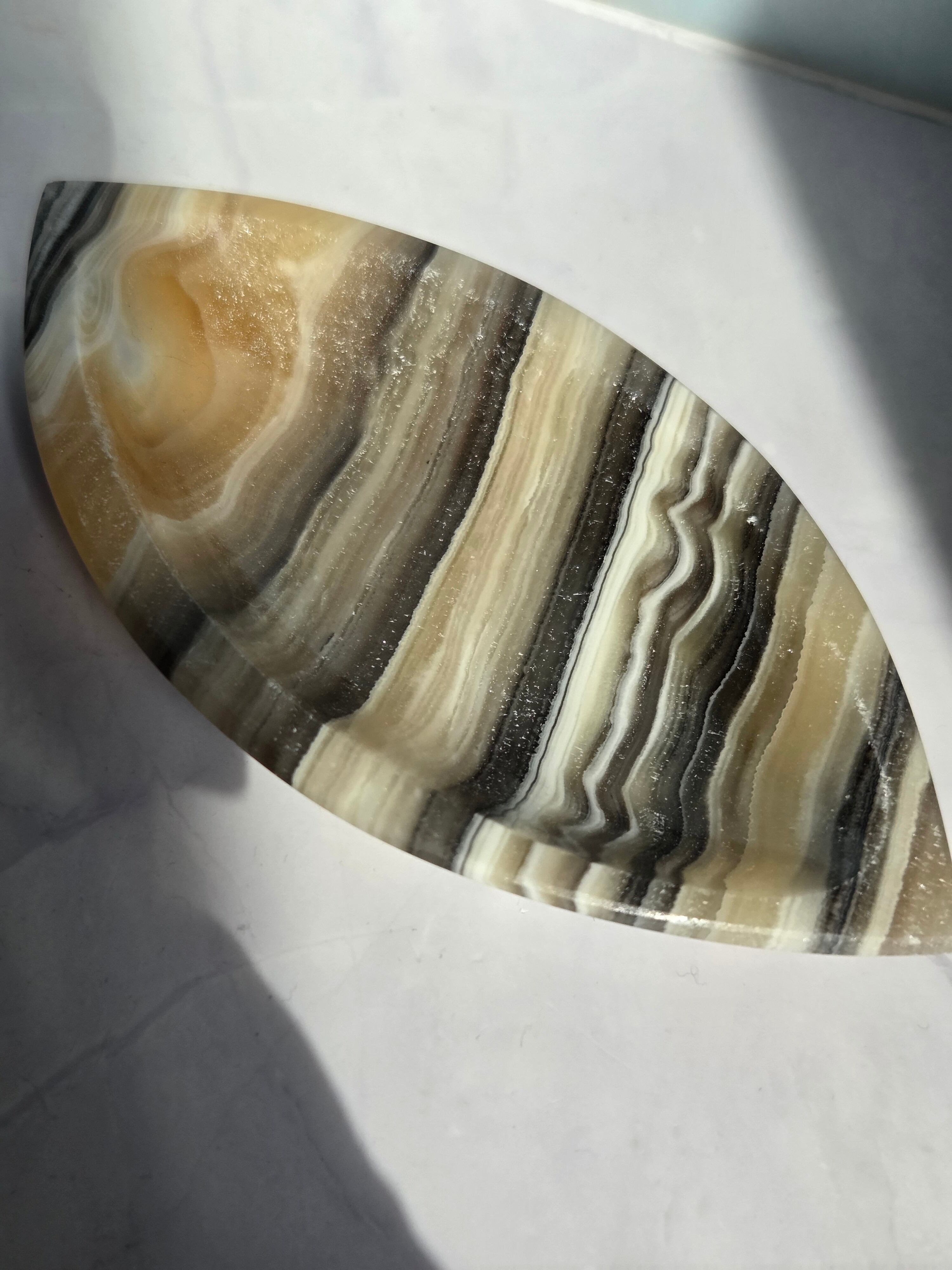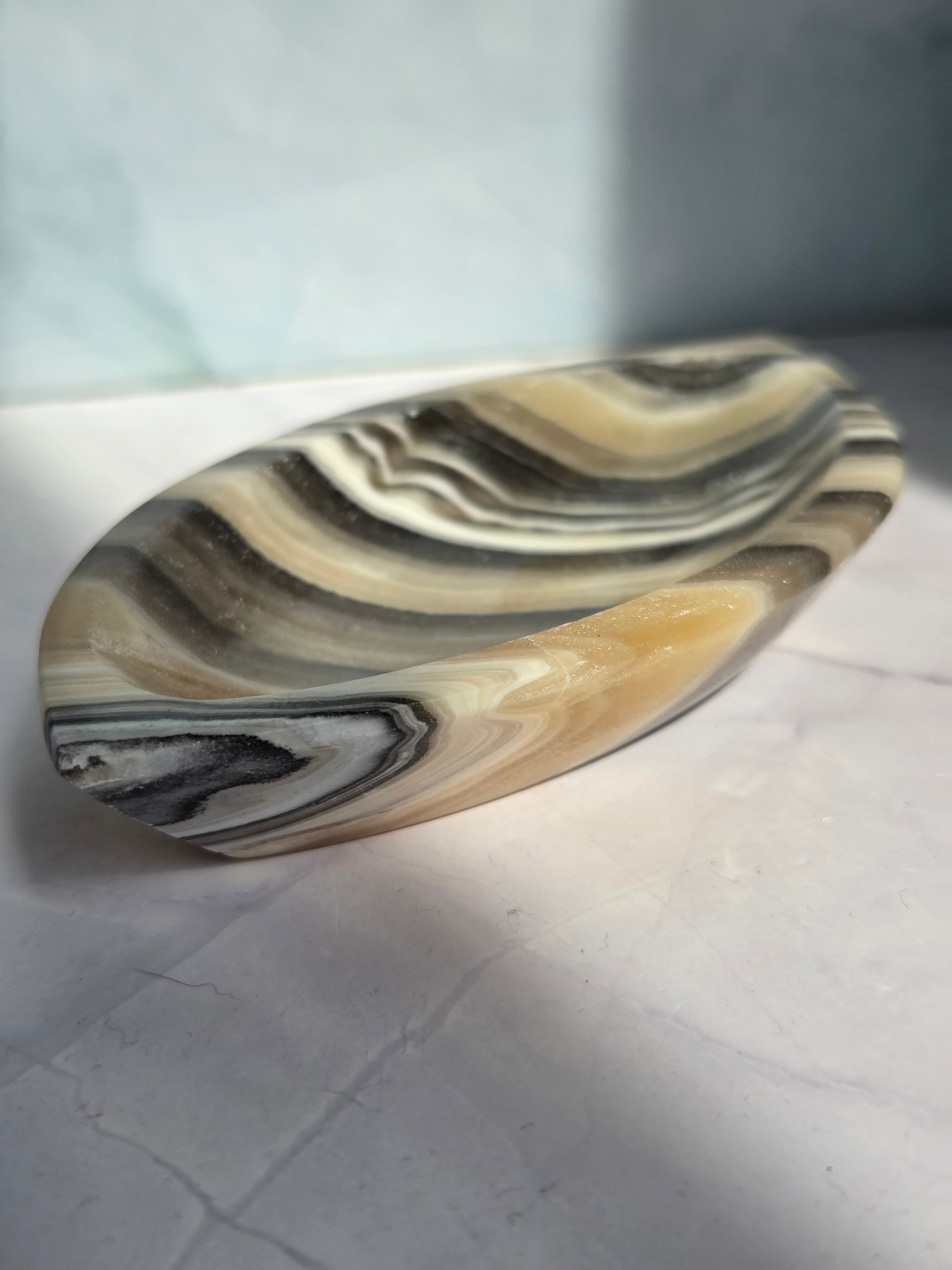 アートスティックな模様がかっこいいゼブラカルサイトをスタイリッシュな形に仕上げたアクセサリートレイです。