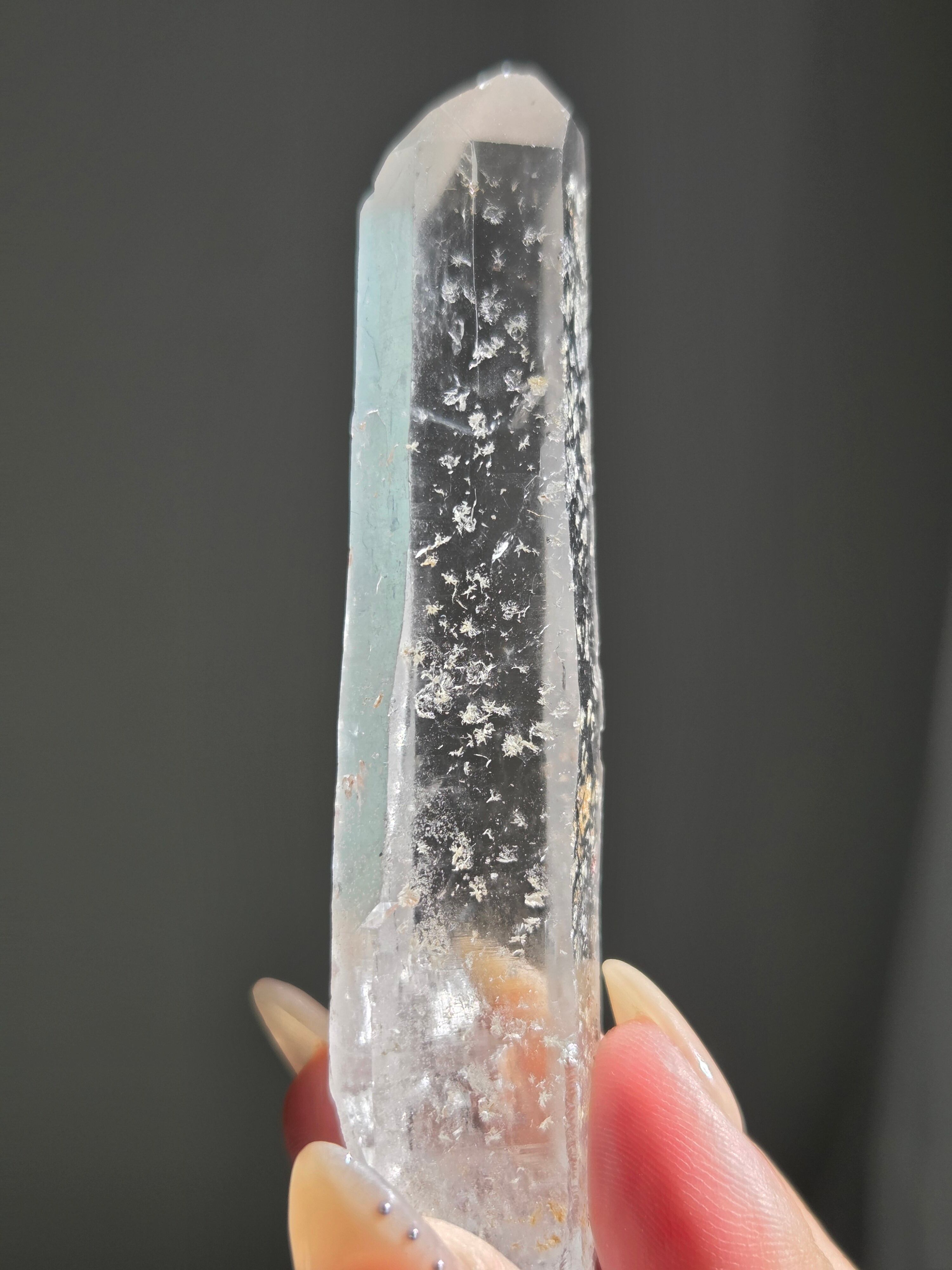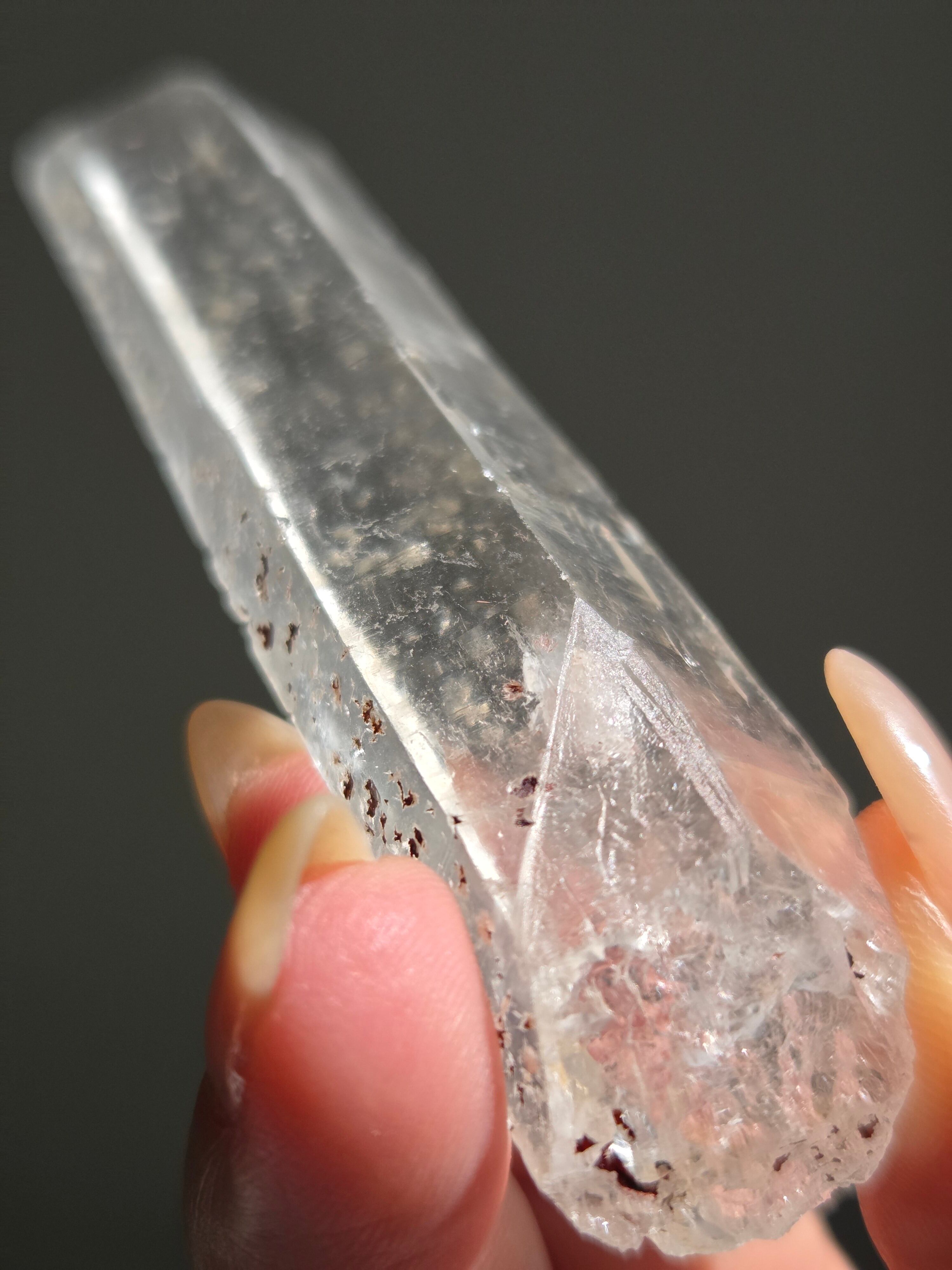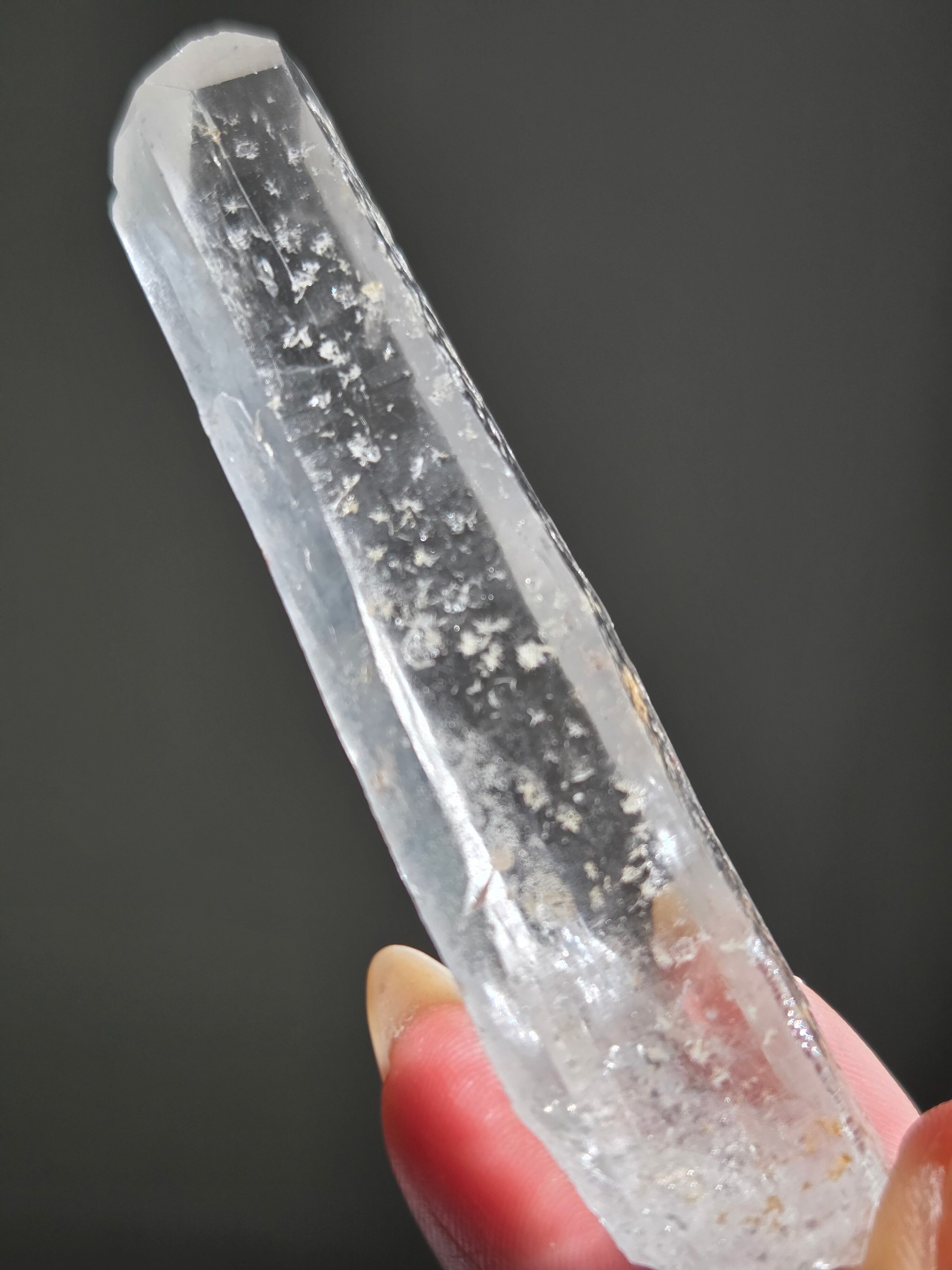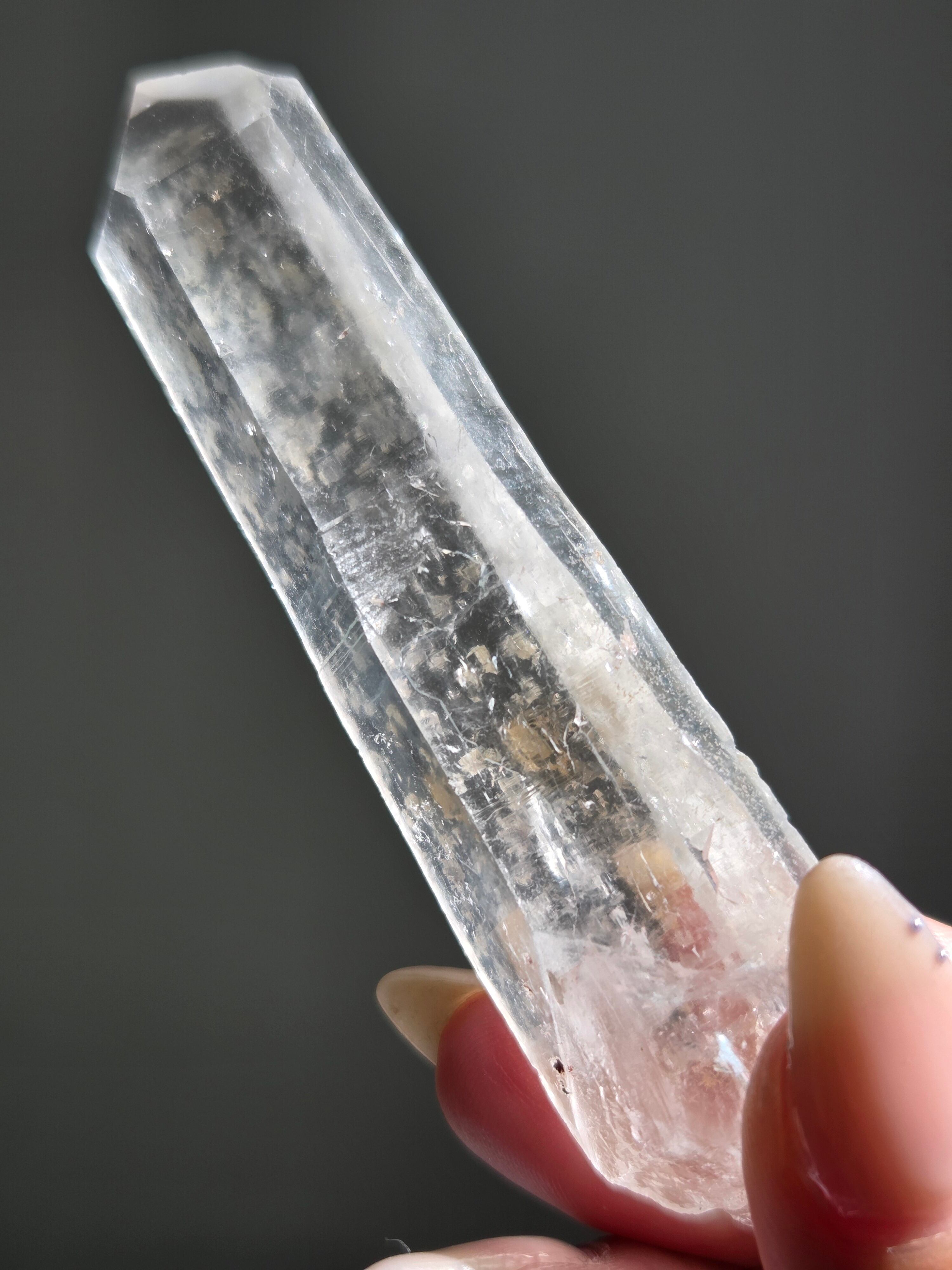 レーザー光線のように細長い結晶で、エネルギーを一点に集中させ、強力に放射するワンドとして。また、ヒーリング(結界、ネガティブエネルギーの切り裂き)、集中力向上、瞑想に用いられます