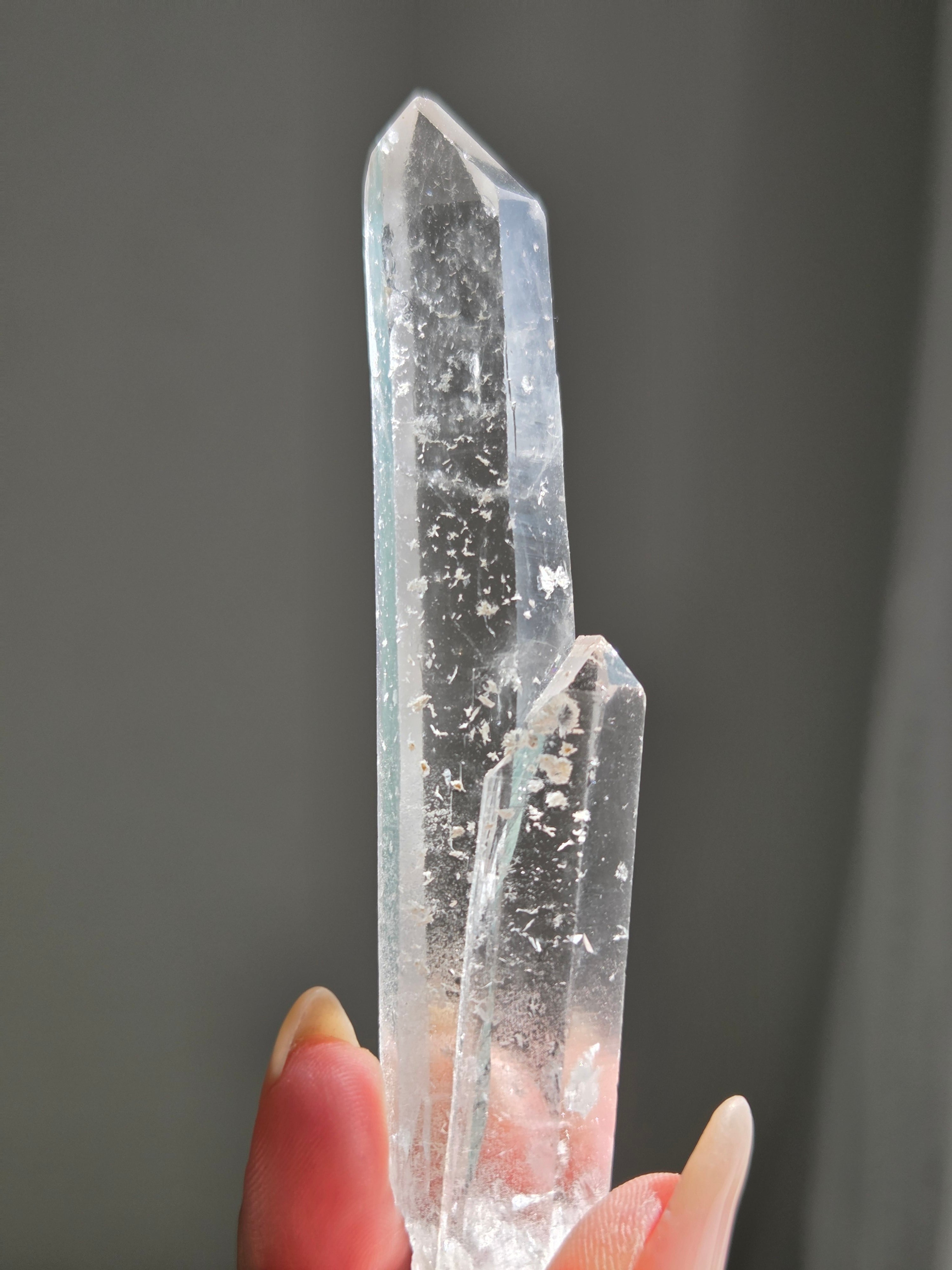 シンギングレーザーは、先端が細く尖った「レーザークォーツ」の中でも、結晶同士を叩き合わせると金属的で高い音(シンギング)を奏でる非常に珍しい水晶です。強力なエネルギー増幅・放射・保護作用があるとされ、ヒーリングやネガティブなエネルギーの切断に用いられるパワーストーンです。
