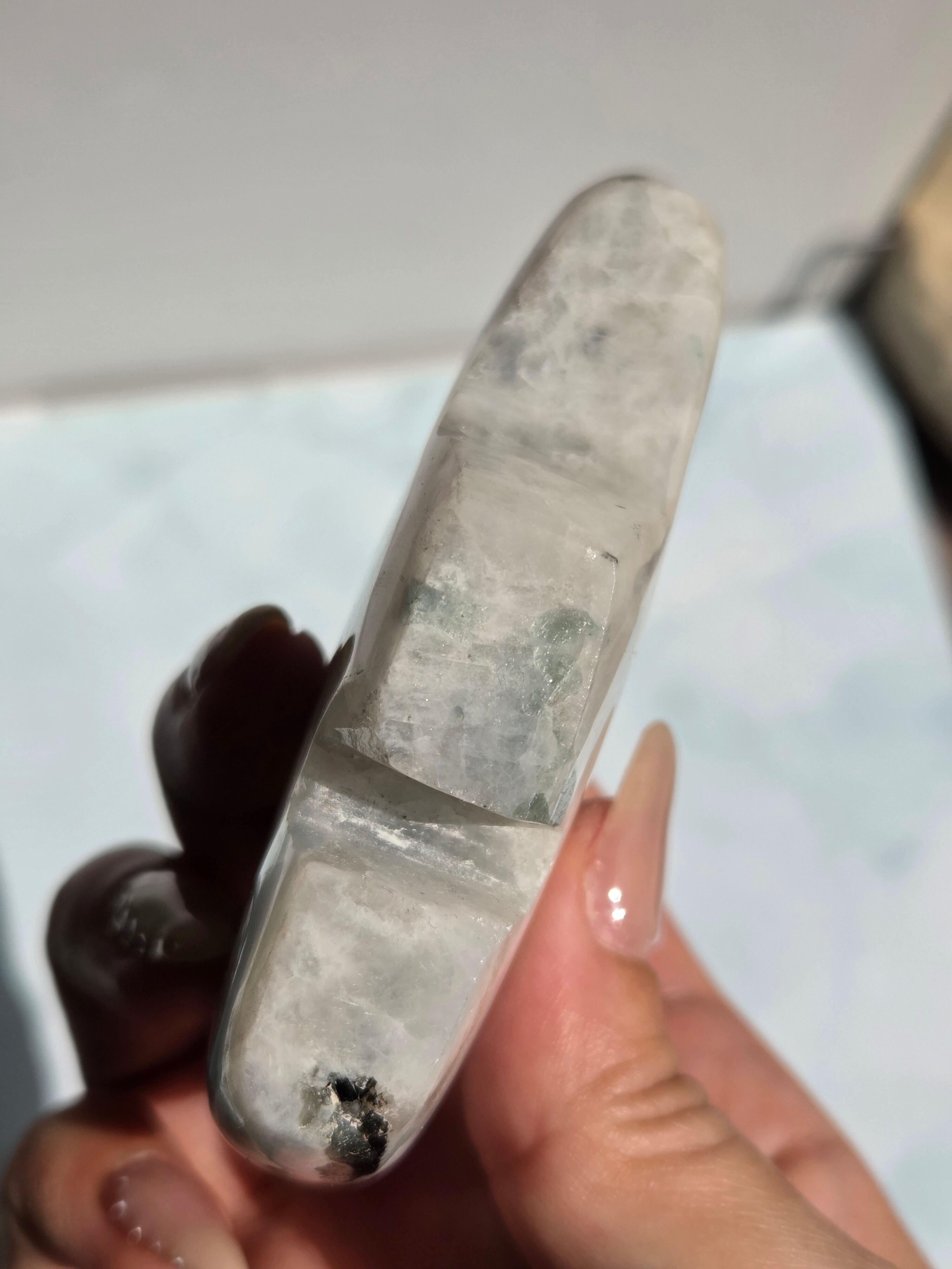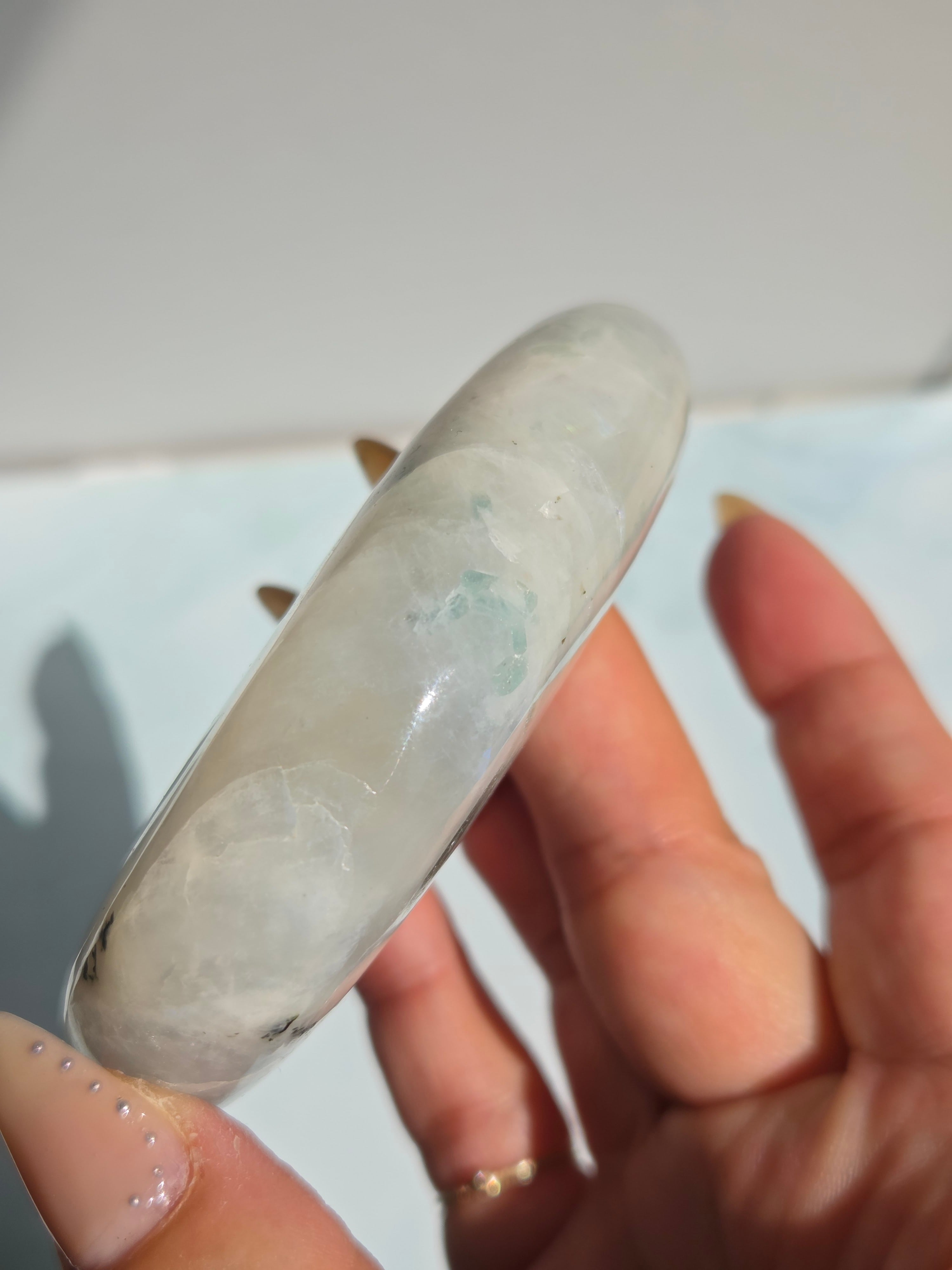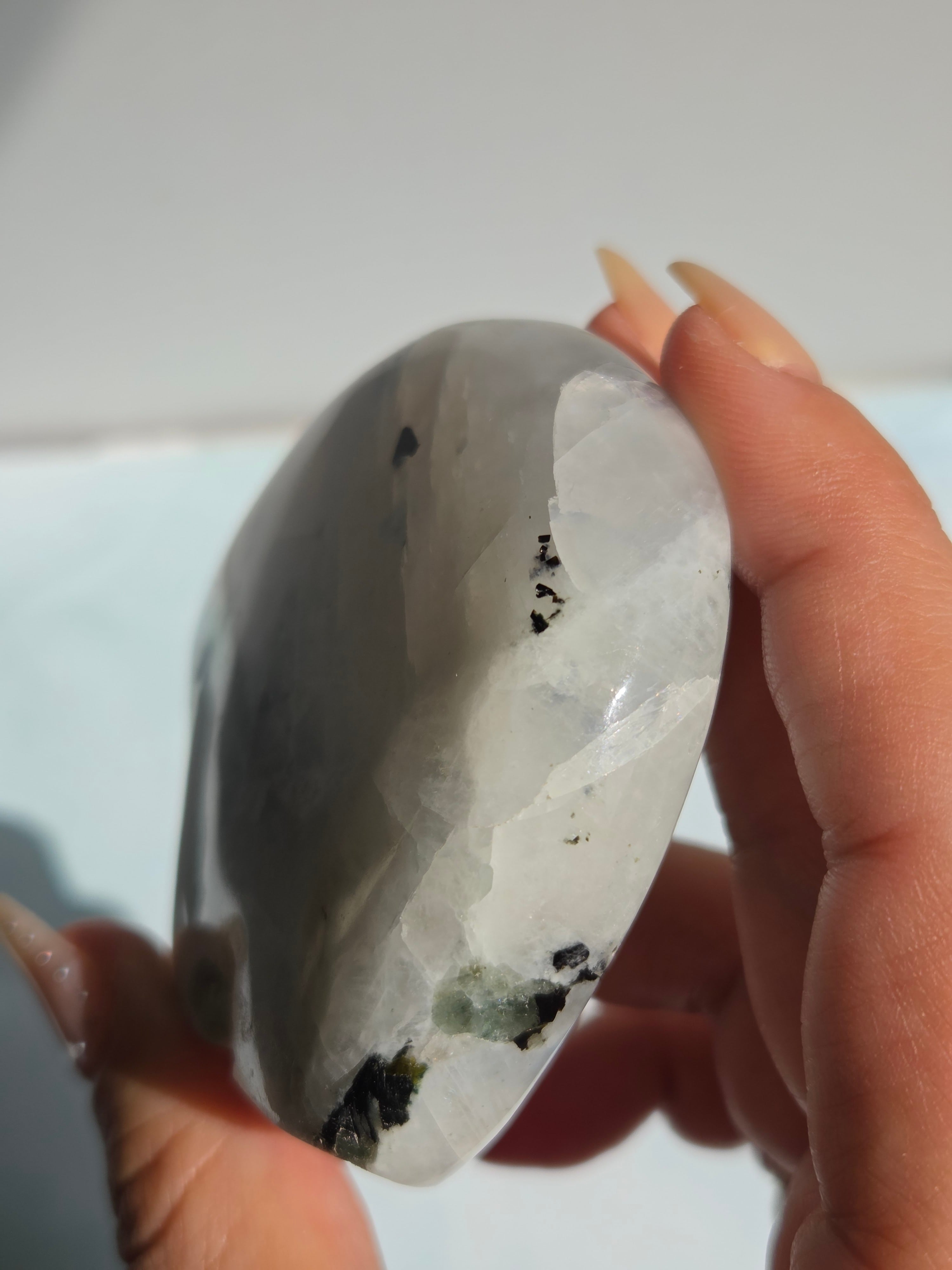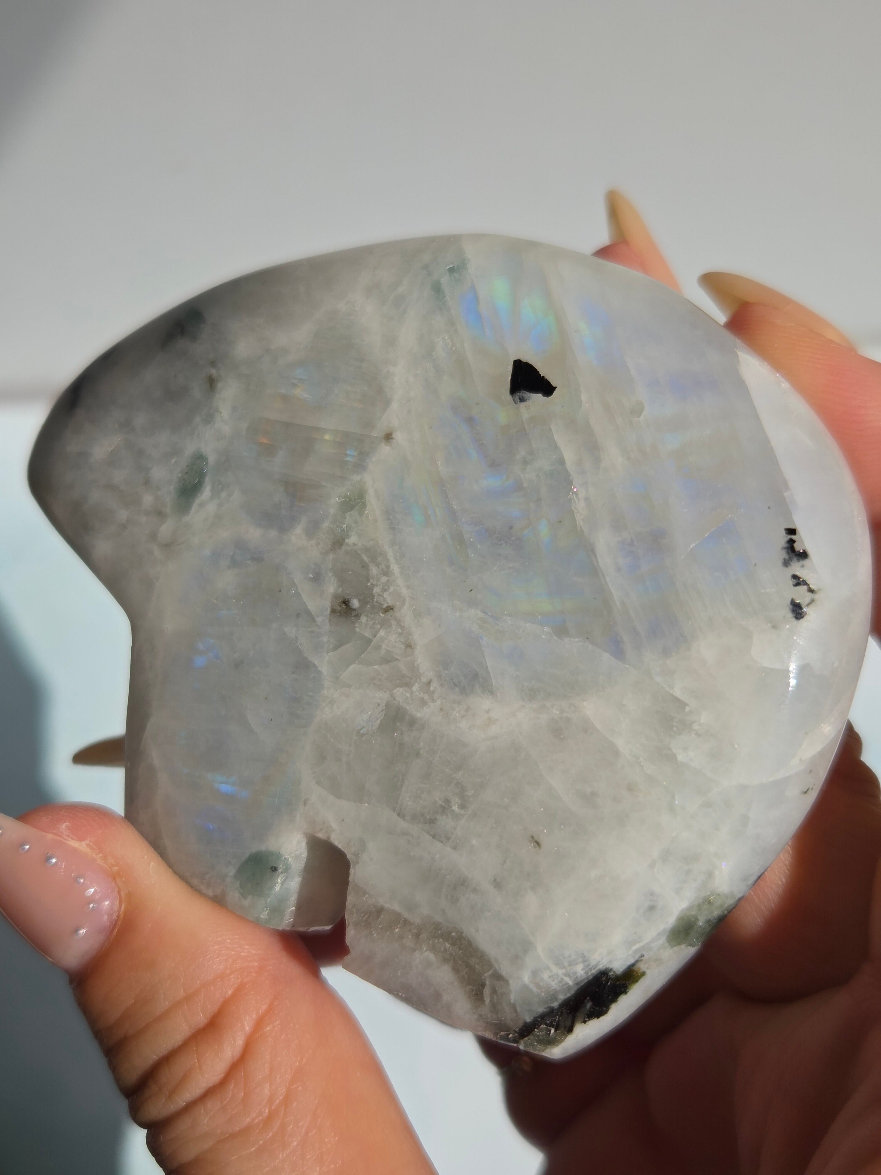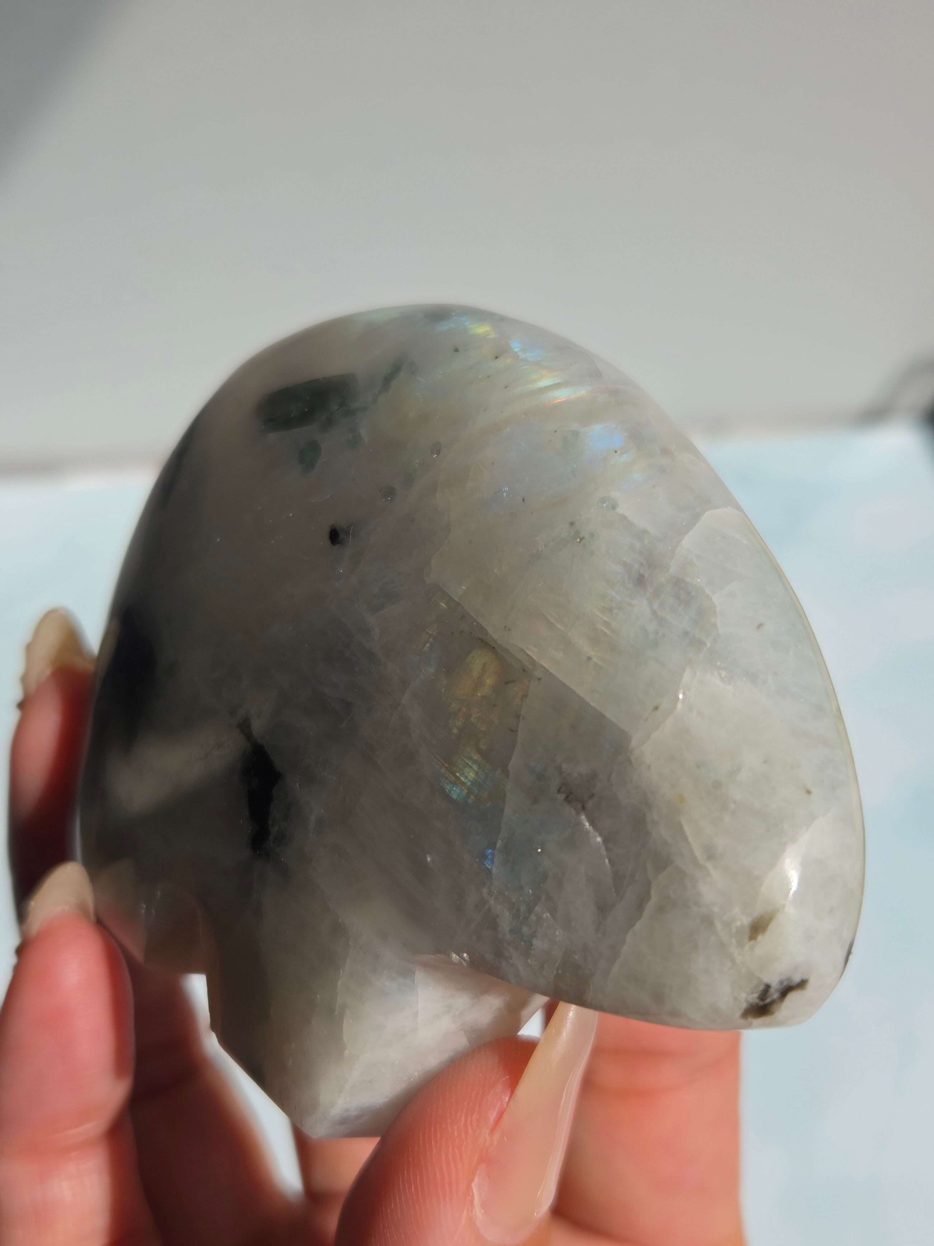 レインボームーンストーンは、乳白色の地色に青や虹色の輝き(シラー)が浮かぶ、主にホワイトラブラドライトに分類される鉱物です。正式なムーンストーン(長石)とは異なりますが、6月の誕生石として人気があり、インスピレーション、癒し、幸福を引き寄せる「直感力の石」として親しまれています。