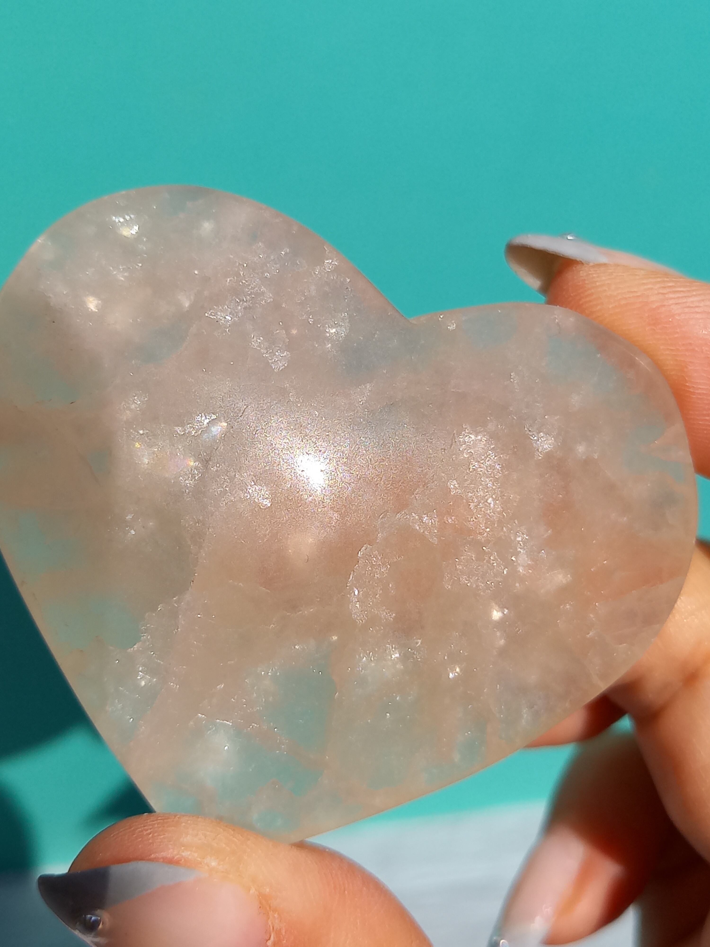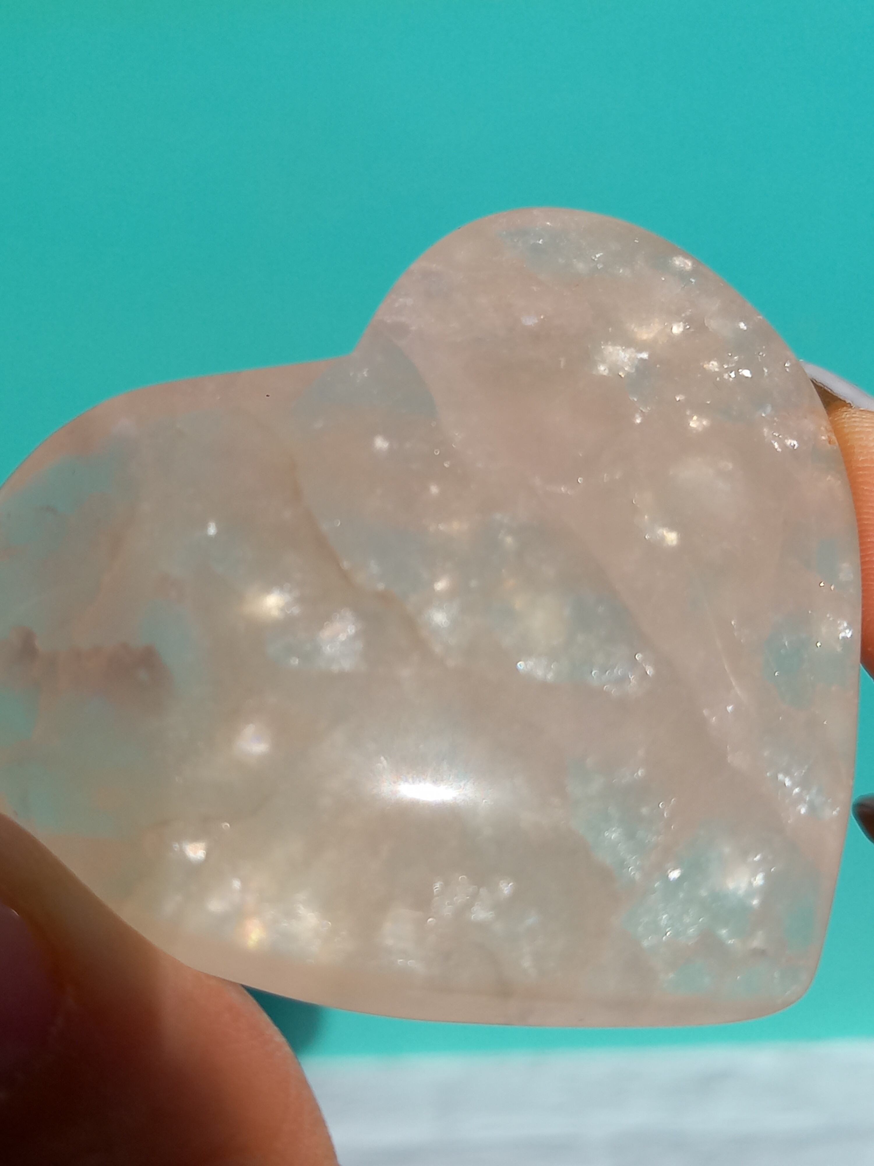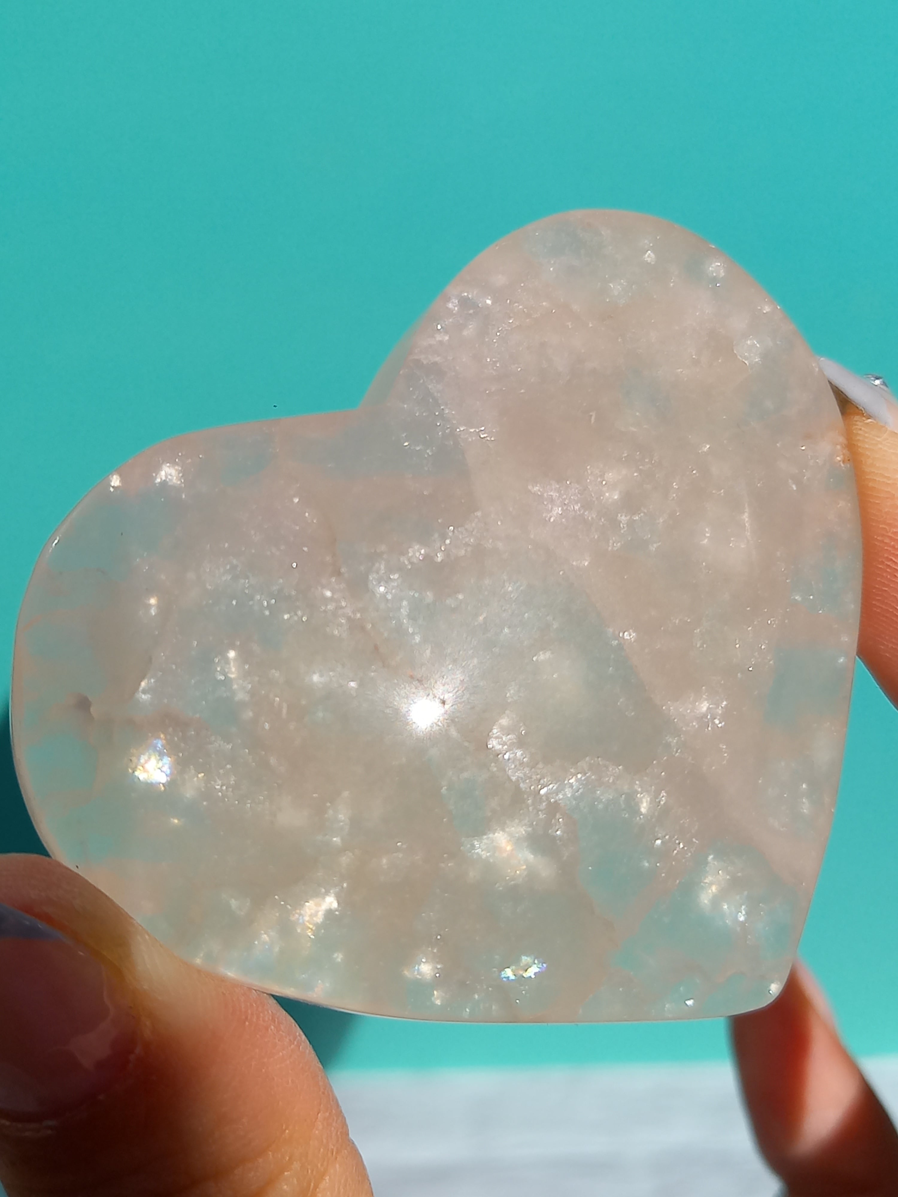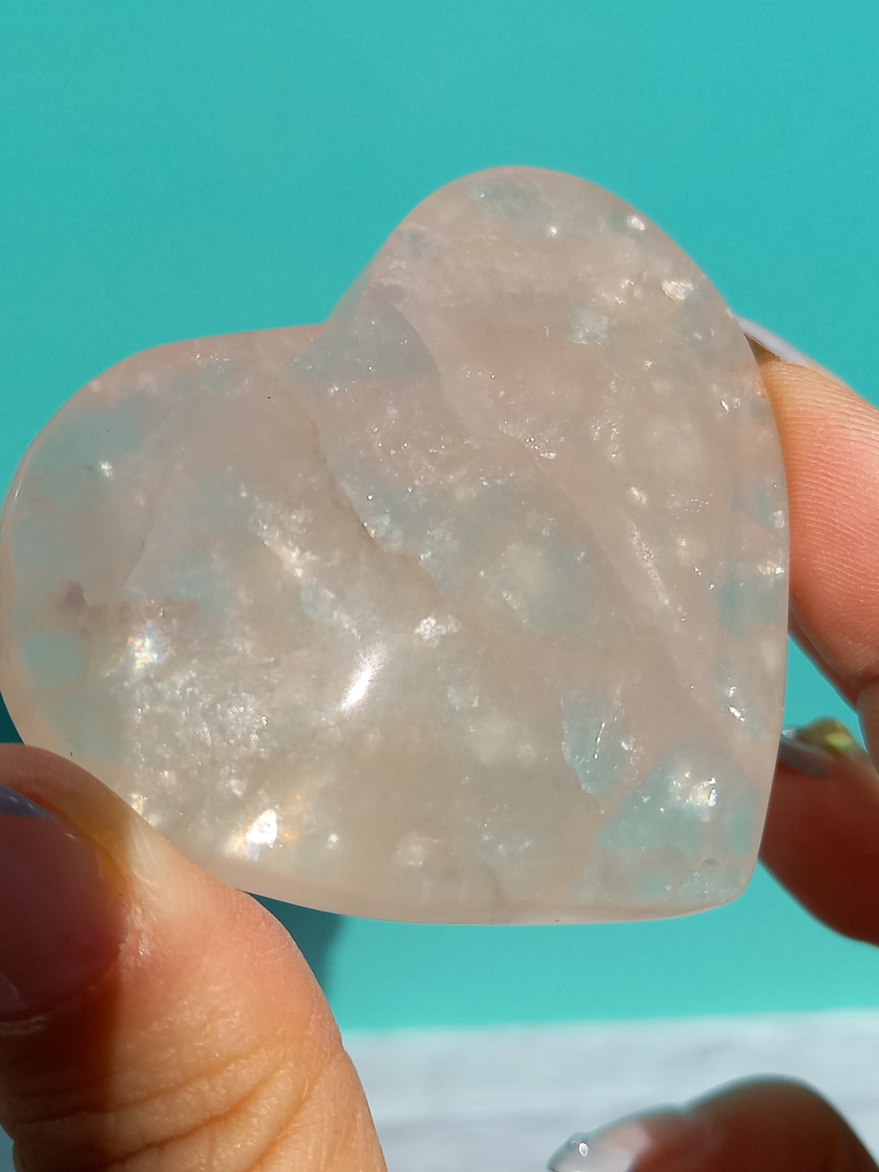 透明感ある薄ピンクのフローライトに、マイカがたっぷり入ったハートパームになります。