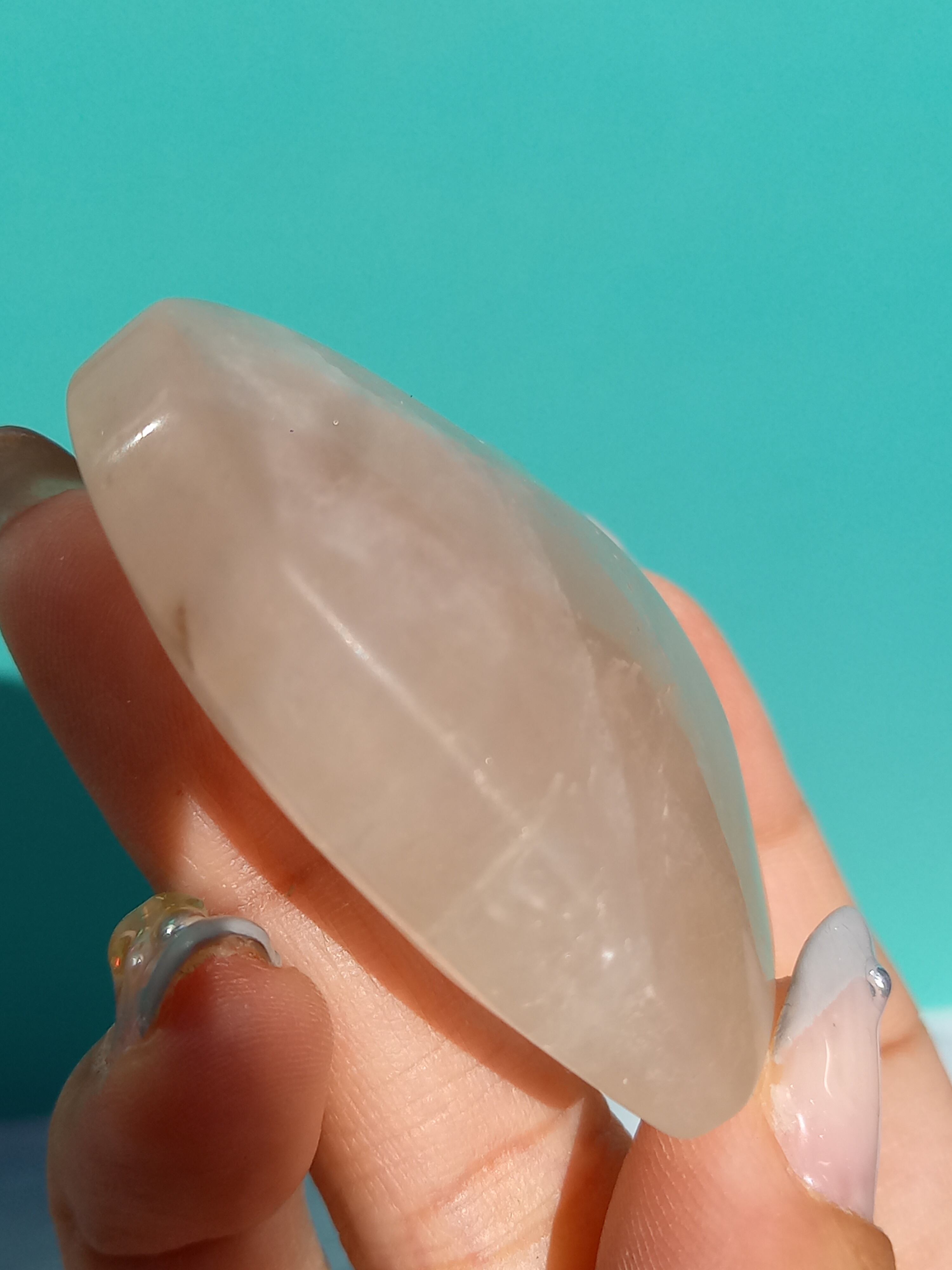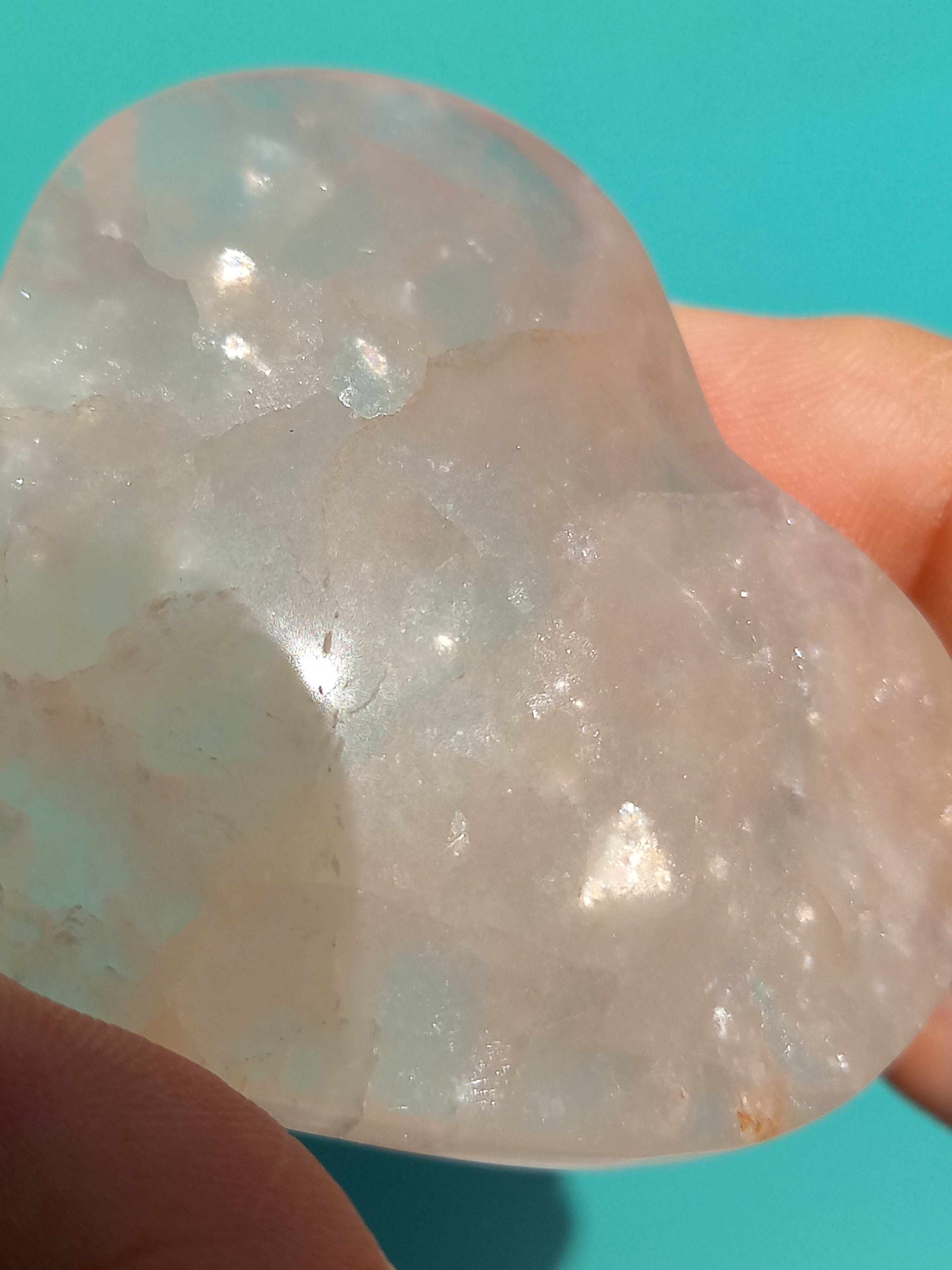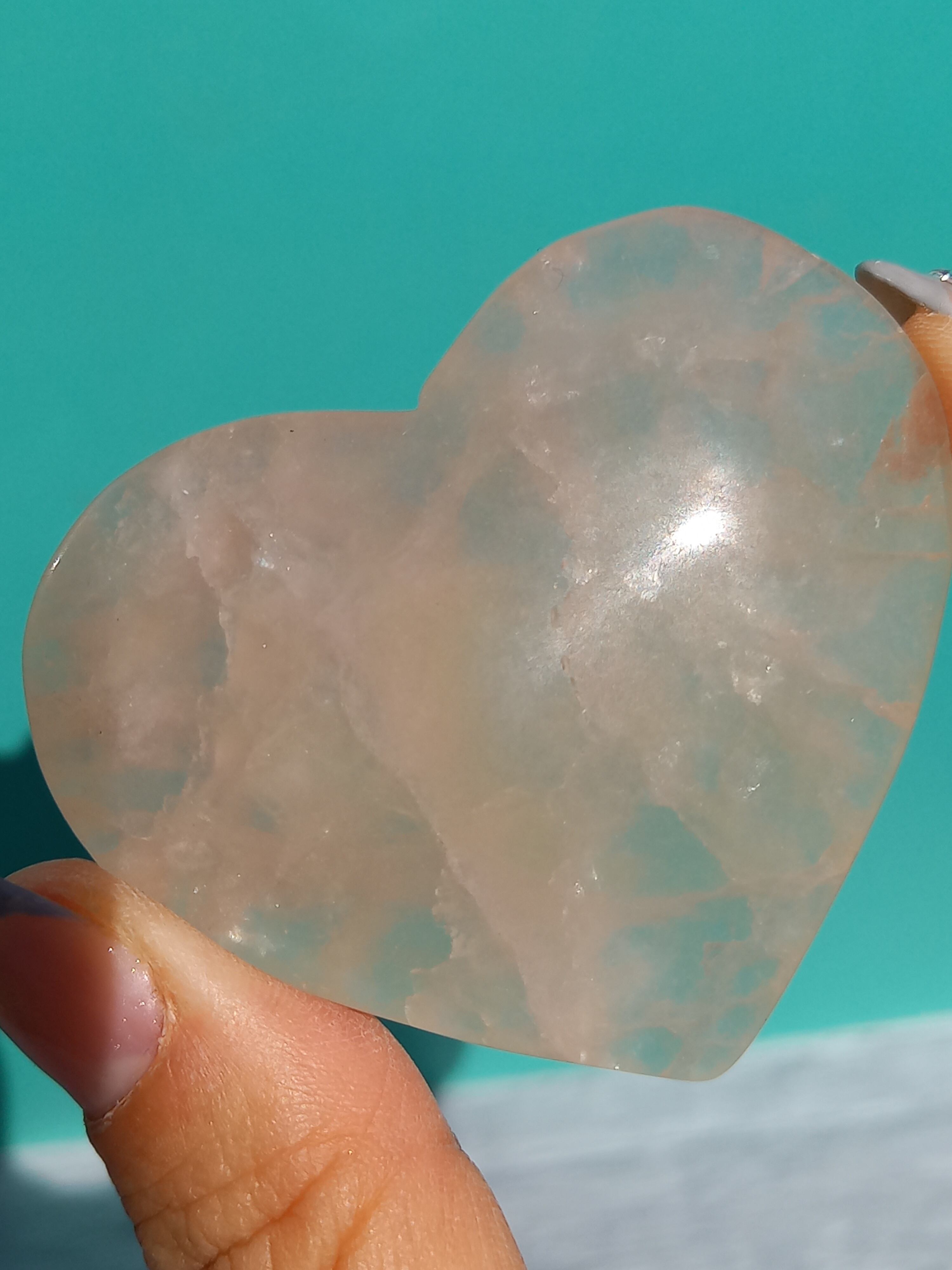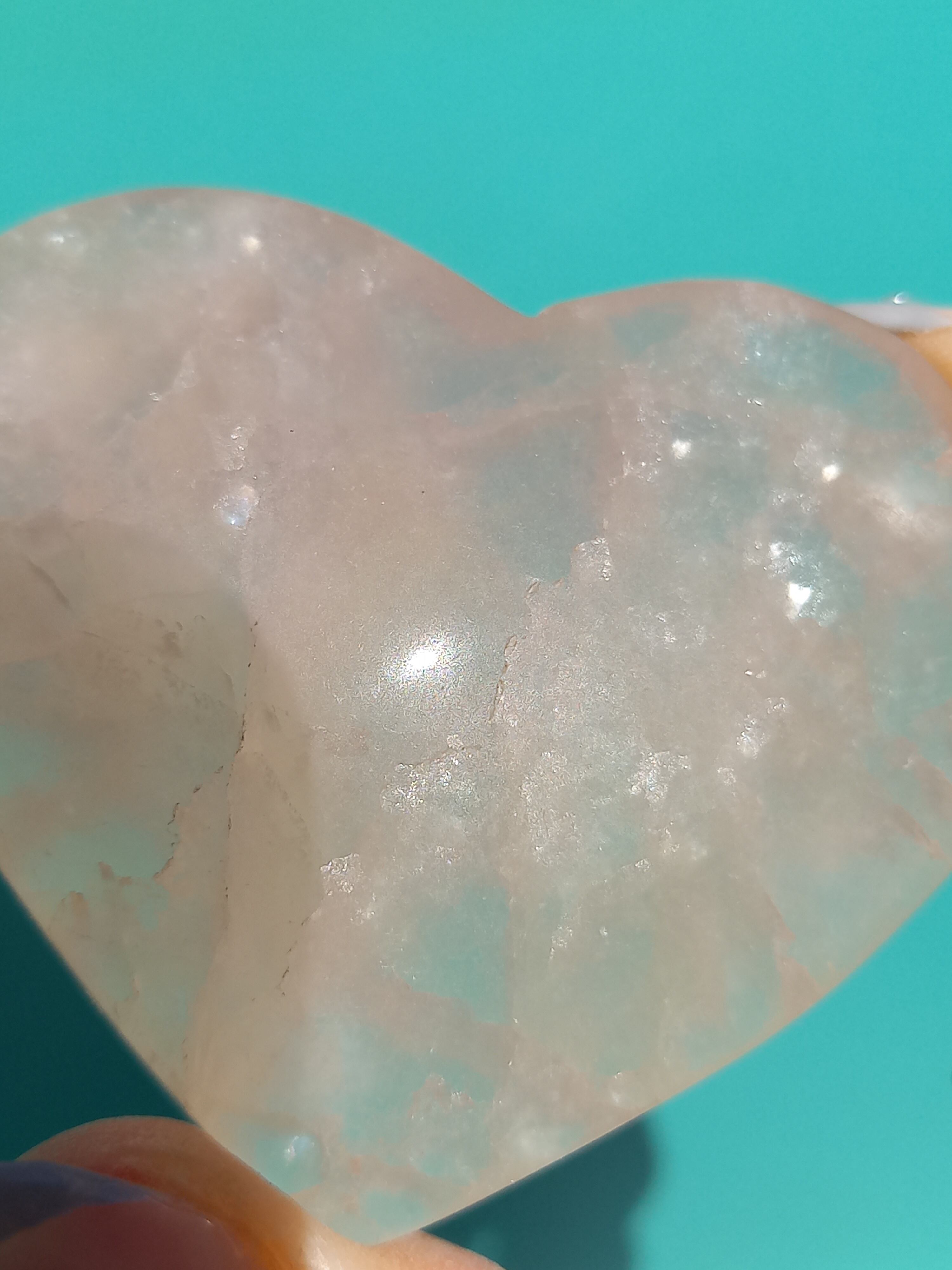 透明感ある薄ピンクのフローライトに、マイカがたっぷり入ったハートパームになります。