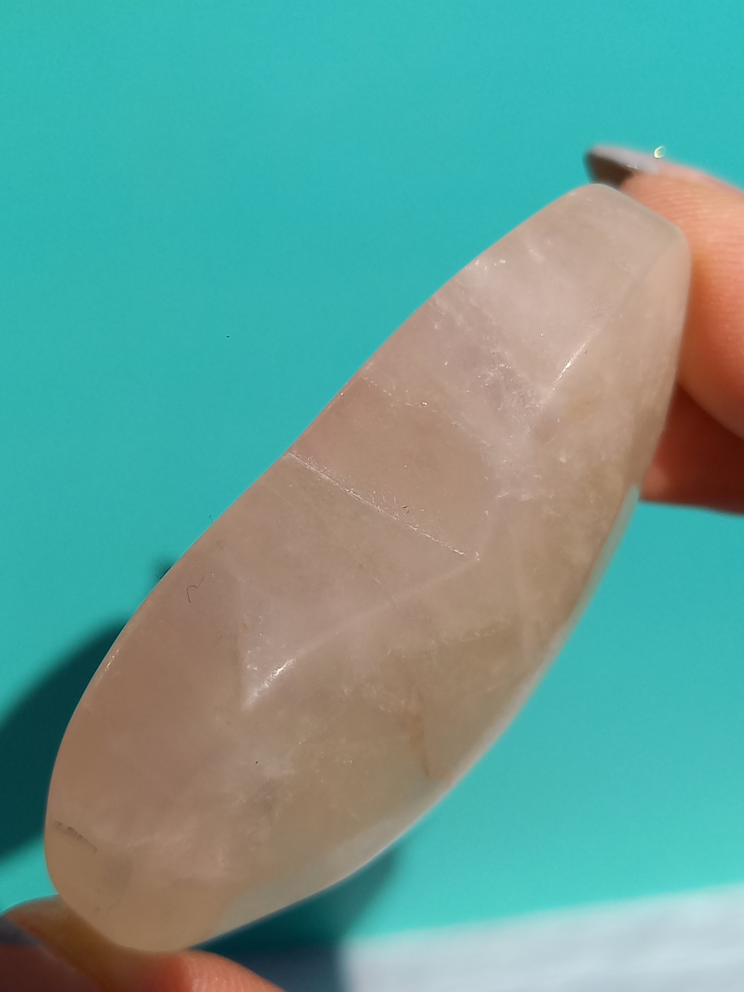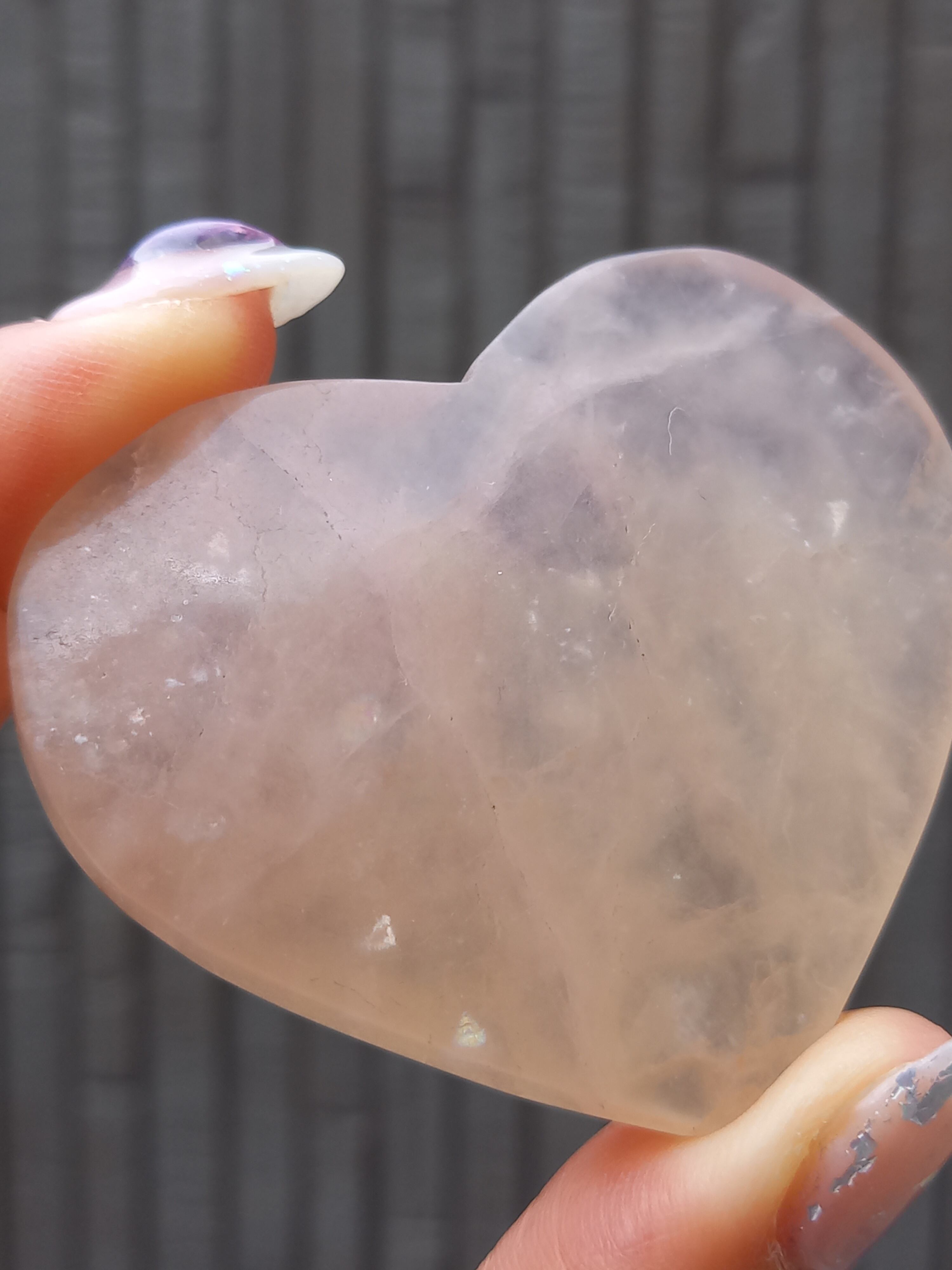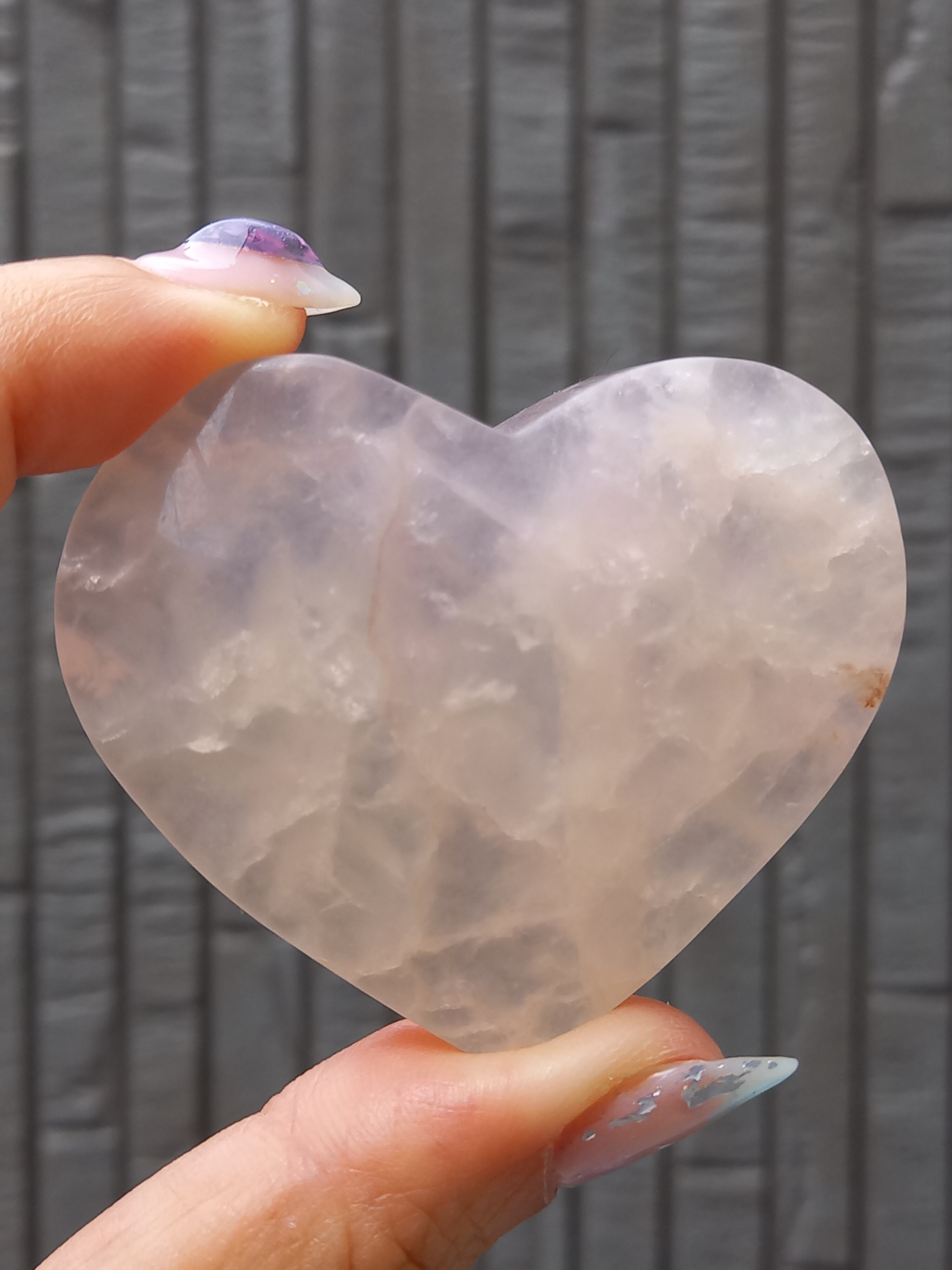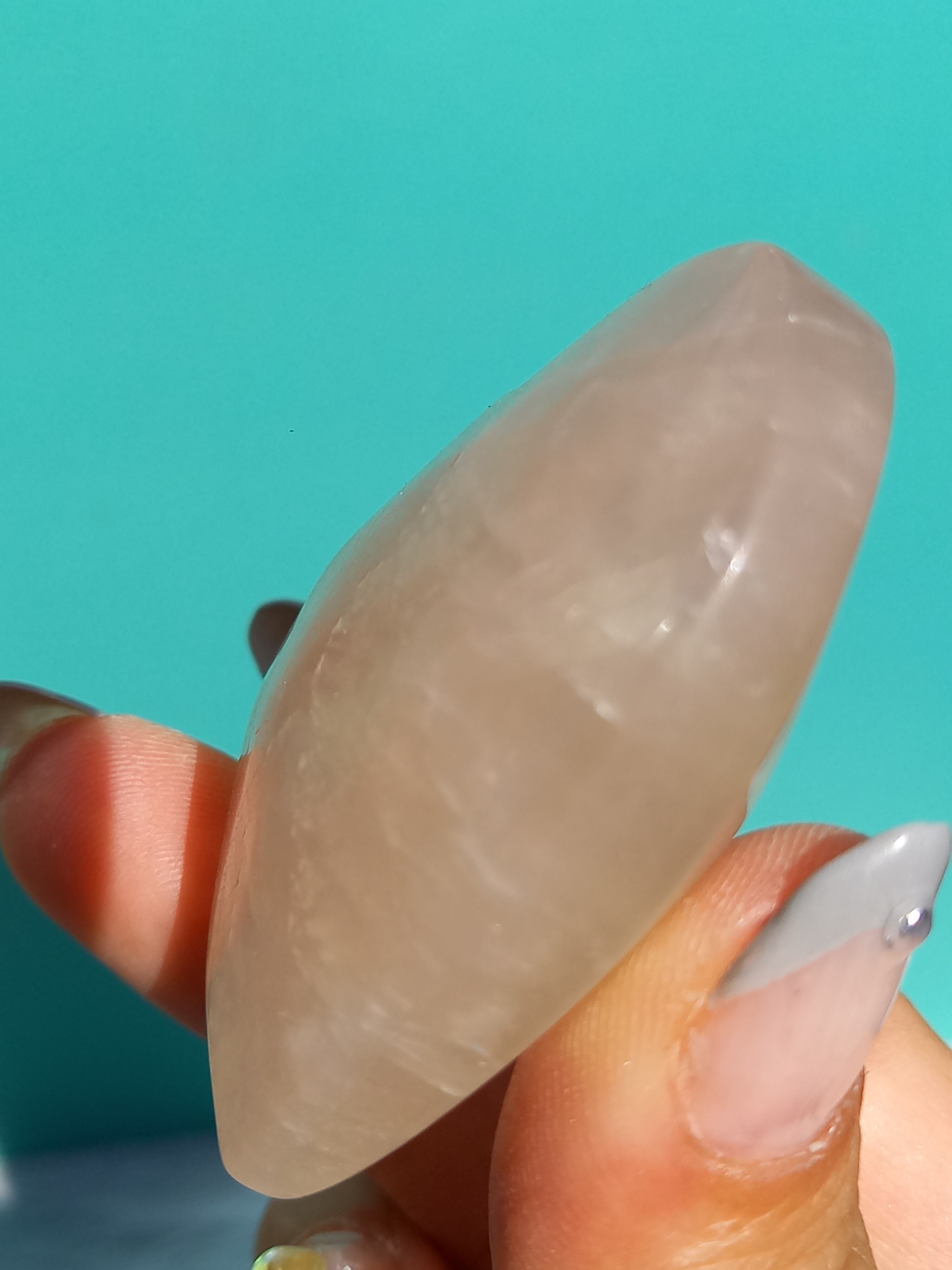 透明感ある薄ピンクのフローライトに、マイカがたっぷり入ったハートパームになります。