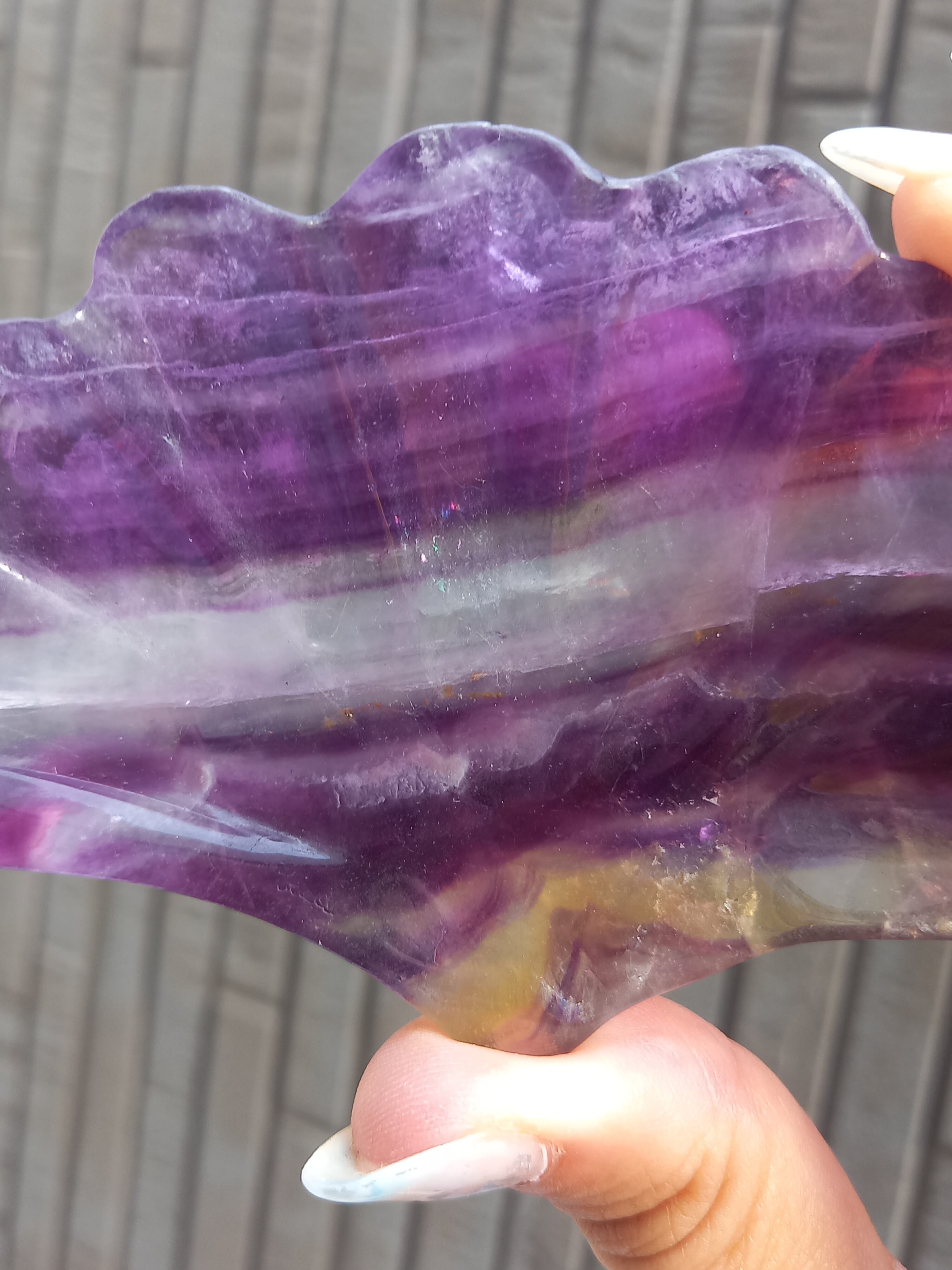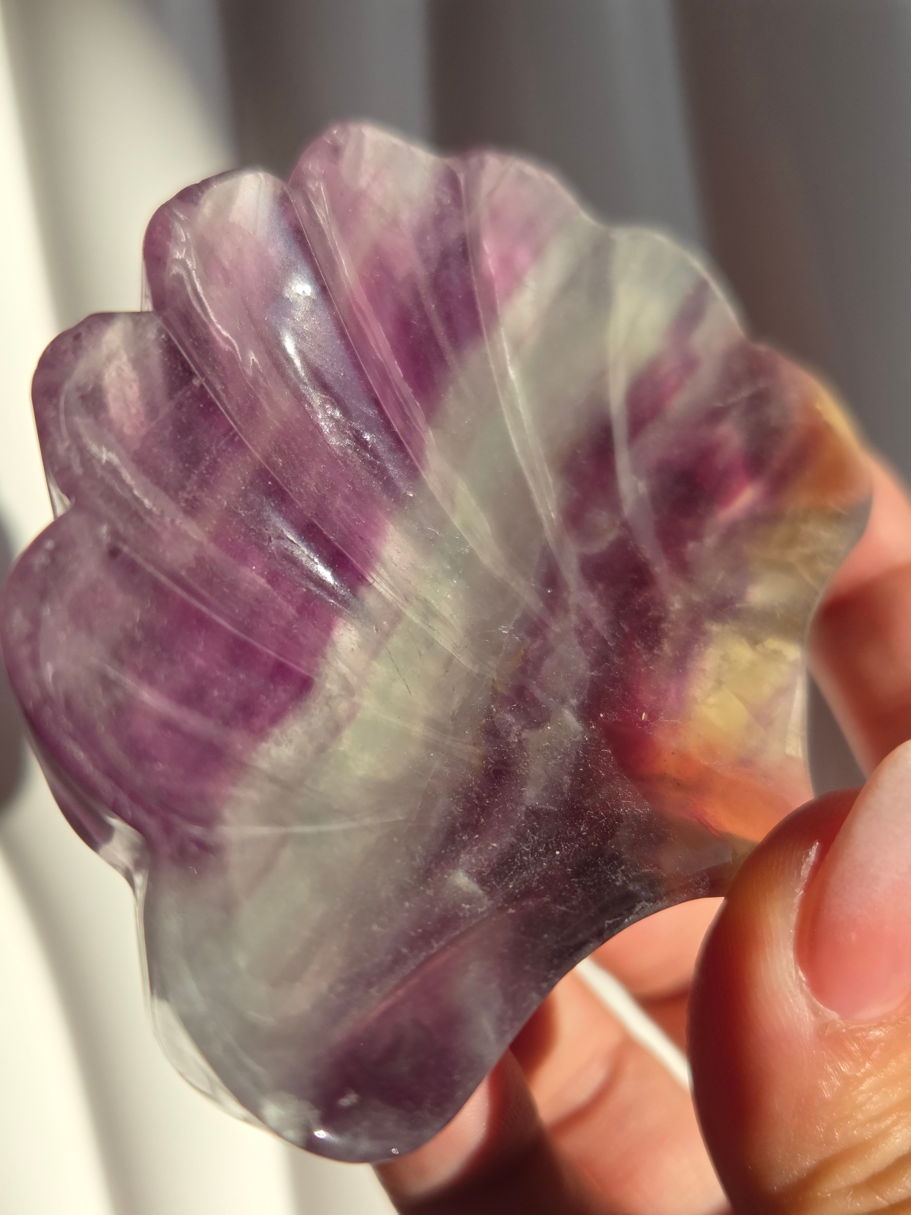 レインボーカラーのシェル形フローライトの小皿です。