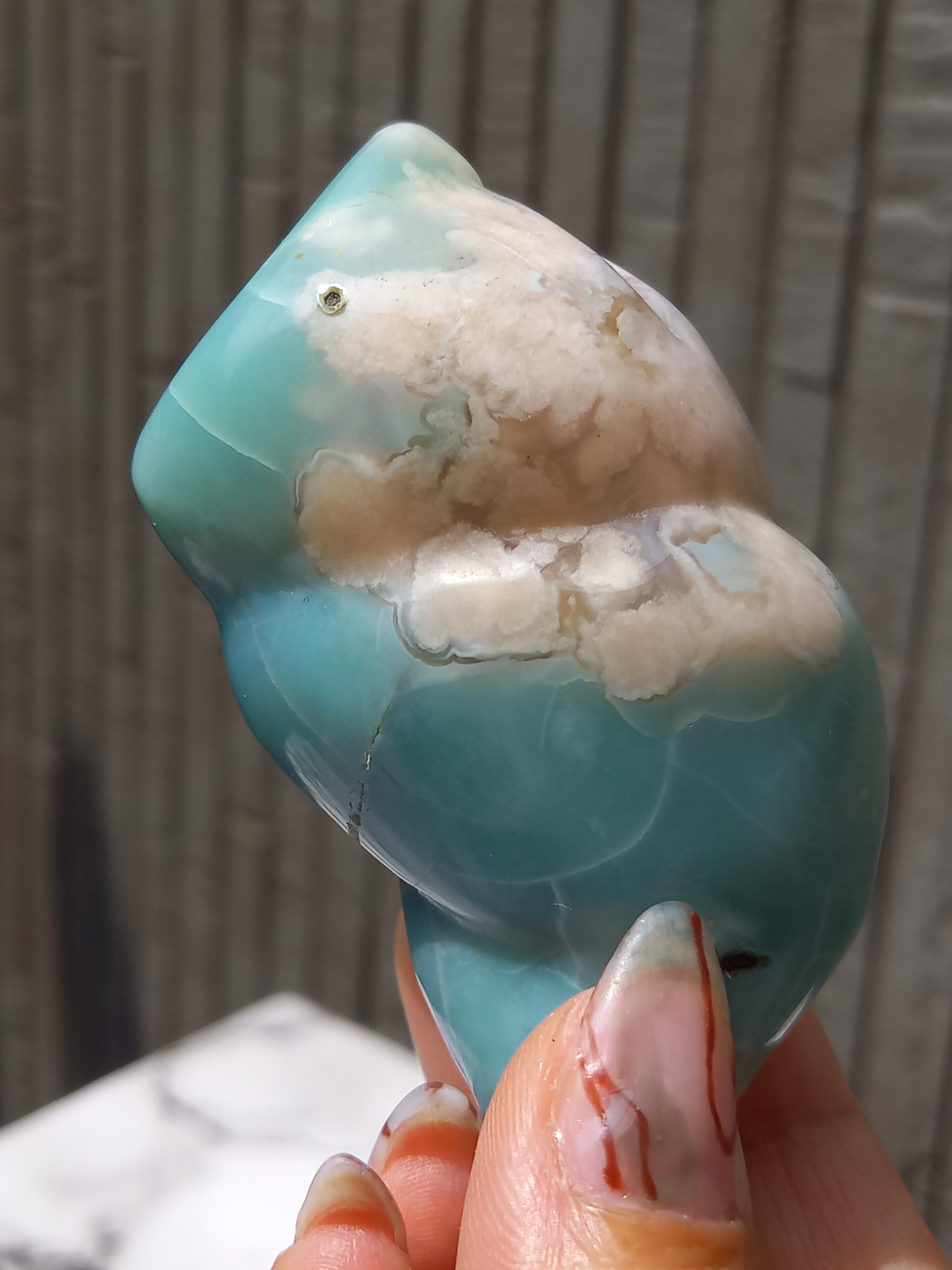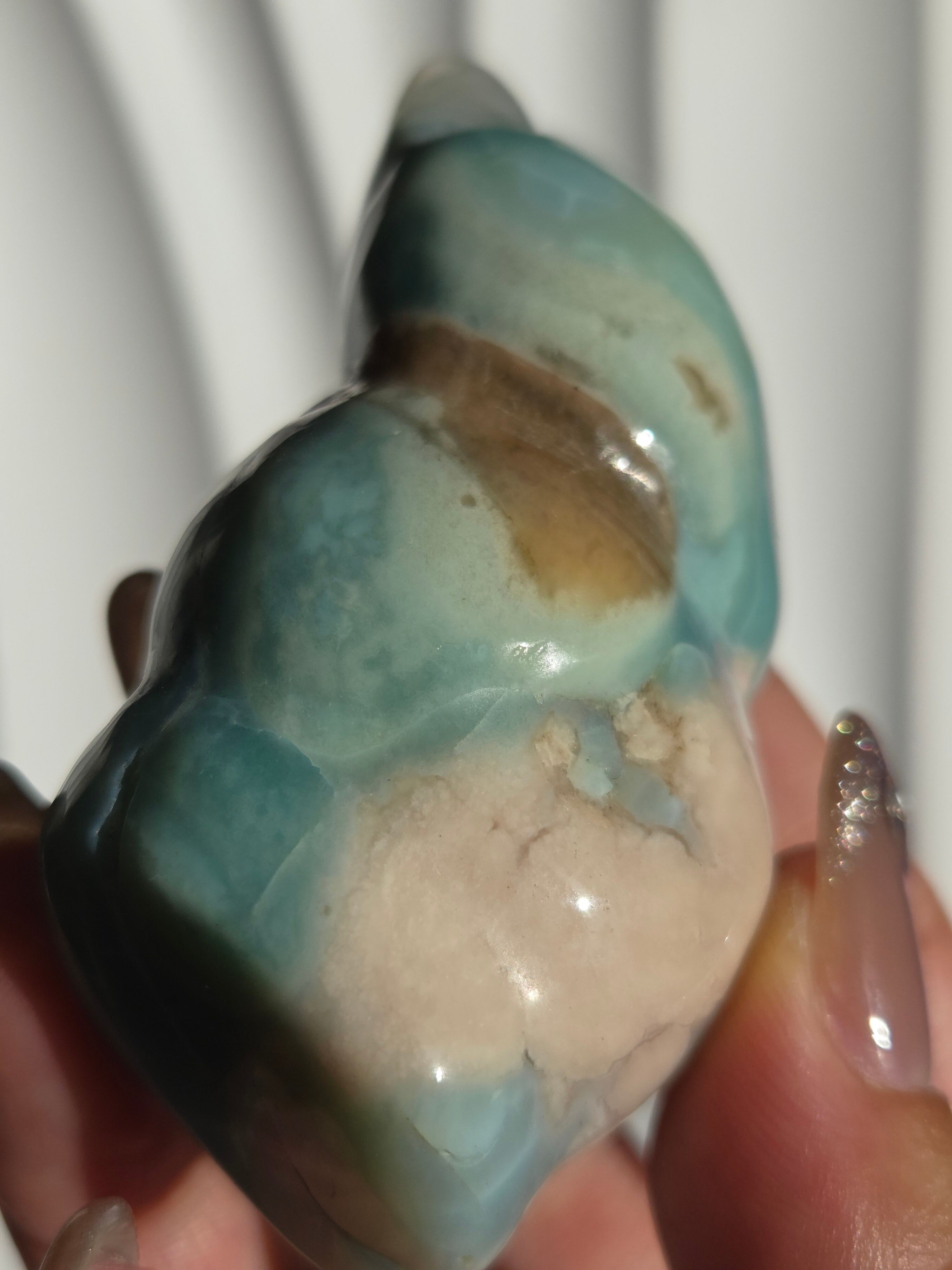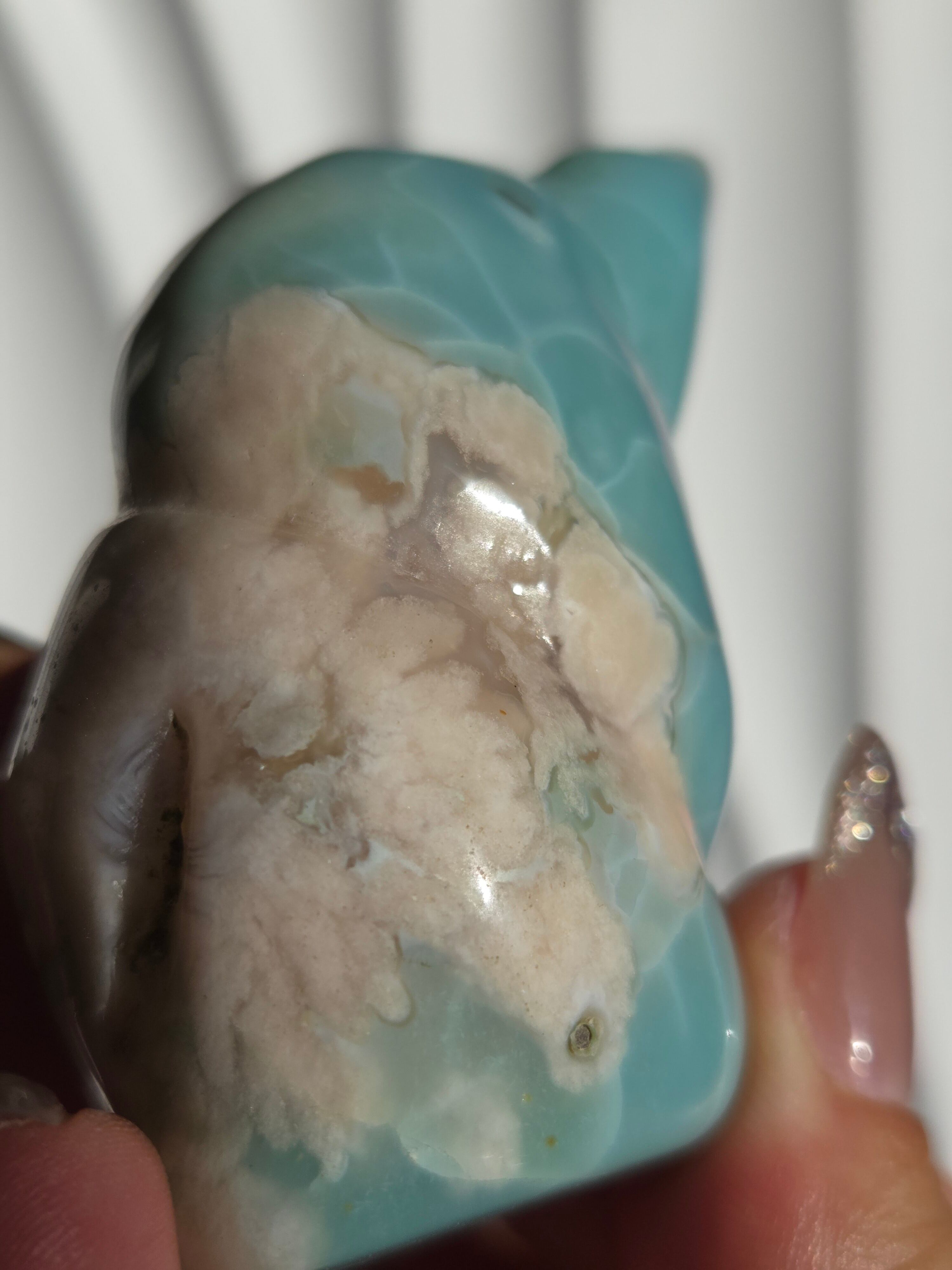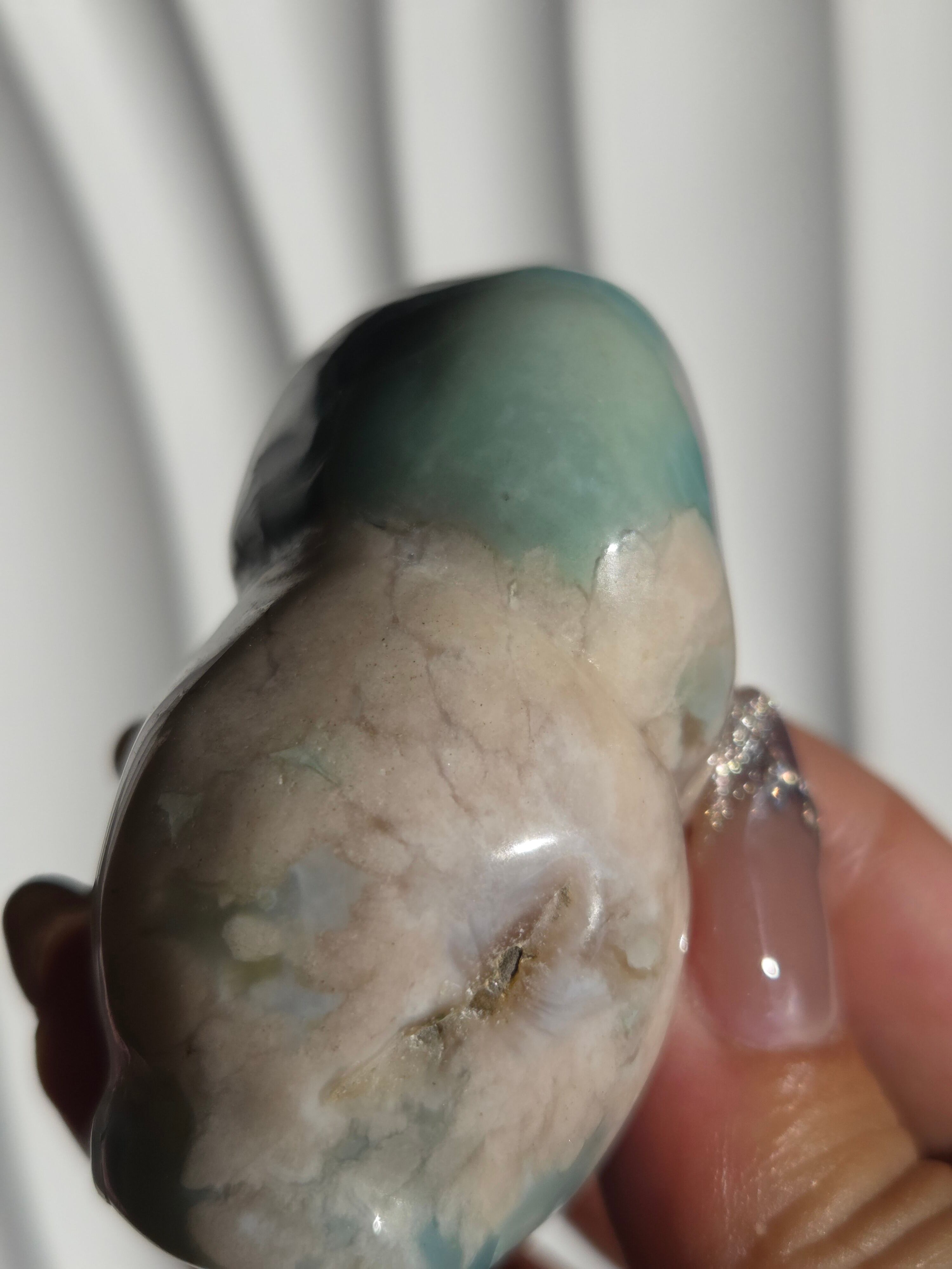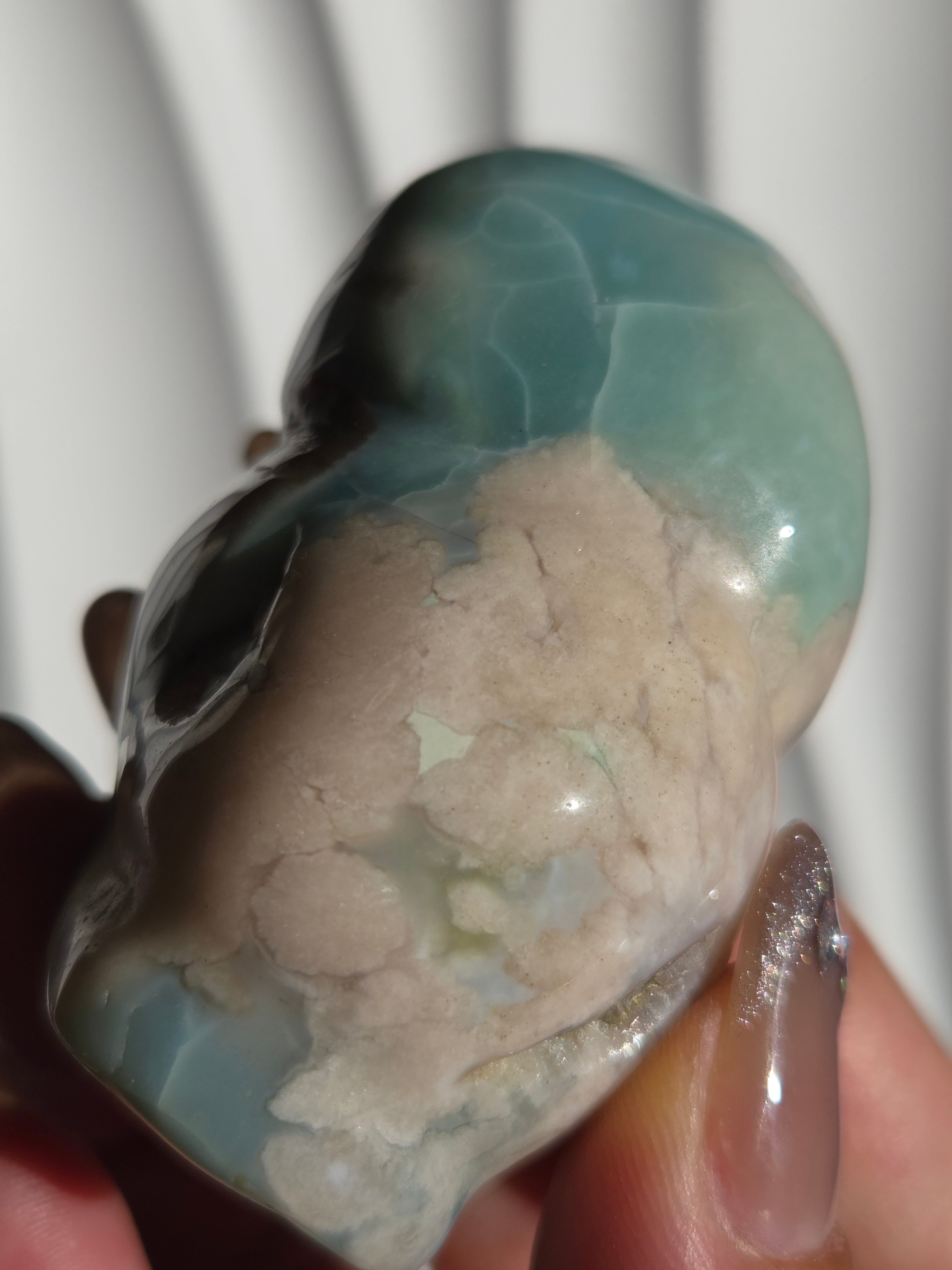 フラワーアゲートでは珍しいカラーの子です。濃い海色カラーに、ピンクベージュのお花がチャームポイントの子です。