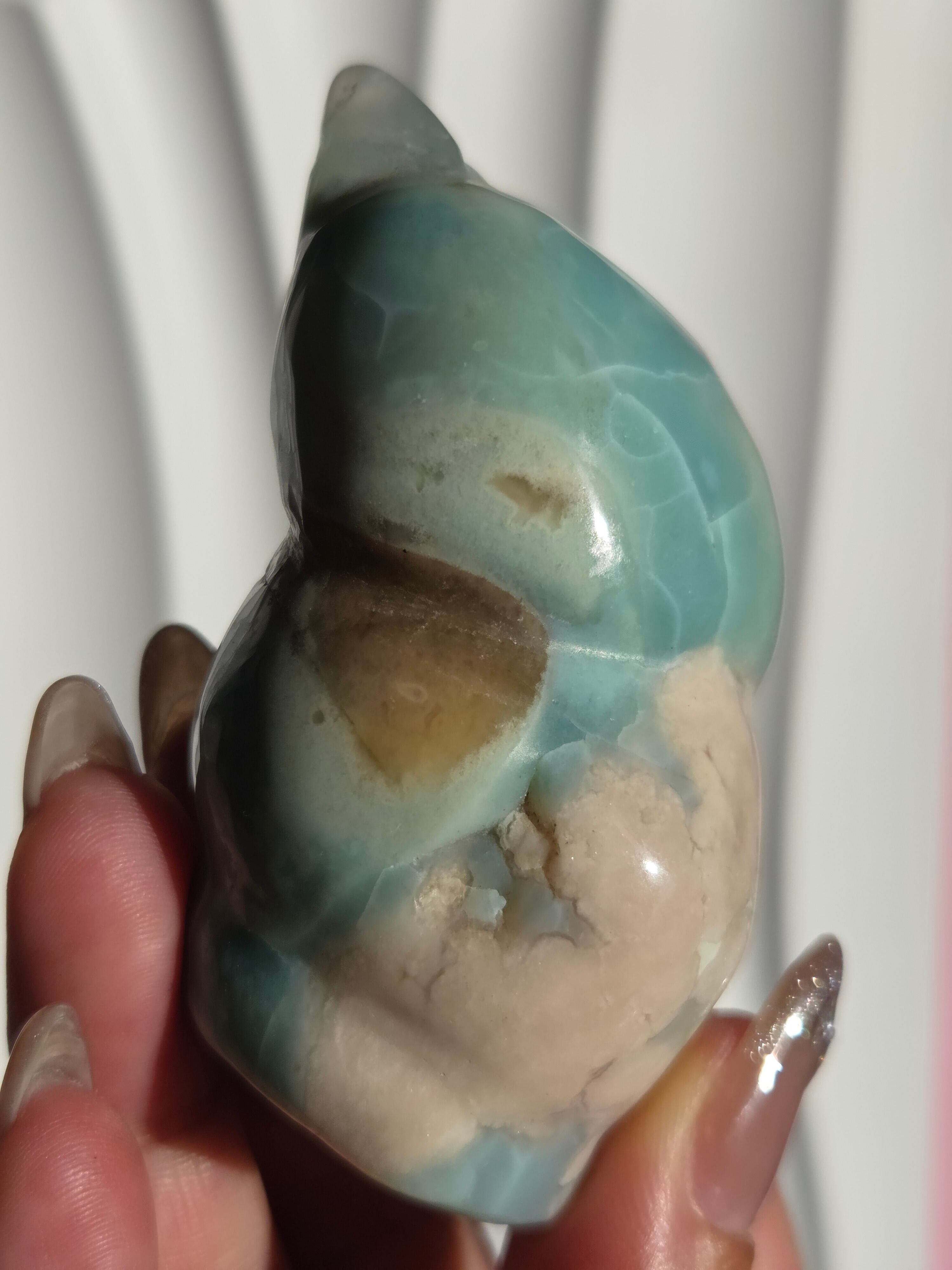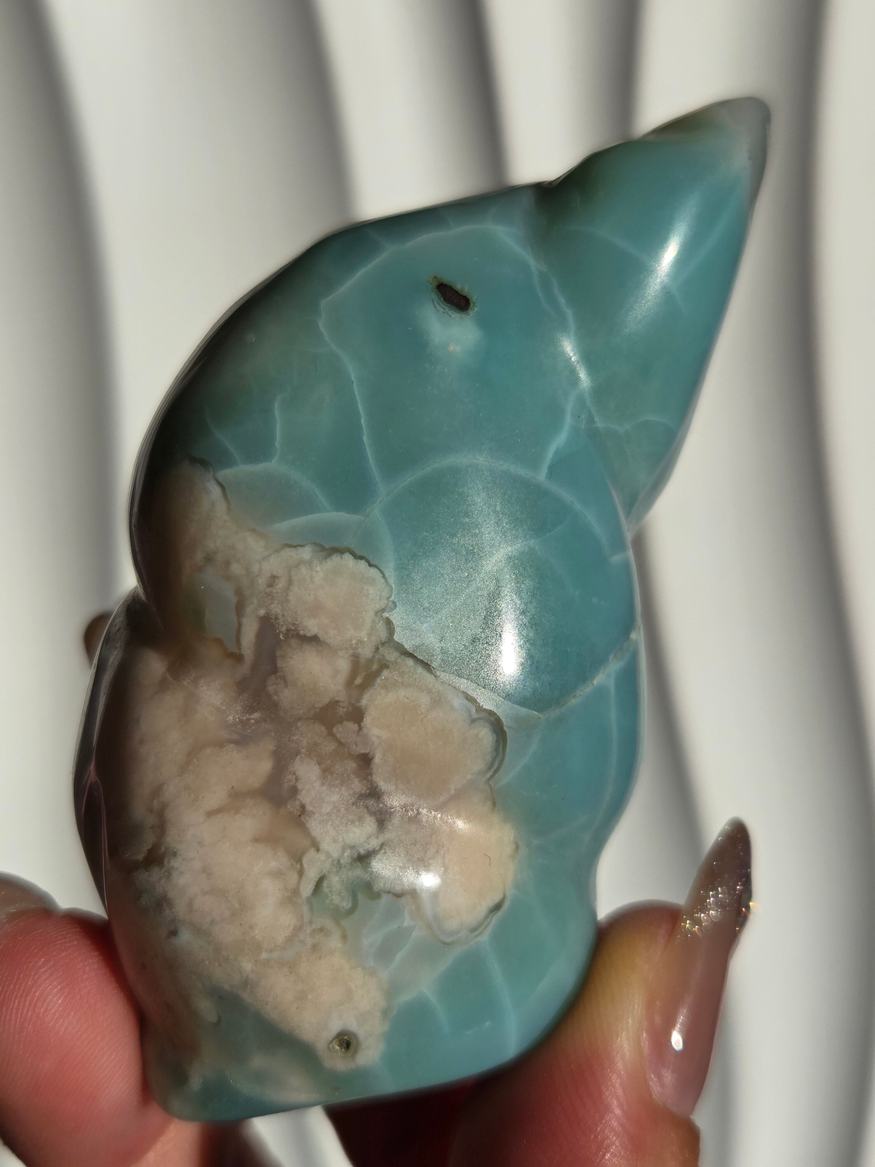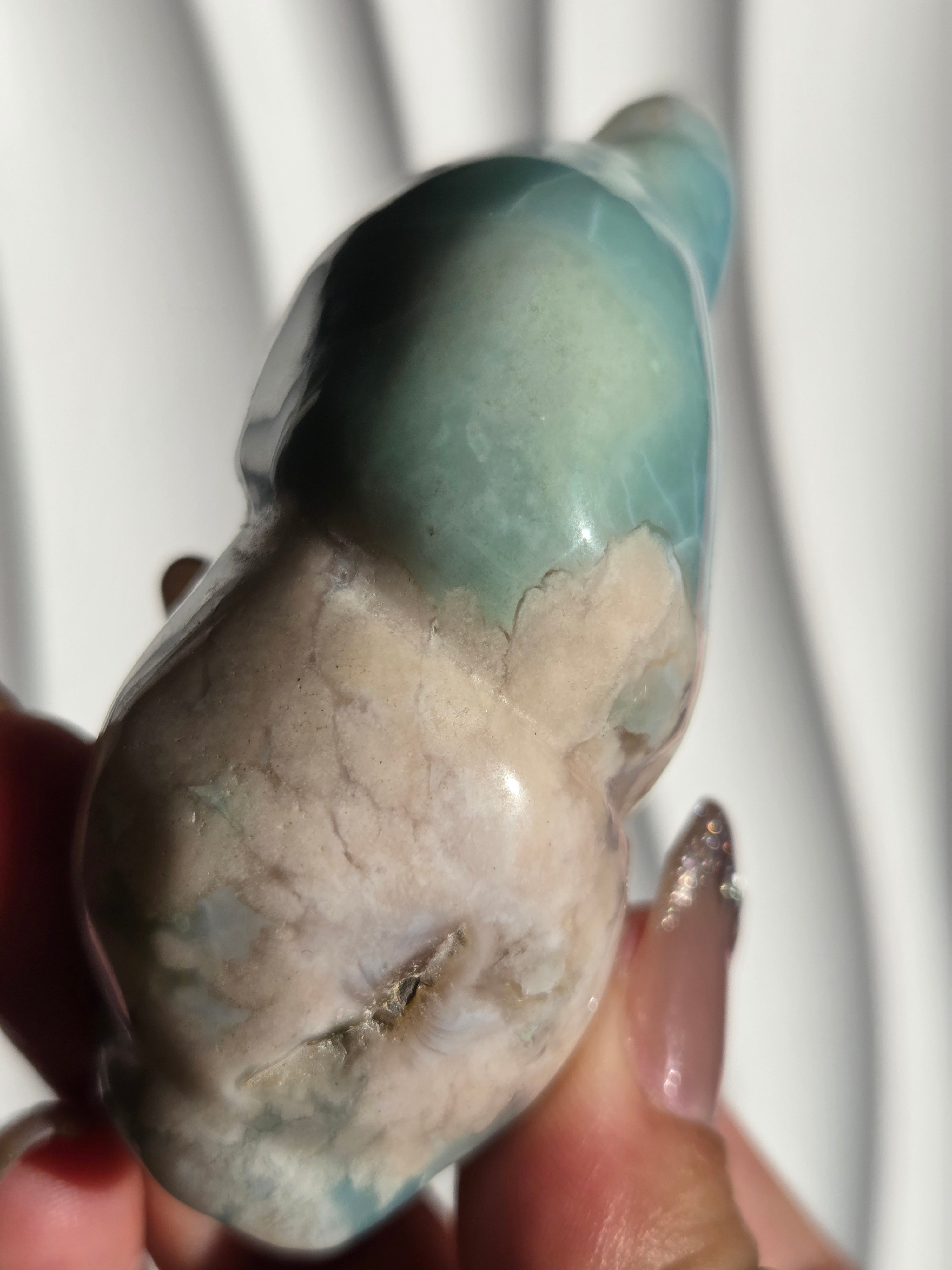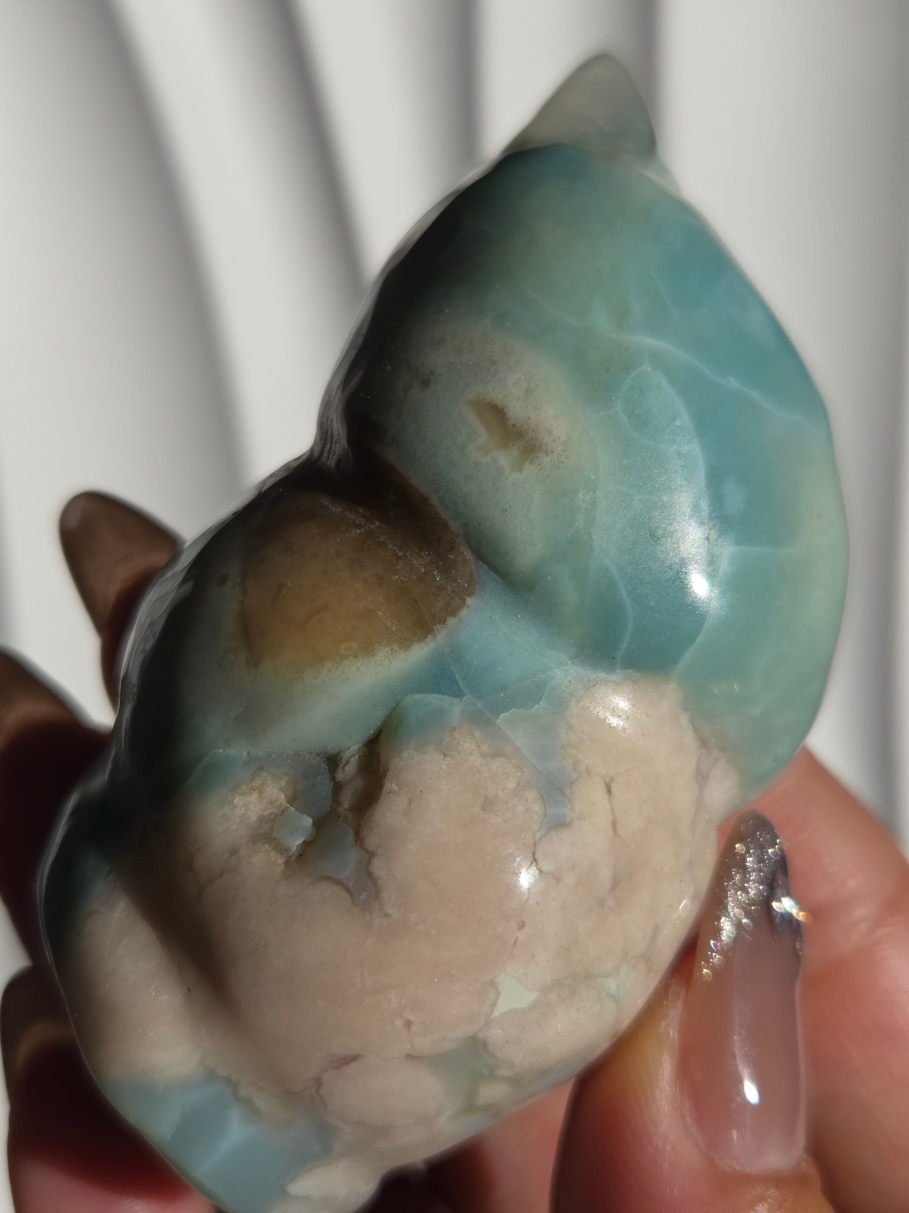 フラワーアゲートでは珍しいカラーの子です。濃い海色カラーに、ピンクベージュのお花がチャームポイントの子です。