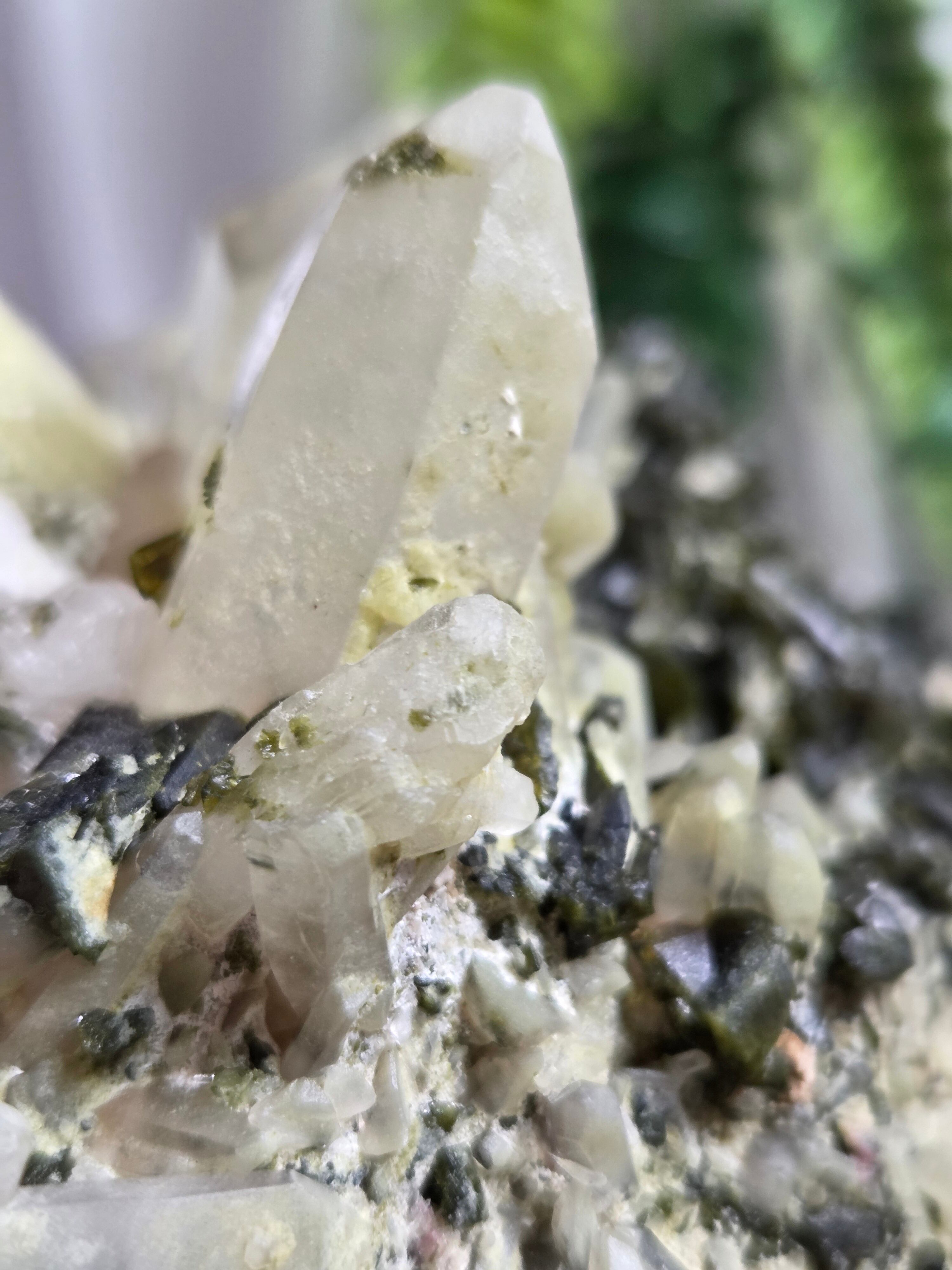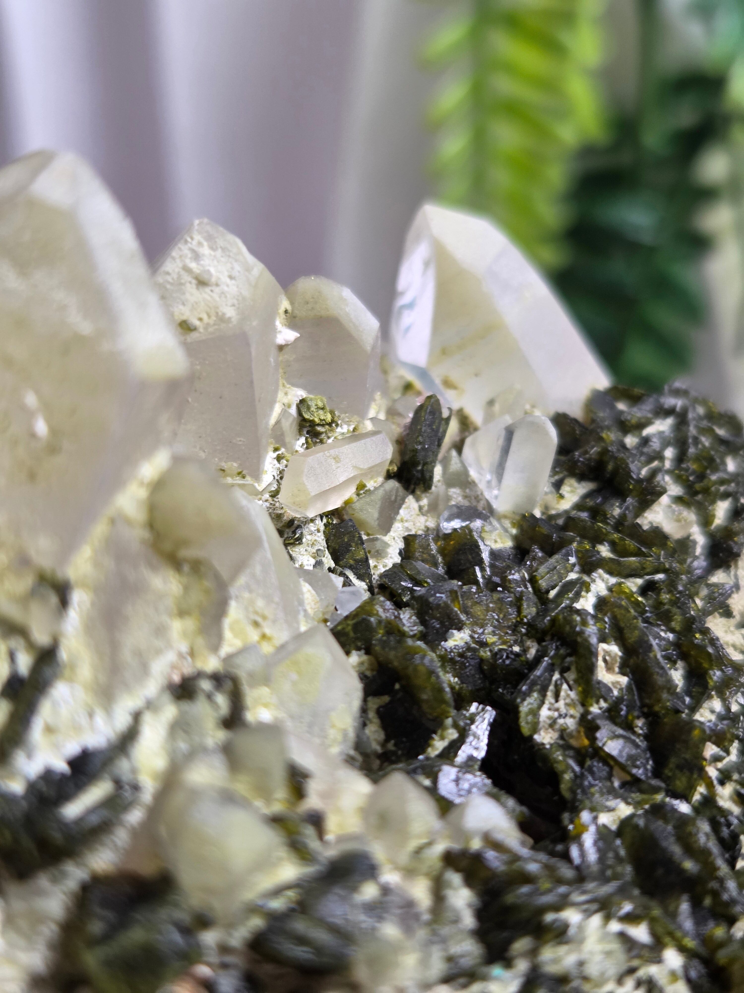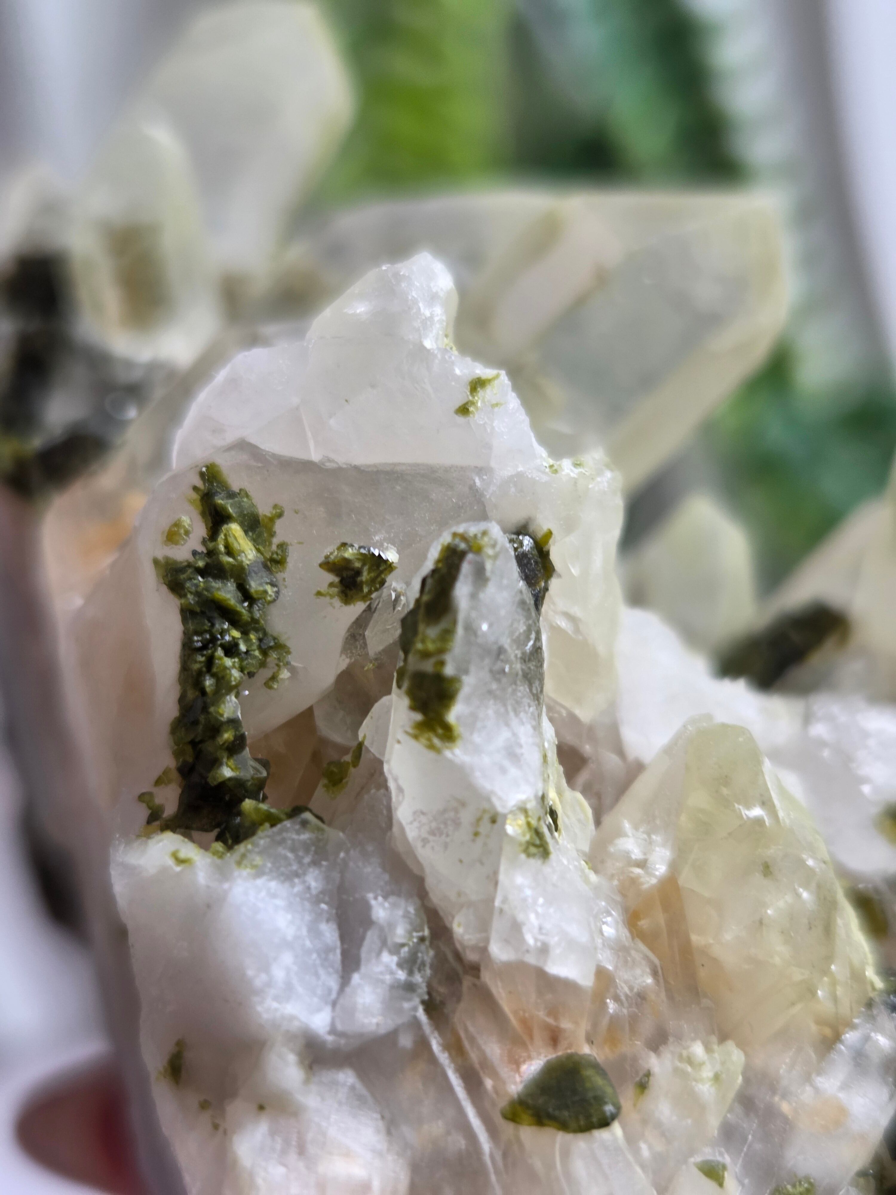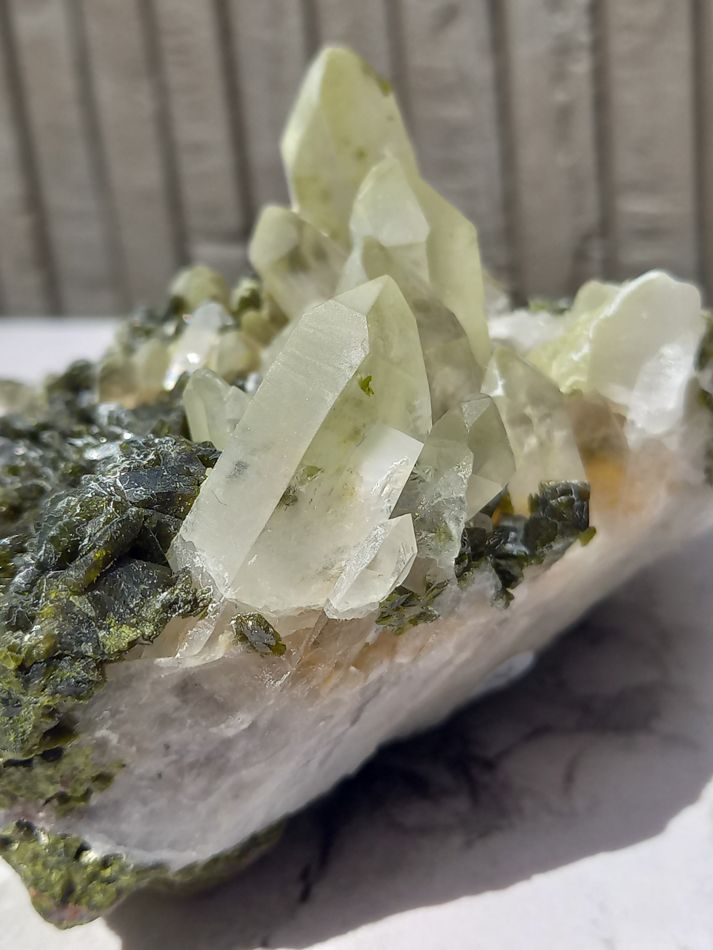 アイダホ州産の、エピドトート(緑の部分)と、クリアクォーツの共生クラスターになります。