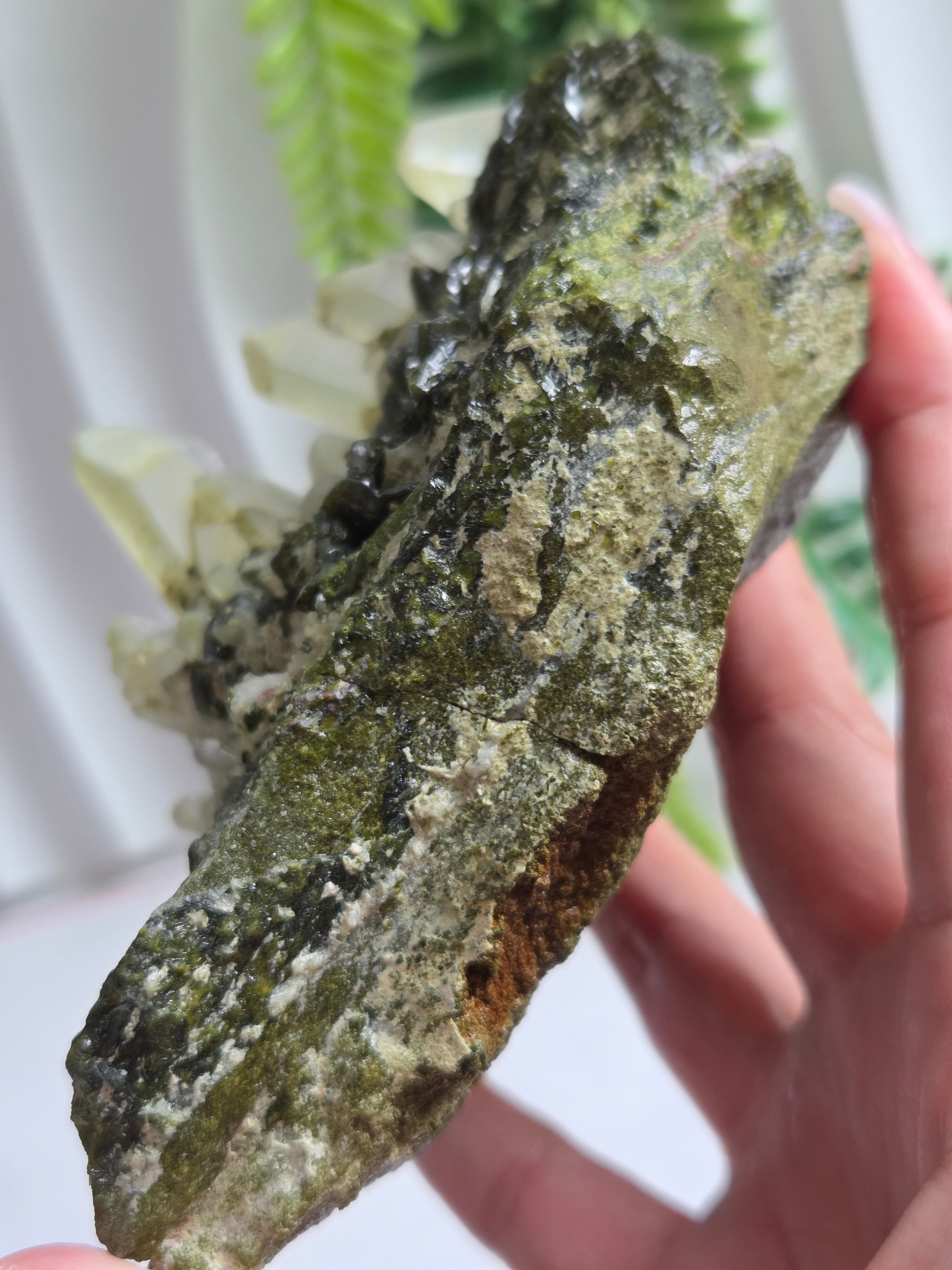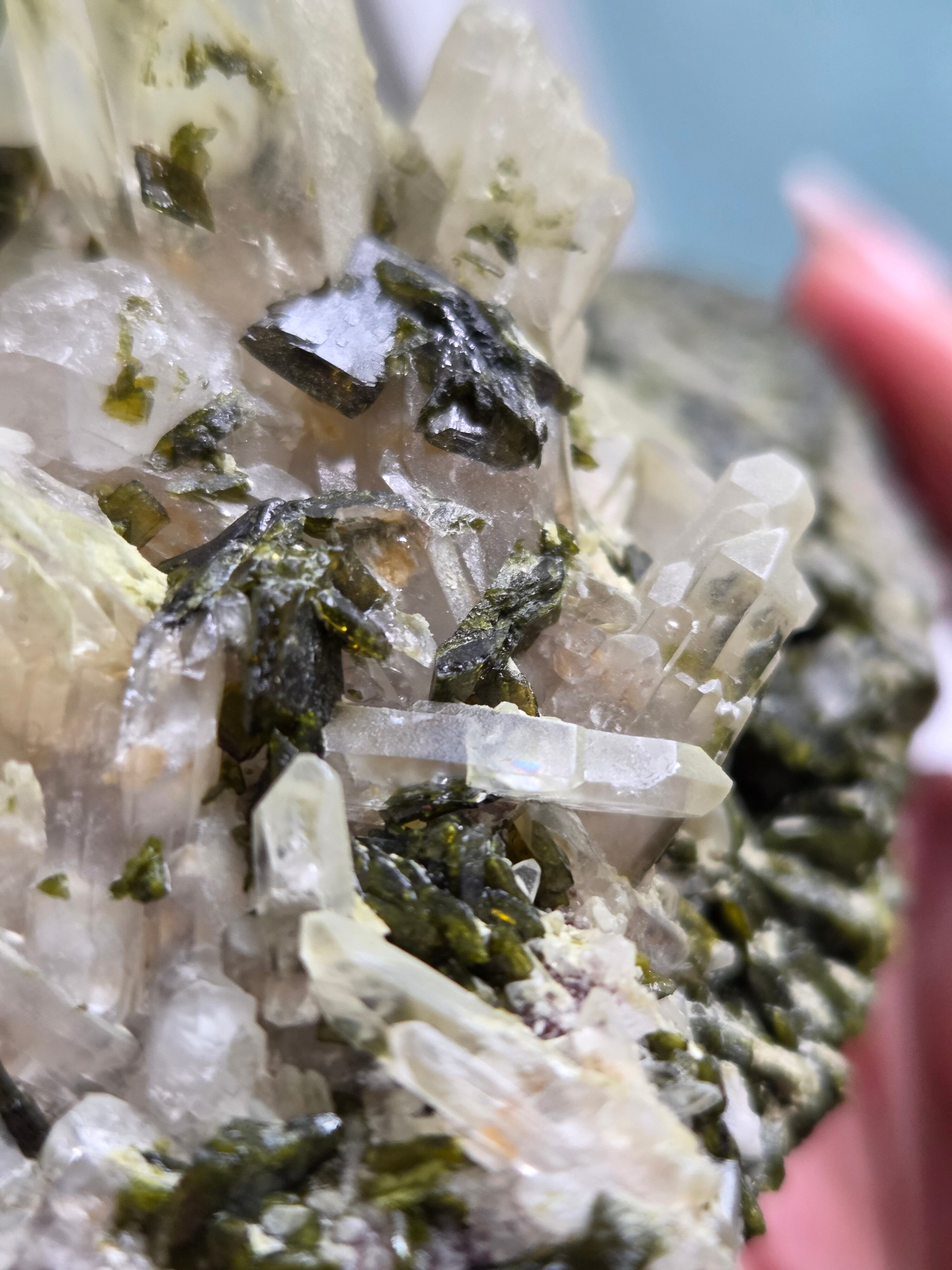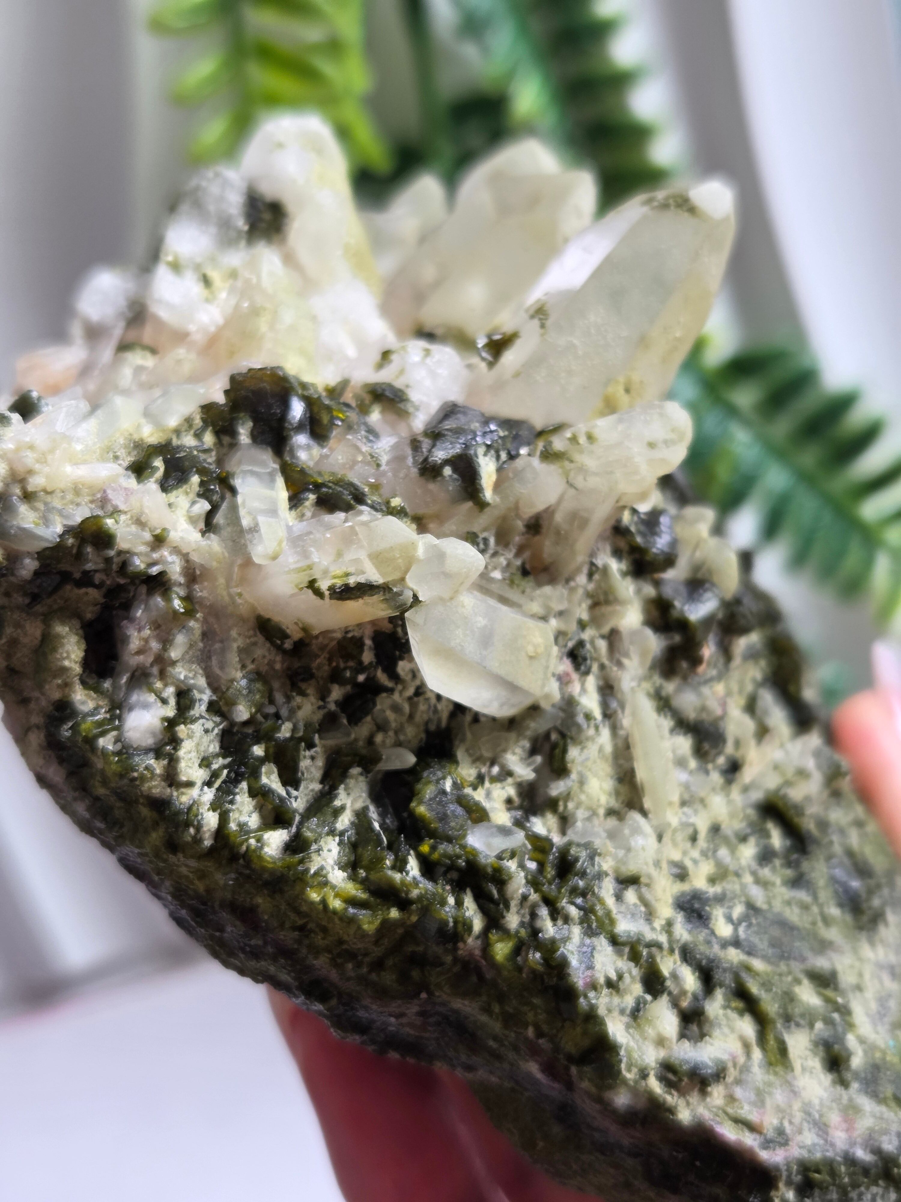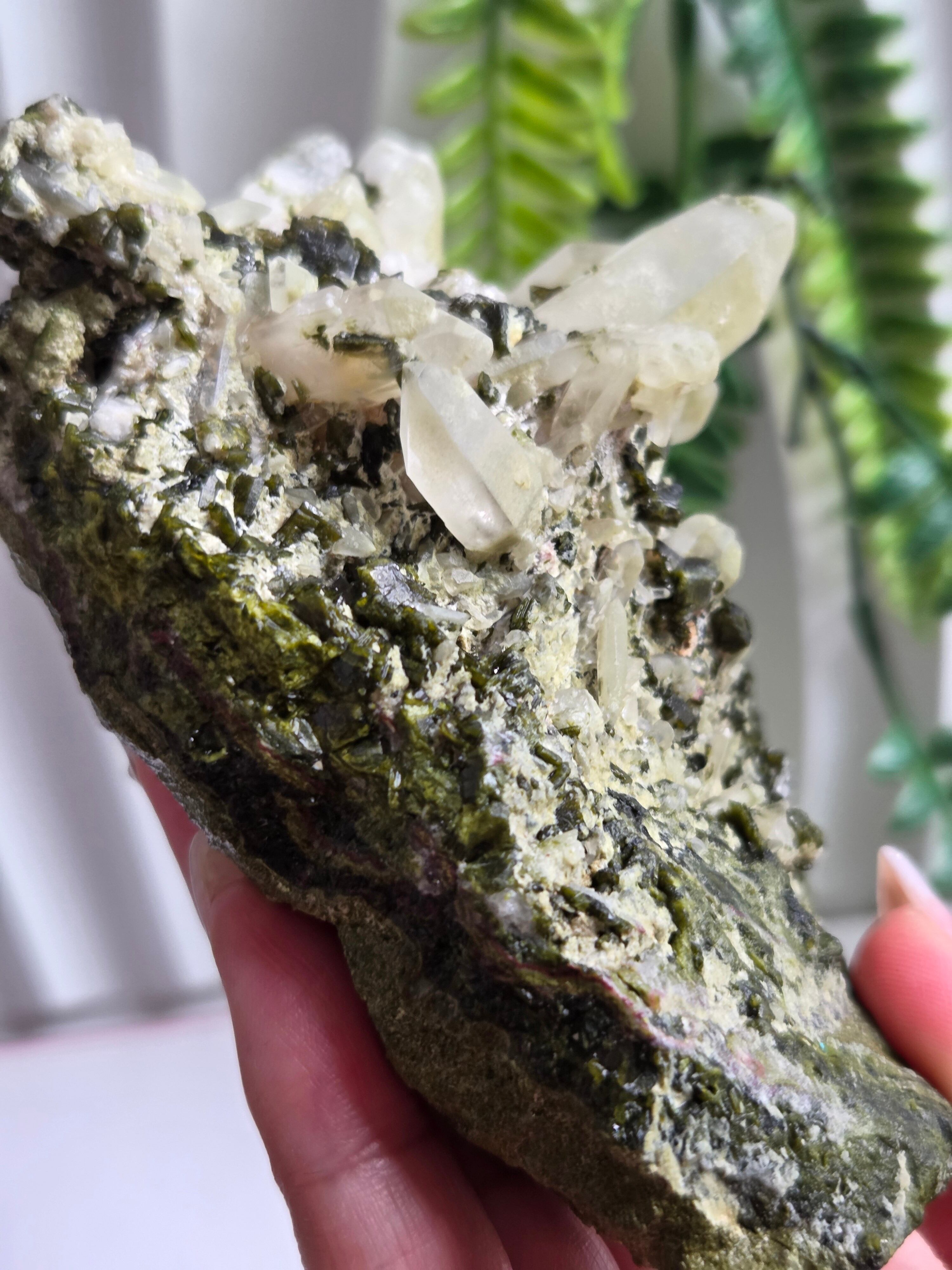アイダホ州産の、エピドトート(緑の部分)と、クリアクォーツの共生クラスターになります。