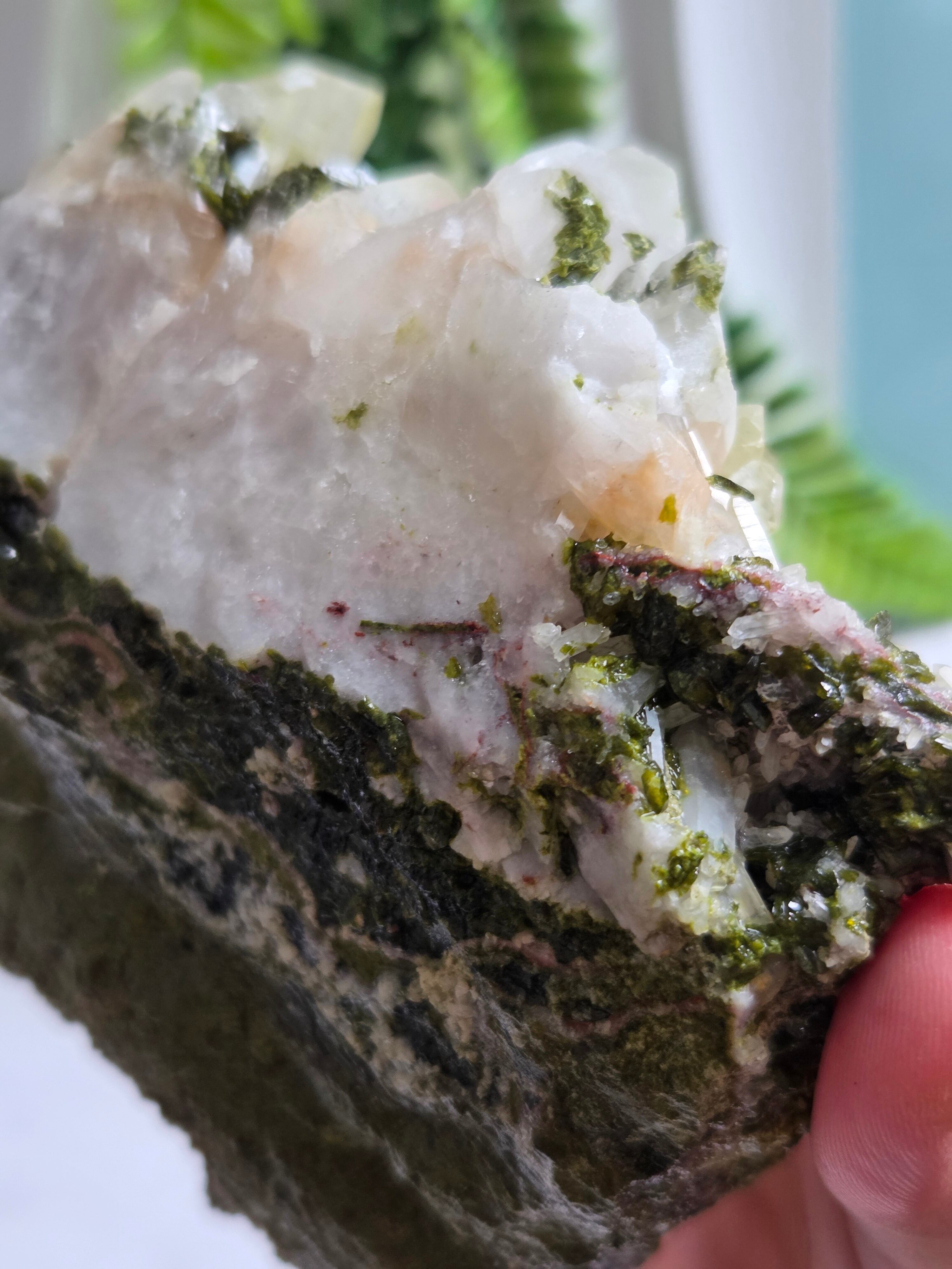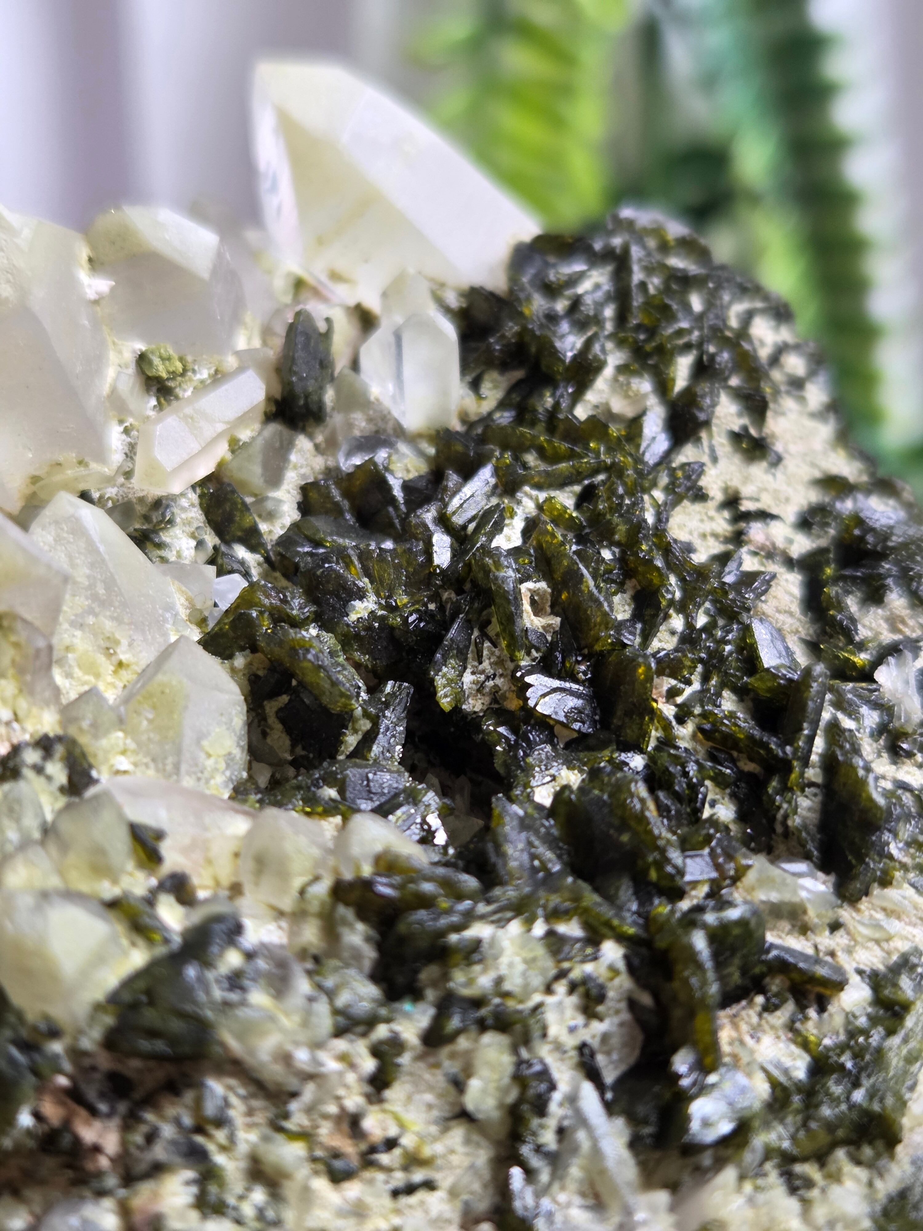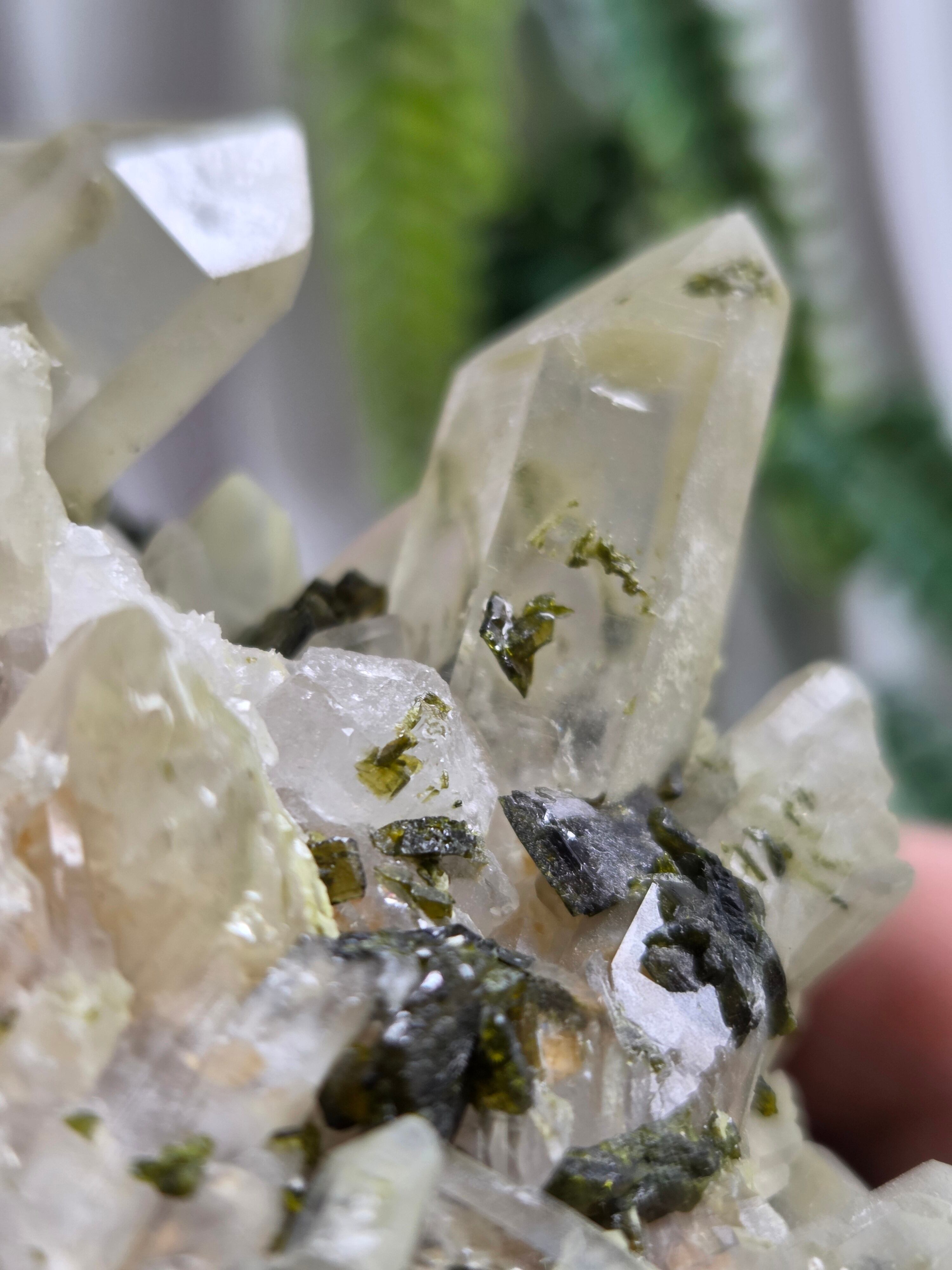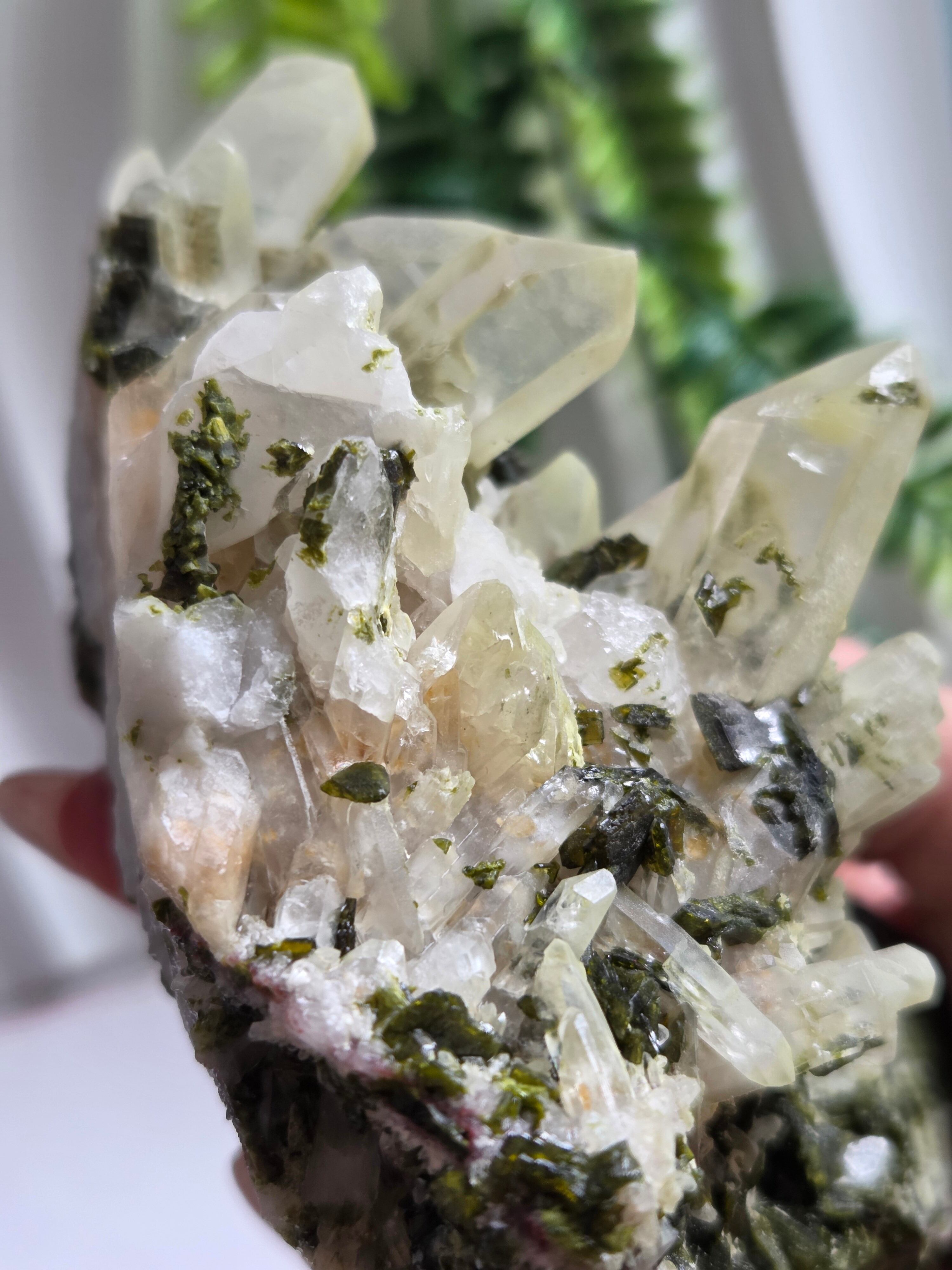 アイダホ州産の、エピドトート(緑の部分)と、クリアクォーツの共生クラスターになります。