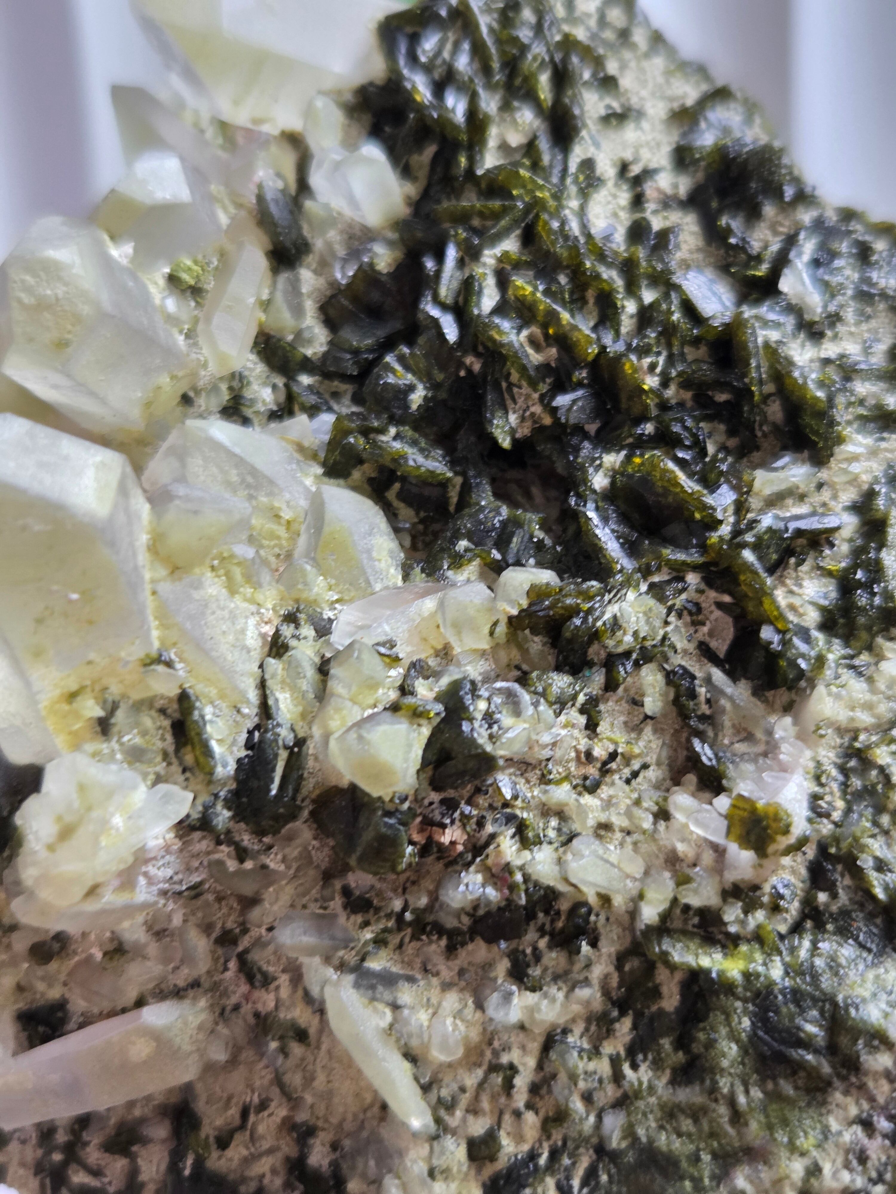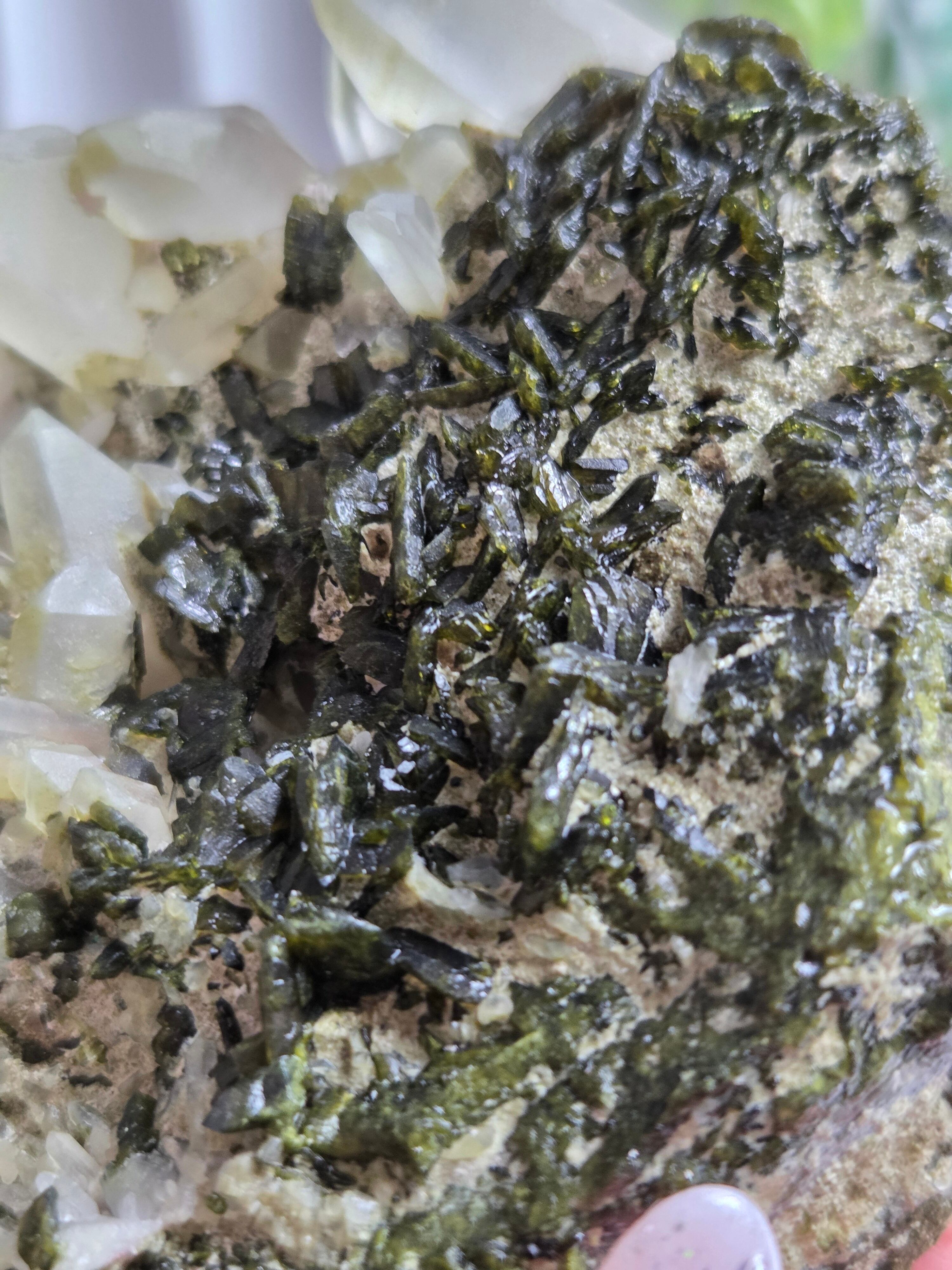 エピソードは薄い緑から濃いピスタチオグリーンのカラーが典型的なもので、結晶は通常柱状で簾(すだれ)のような見た目から、和名では緑簾石と呼んでいます。