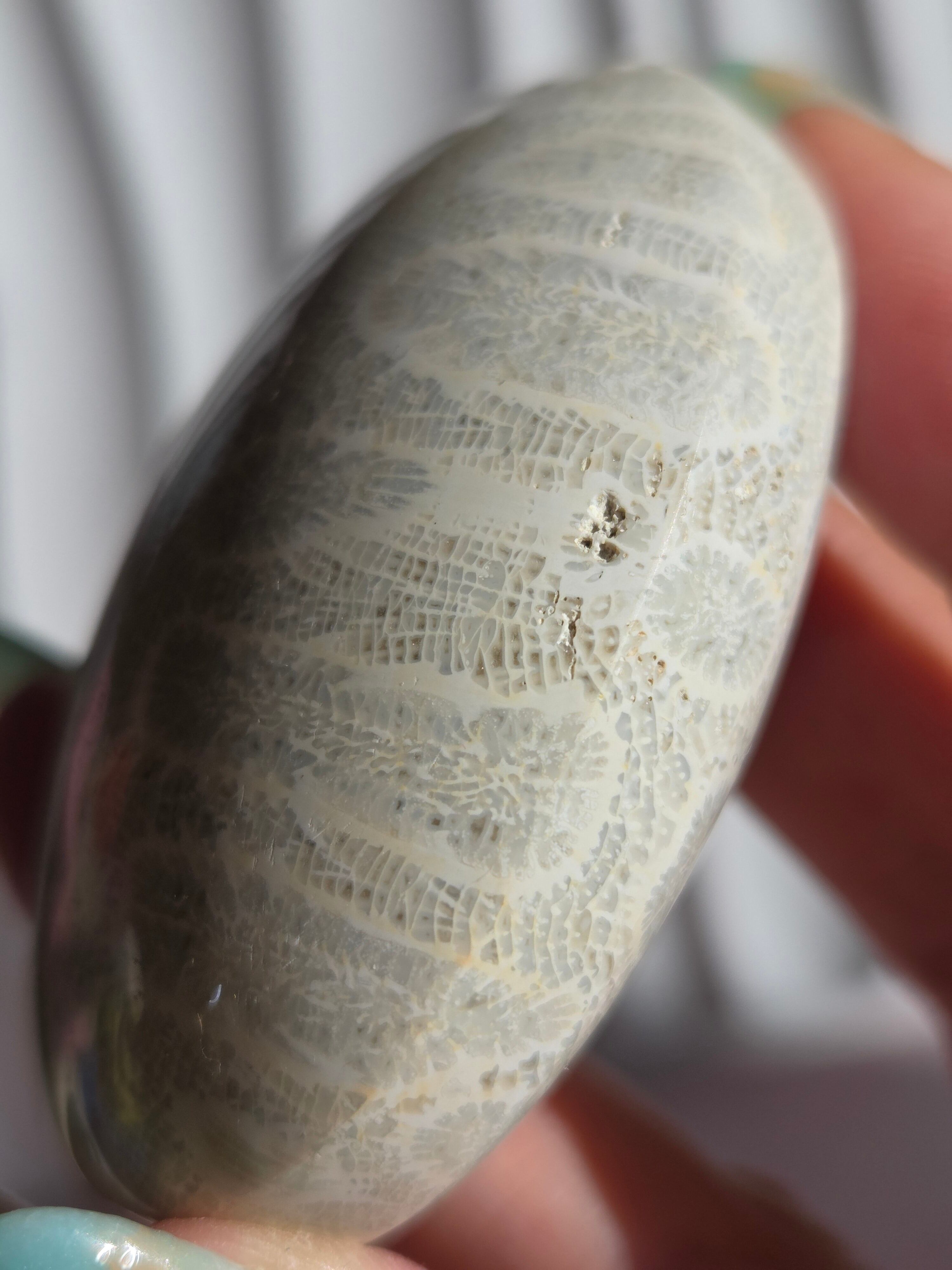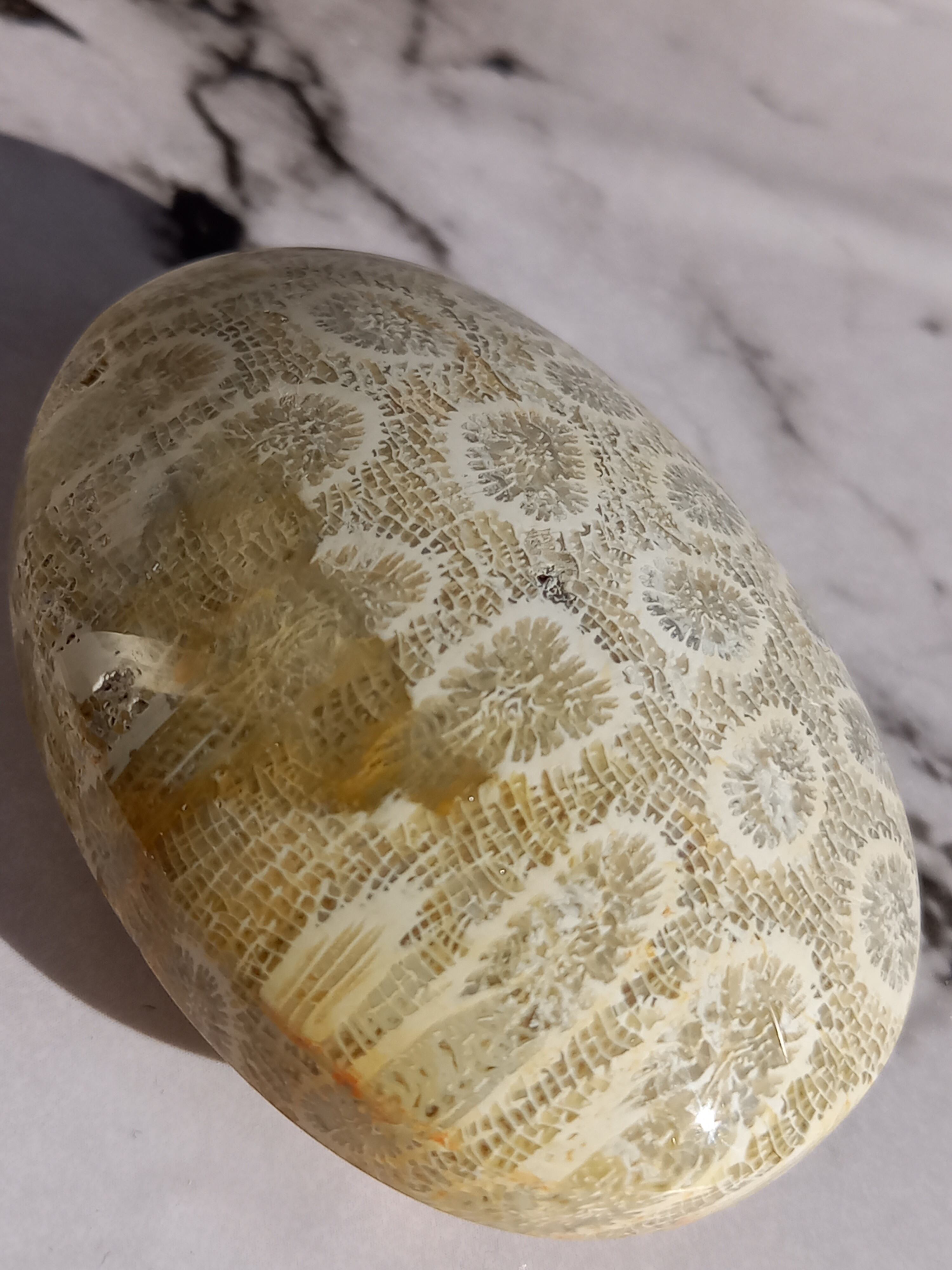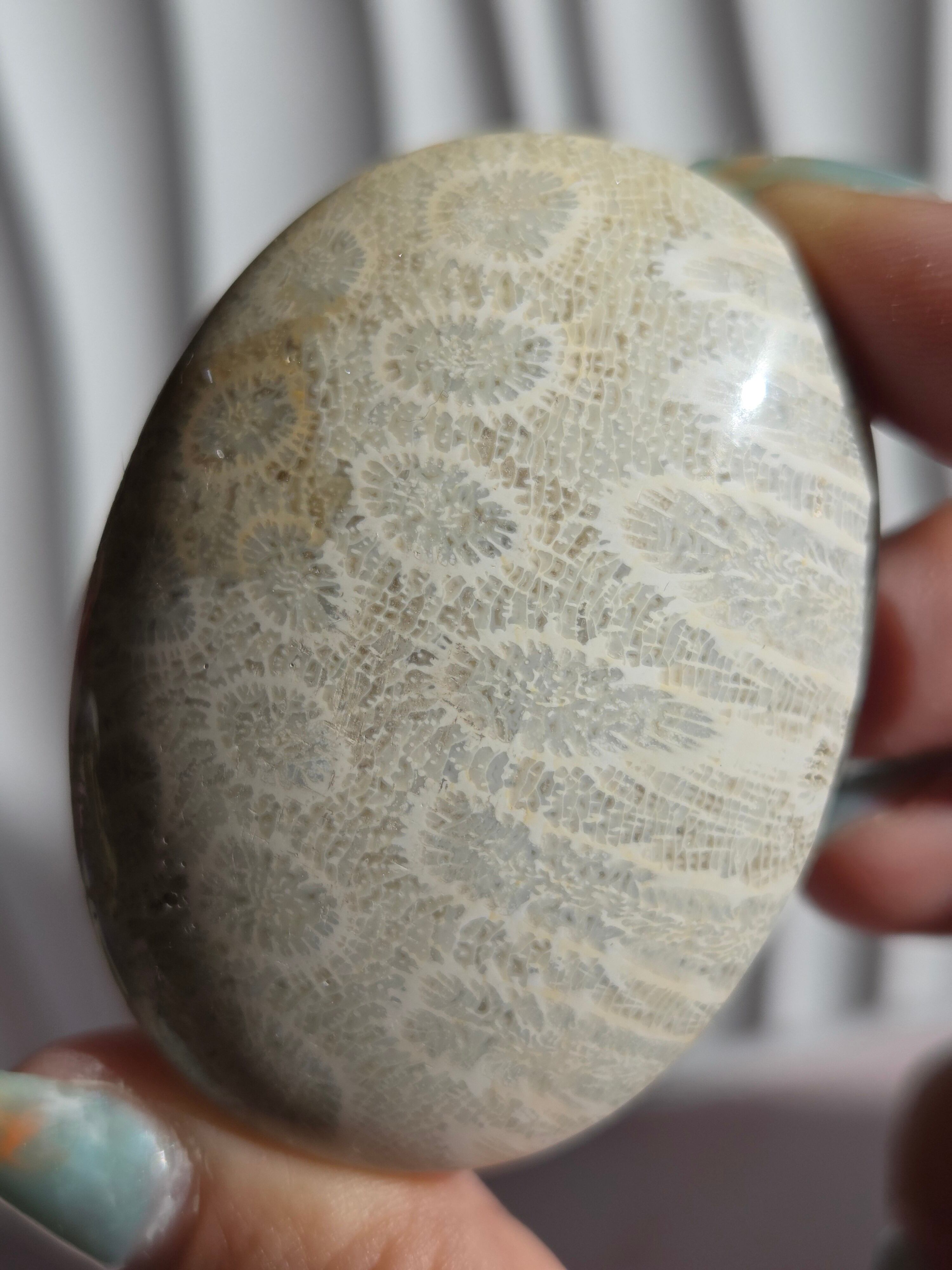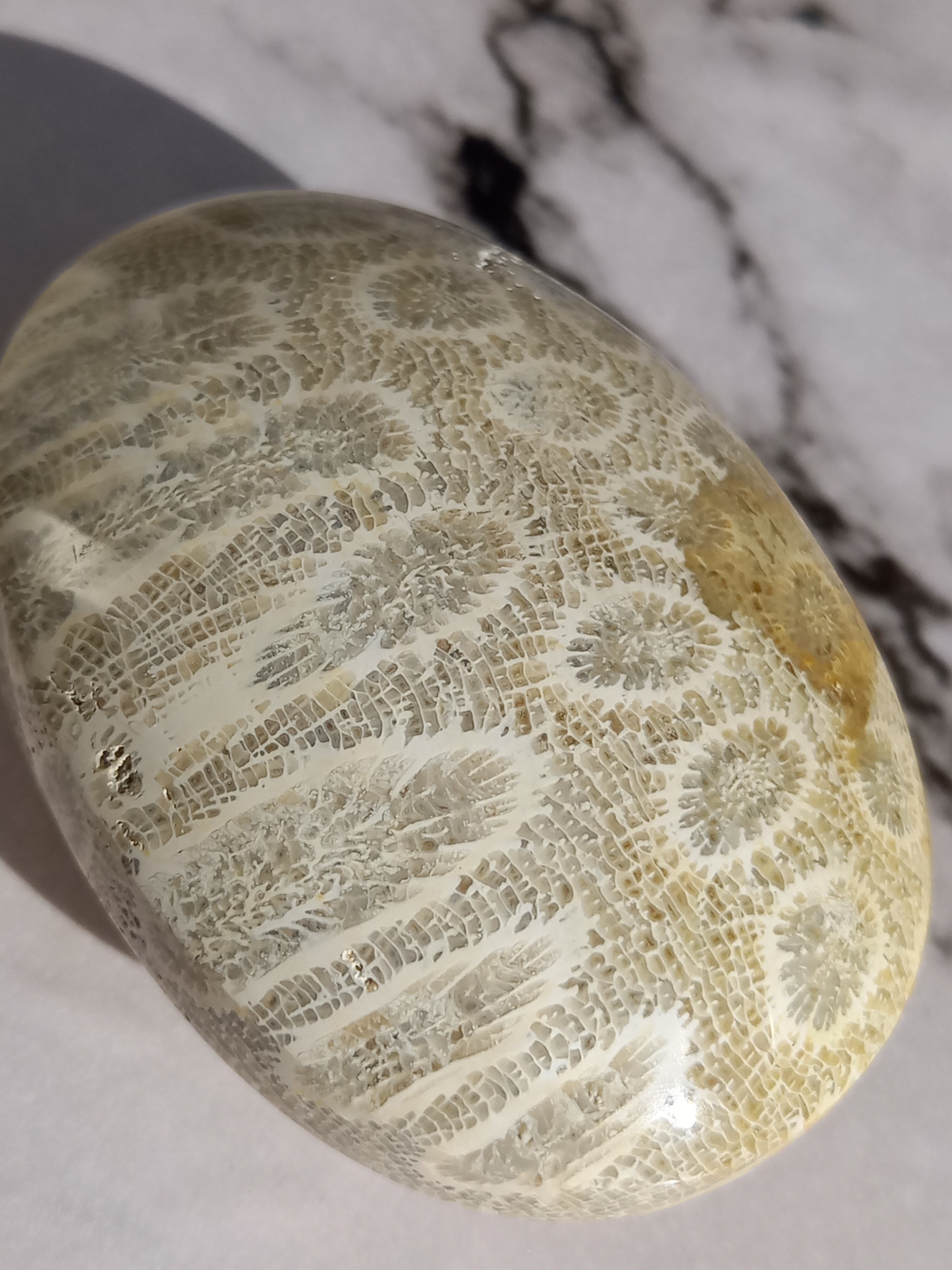 フォシルコーラル(化石珊瑚)は長い時間をかけてクォーツが浸透し、化石となった珊瑚です。 菊の花のような特徴的な模様は、化石化したサンゴの断面に現れるもので、ペトリファイドコーラル・菊目石などとも呼ばれています。 コーラル(珊瑚)は様々な災いや邪気を払う、お守りとして優れた効果を発揮するといわれています。
