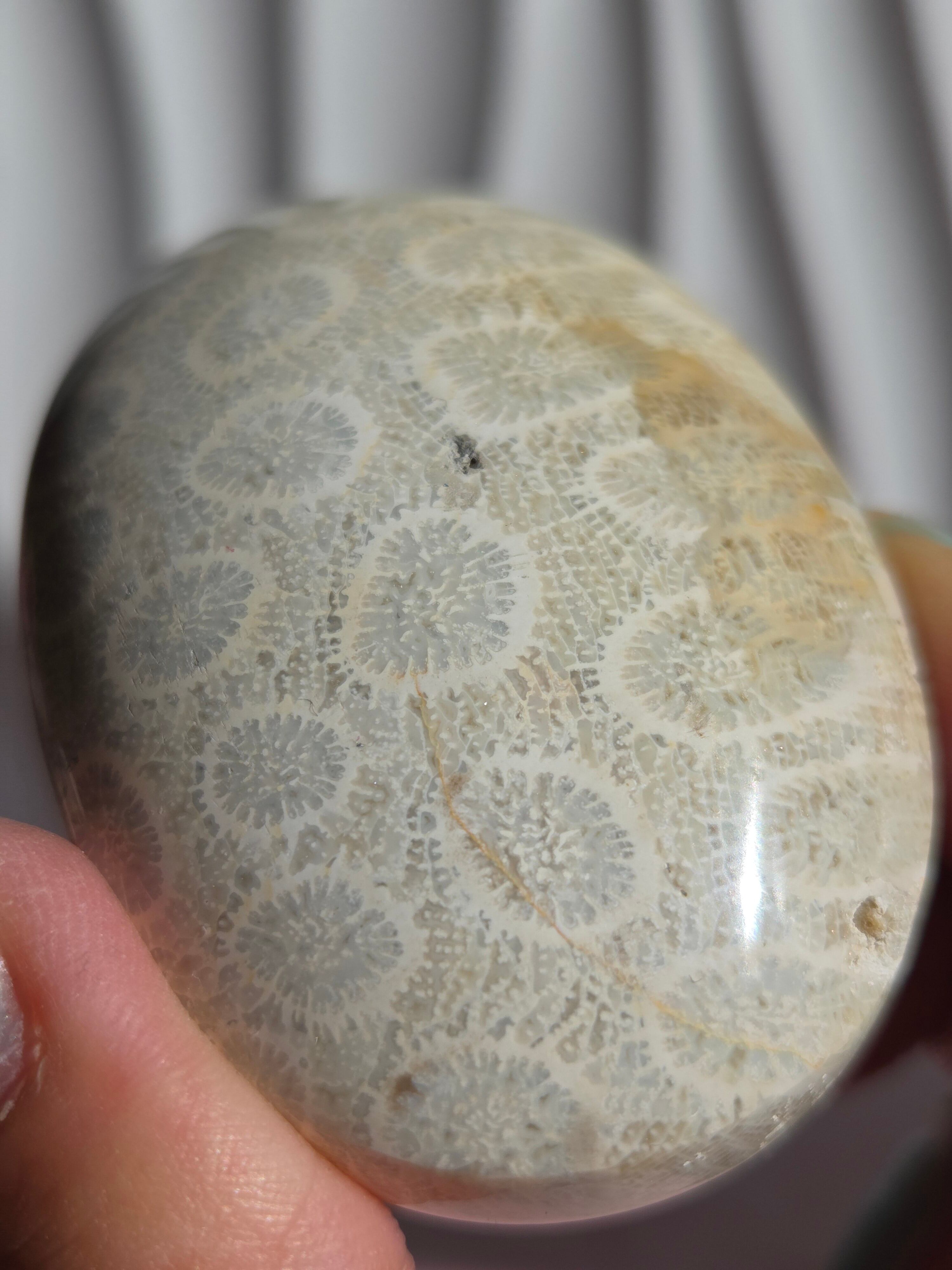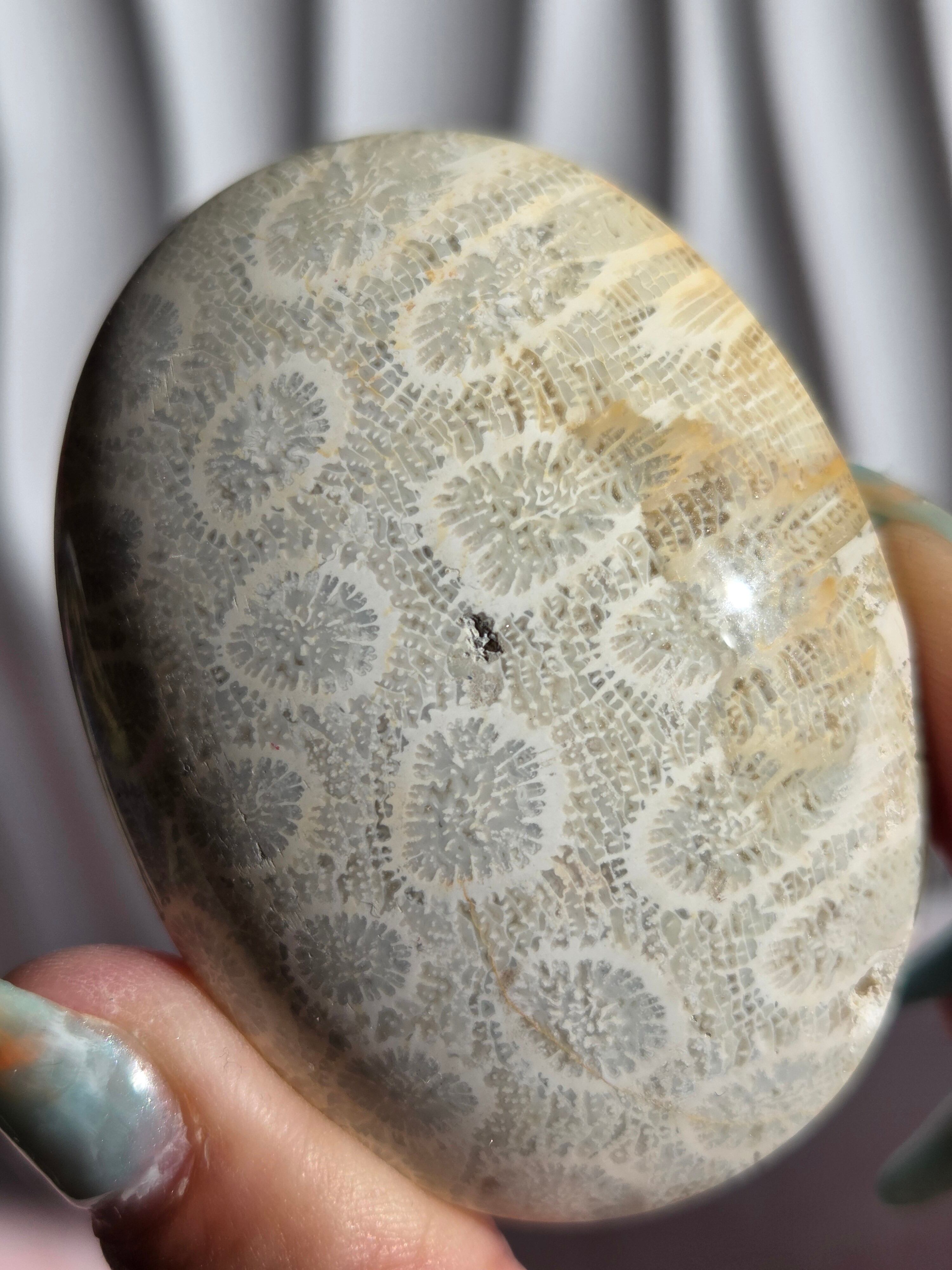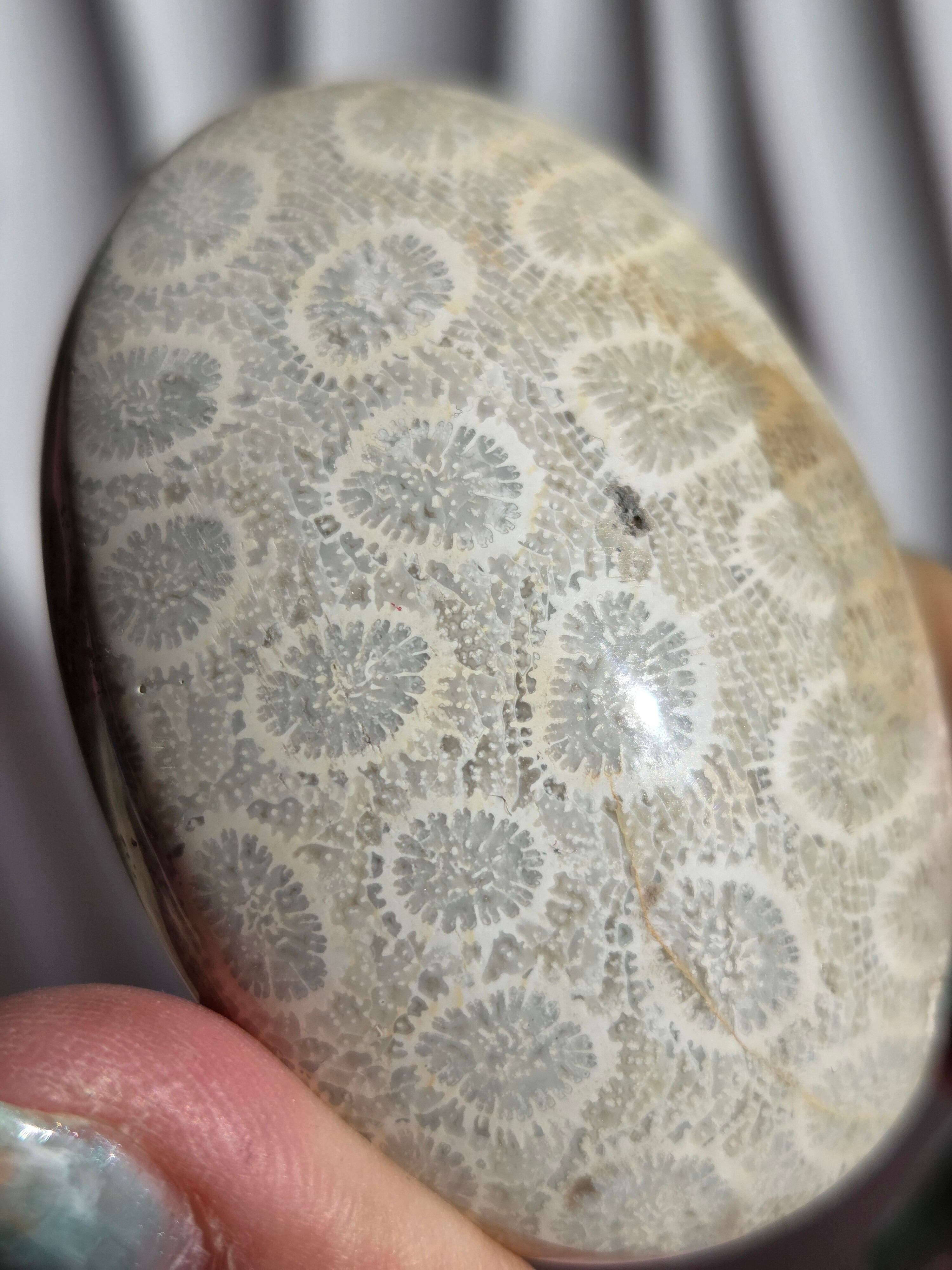 フォシルコーラル(化石珊瑚)は長い時間をかけてクォーツが浸透し、化石となった珊瑚です。 菊の花のような特徴的な模様は、化石化したサンゴの断面に現れるもので、ペトリファイドコーラル・菊目石などとも呼ばれています。 コーラル(珊瑚)は様々な災いや邪気を払う、お守りとして優れた効果を発揮するといわれています。