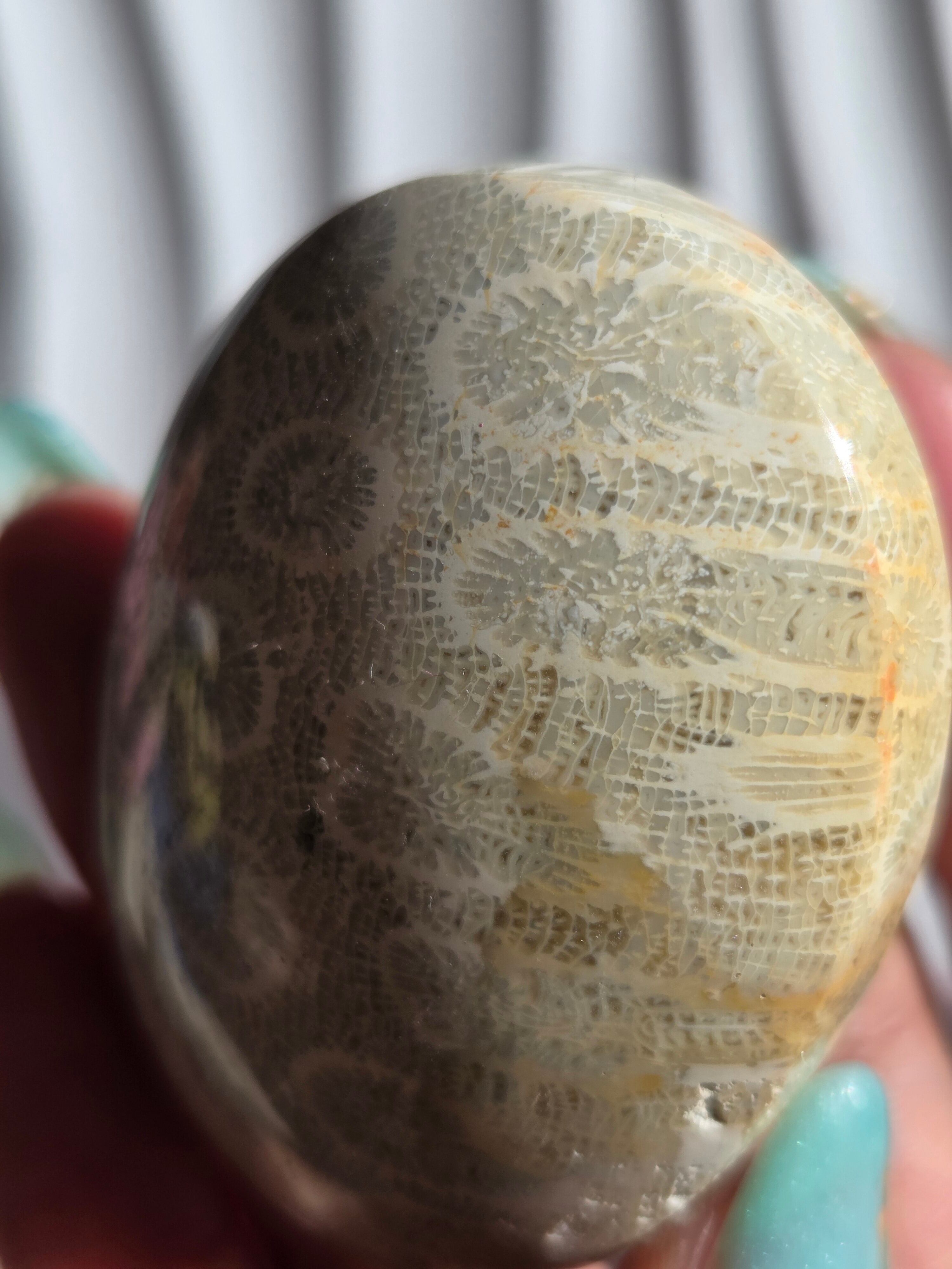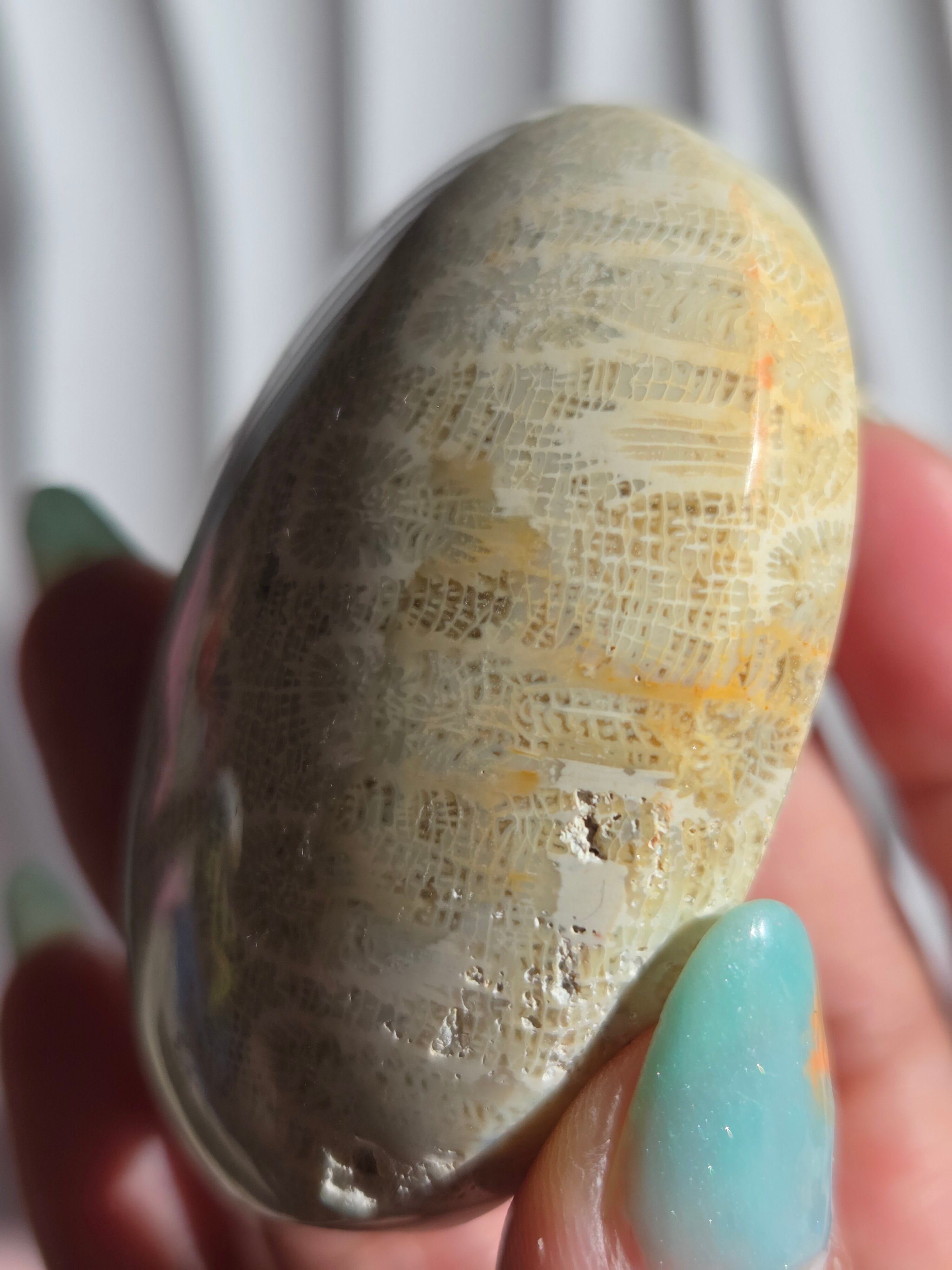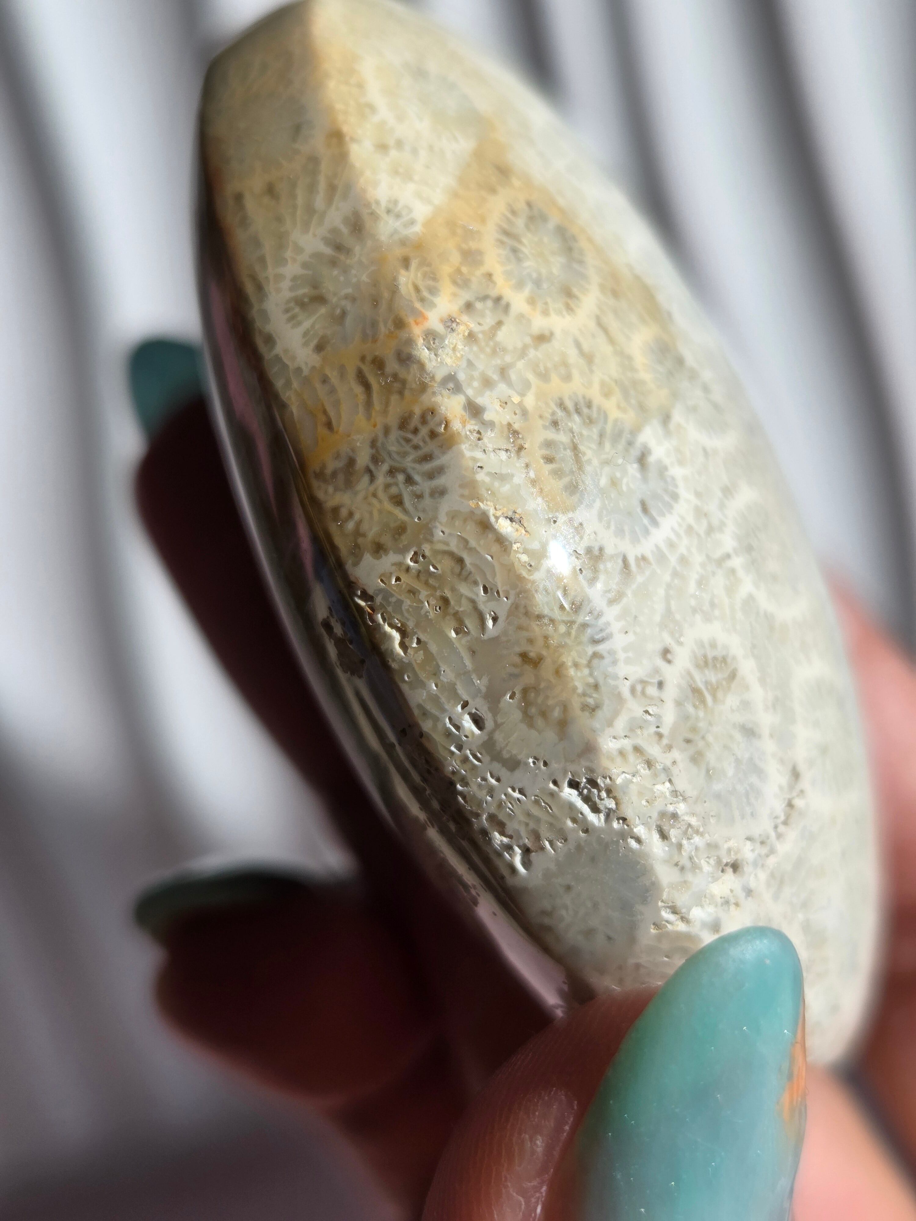 生命の源とされる海からのパワーをもっているといわれるフォッシルコーラル。優しく大きく包んでくれるような印象です。