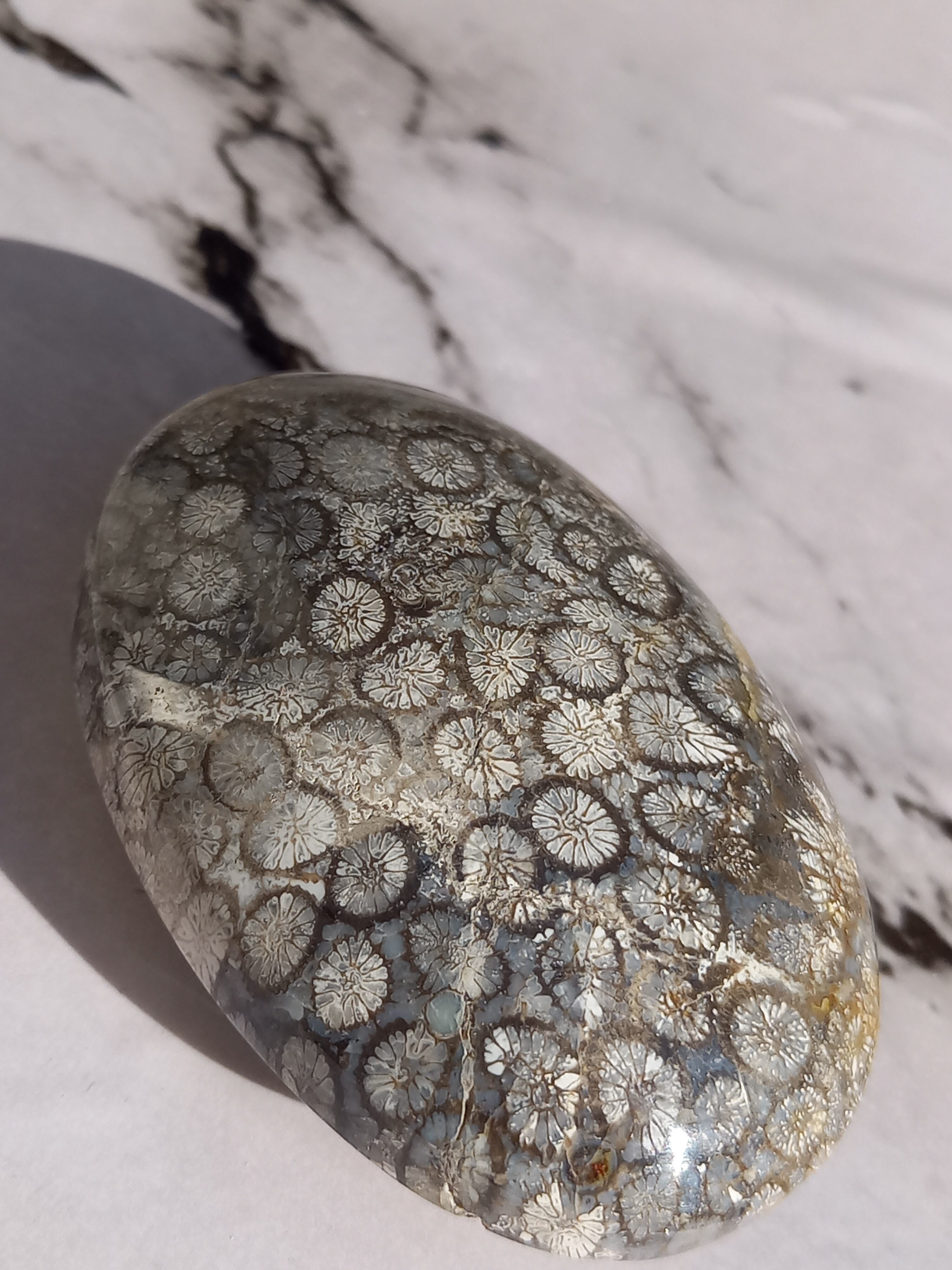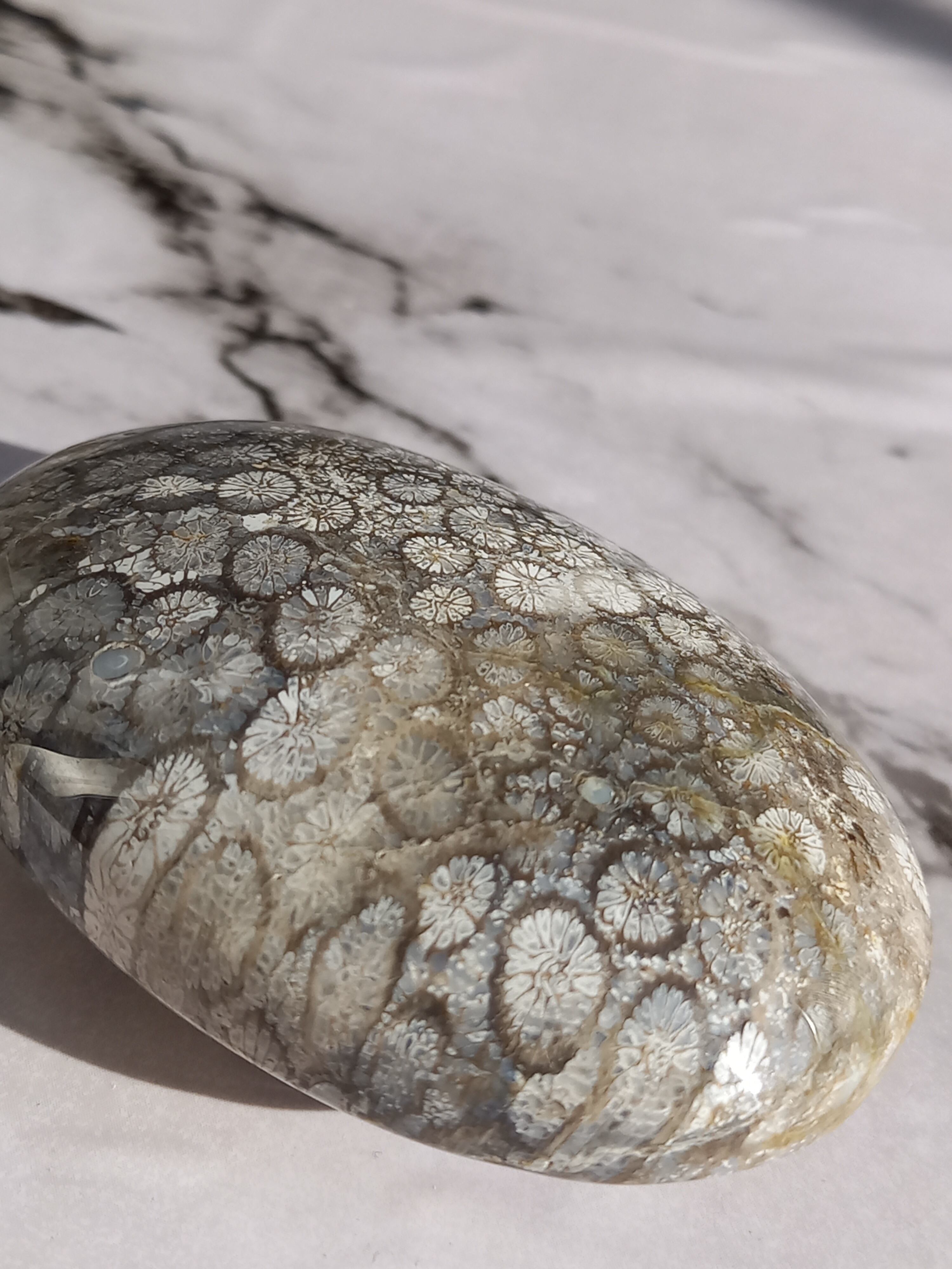 フォシルコーラル(化石珊瑚)は長い時間をかけてクォーツが浸透し、化石となった珊瑚です。 菊の花のような特徴的な模様は、化石化したサンゴの断面に現れるもので、ペトリファイドコーラル・菊目石などとも呼ばれています。 コーラル(珊瑚)は様々な災いや邪気を払う、お守りとして優れた効果を発揮するといわれています。