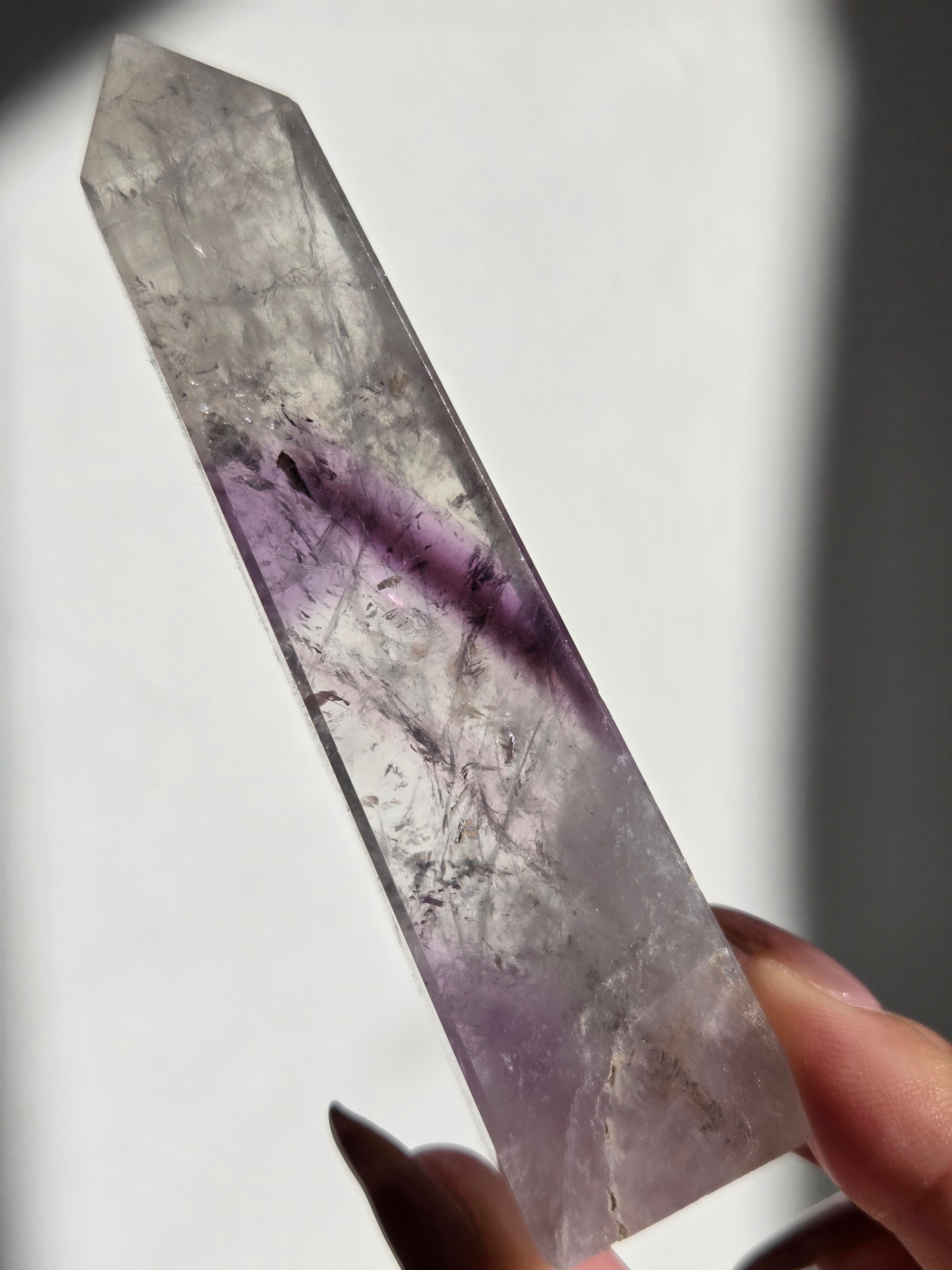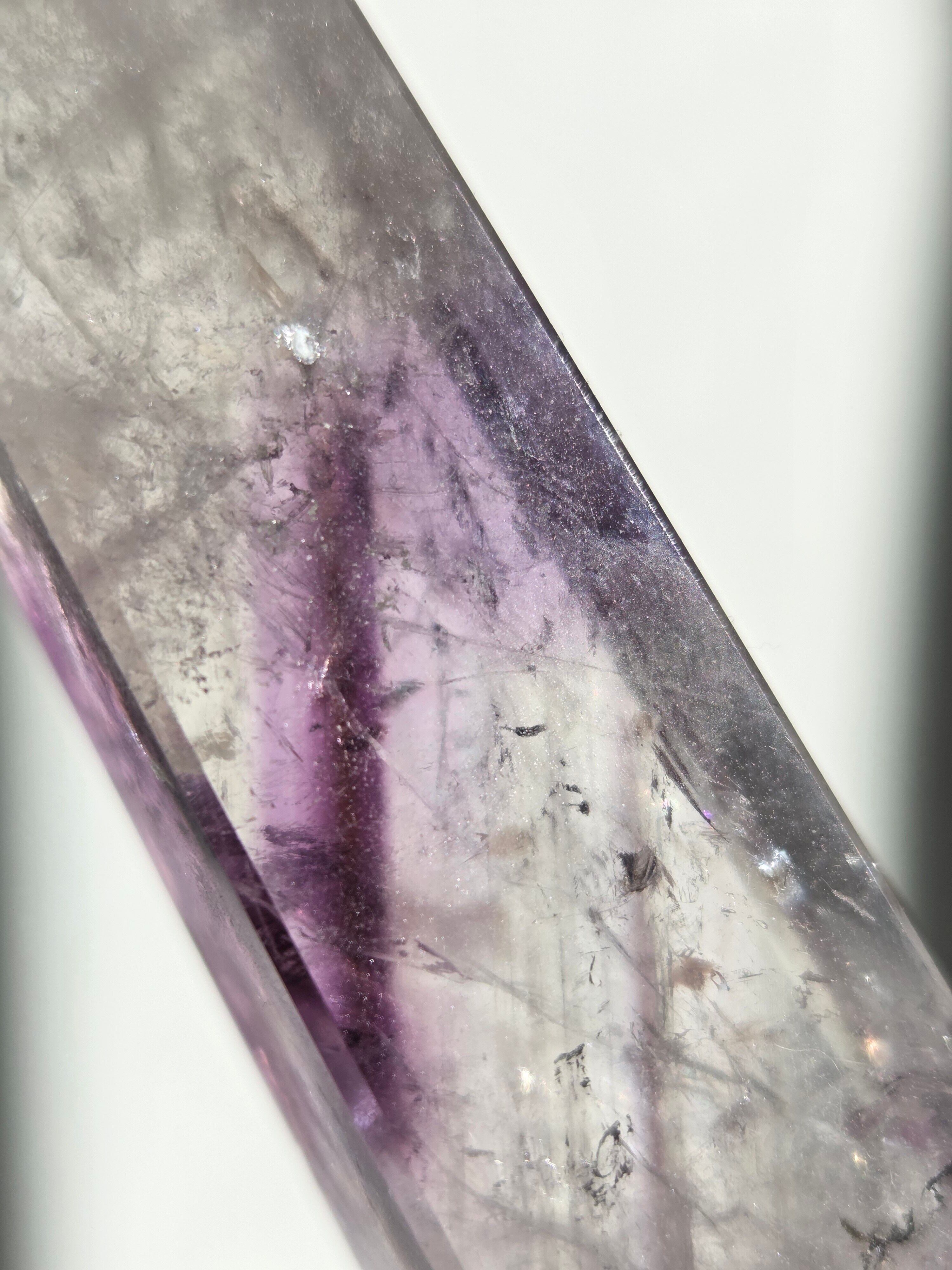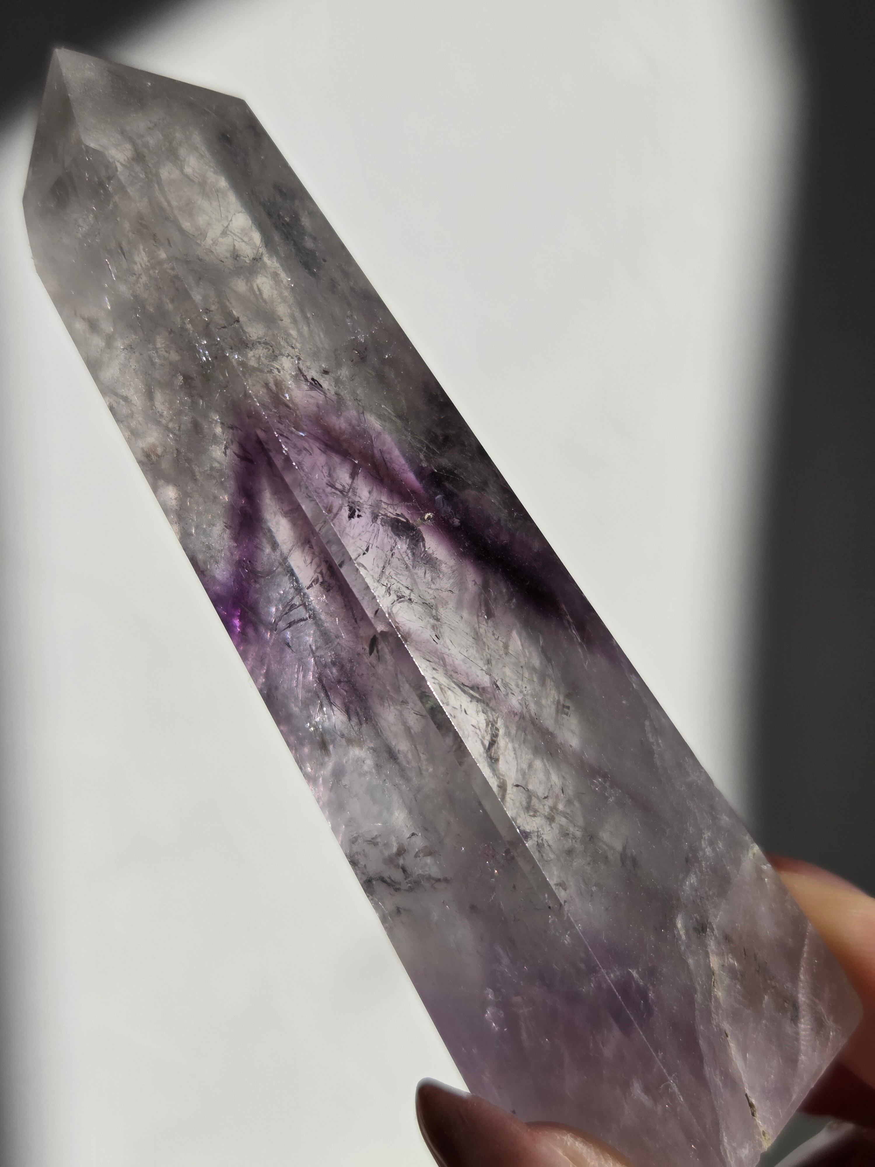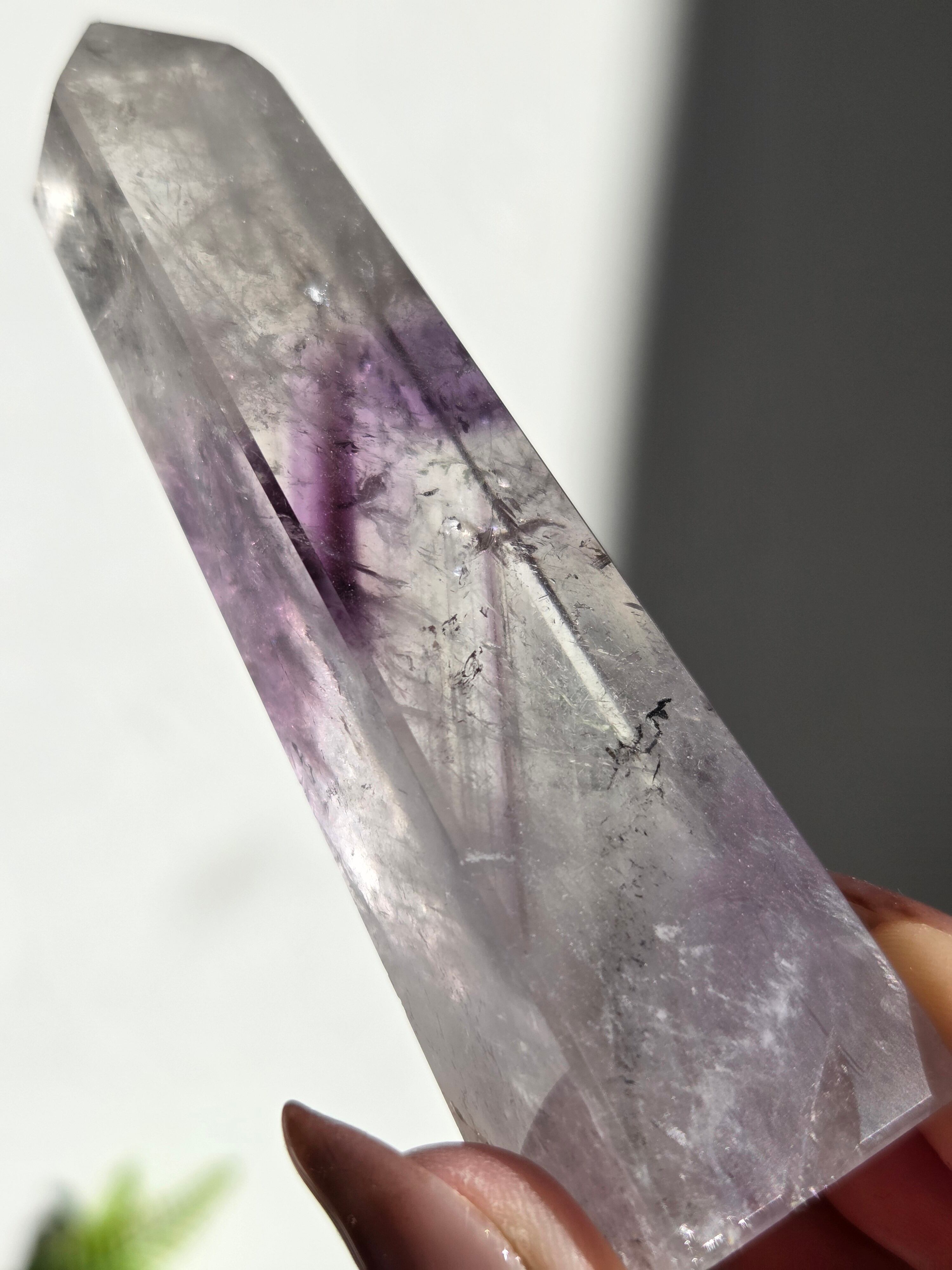 ファントム状に入ったアメジストのパープルラインと、透明感のあるクォーツが、キラキラ可愛いポイントタワーです。