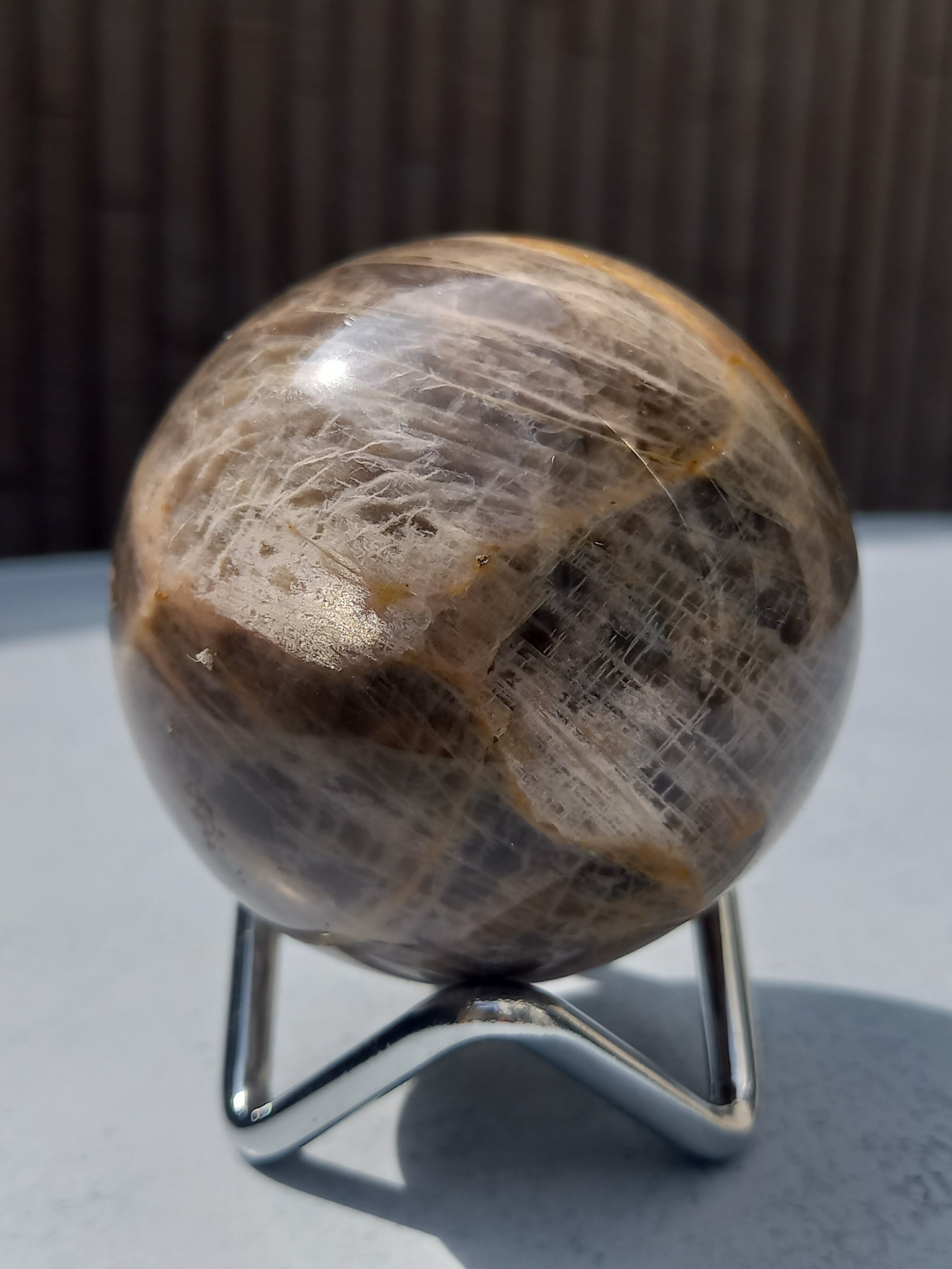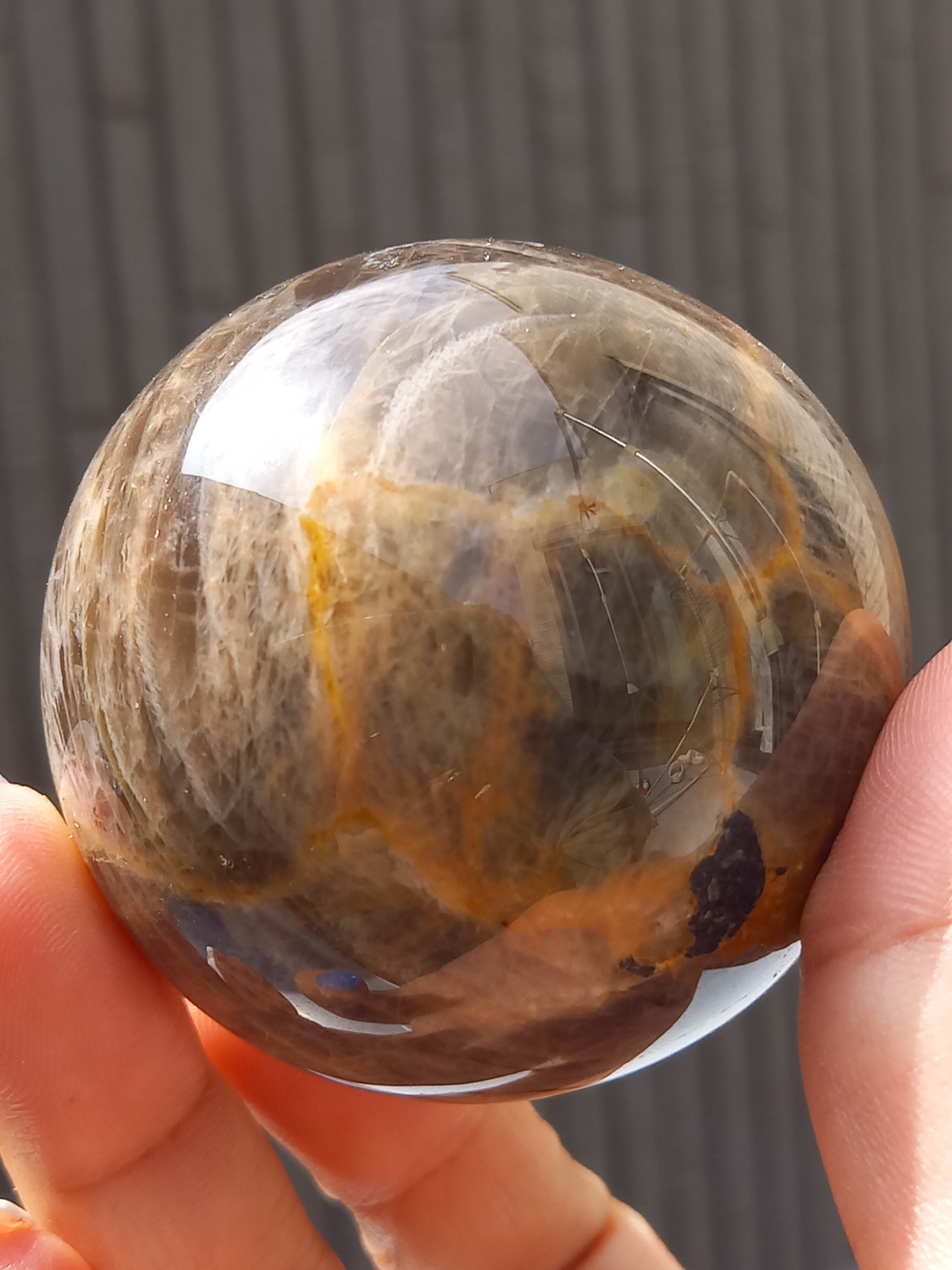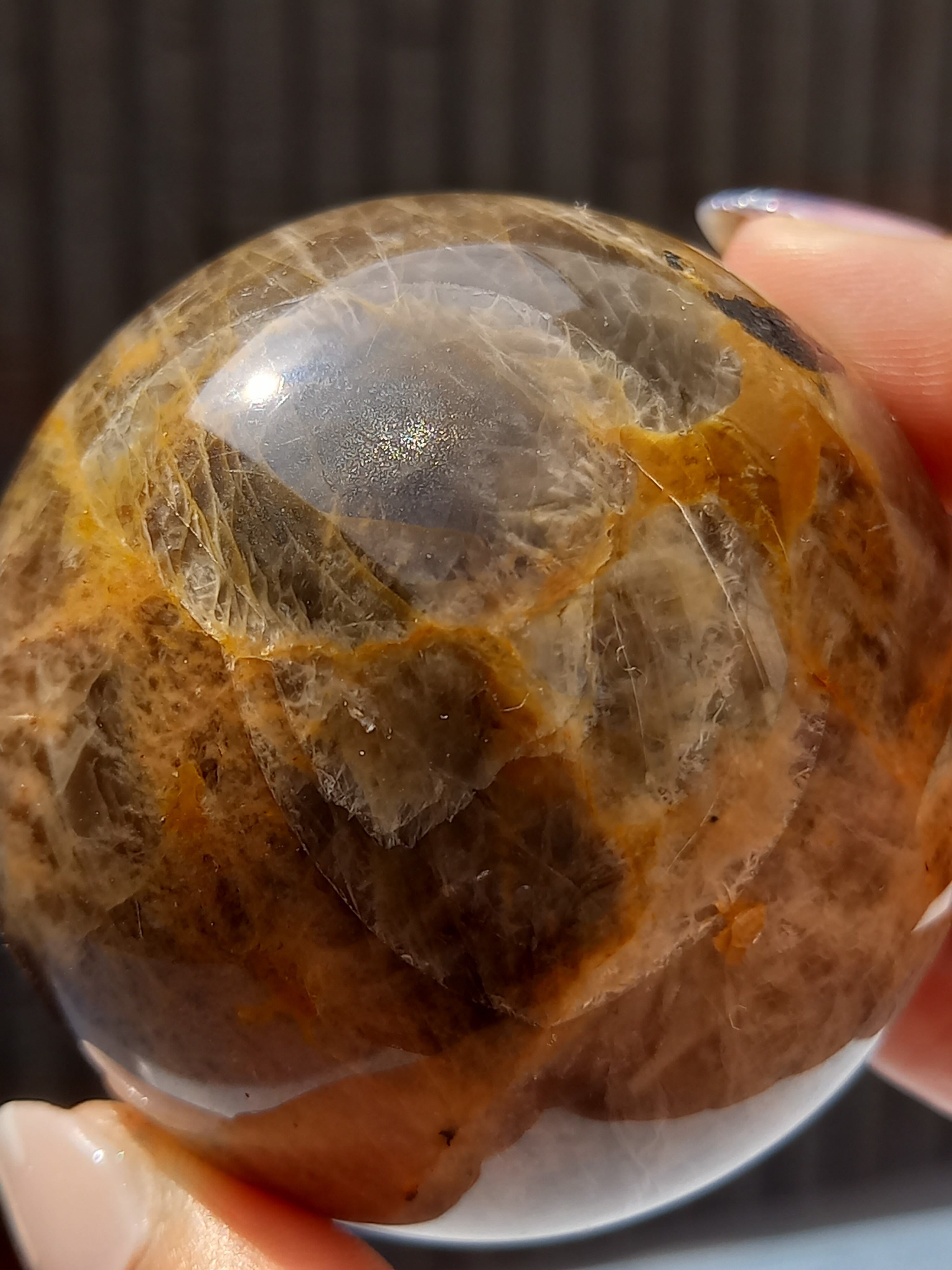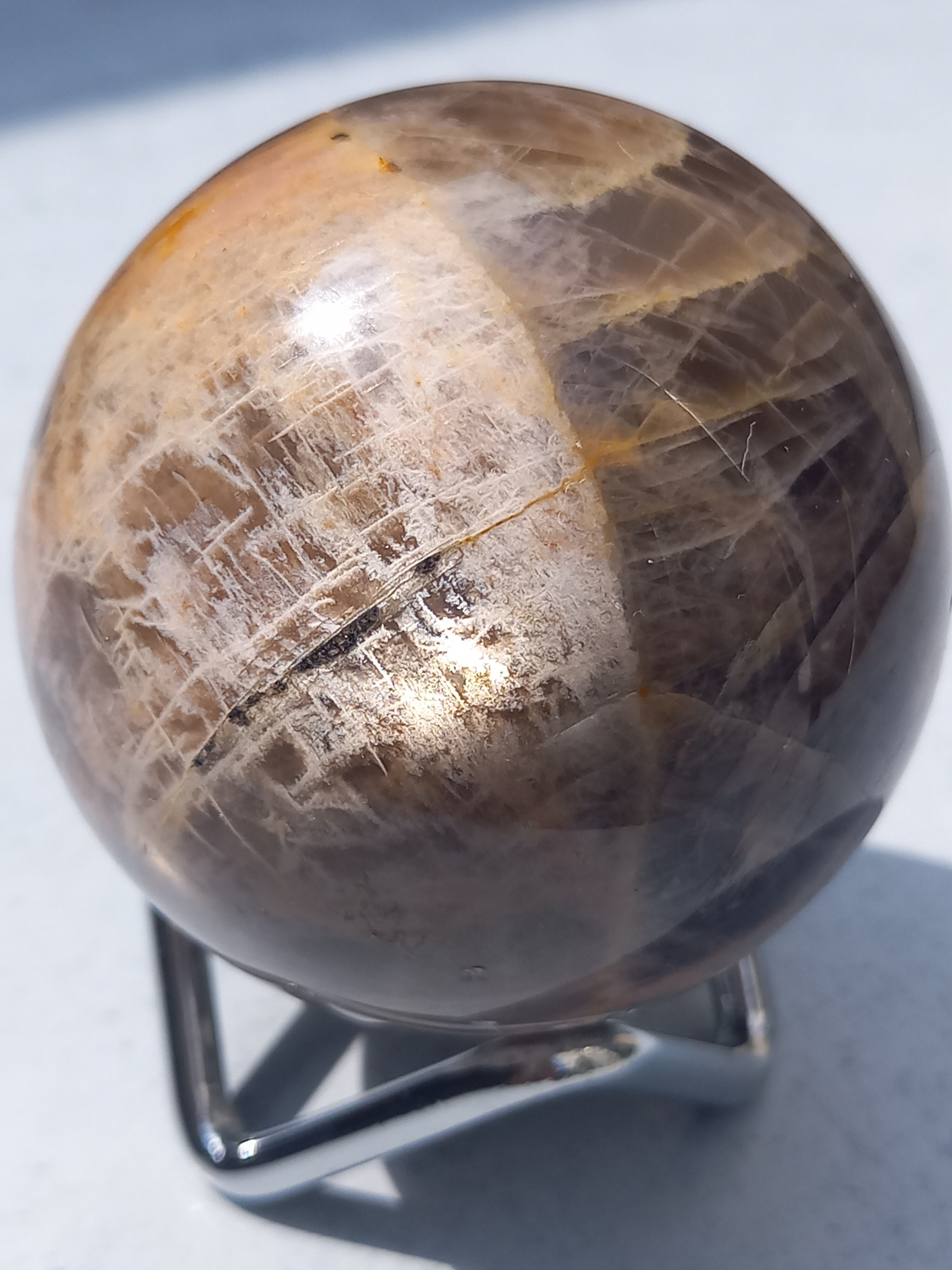 ブラックムーンストーンのシルバーフラッシュやシラーと、サンストーンのギラギラのシラーが魅惑的なスフィアです。