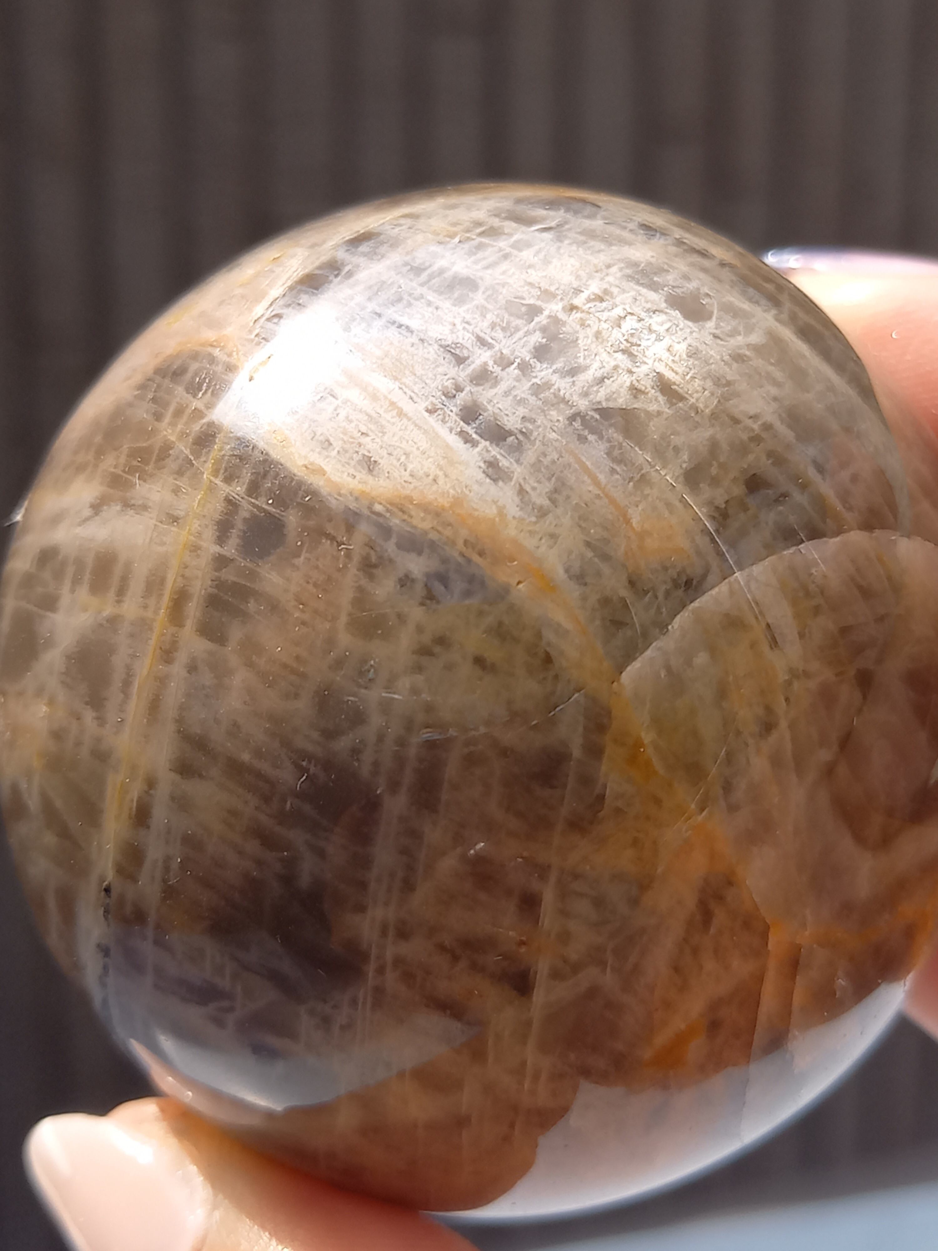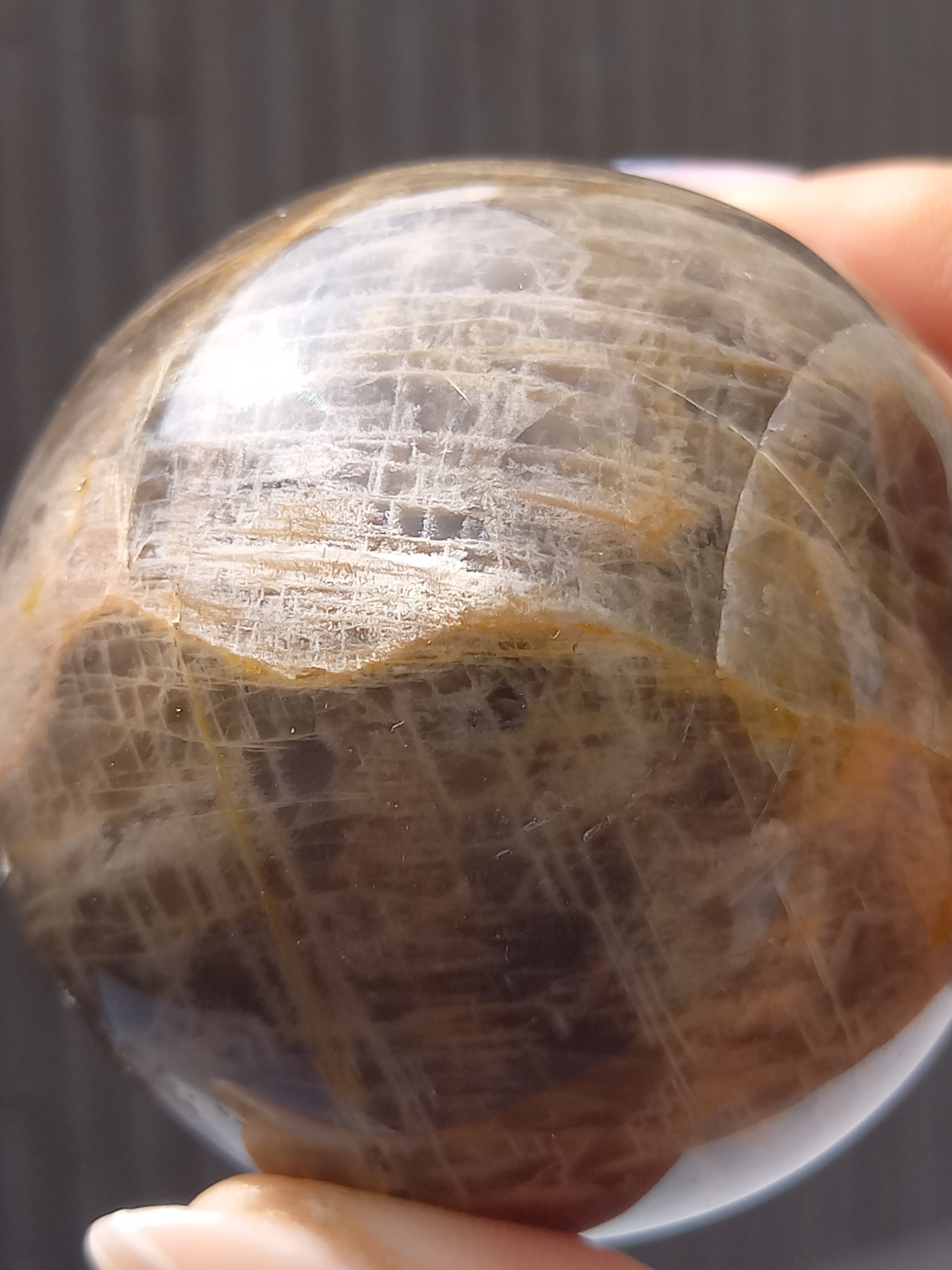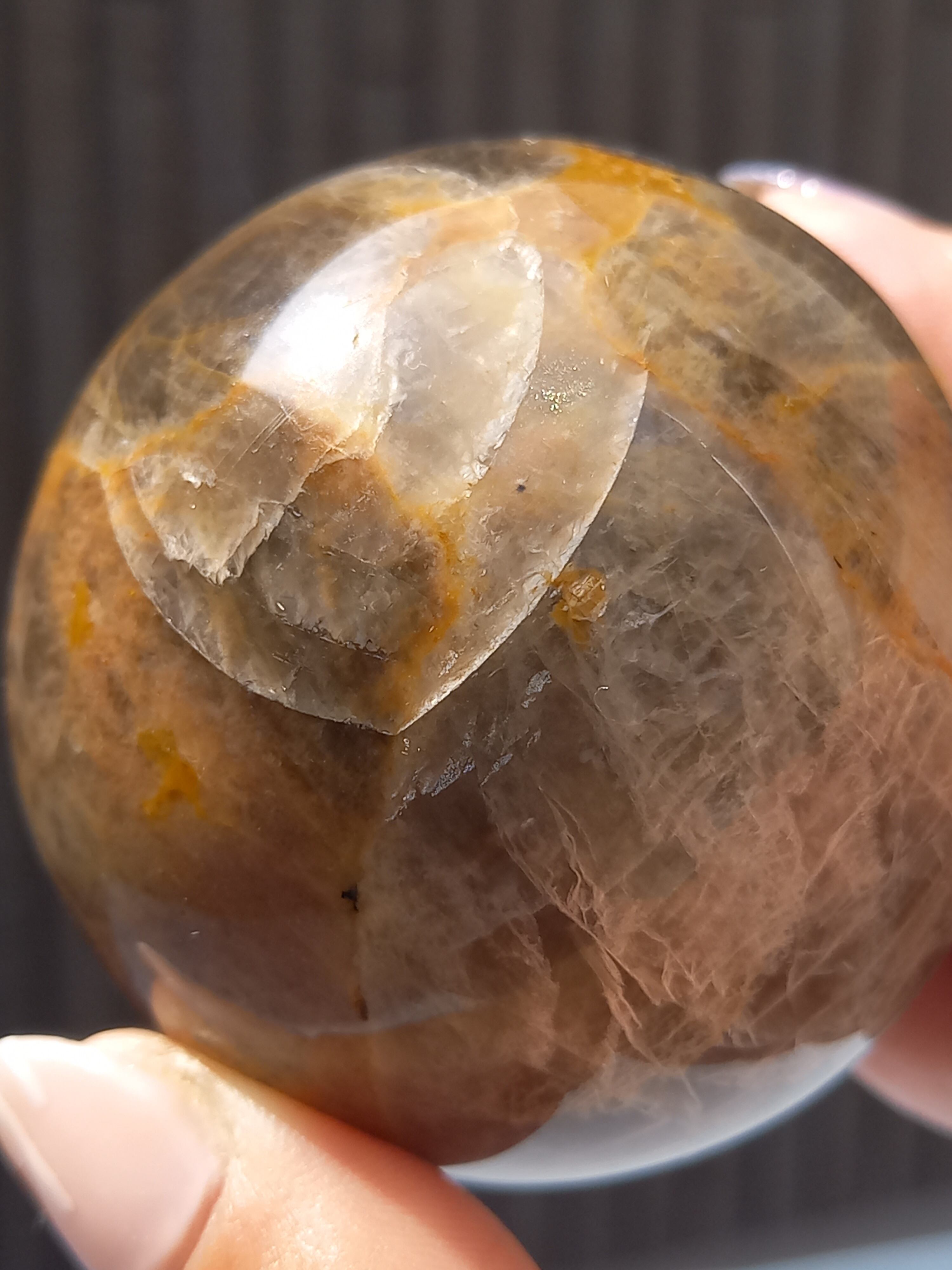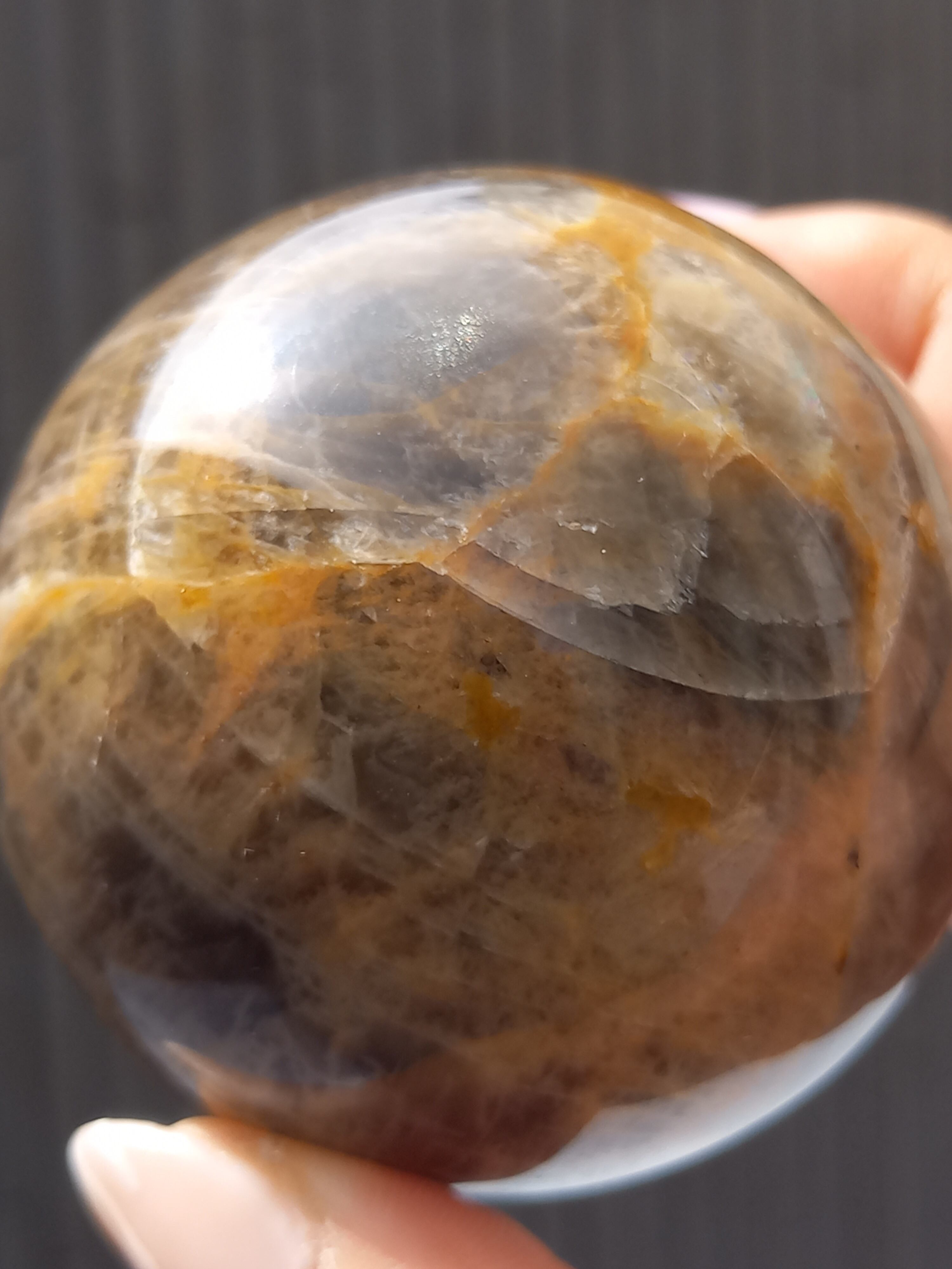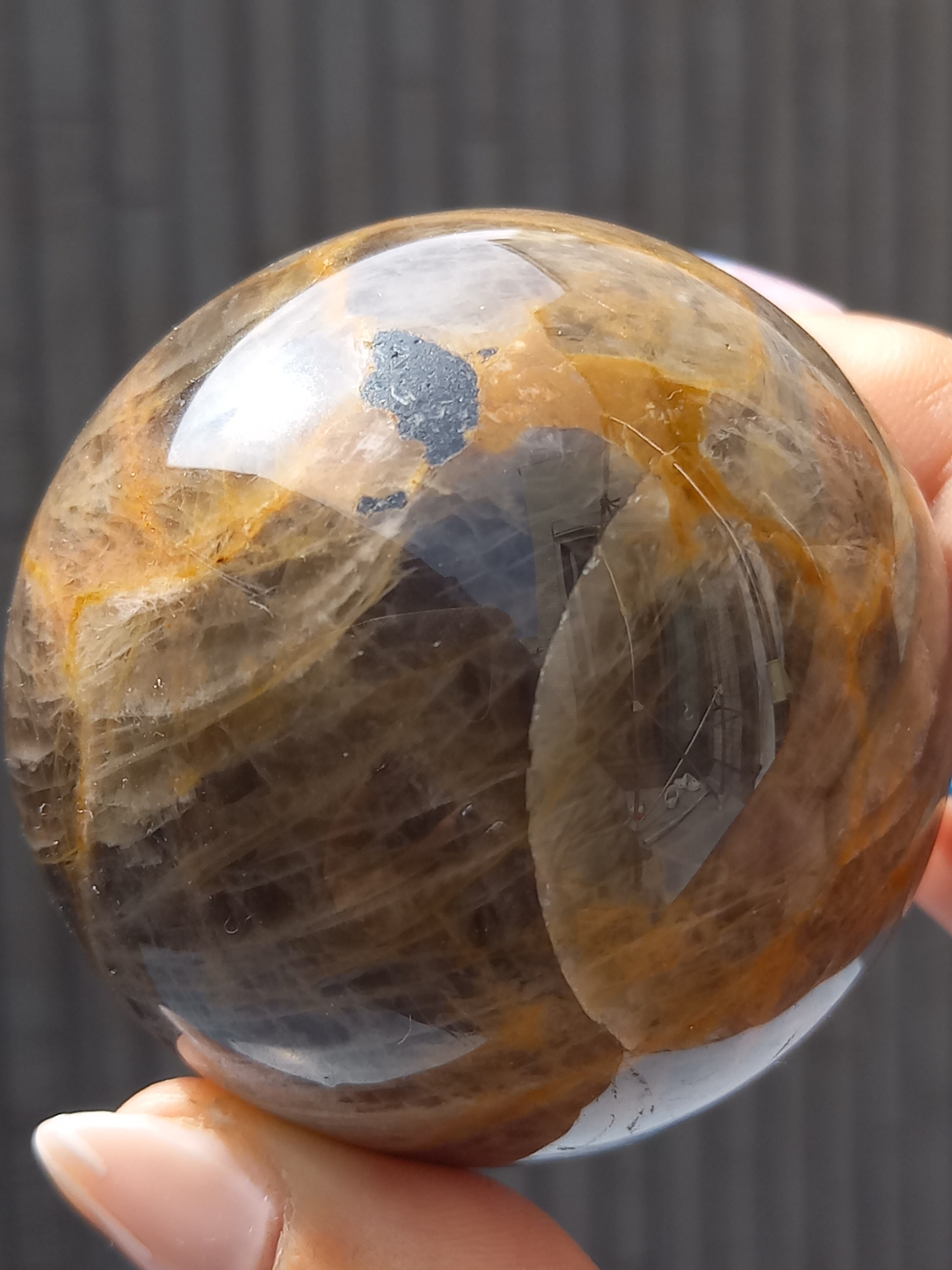 ブラックムーンストーンのシルバーフラッシュやシラーと、サンストーンのギラギラのシラーが魅惑的なスフィアです。