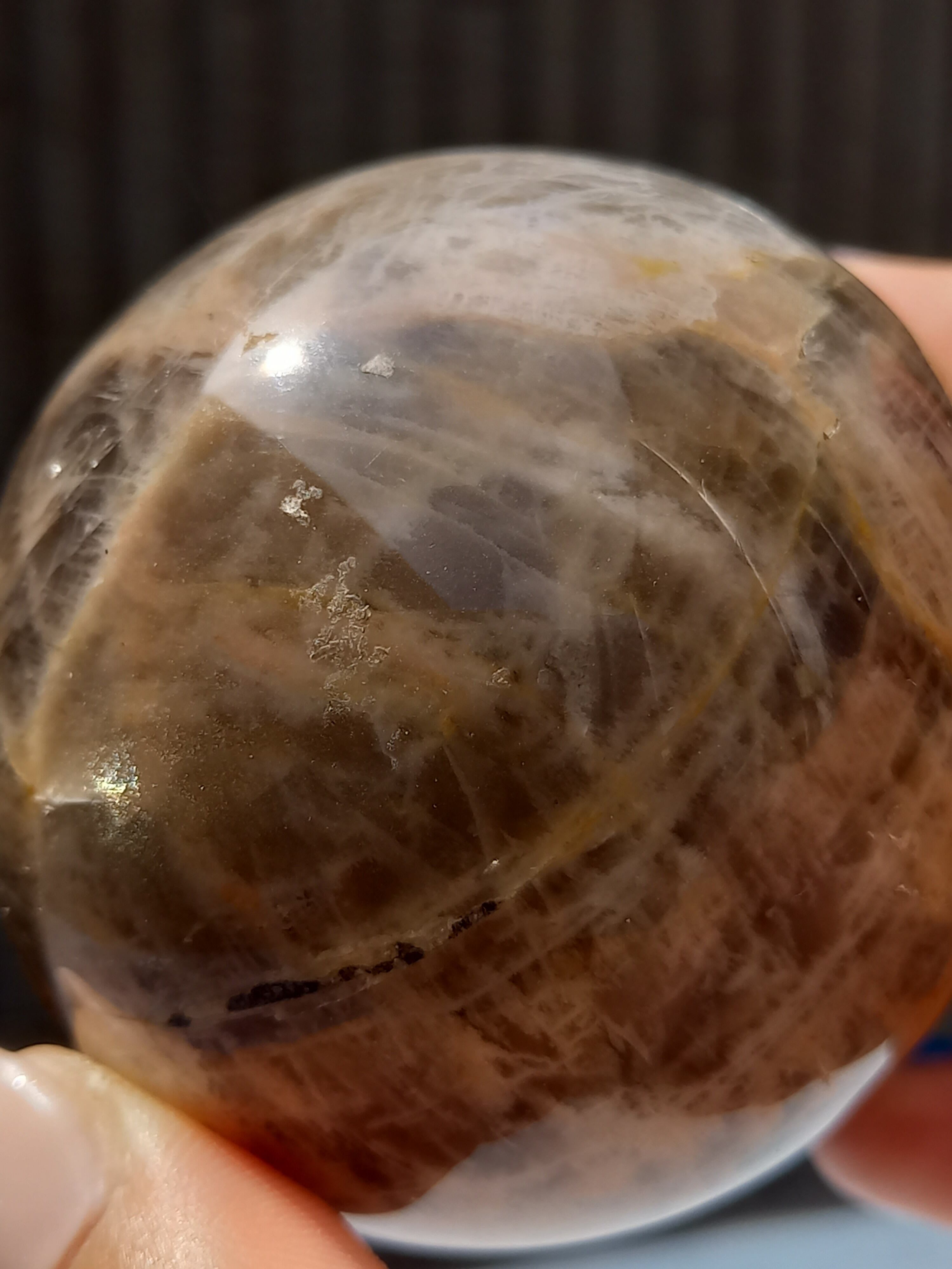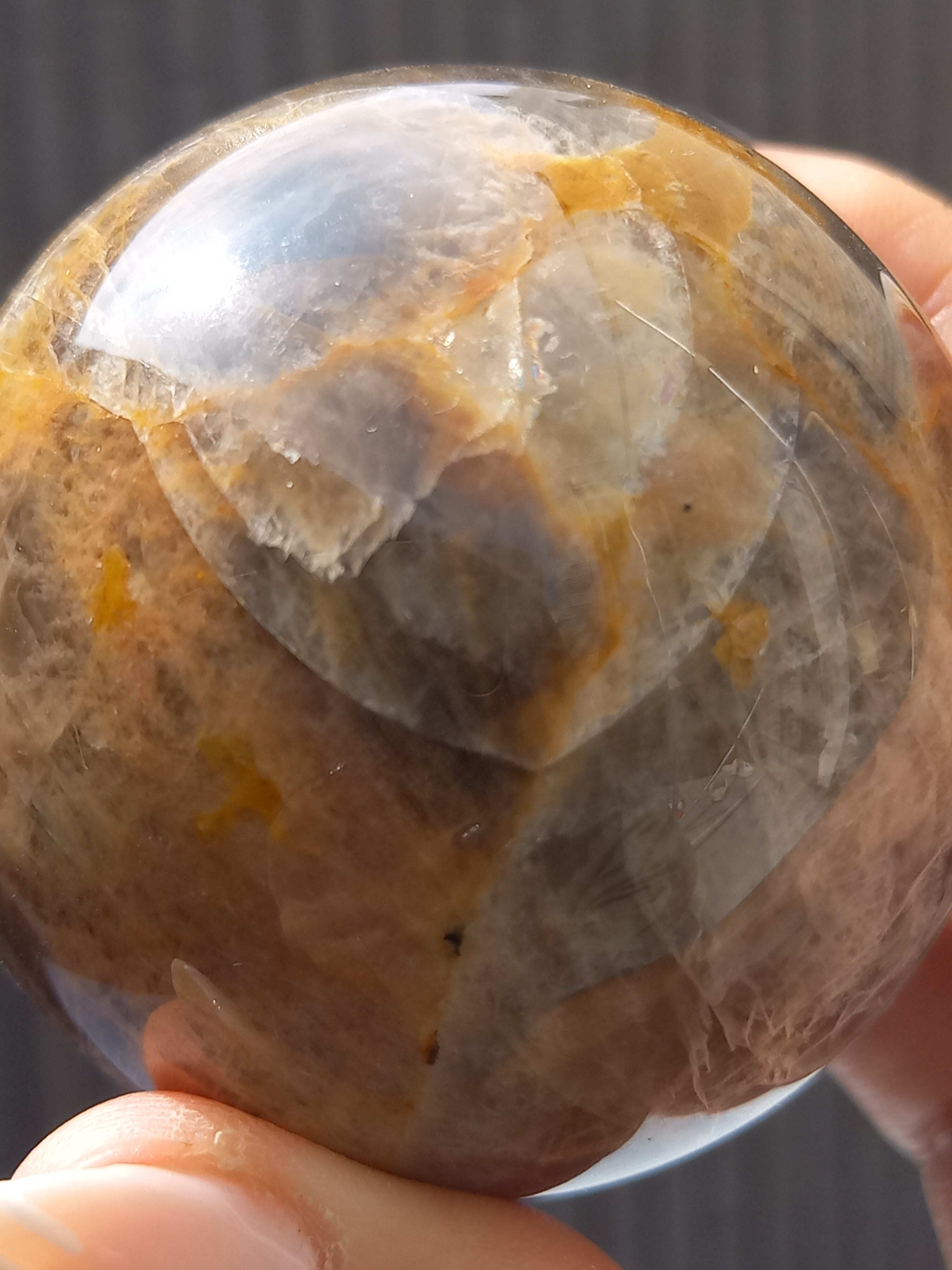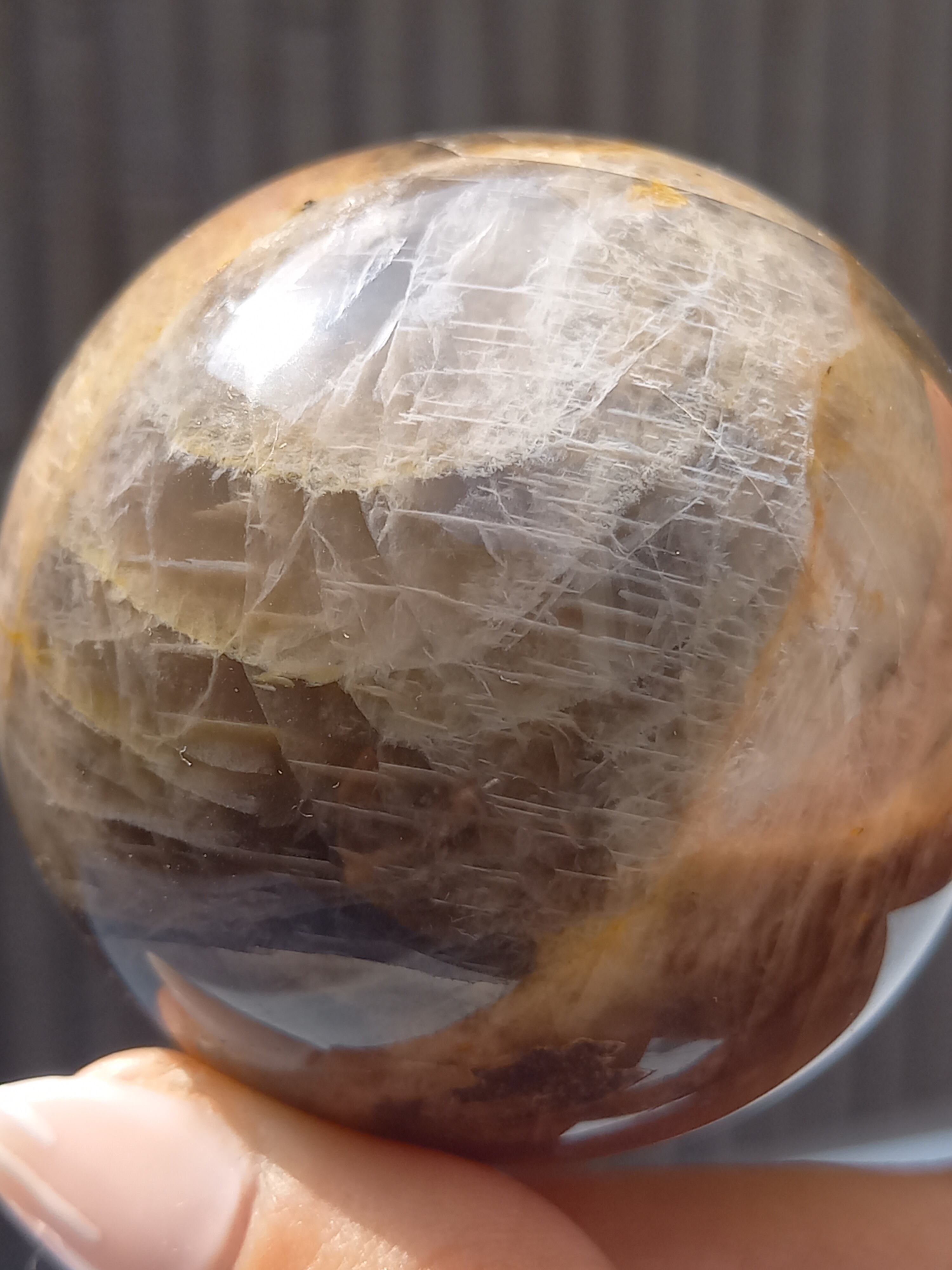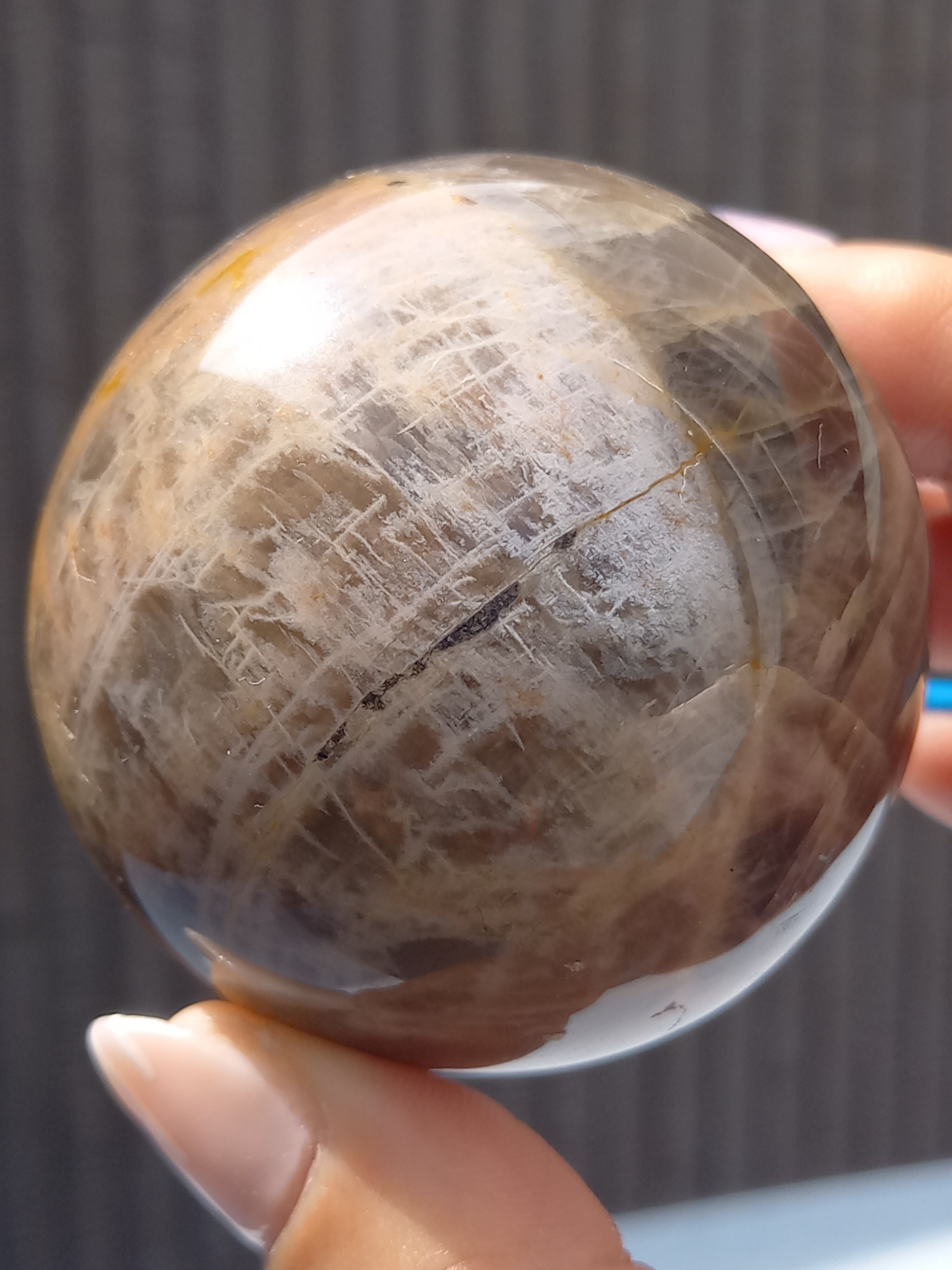 ブラックムーンストーンのシルバーフラッシュやシラーと、サンストーンのギラギラのシラーが魅惑的なスフィアです。