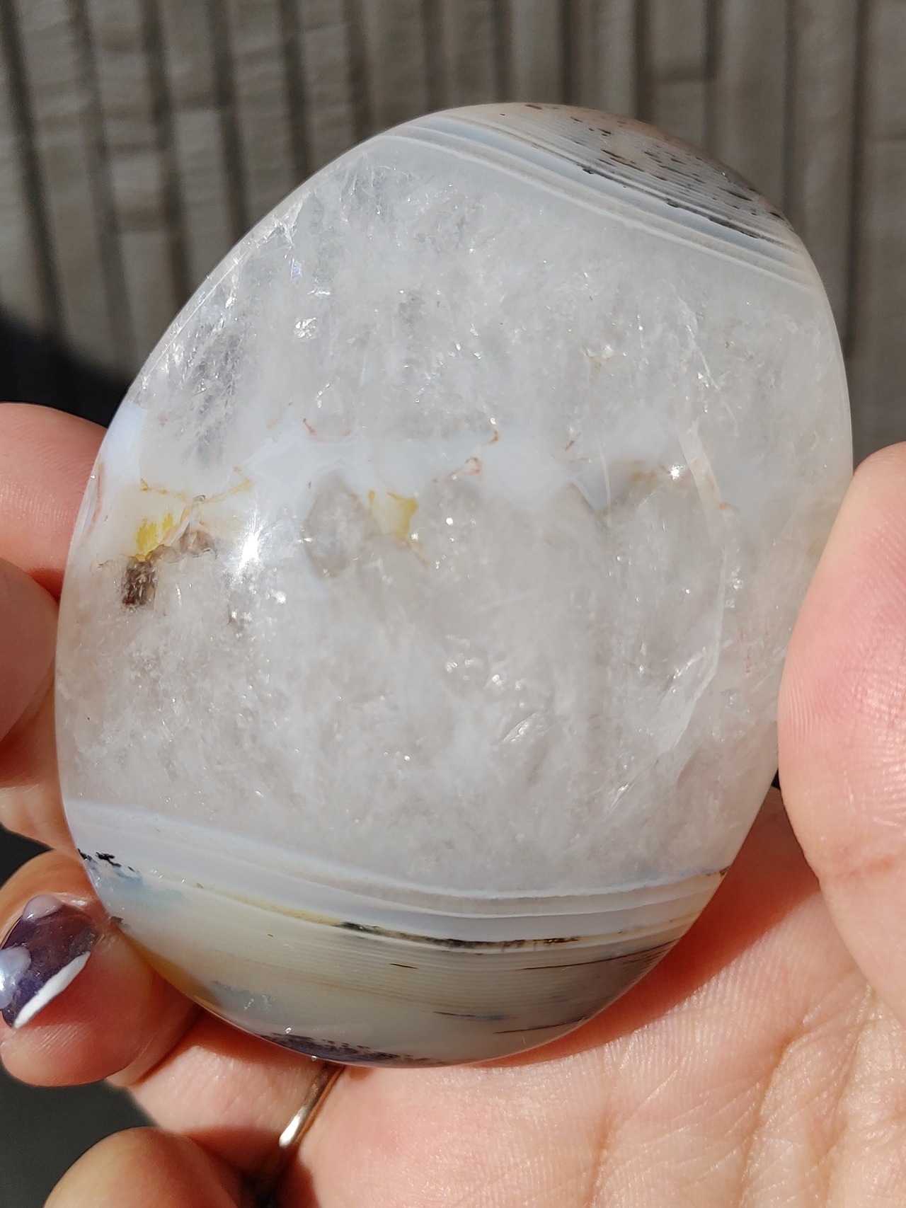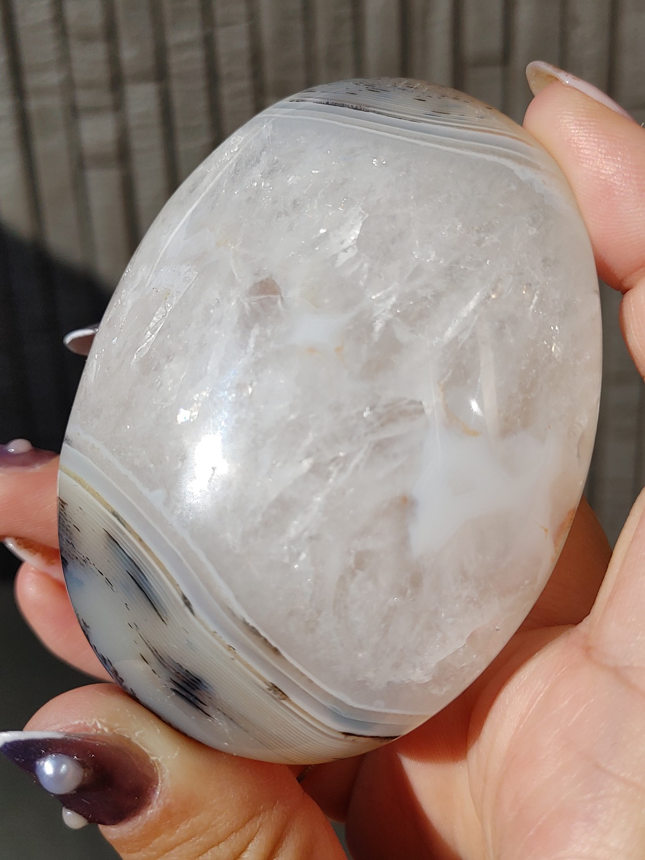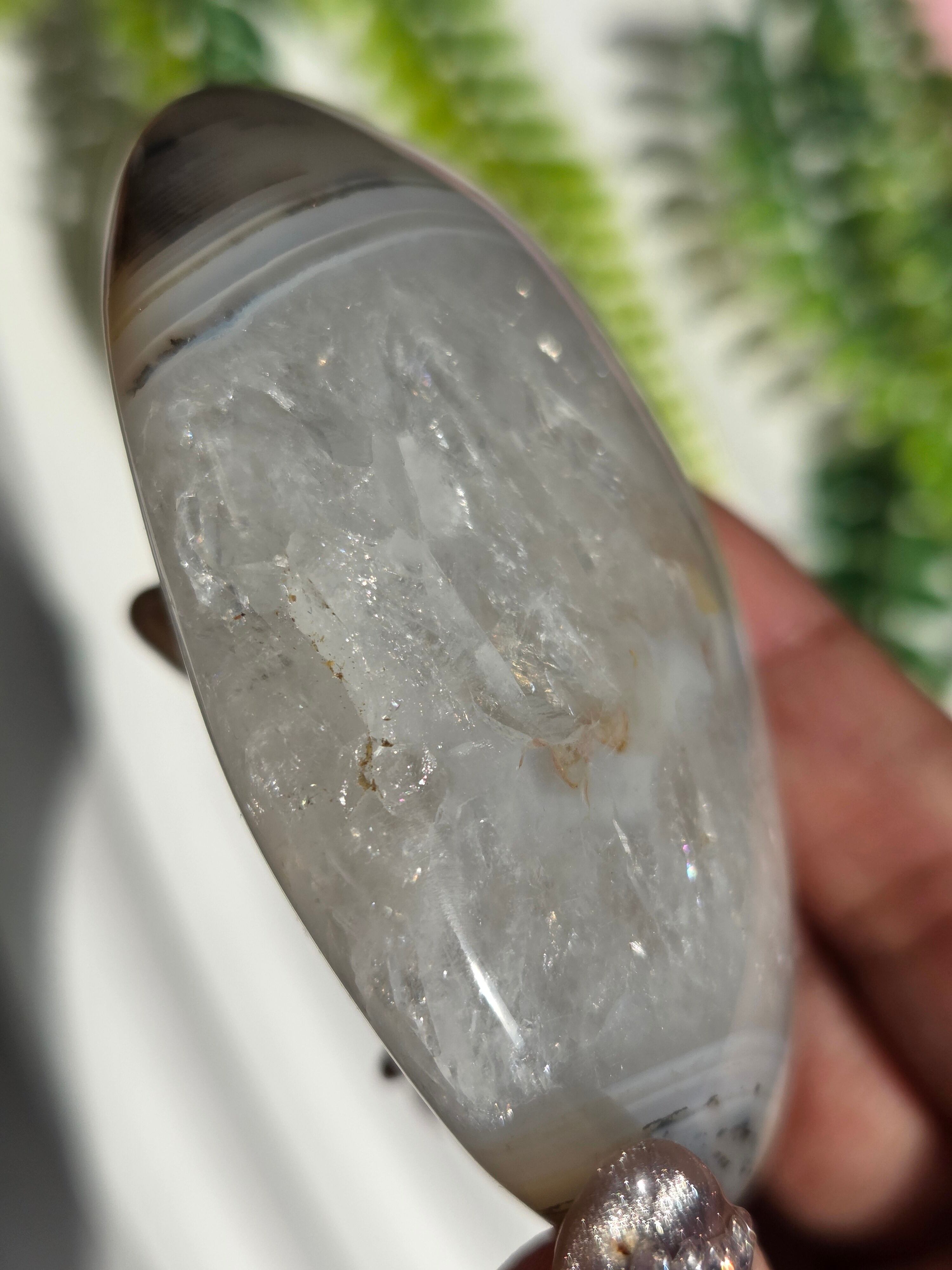 キラキラのクォーツに、サイドのアゲート模様が素敵な大きめパームです。