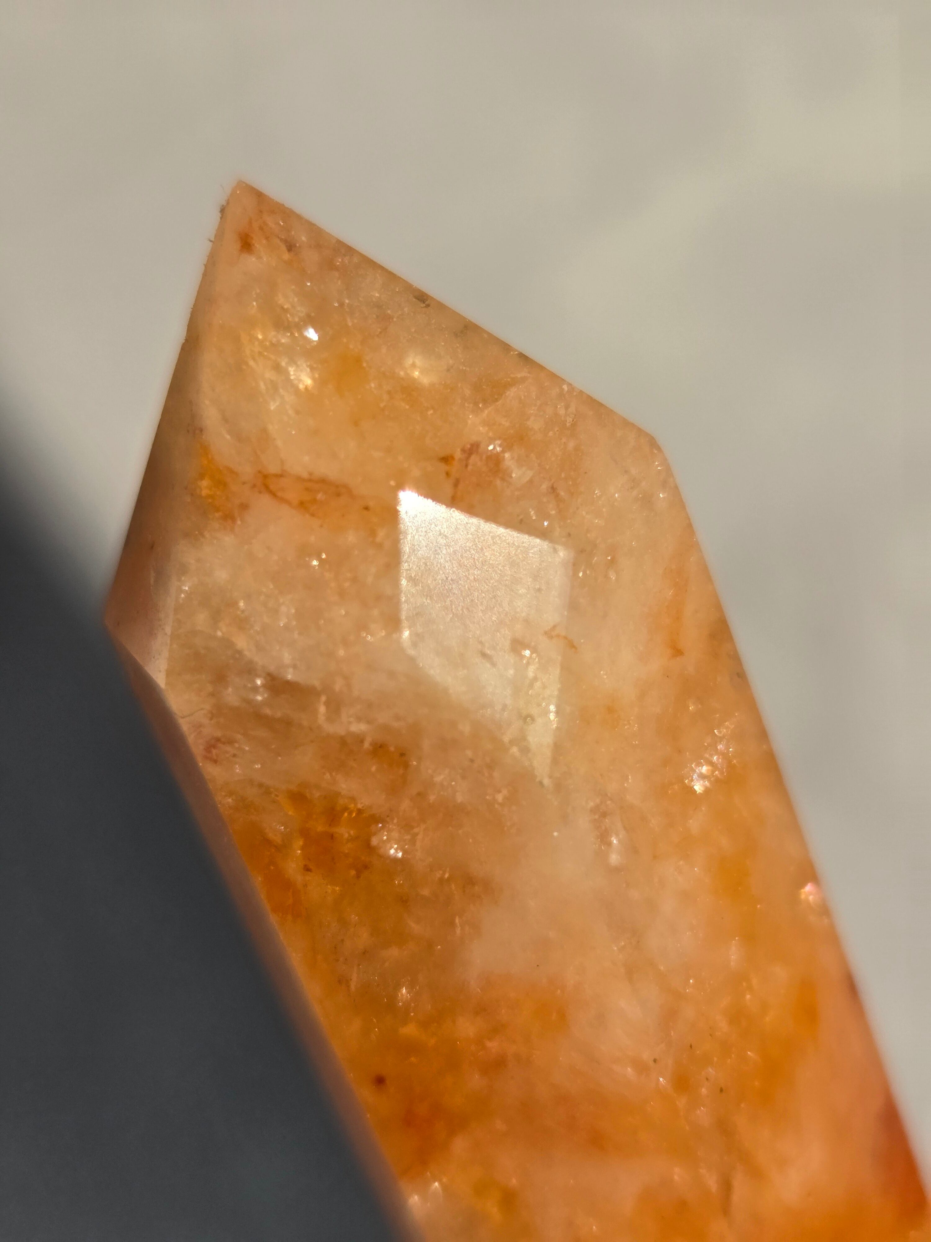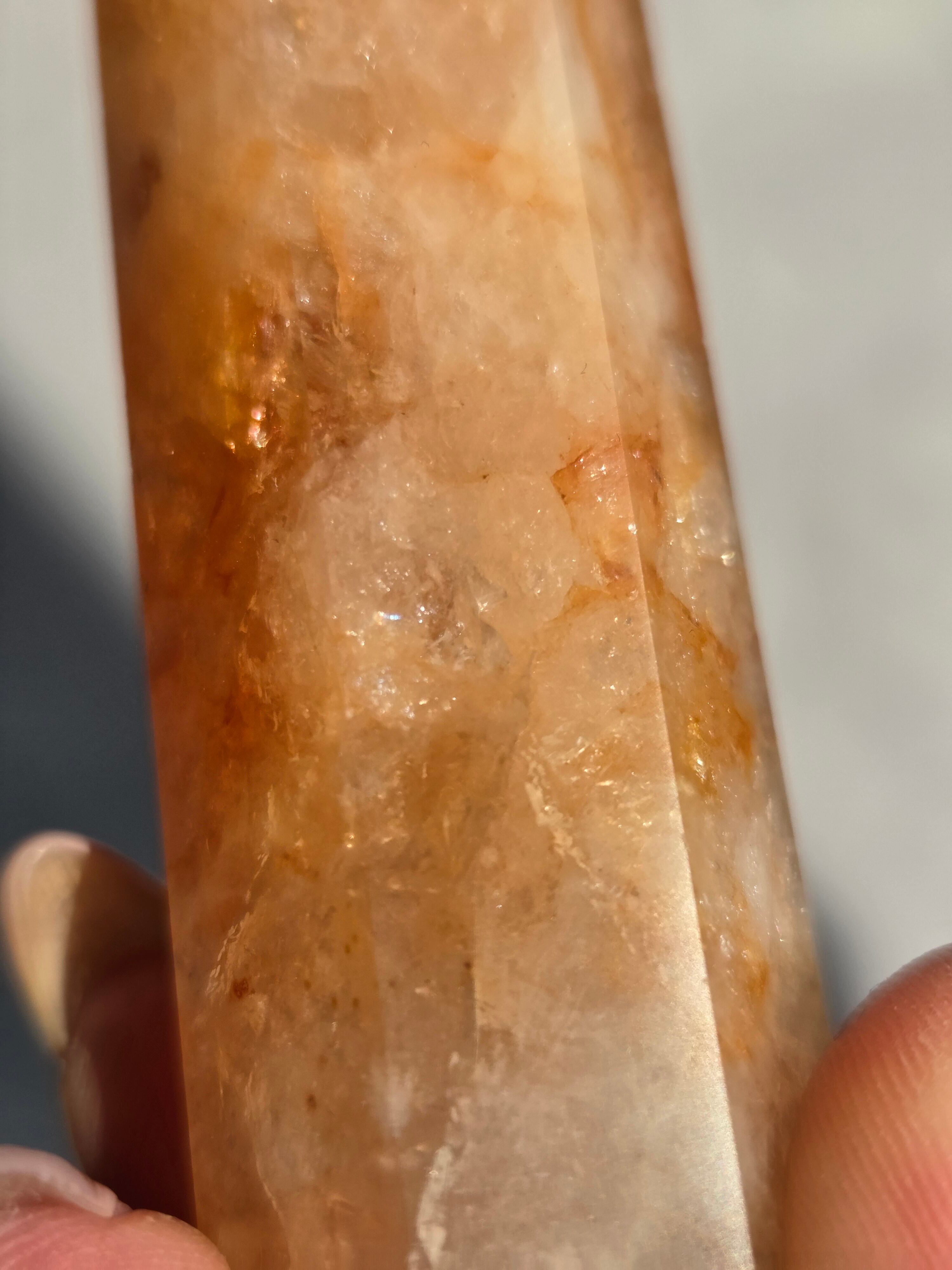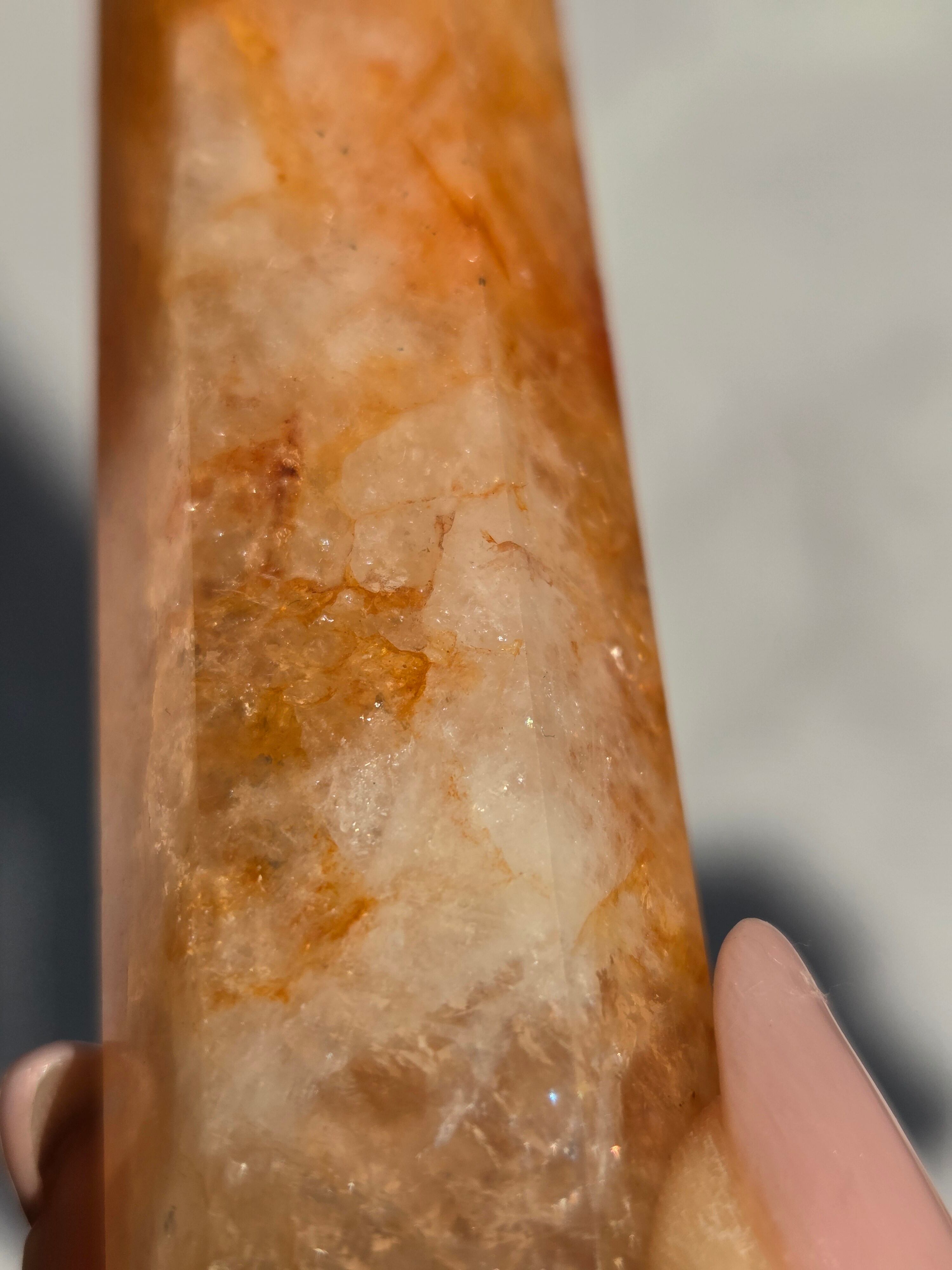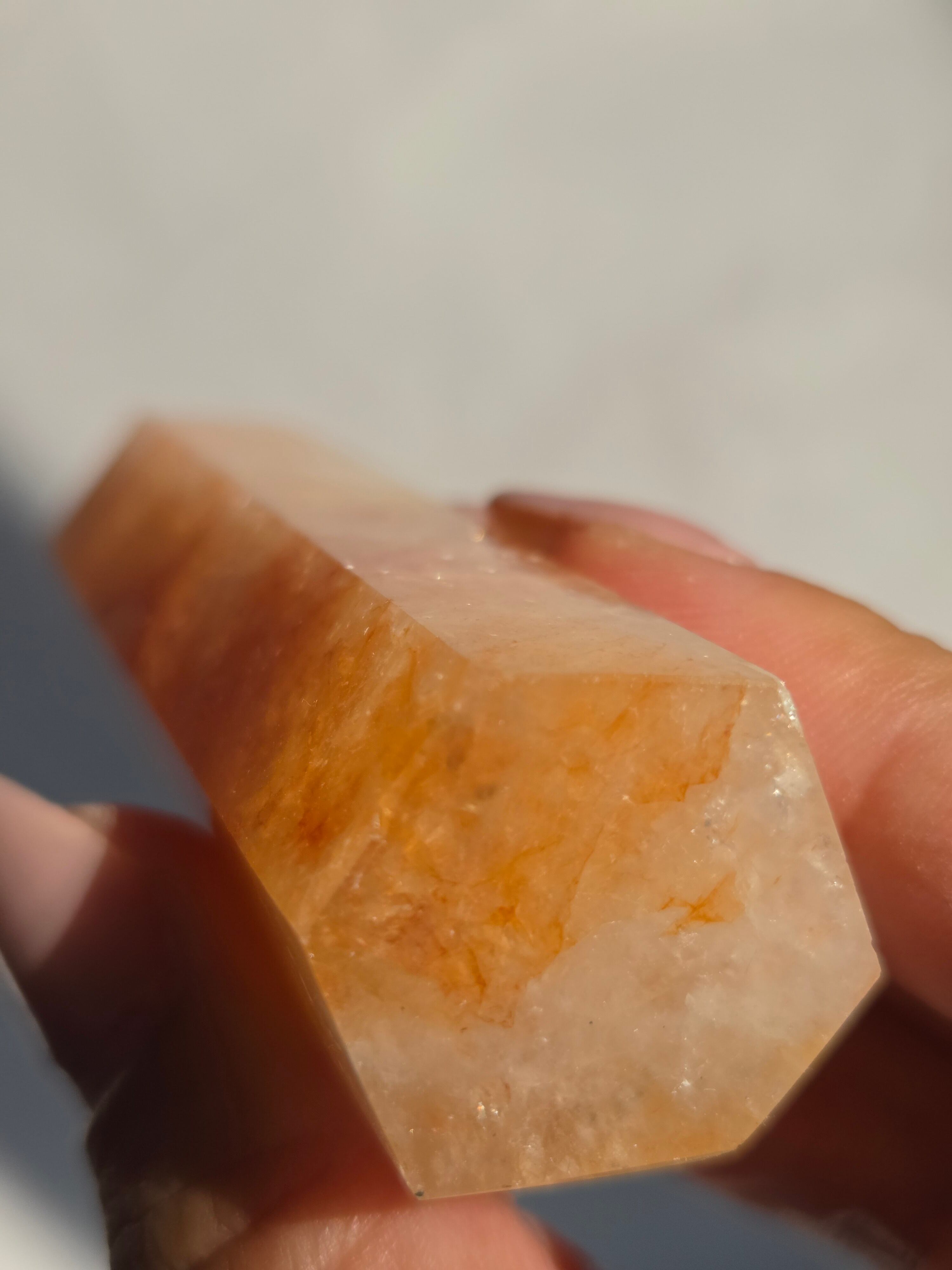 キラキラな虹が沢山で、クォーツの透明感と、ライモナイトのイエローオレンジレッドカラーがフレッシュで元気な気持ちにさせてくれます。