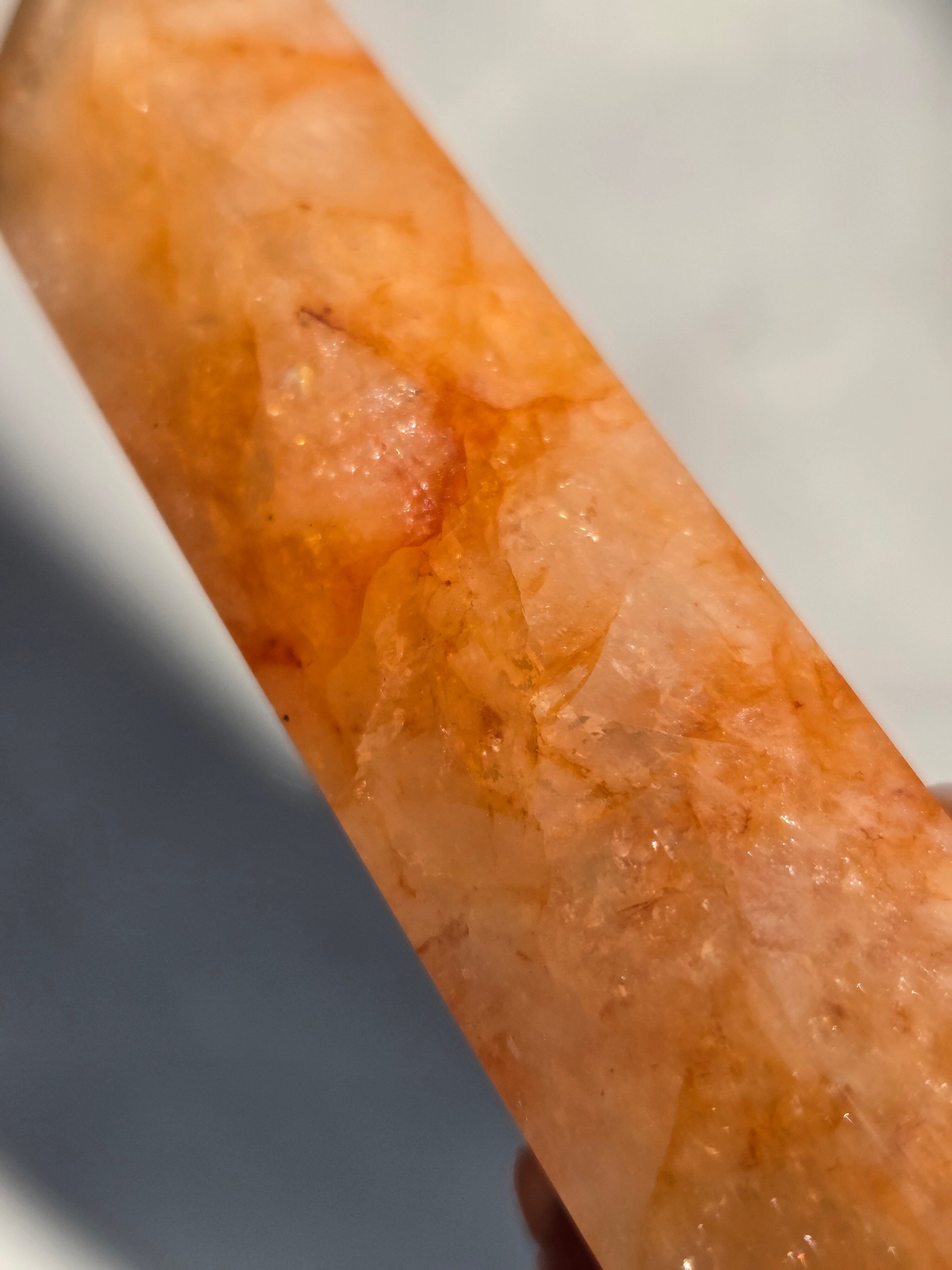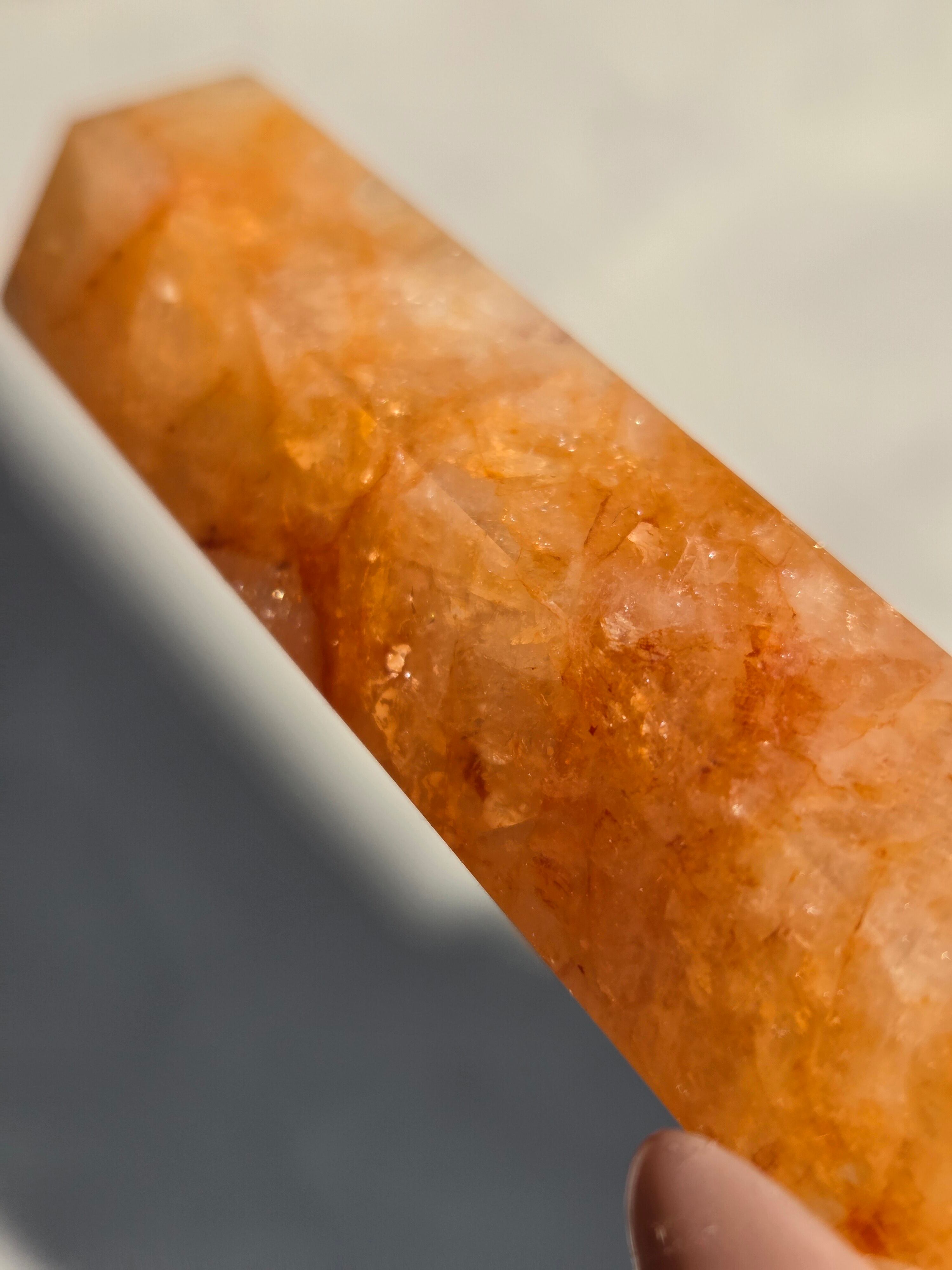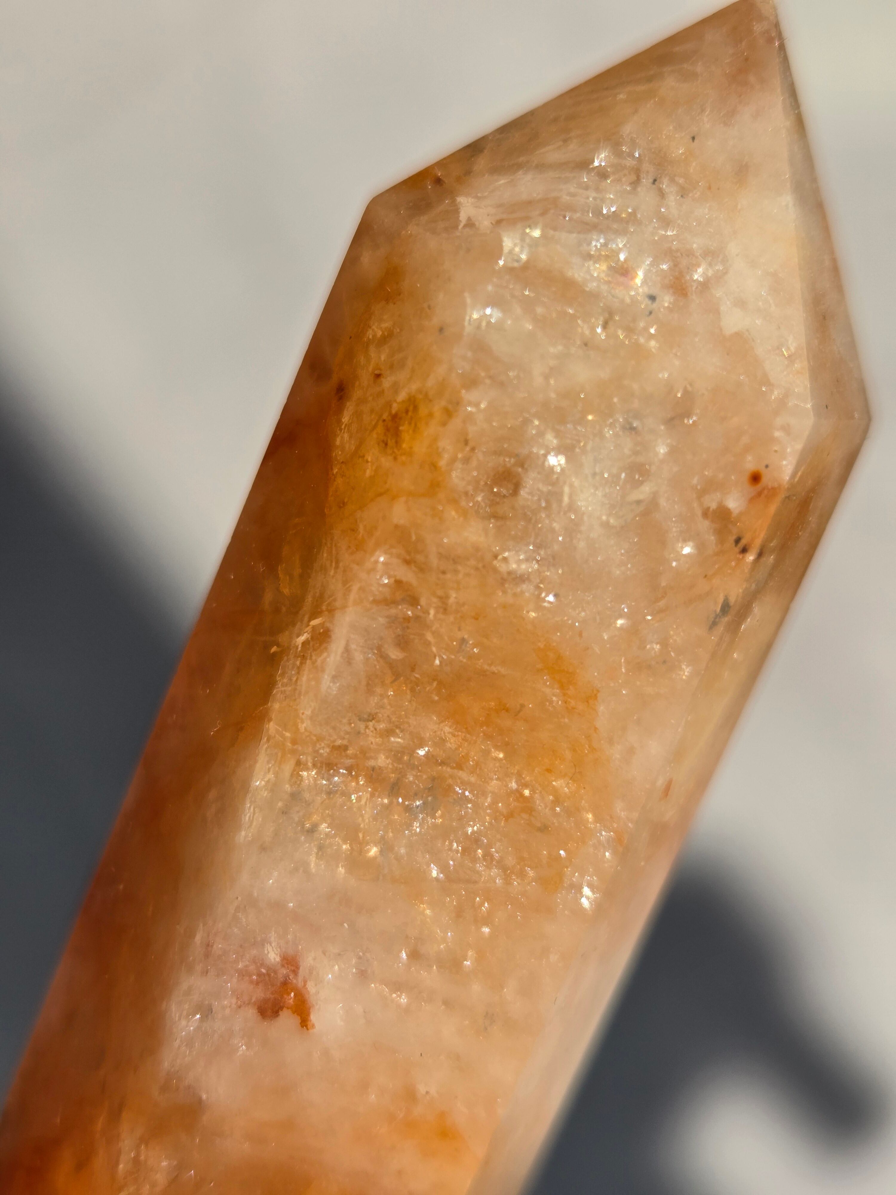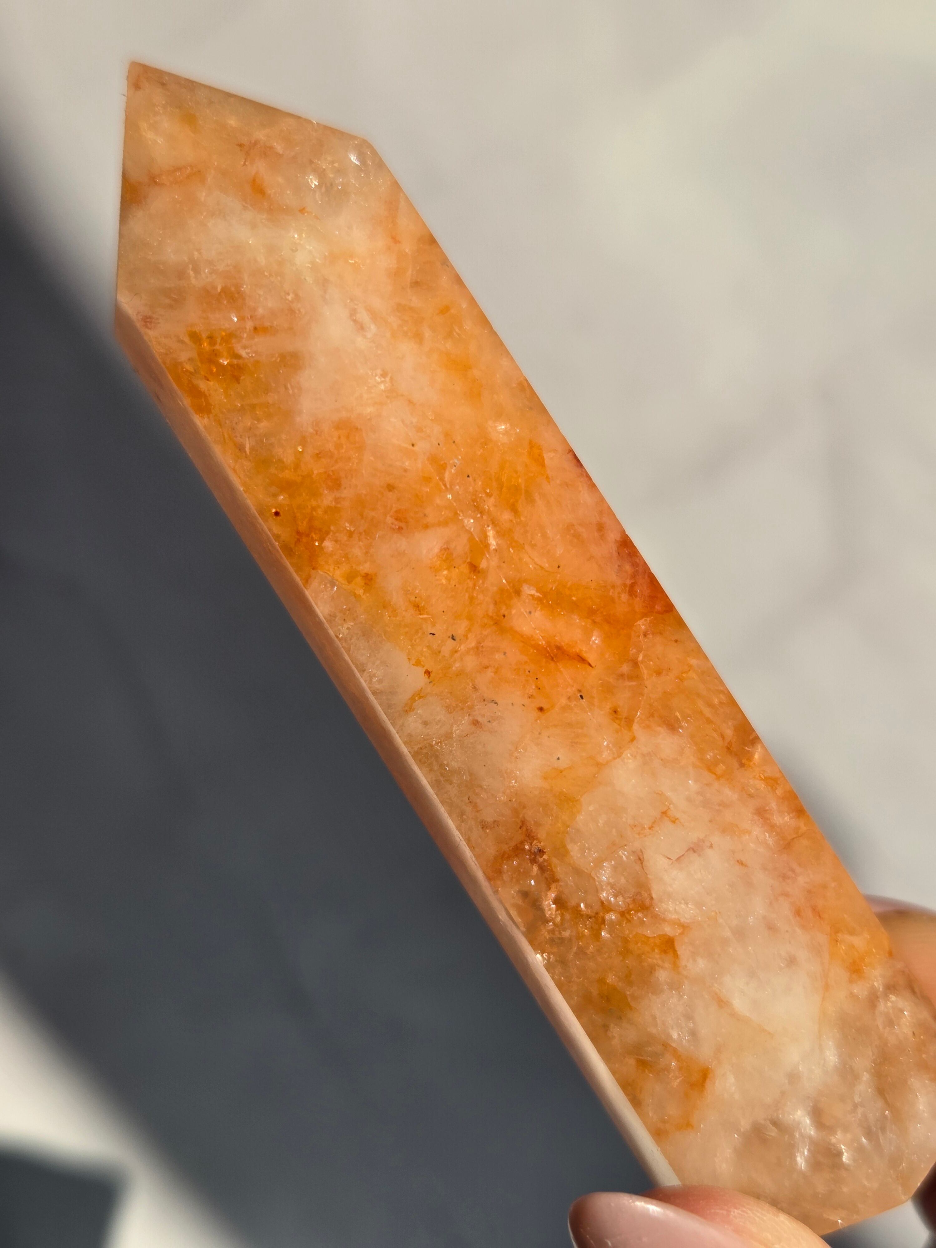 キラキラな虹が沢山で、クォーツの透明感と、ライモナイトのイエローオレンジレッドカラーがフレッシュで元気な気持ちにさせてくれます。