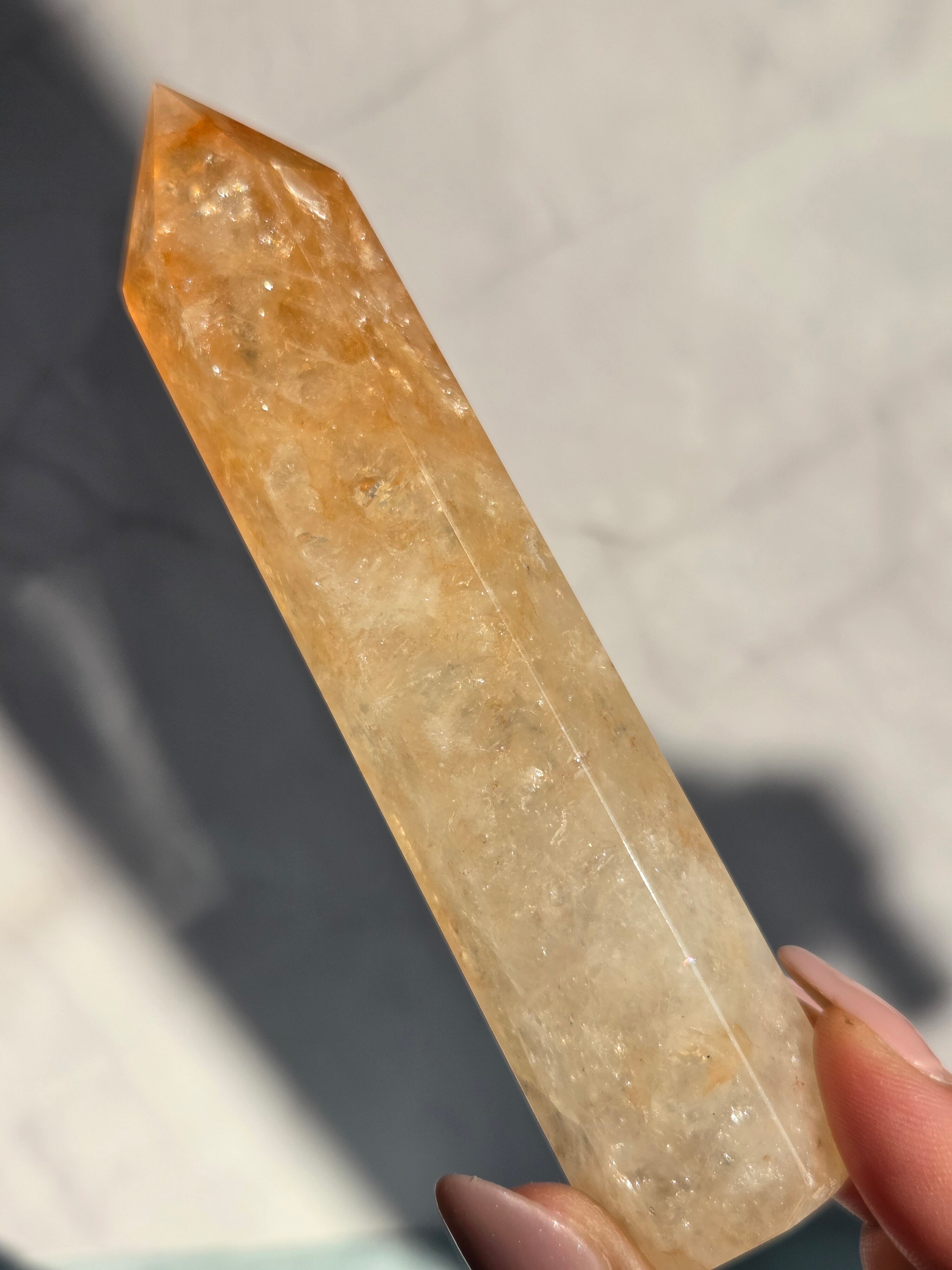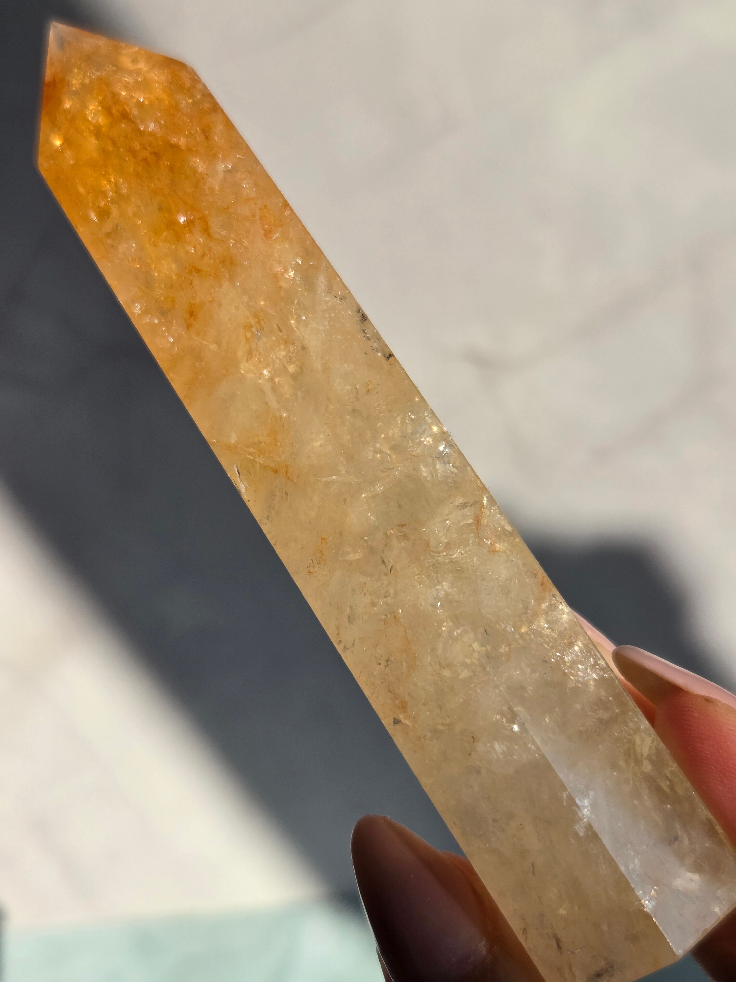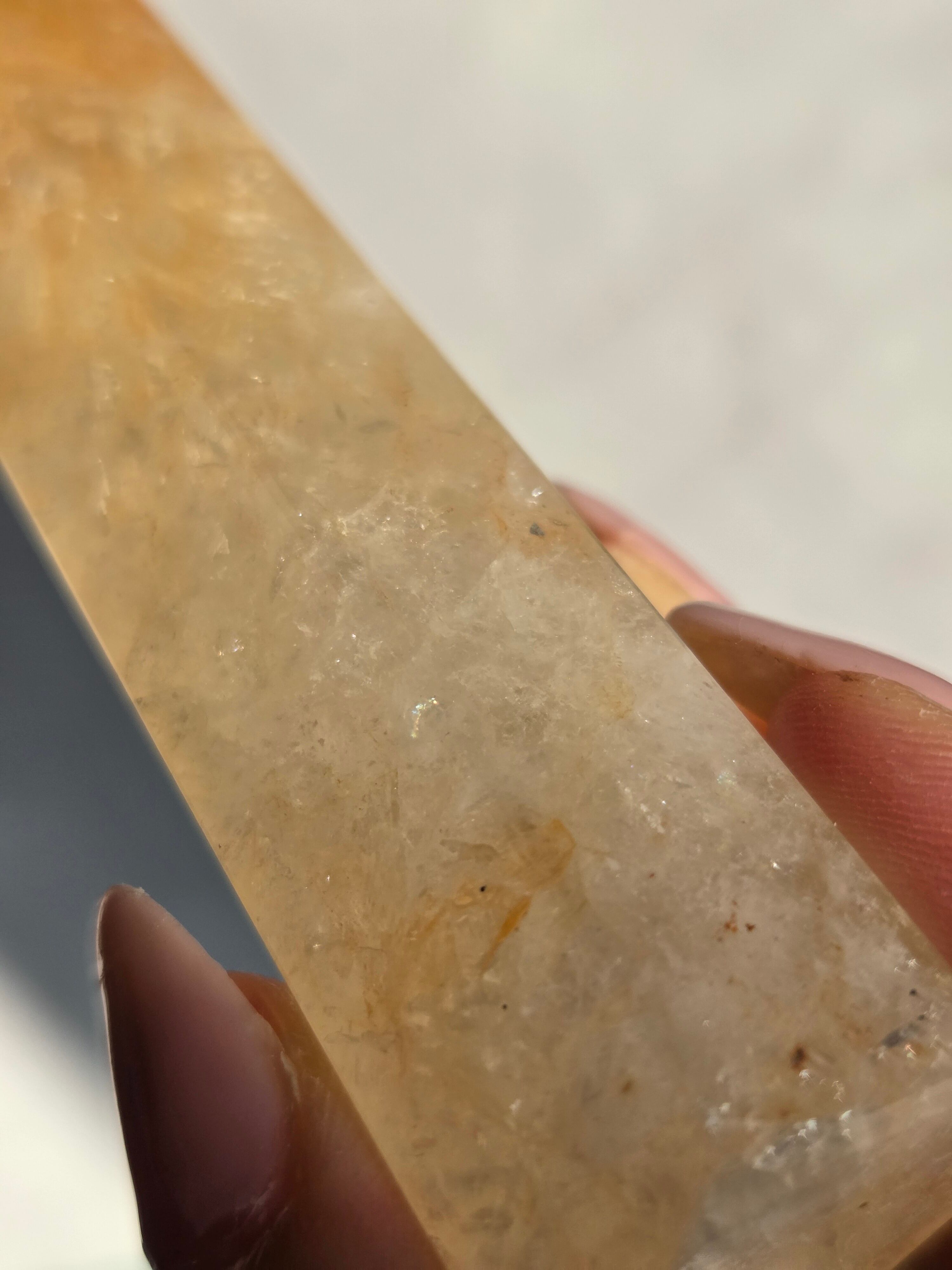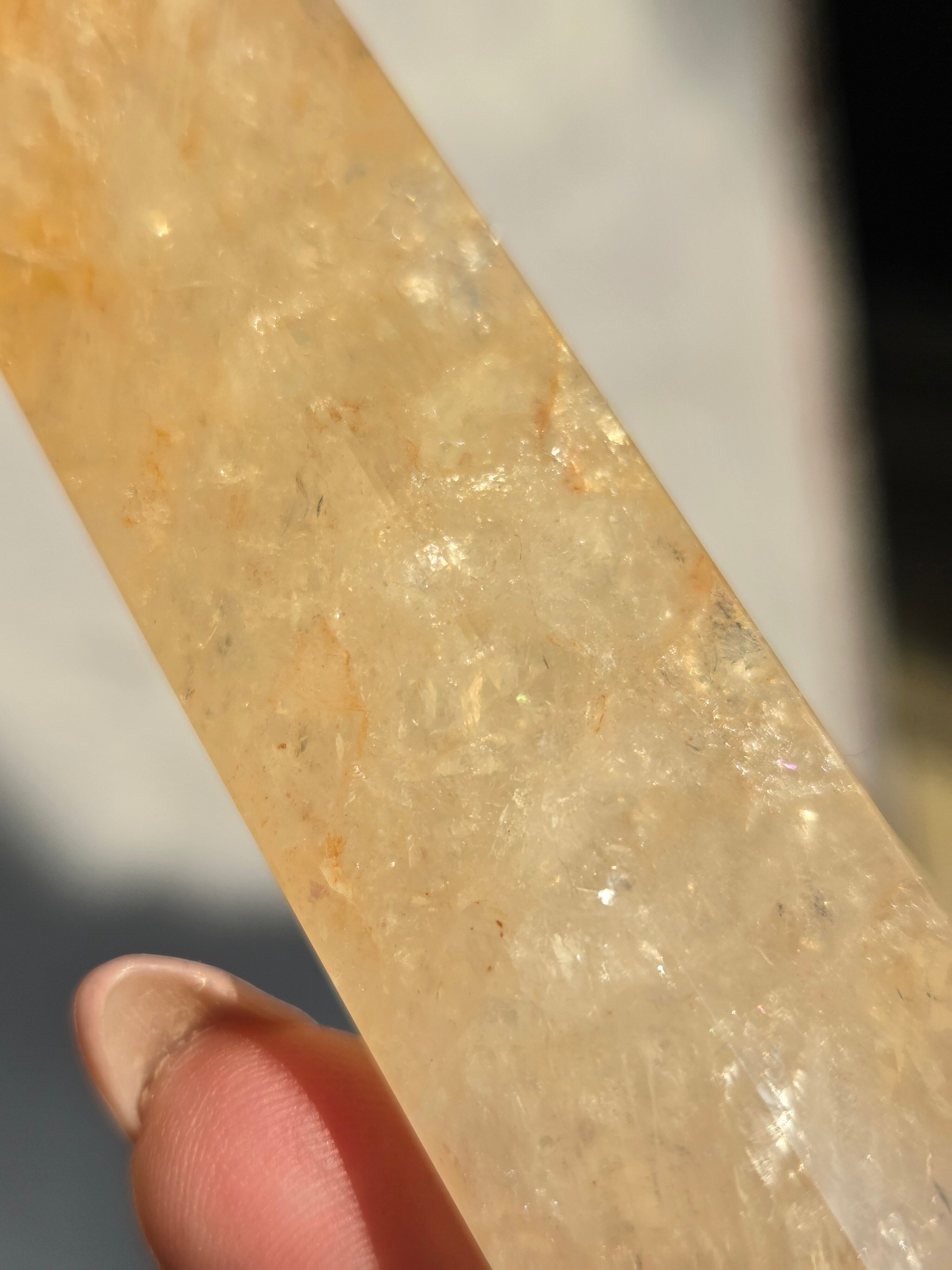 キラキラな虹が沢山で、クォーツの透明感と、ライモナイトのイエローオレンジレッドカラーがフレッシュで元気な気持ちにさせてくれます。