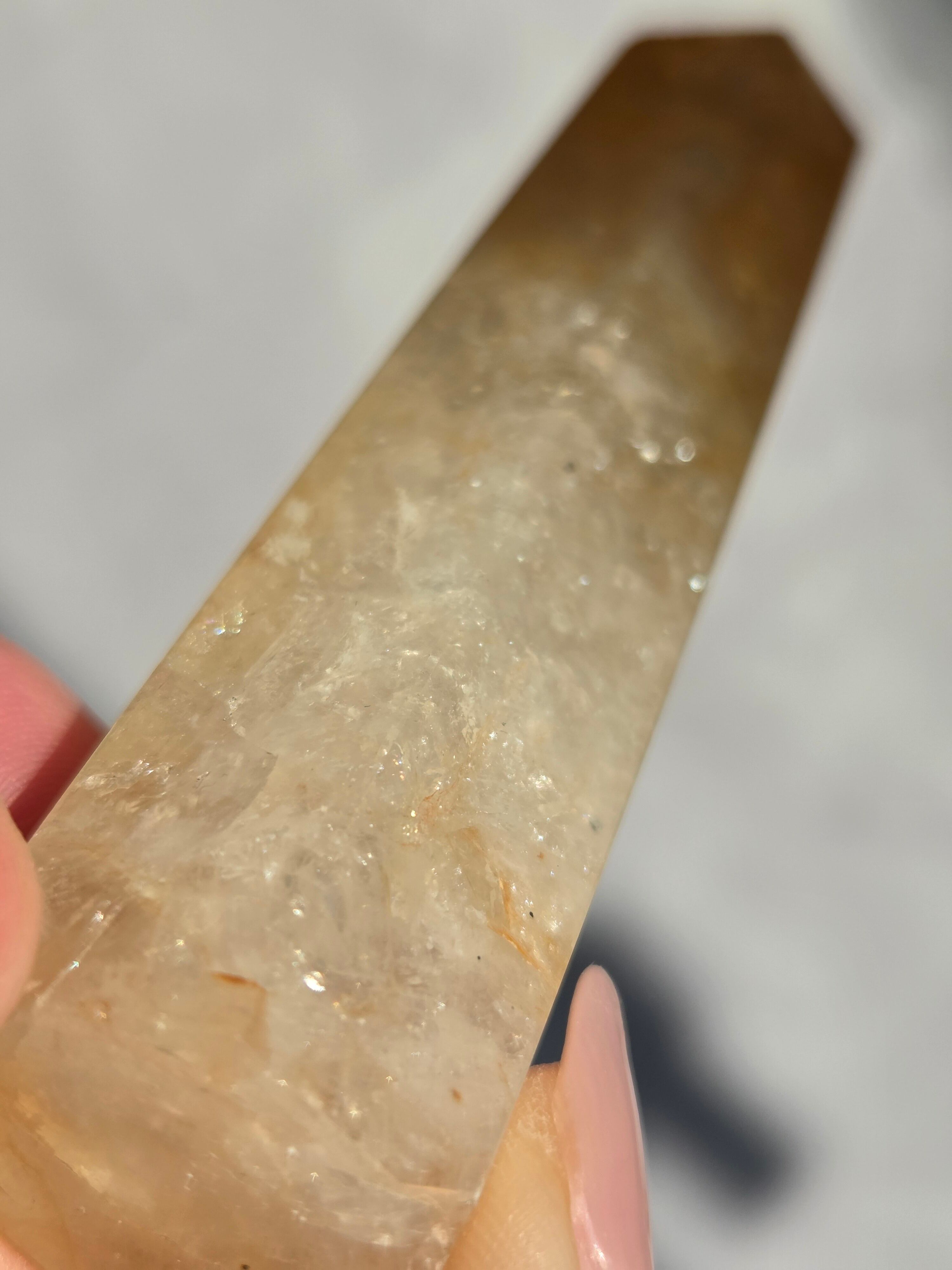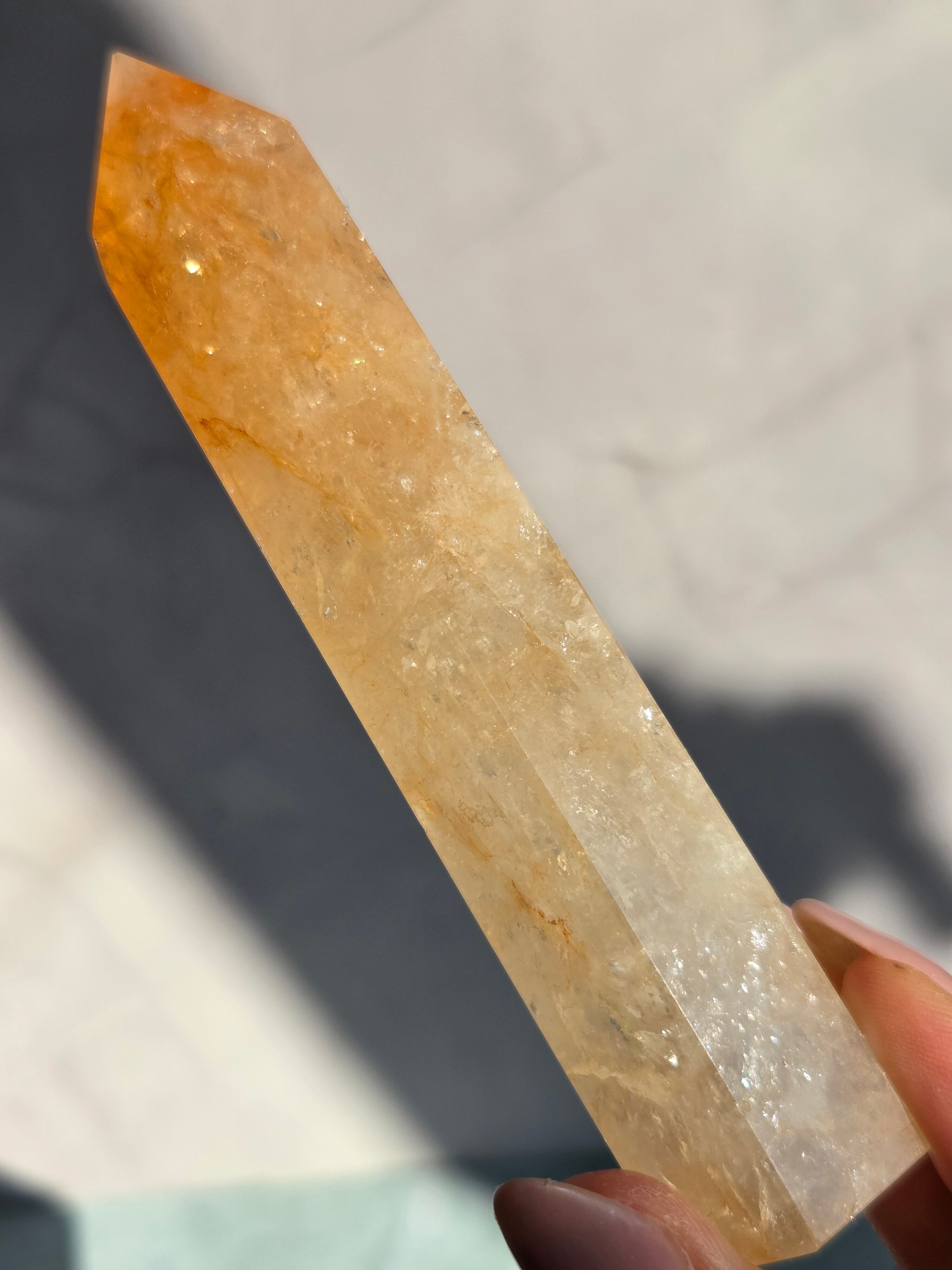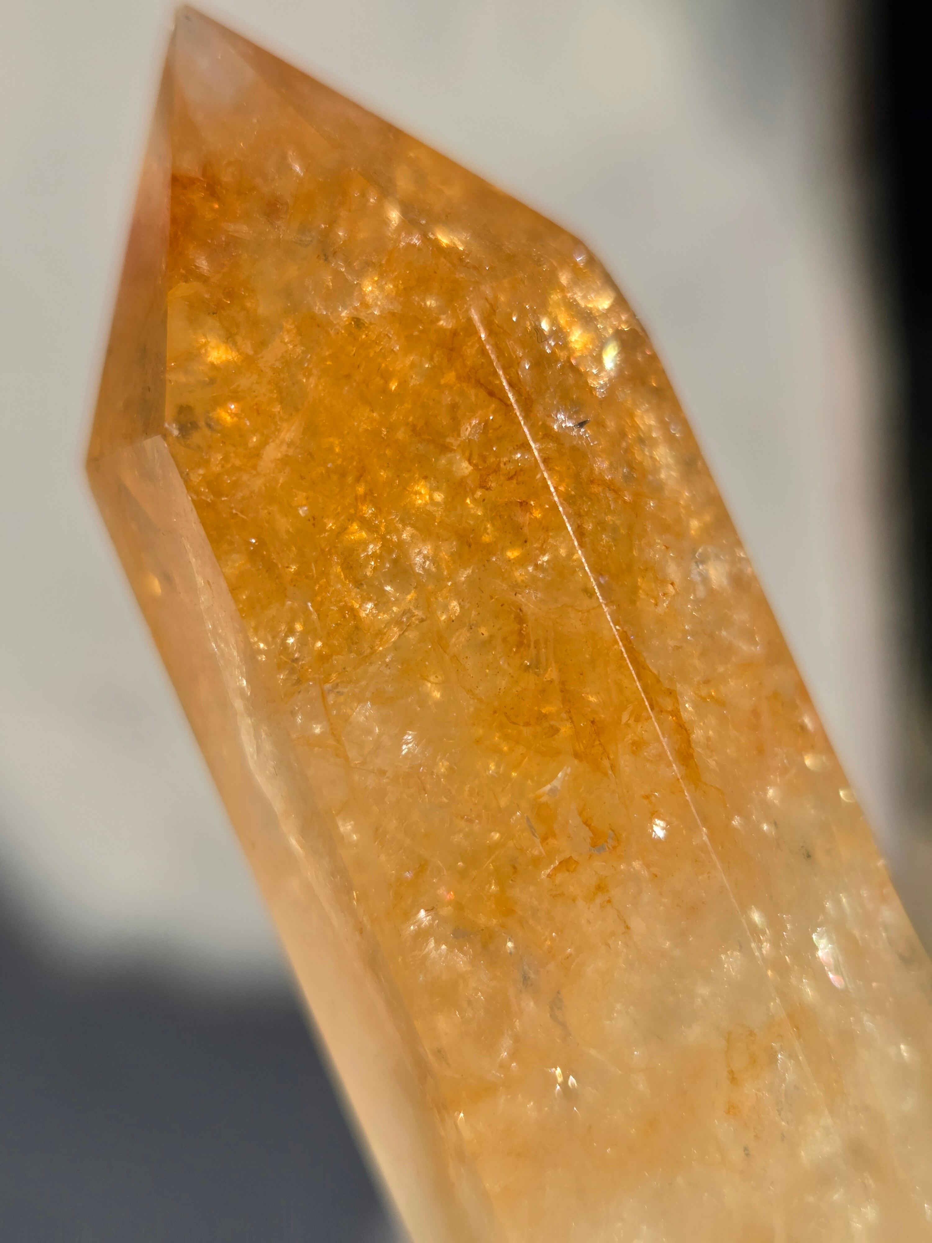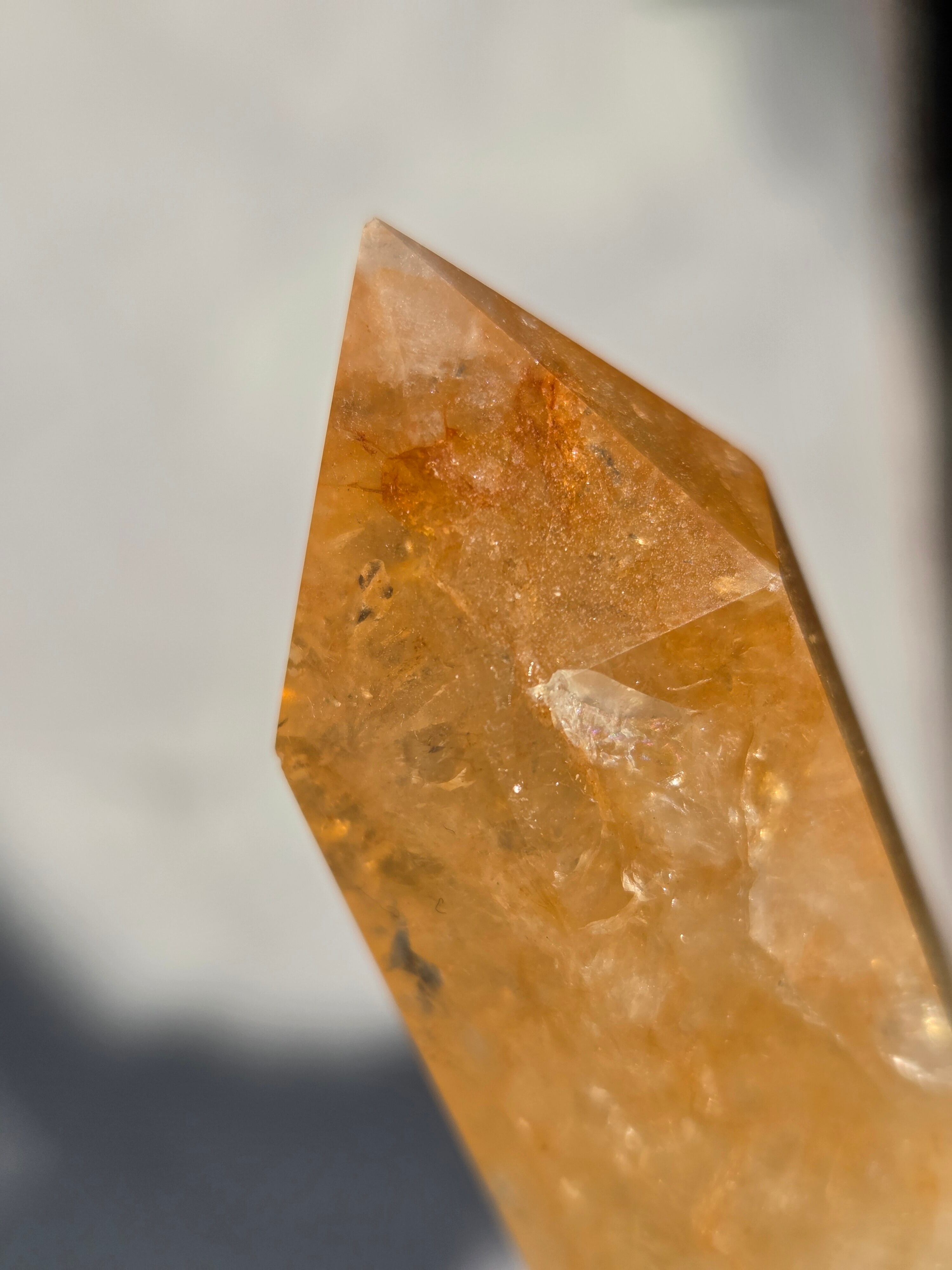 キラキラな虹が沢山で、クォーツの透明感と、ライモナイトのイエローオレンジレッドカラーがフレッシュで元気な気持ちにさせてくれます。