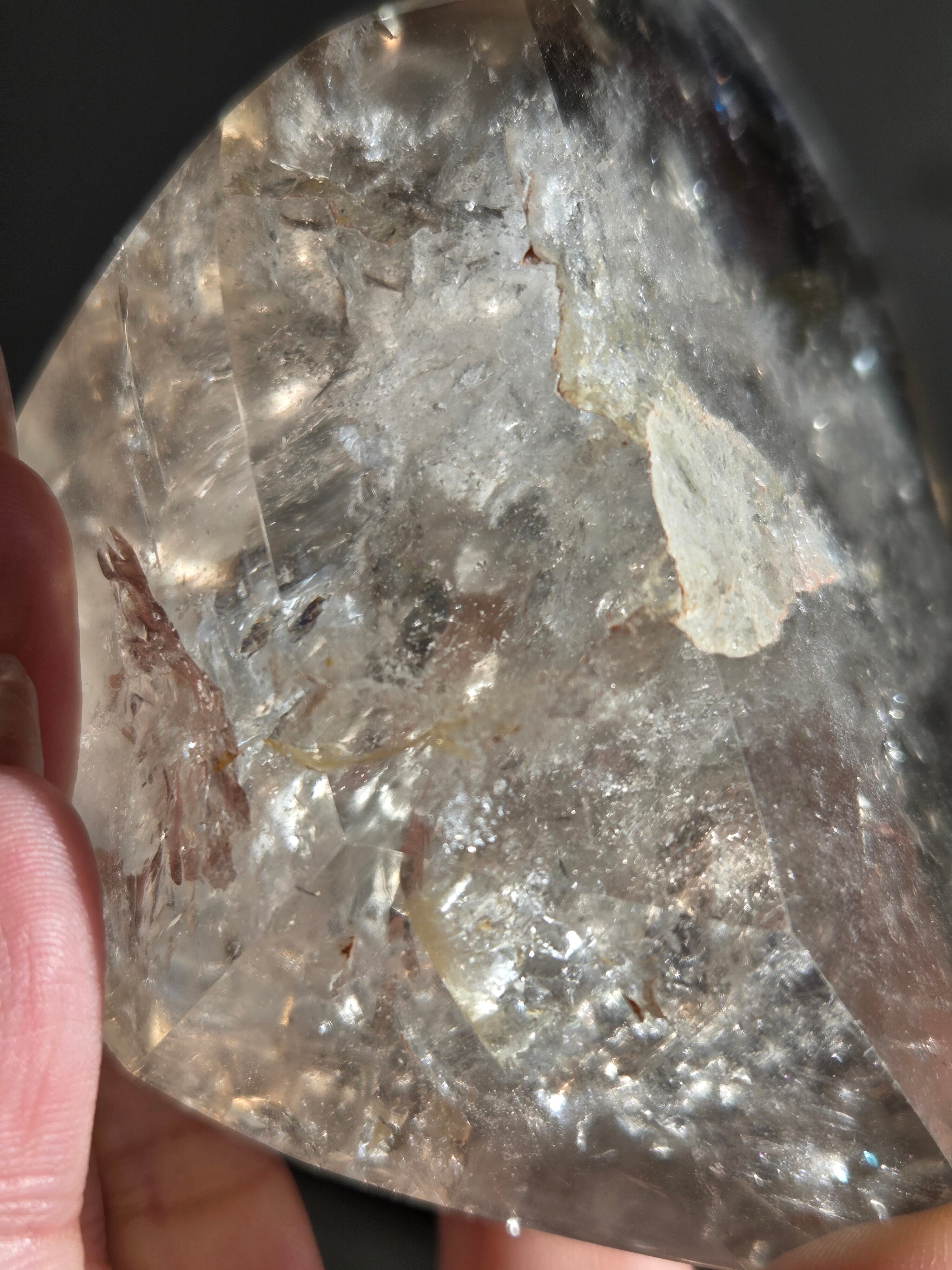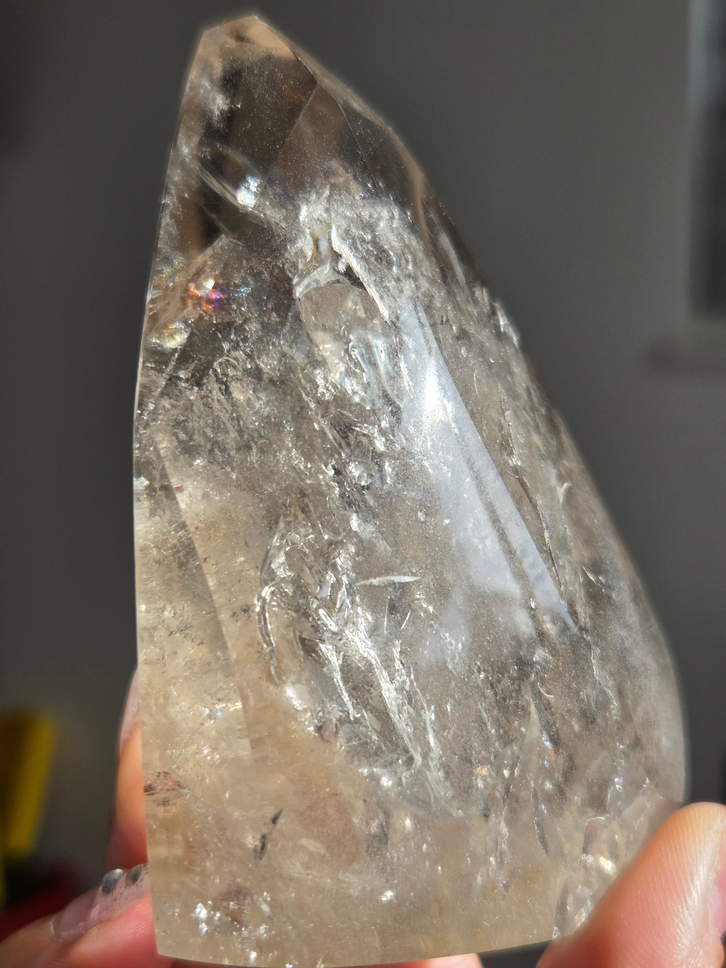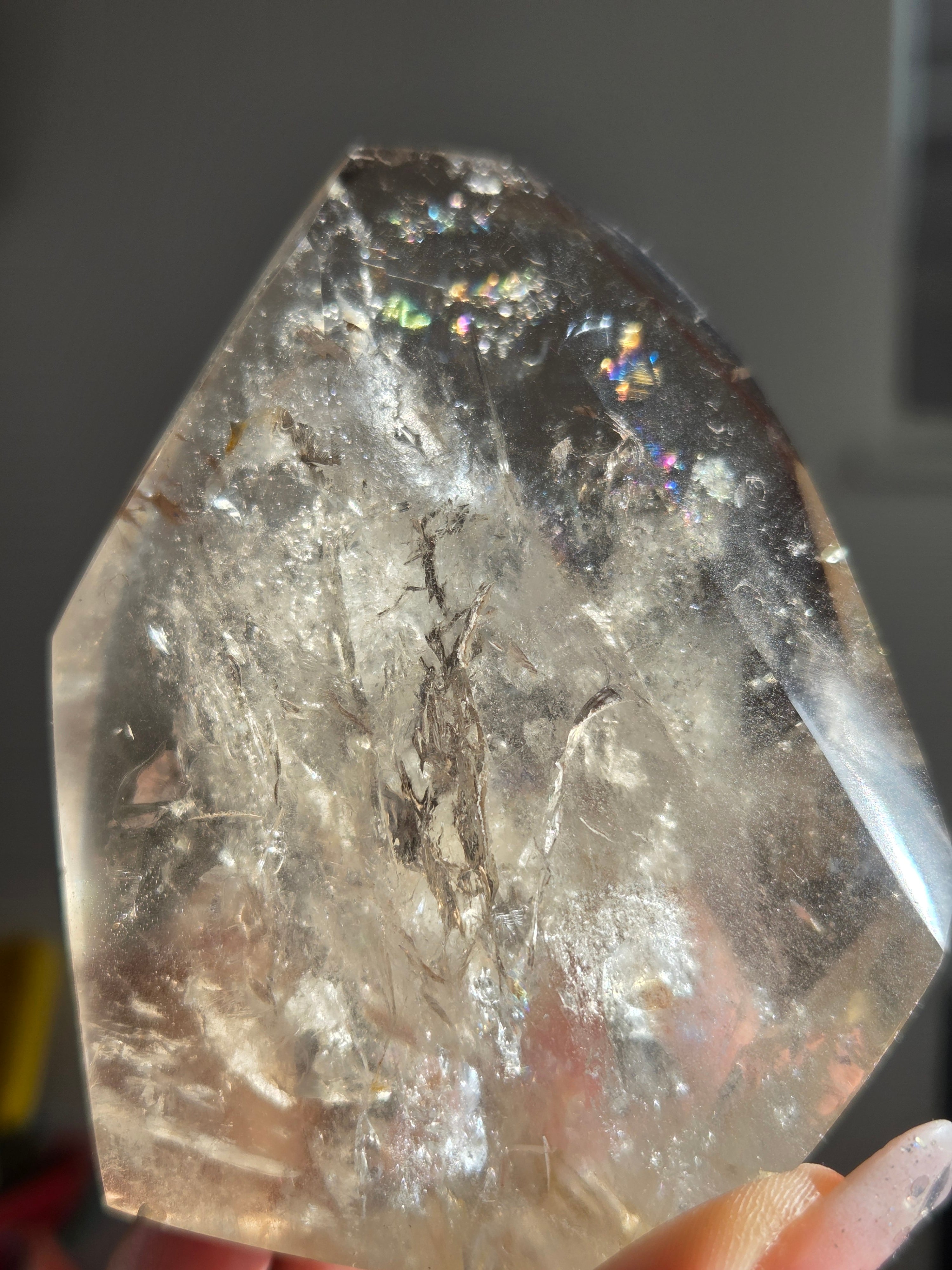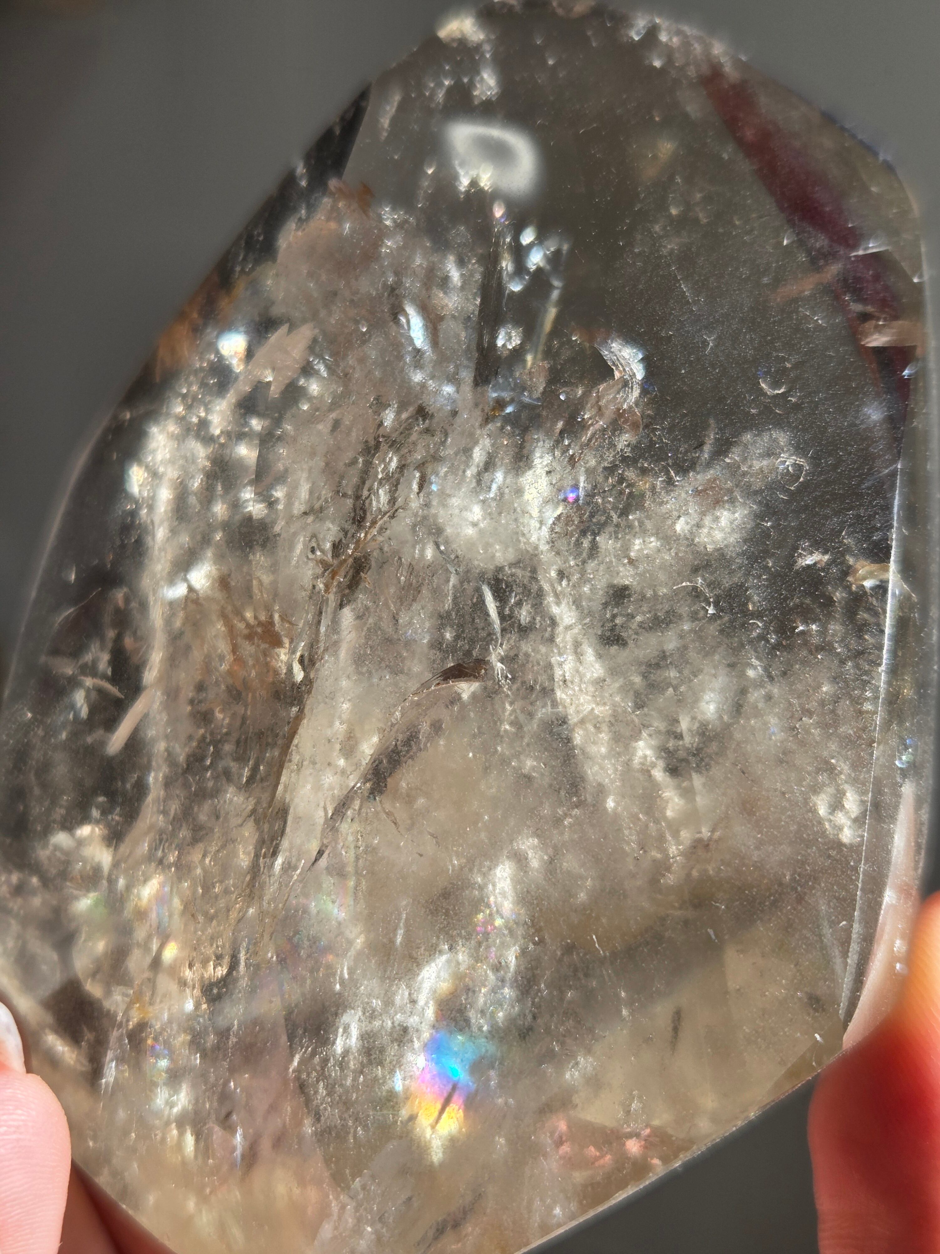 クォーツの透明感と虹が各所にキラキラ現れて美しい子です。