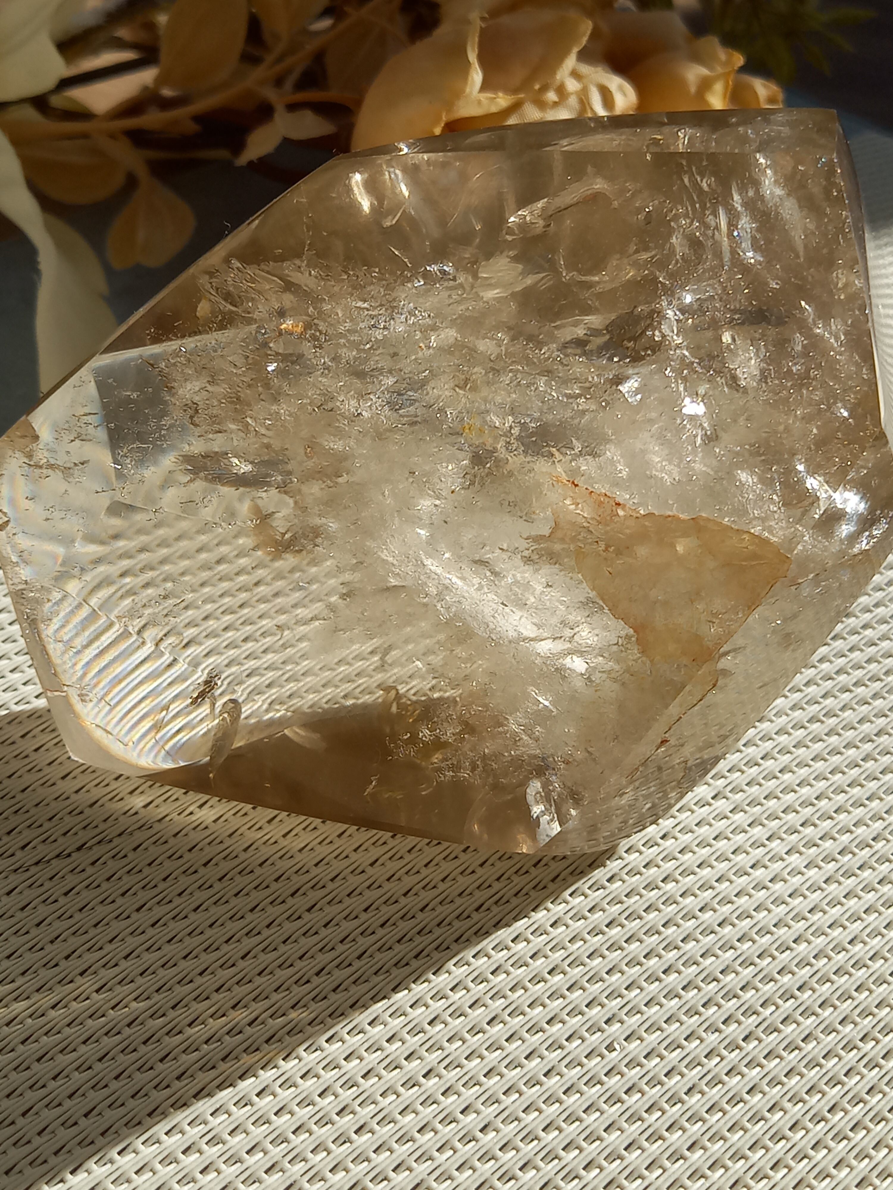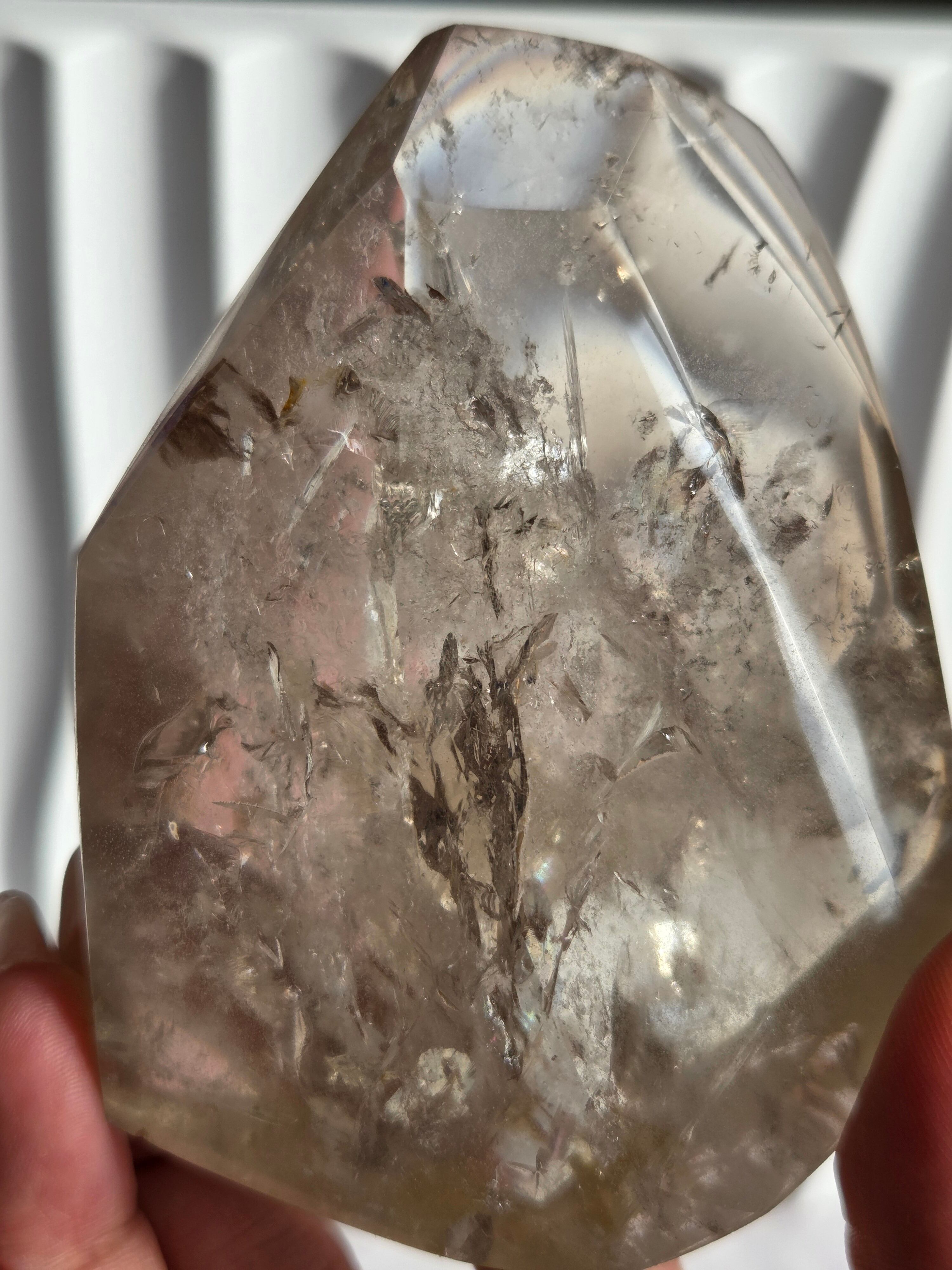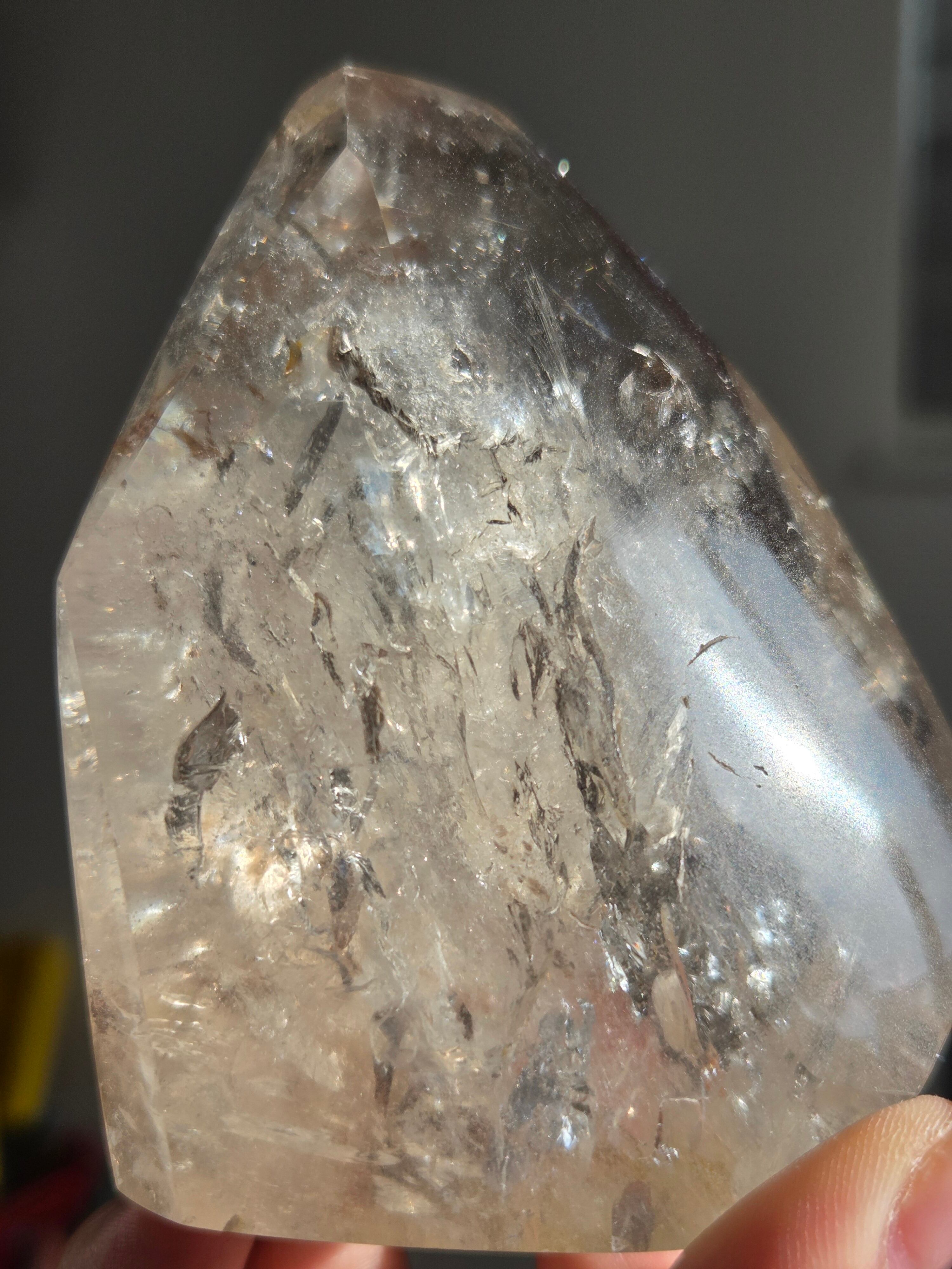クォーツの透明感と虹が各所にキラキラ現れて美しい子です。