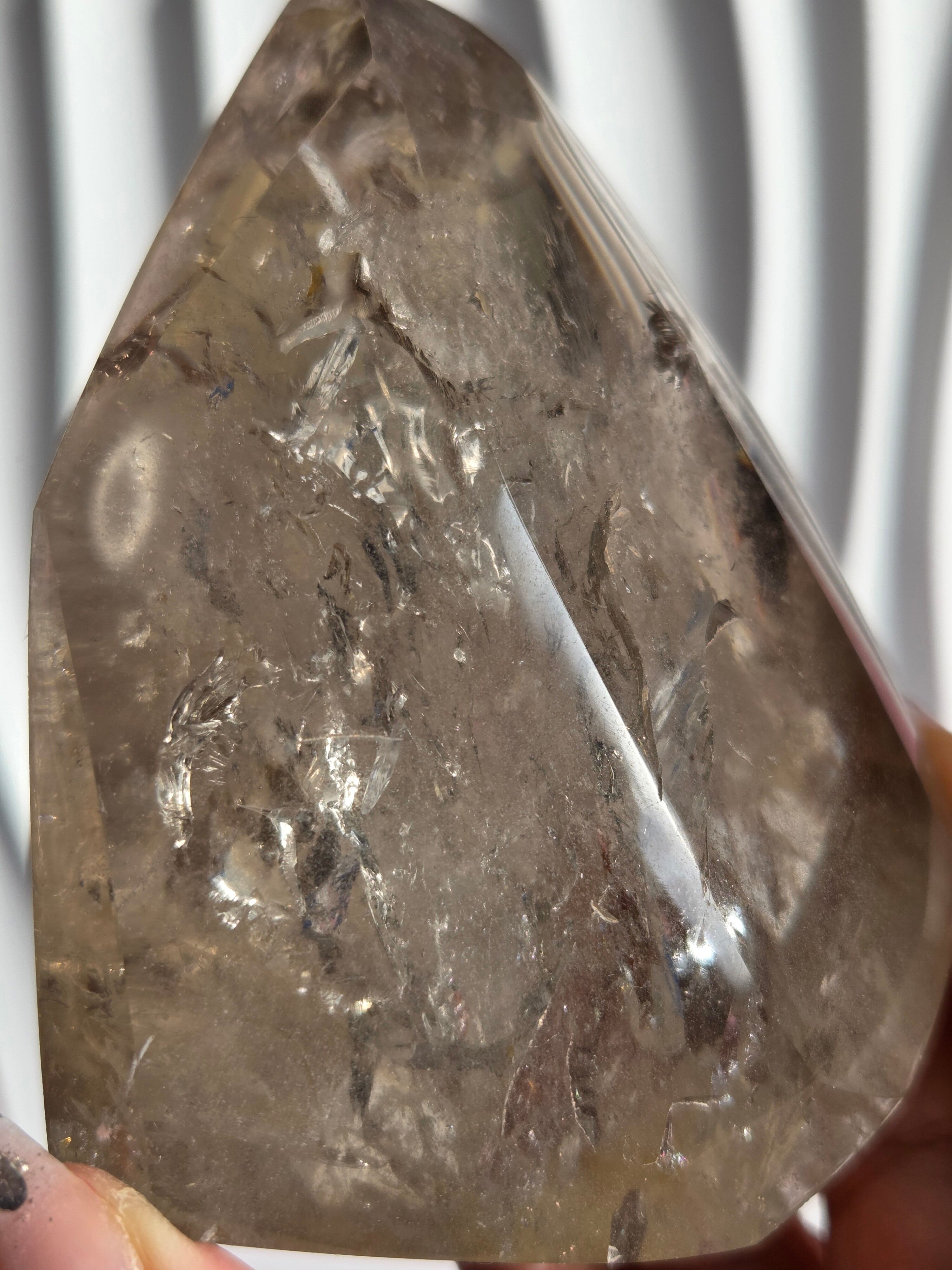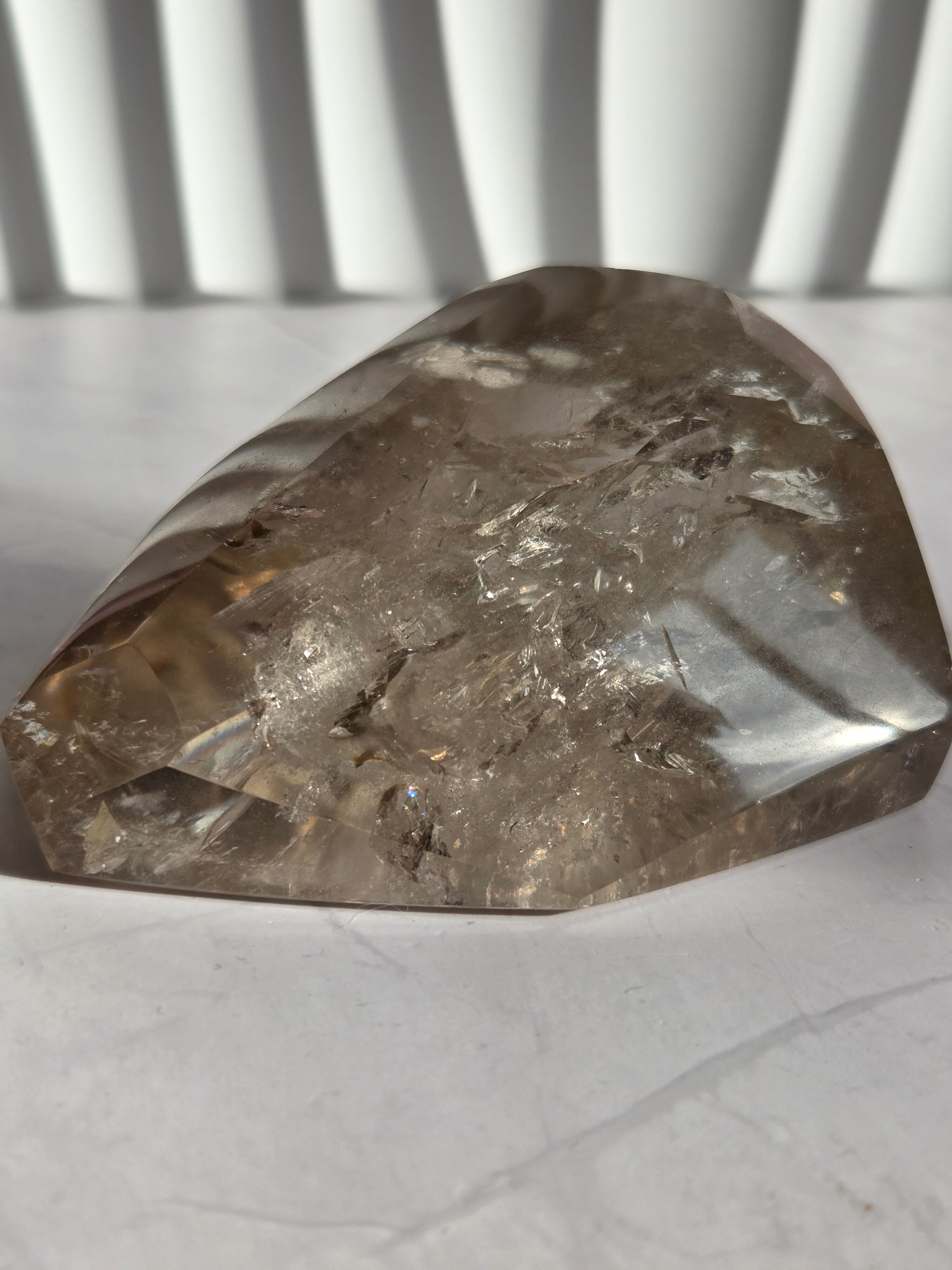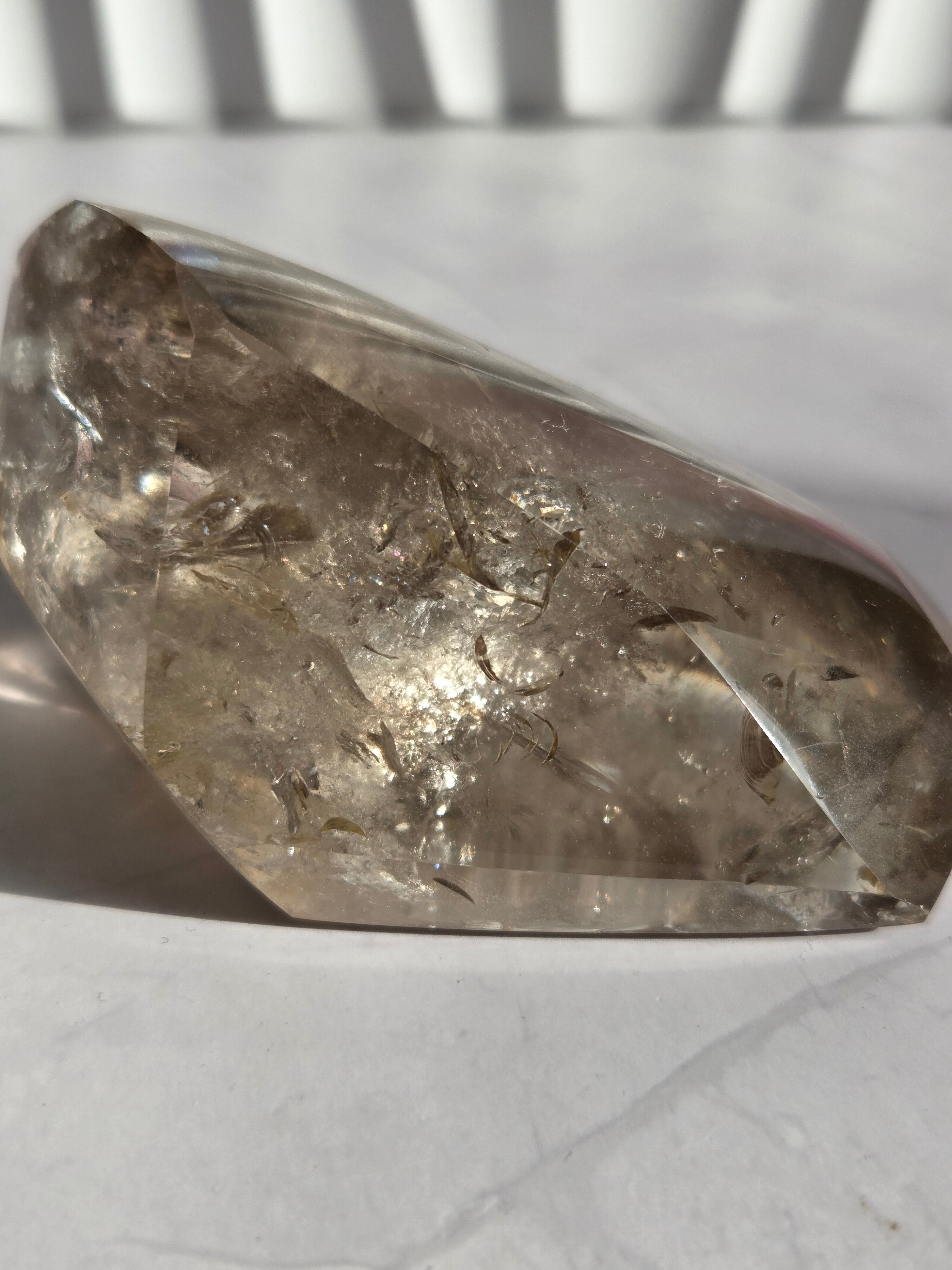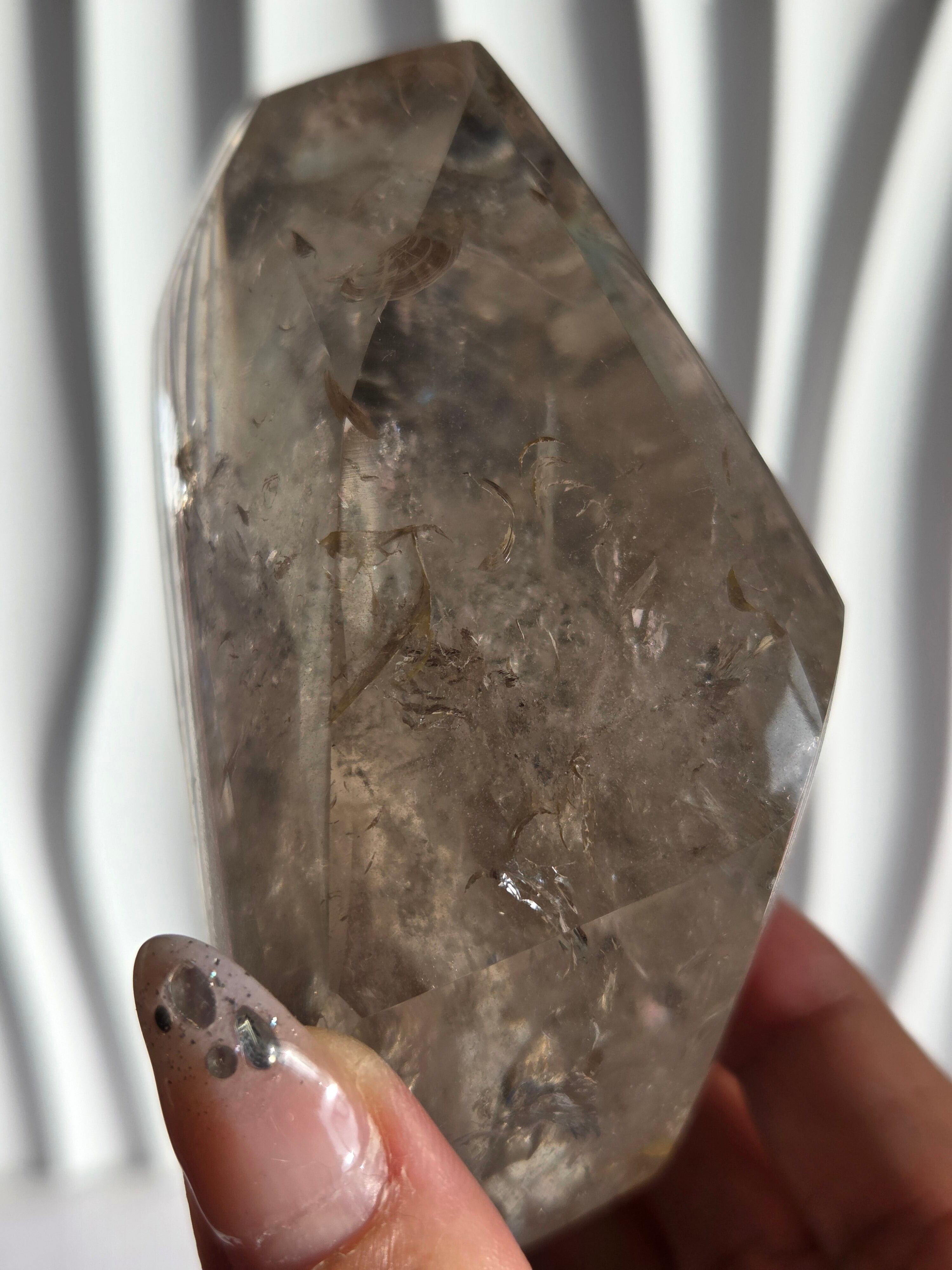 クォーツの透明感と虹が各所にキラキラ現れて美しい子です。