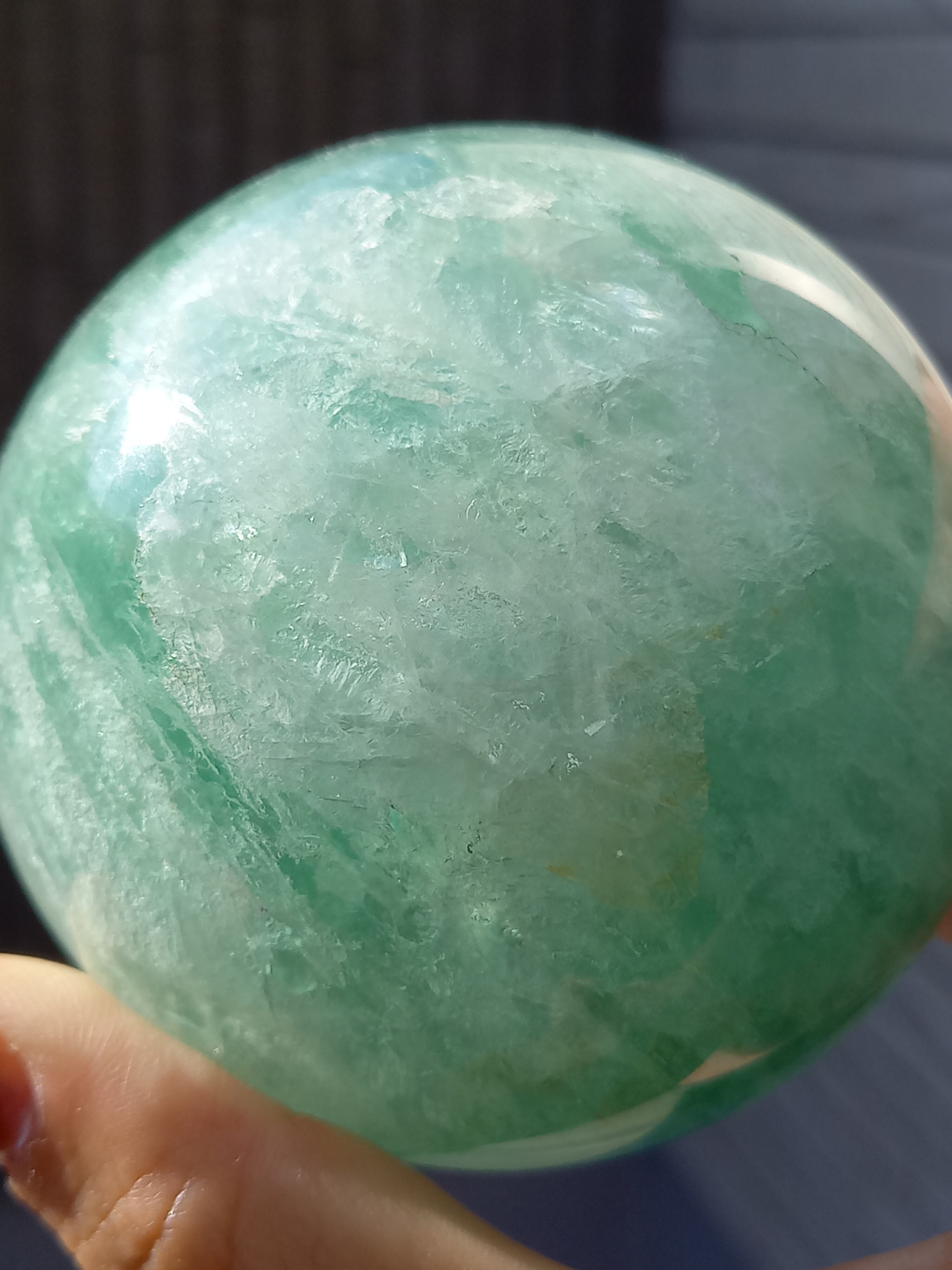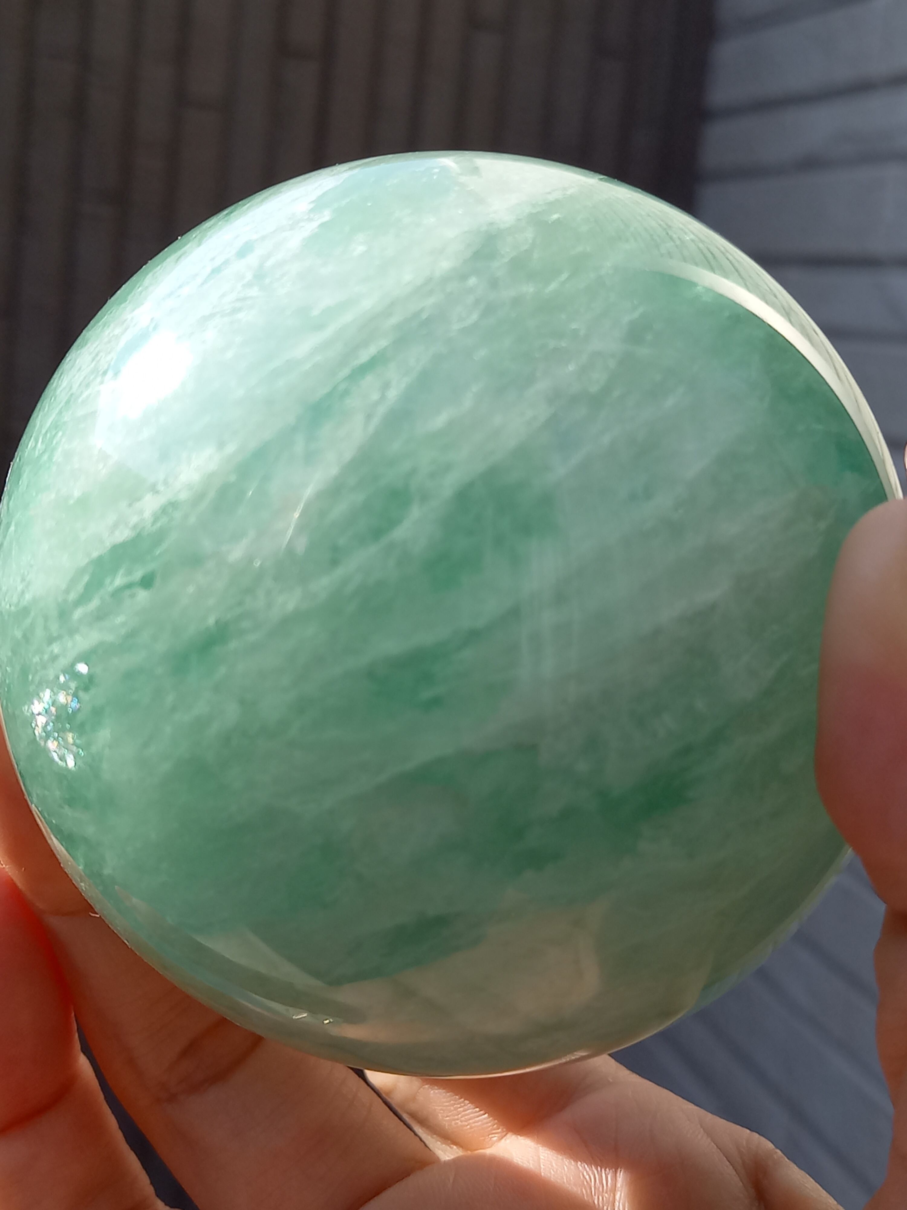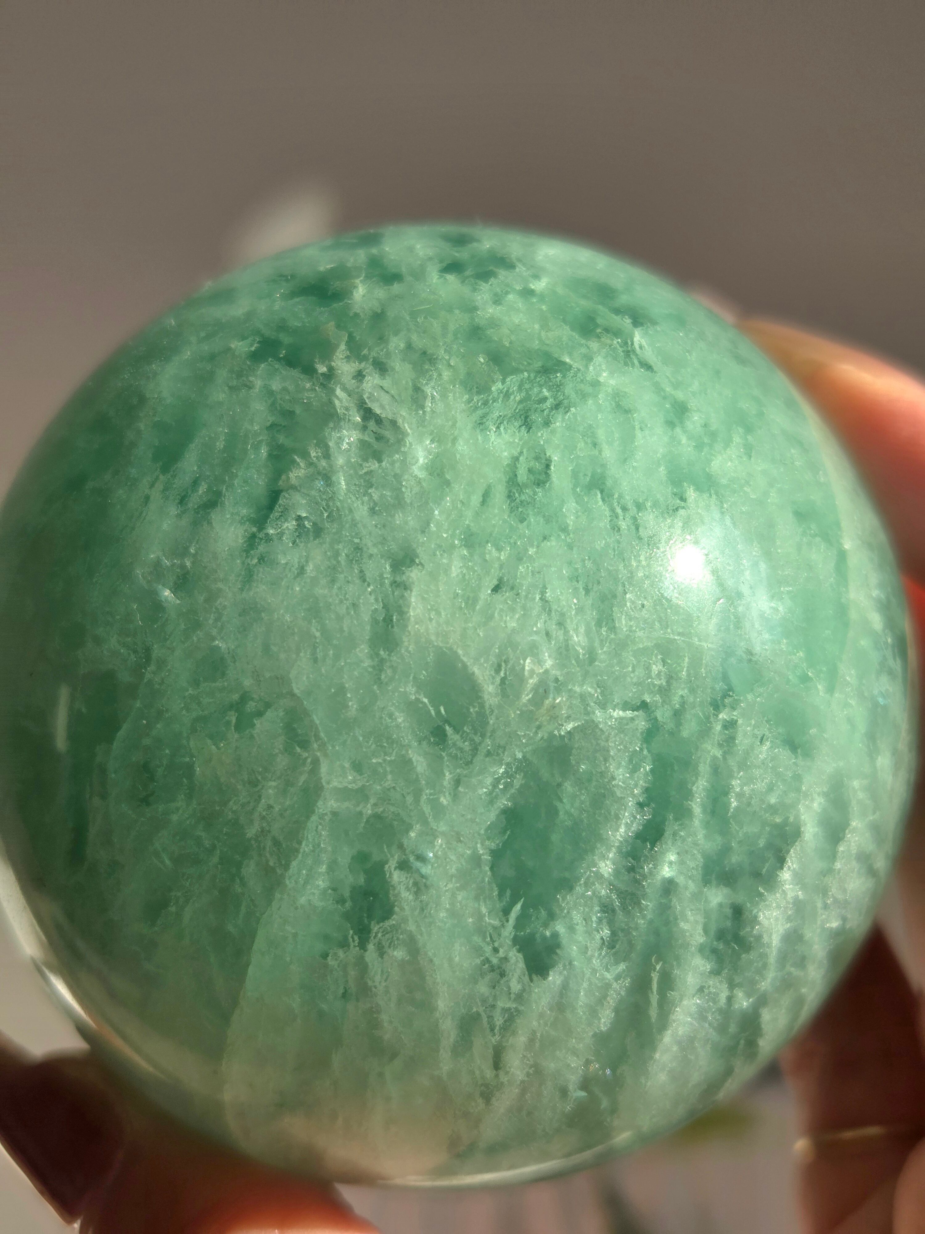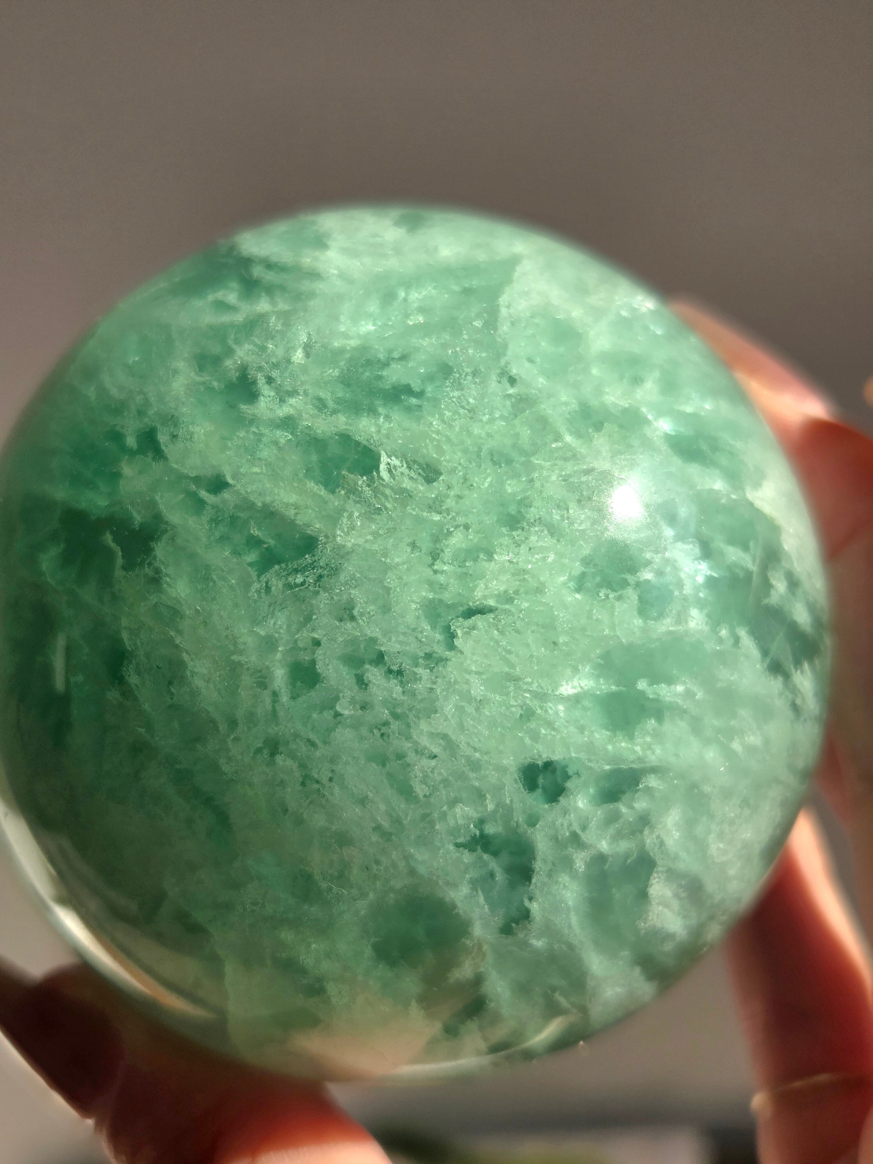 大きめスフィアに、フローライトは透明感があるので、中の層まで見えるので、ついつい見入ってしまいます。