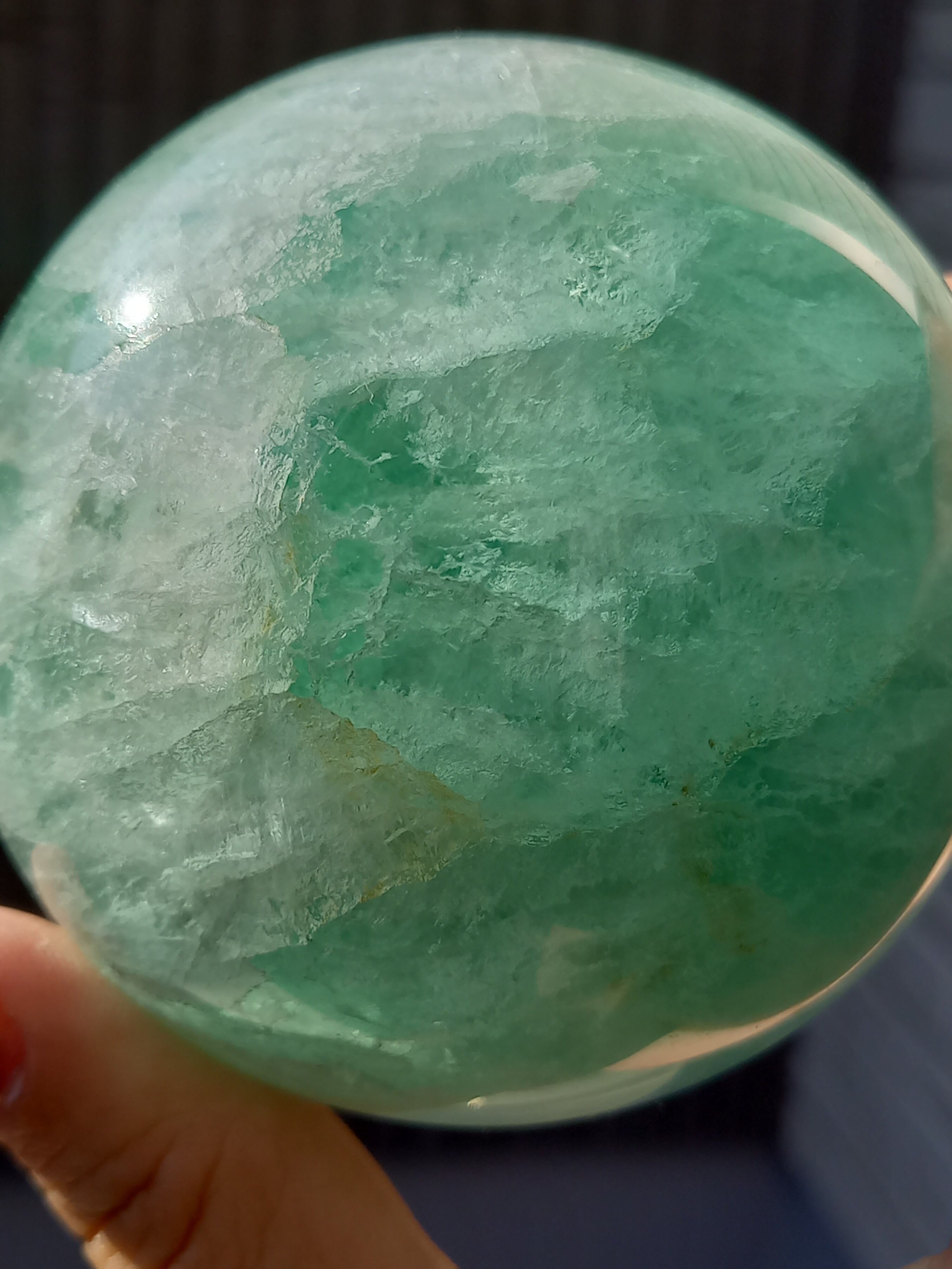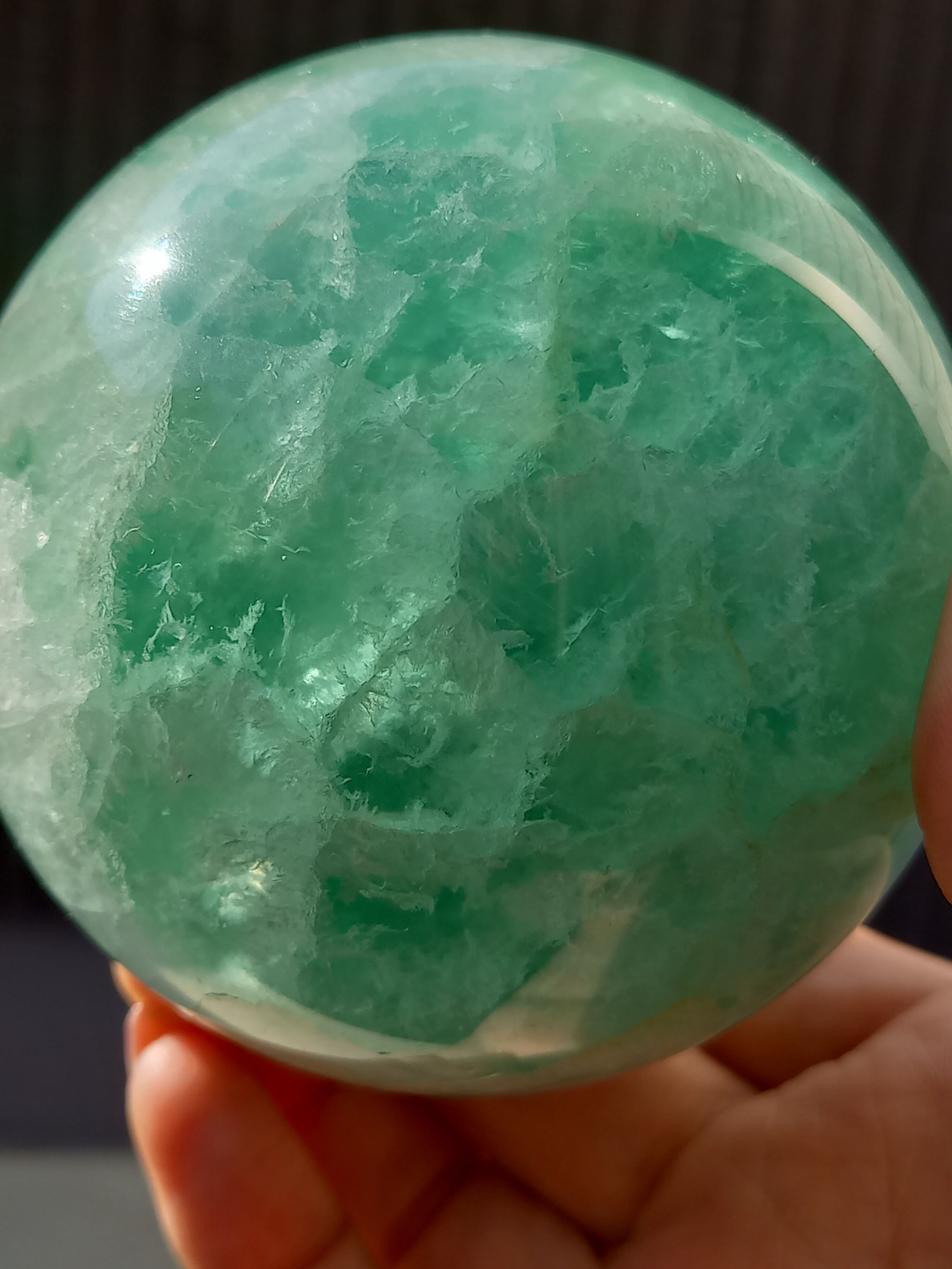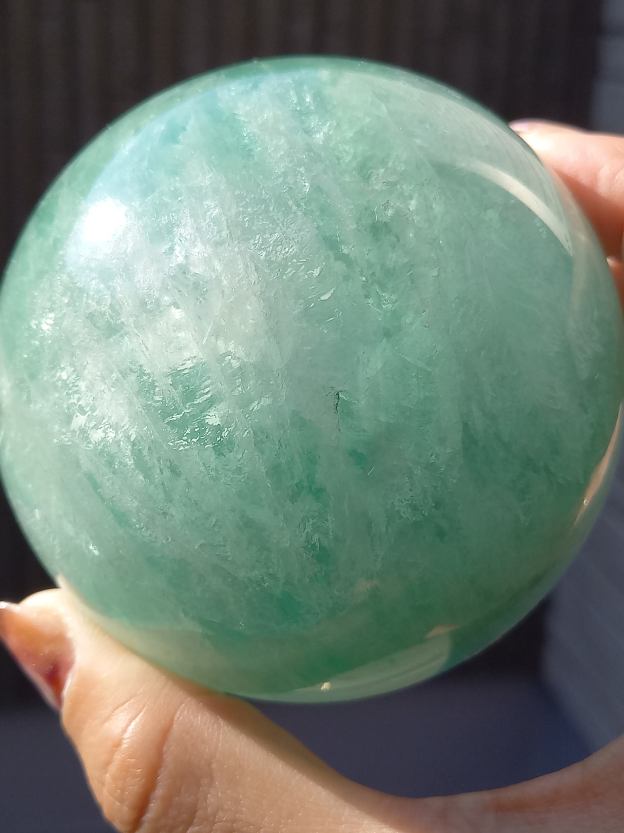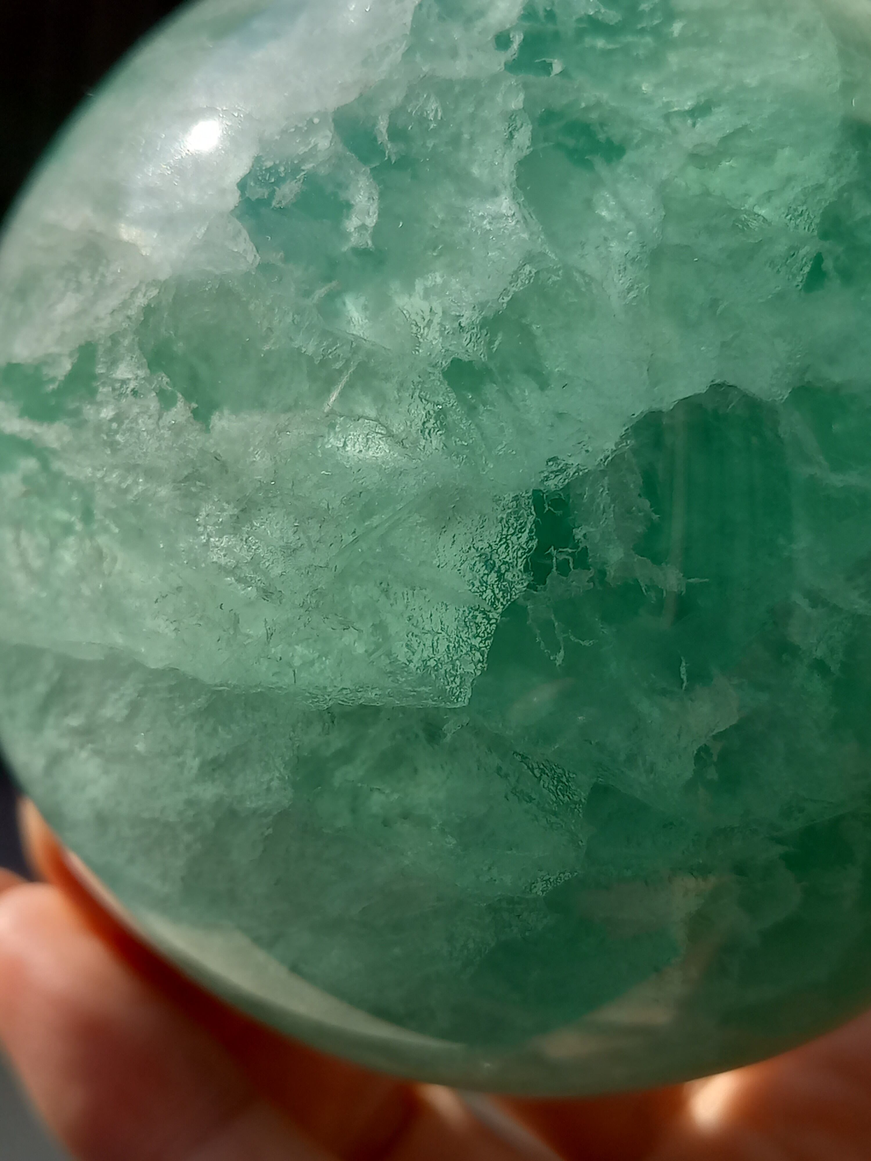 大きめスフィアに、フローライトは透明感があるので、中の層まで見えるので、ついつい見入ってしまいます。