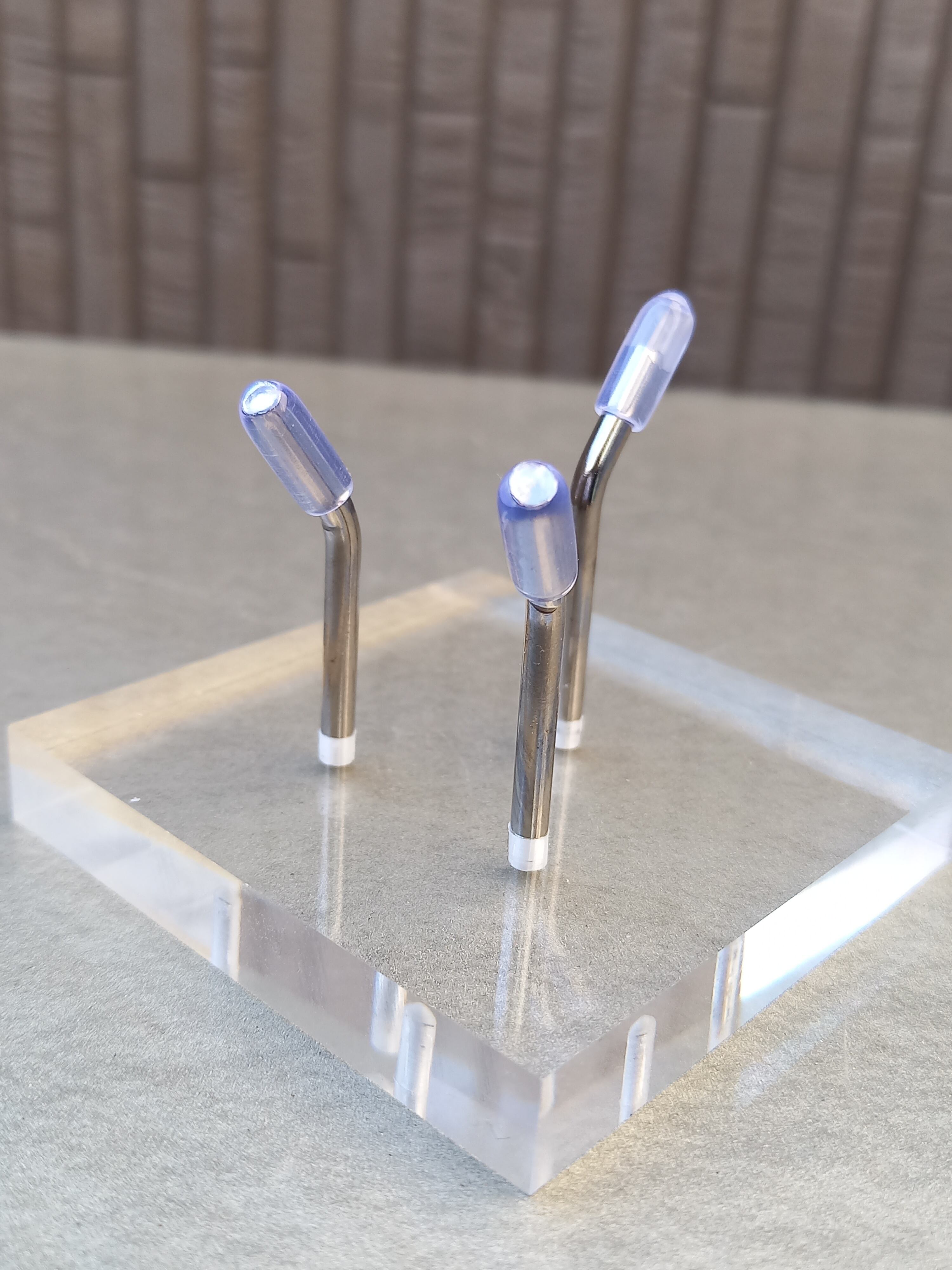 アクリル板に三本のパイプで、パイプの先にゴムも付いているので傷をつけずディスプレイ可能です。