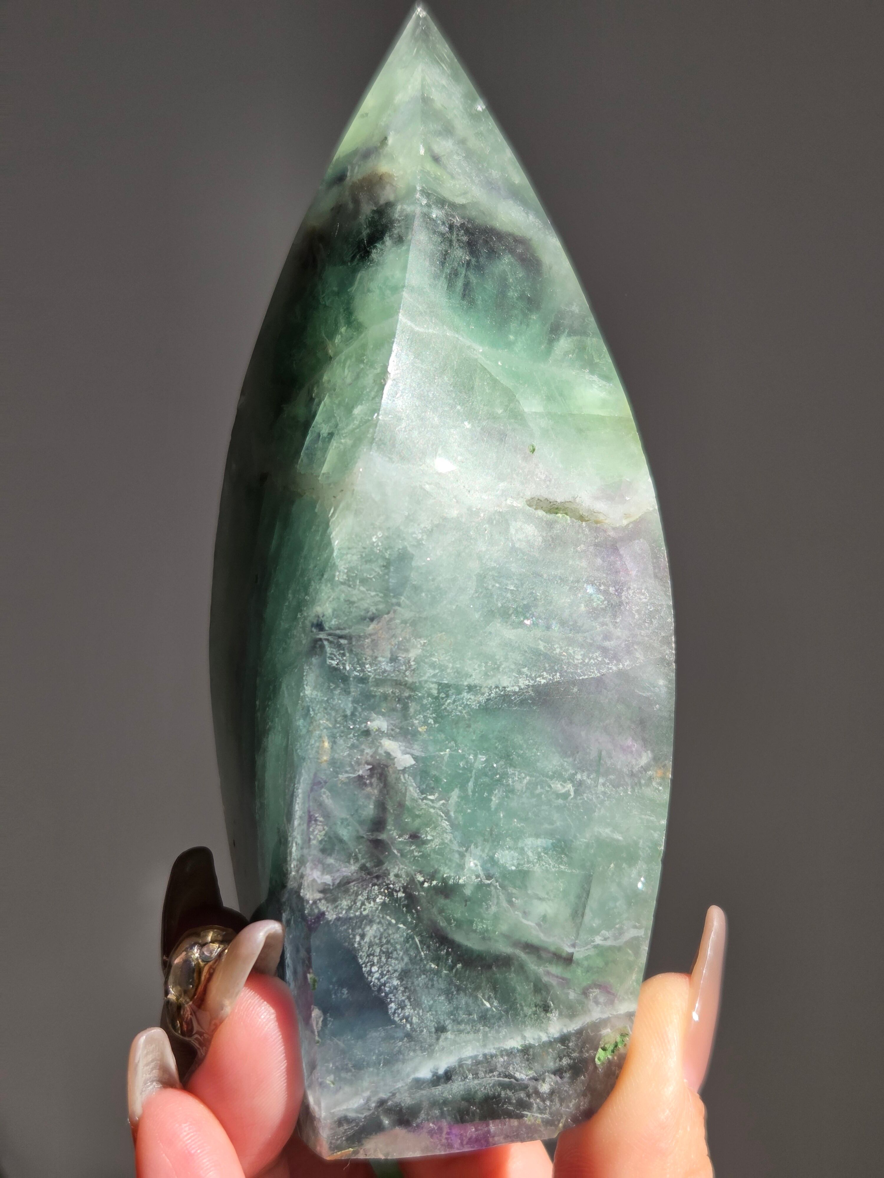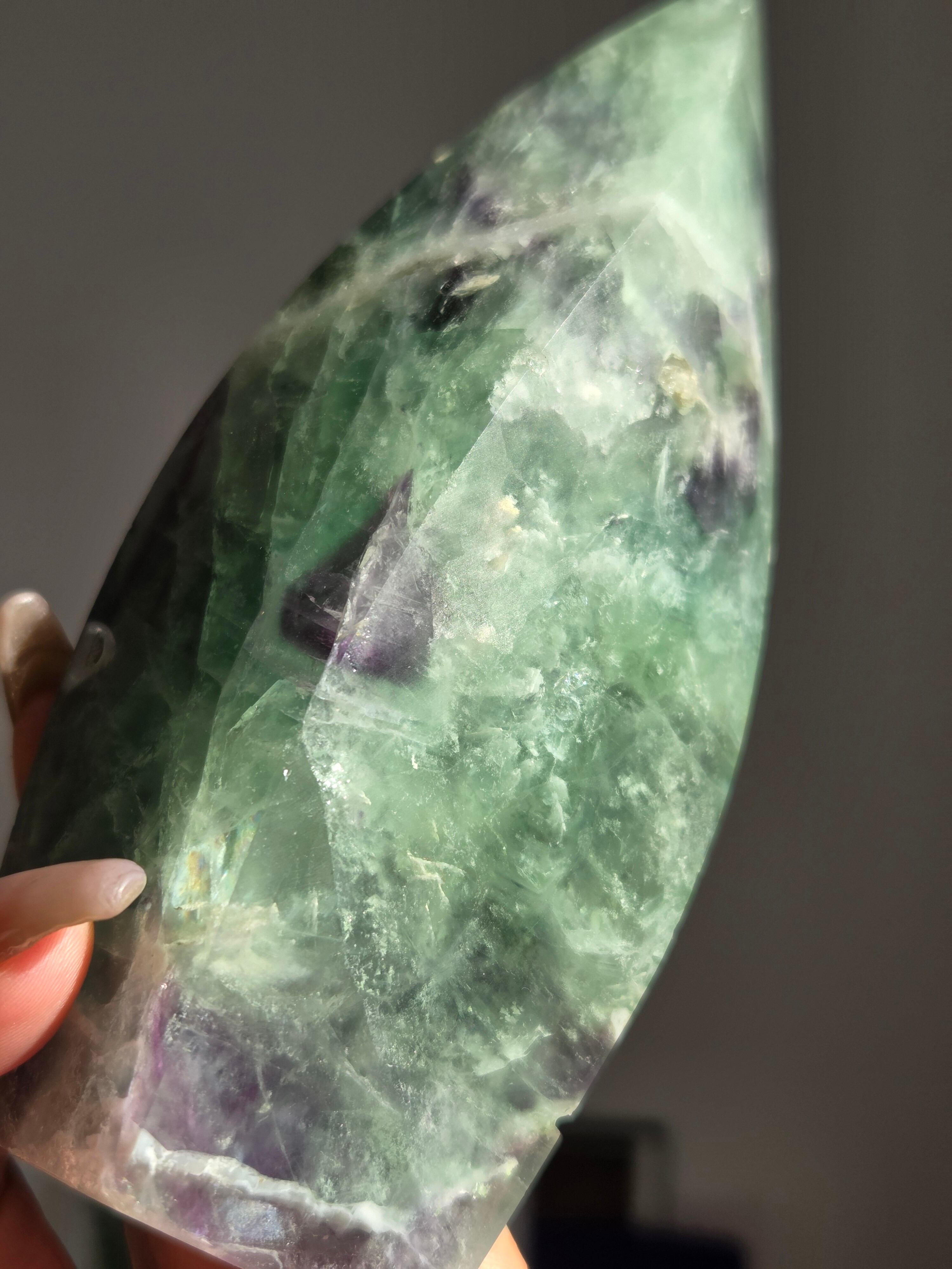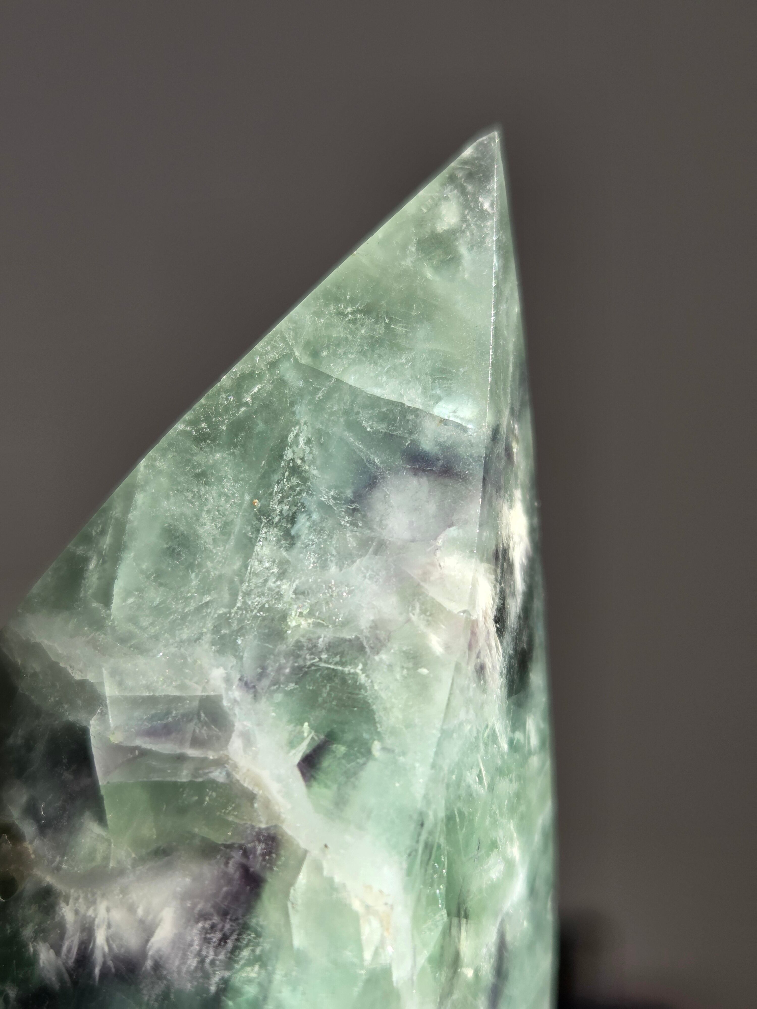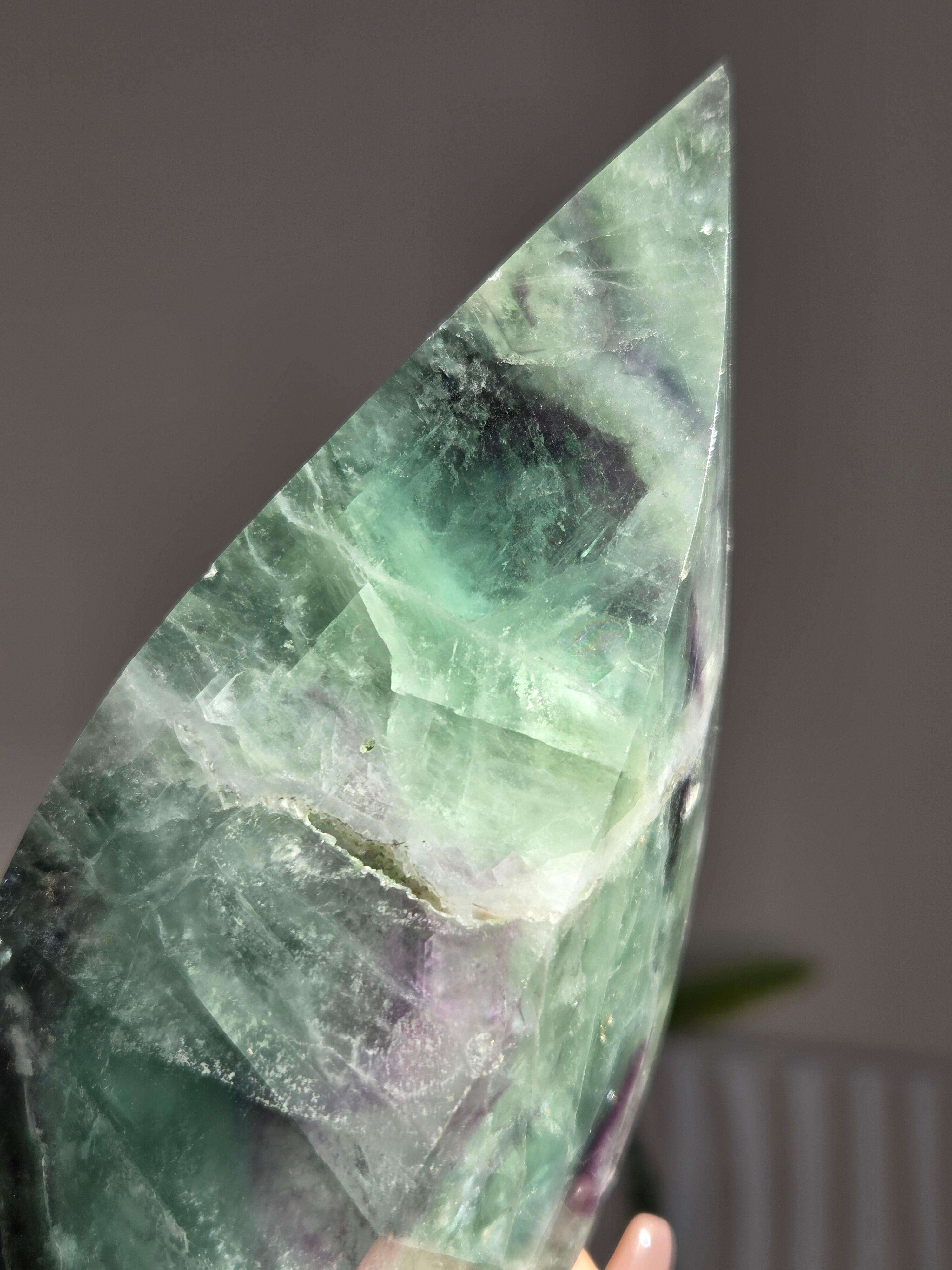 シュッとしたフォームに、綺麗なグリーンとパープルとホワイトで層がとても綺麗なフローライトオブジェ。
