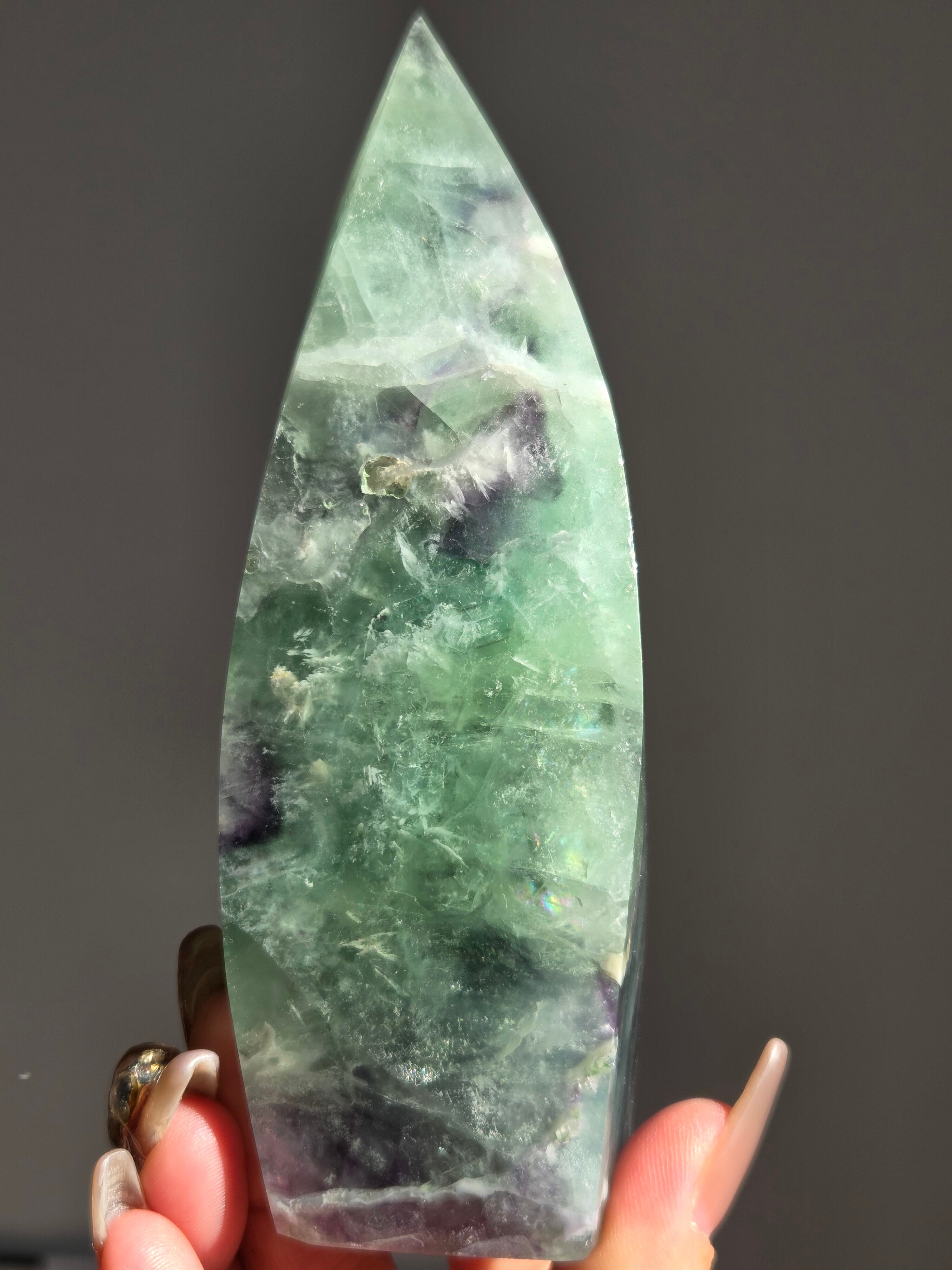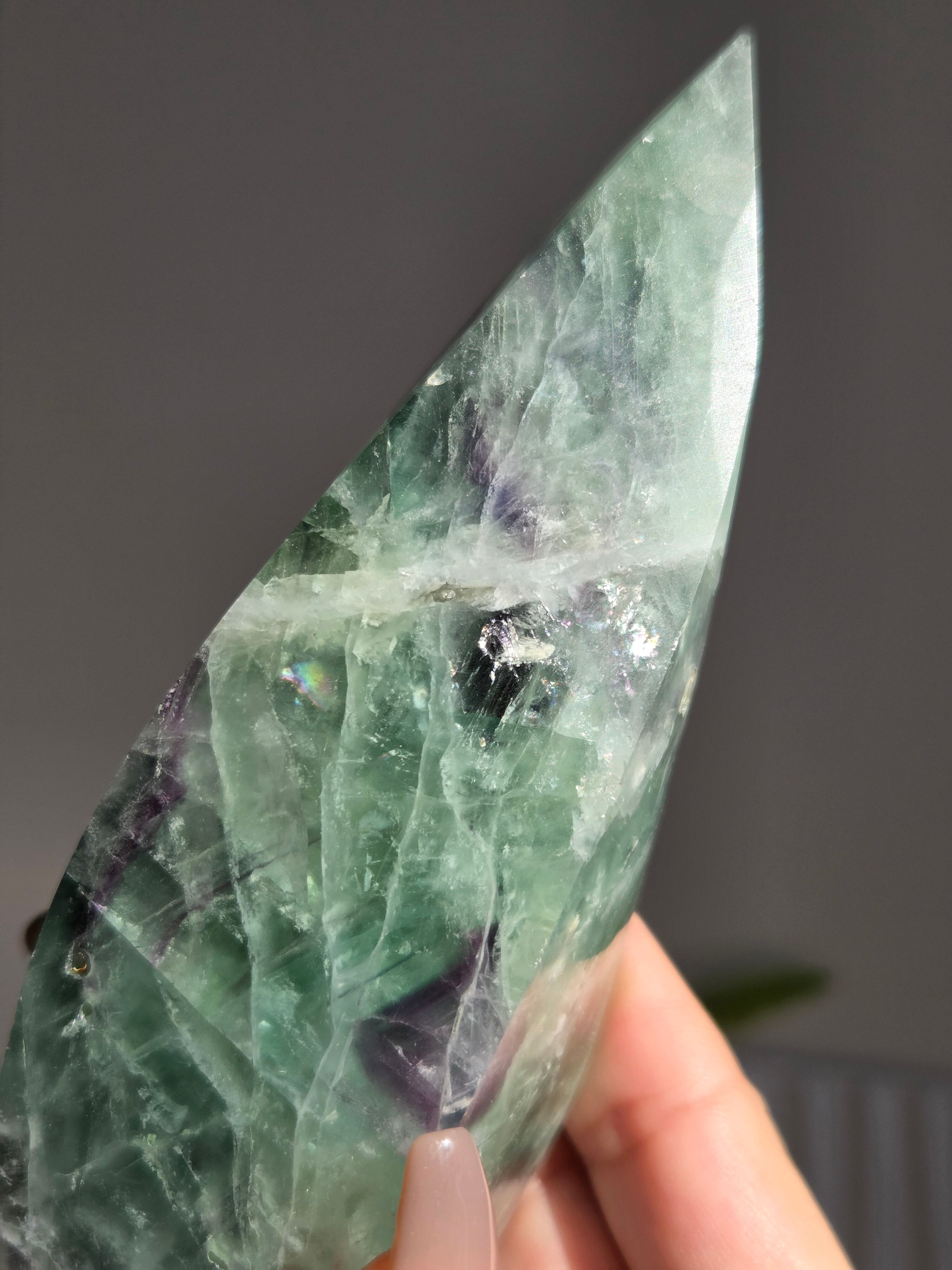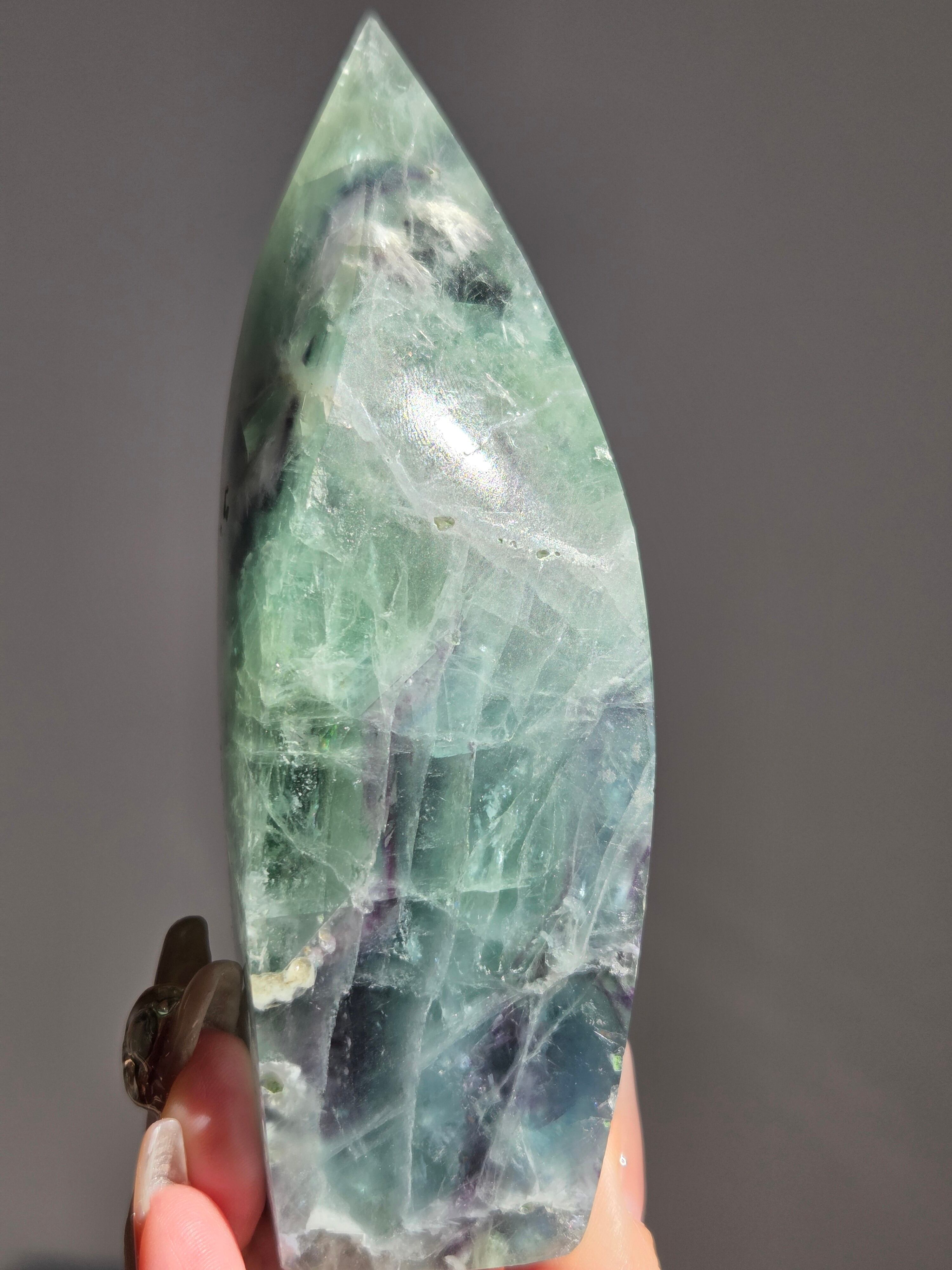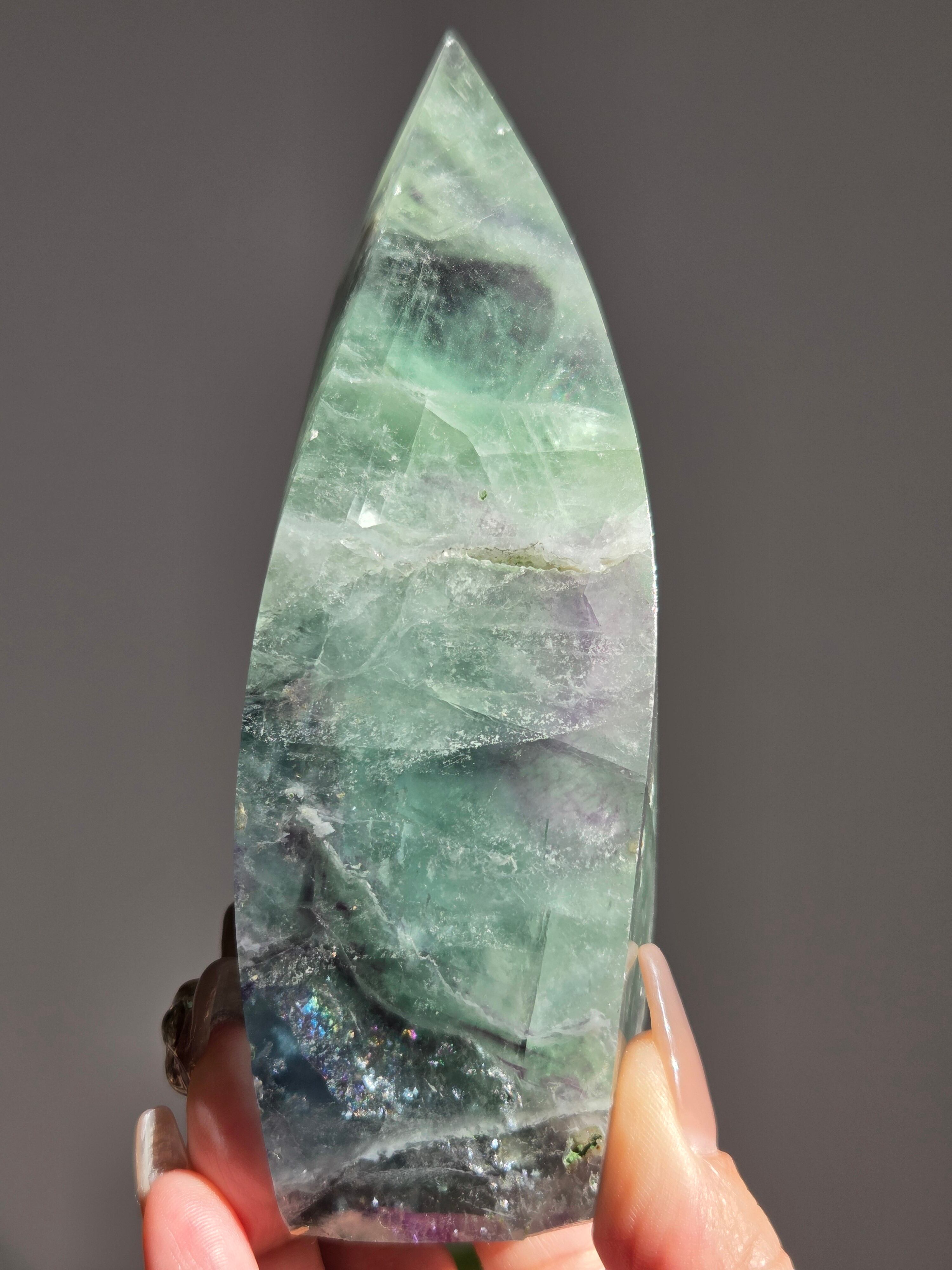 シュッとしたフォームに、綺麗なグリーンとパープルとホワイトで層がとても綺麗なフローライトオブジェ。