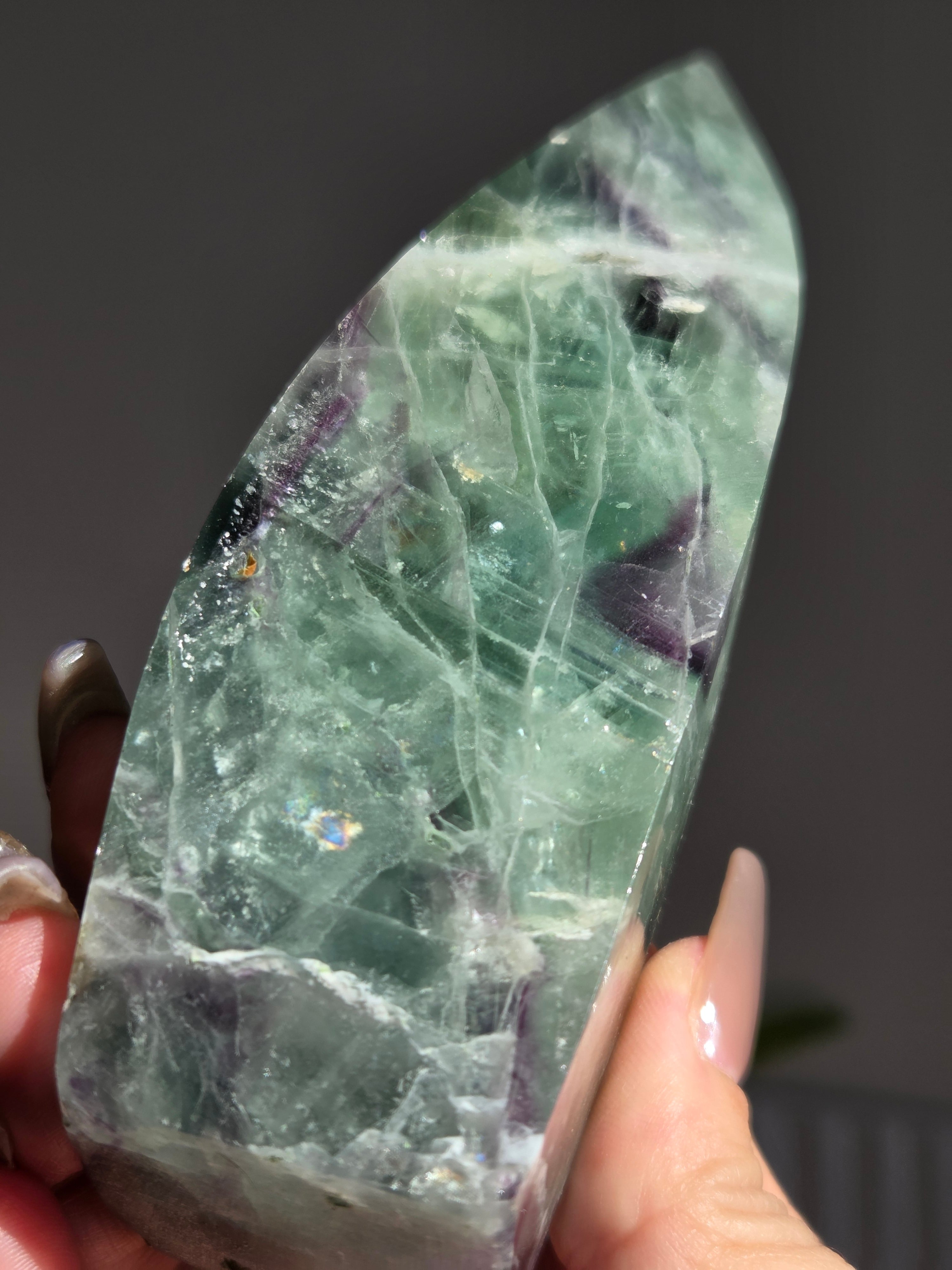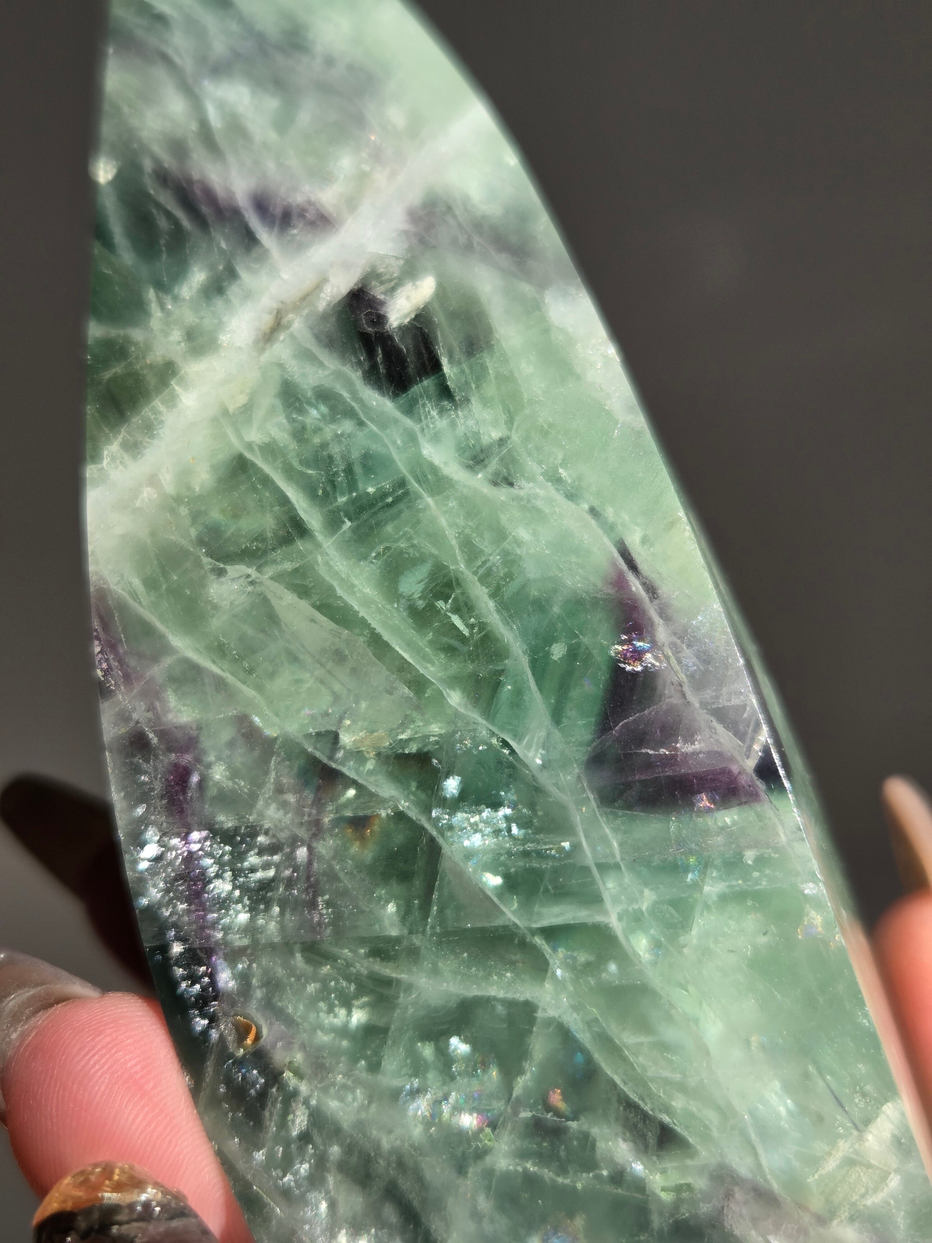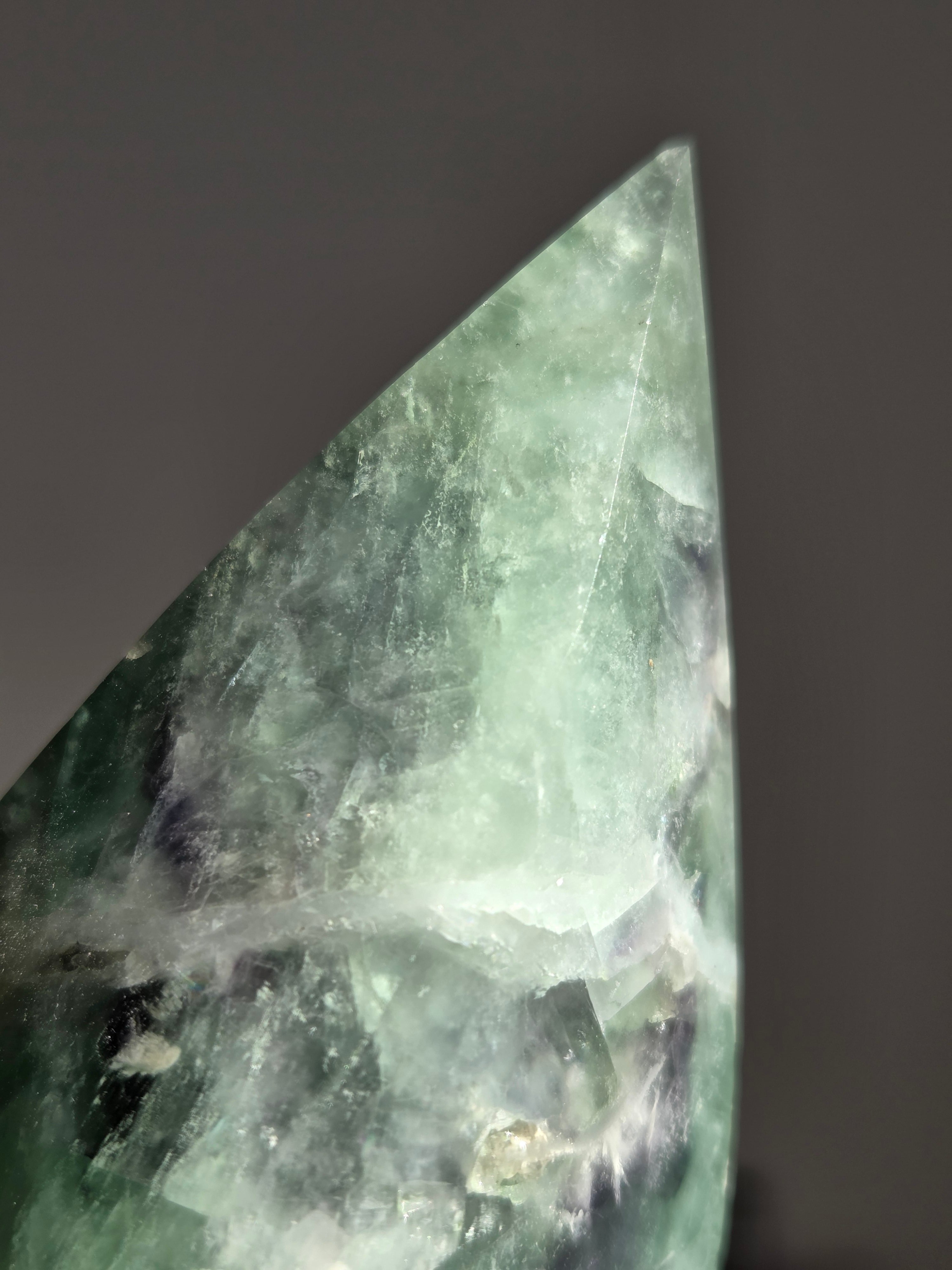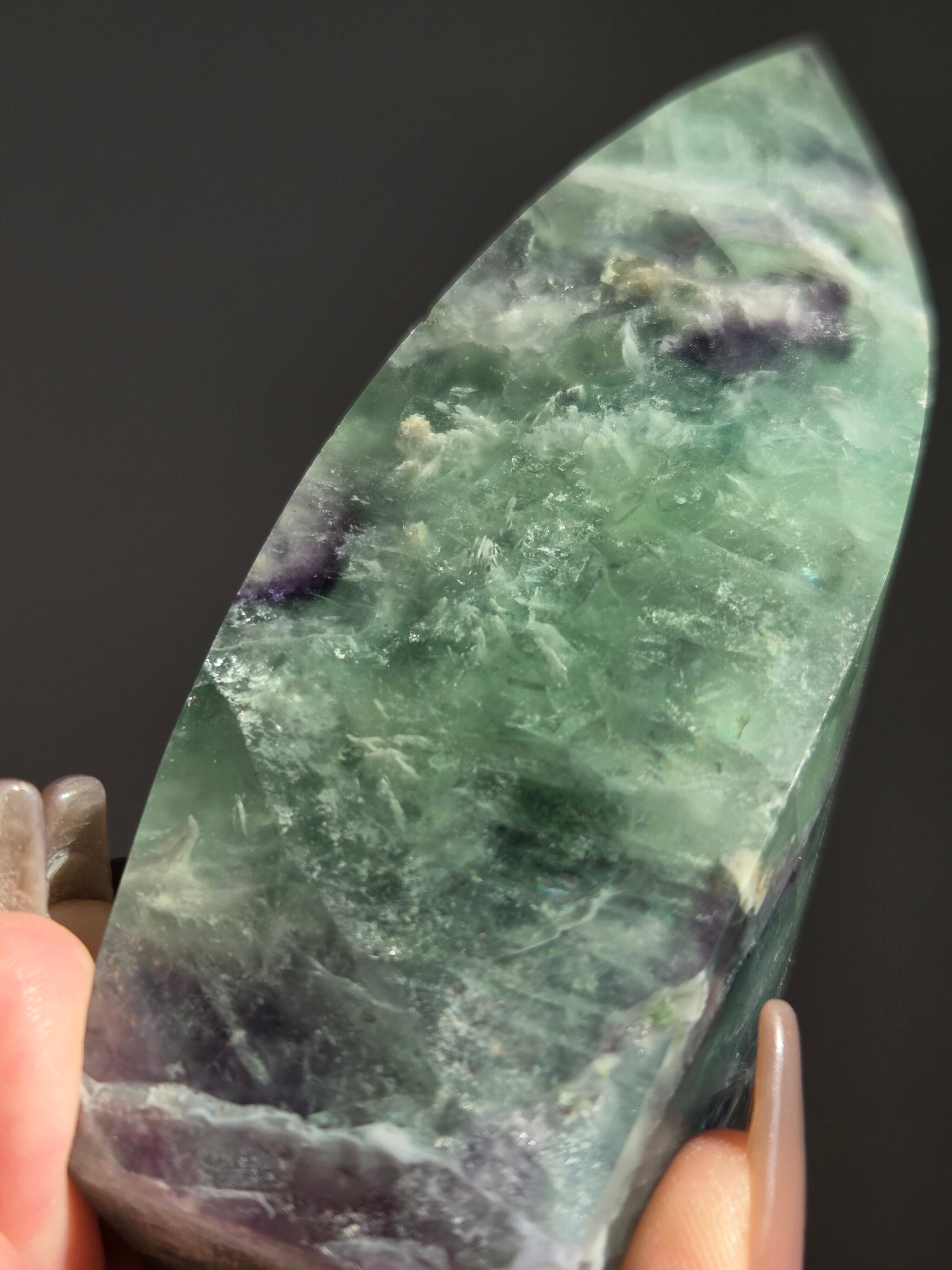 シュッとしたフォームに、綺麗なグリーンとパープルとホワイトで層がとても綺麗なフローライトオブジェ。