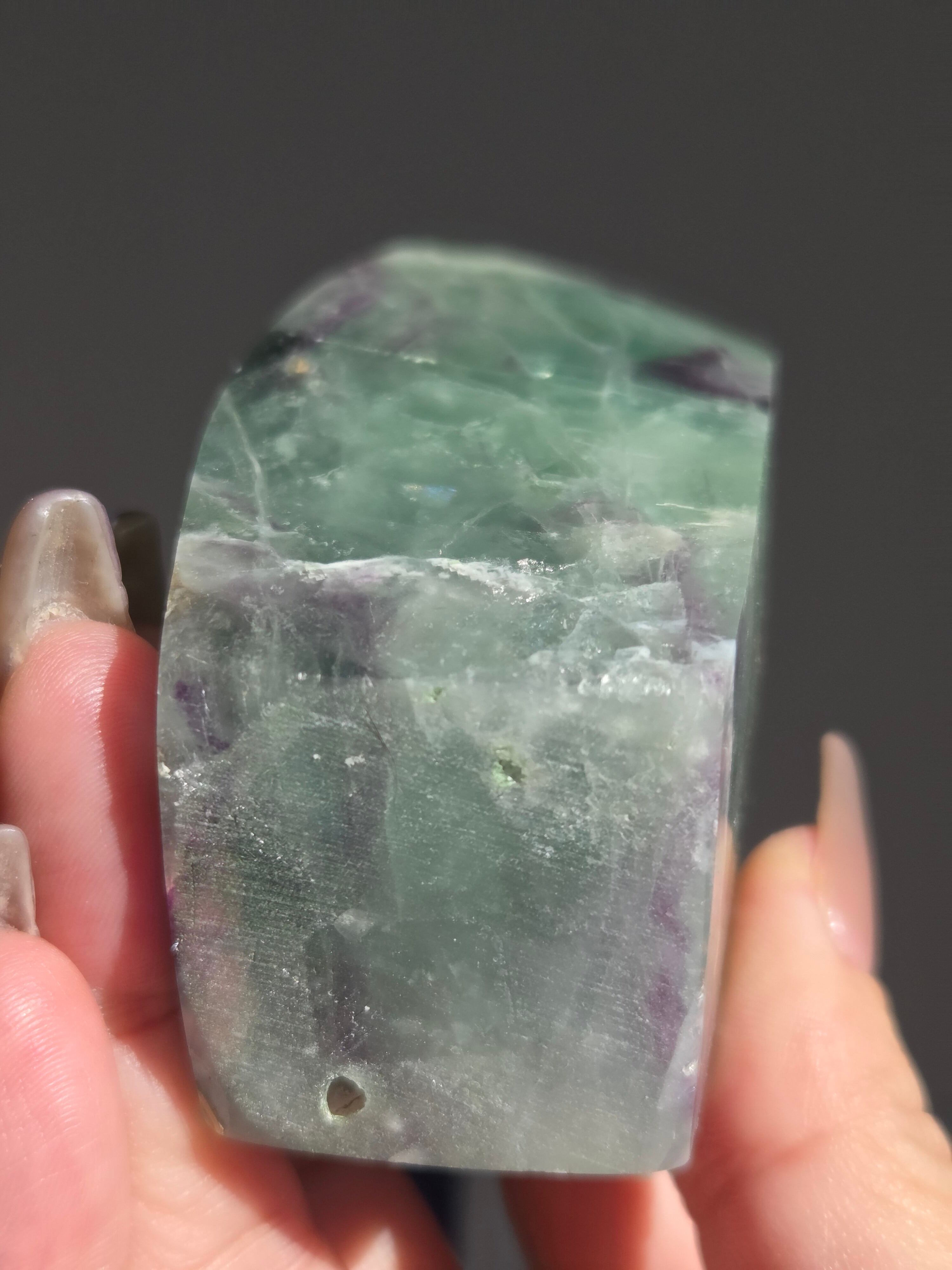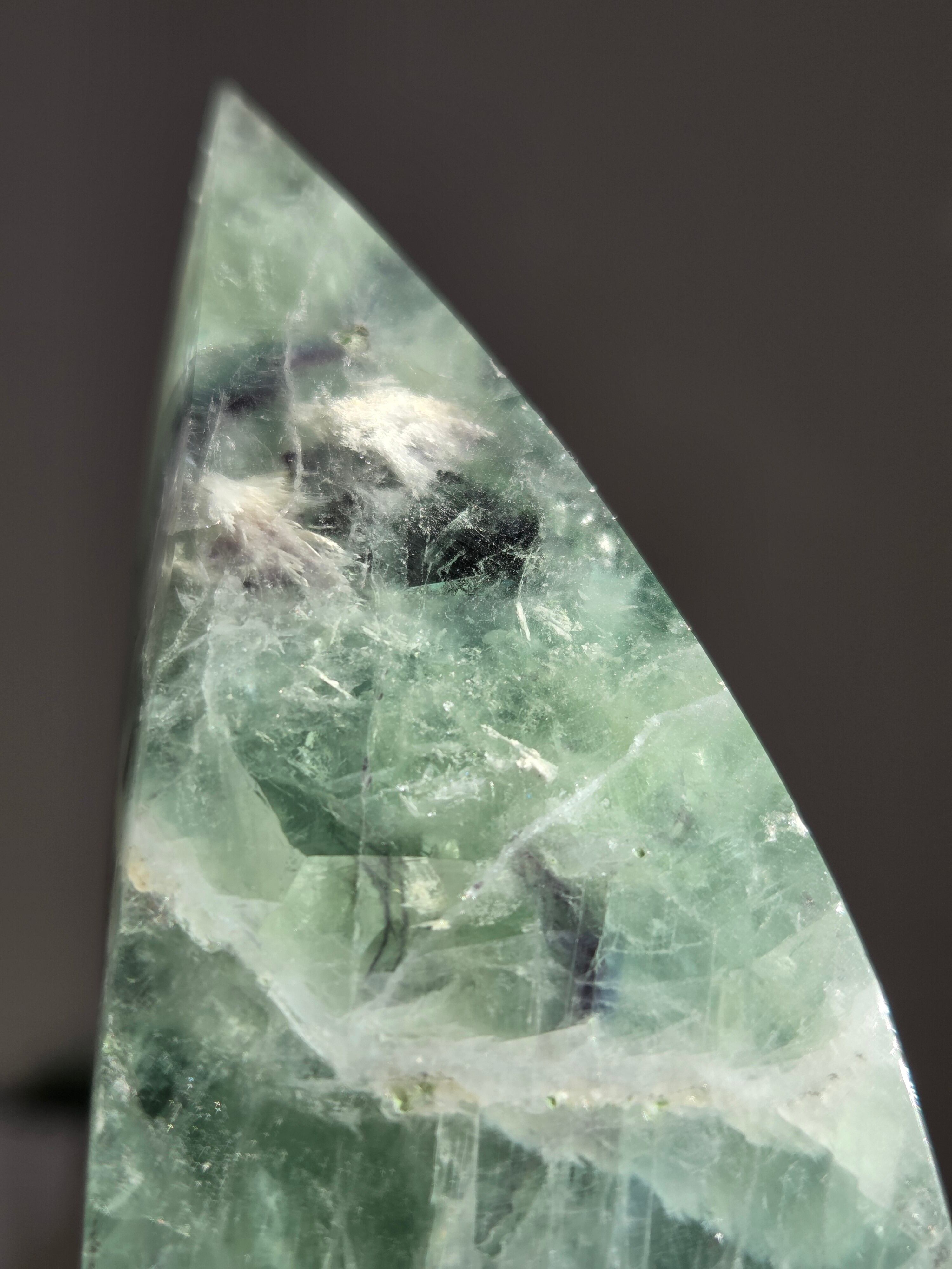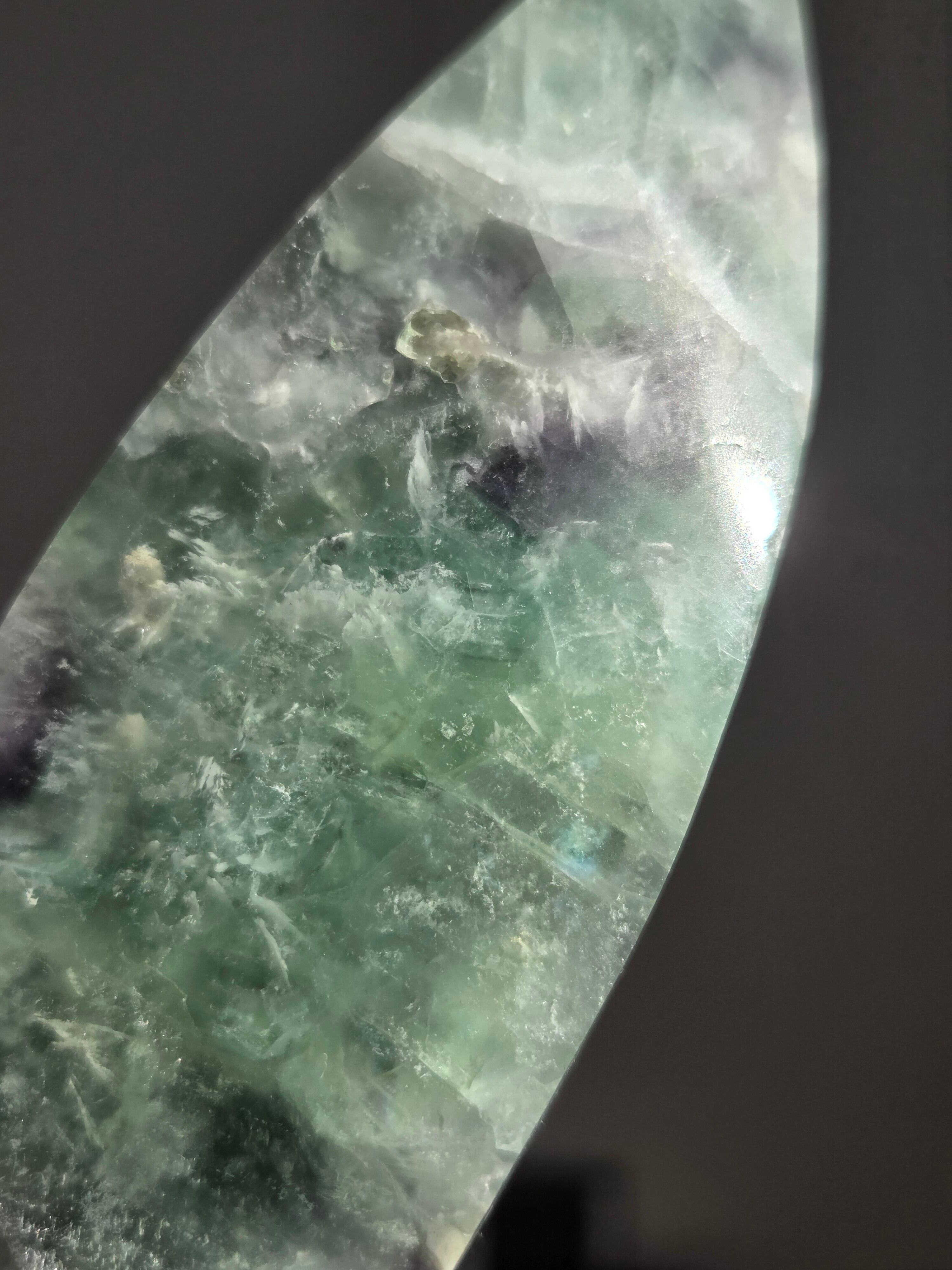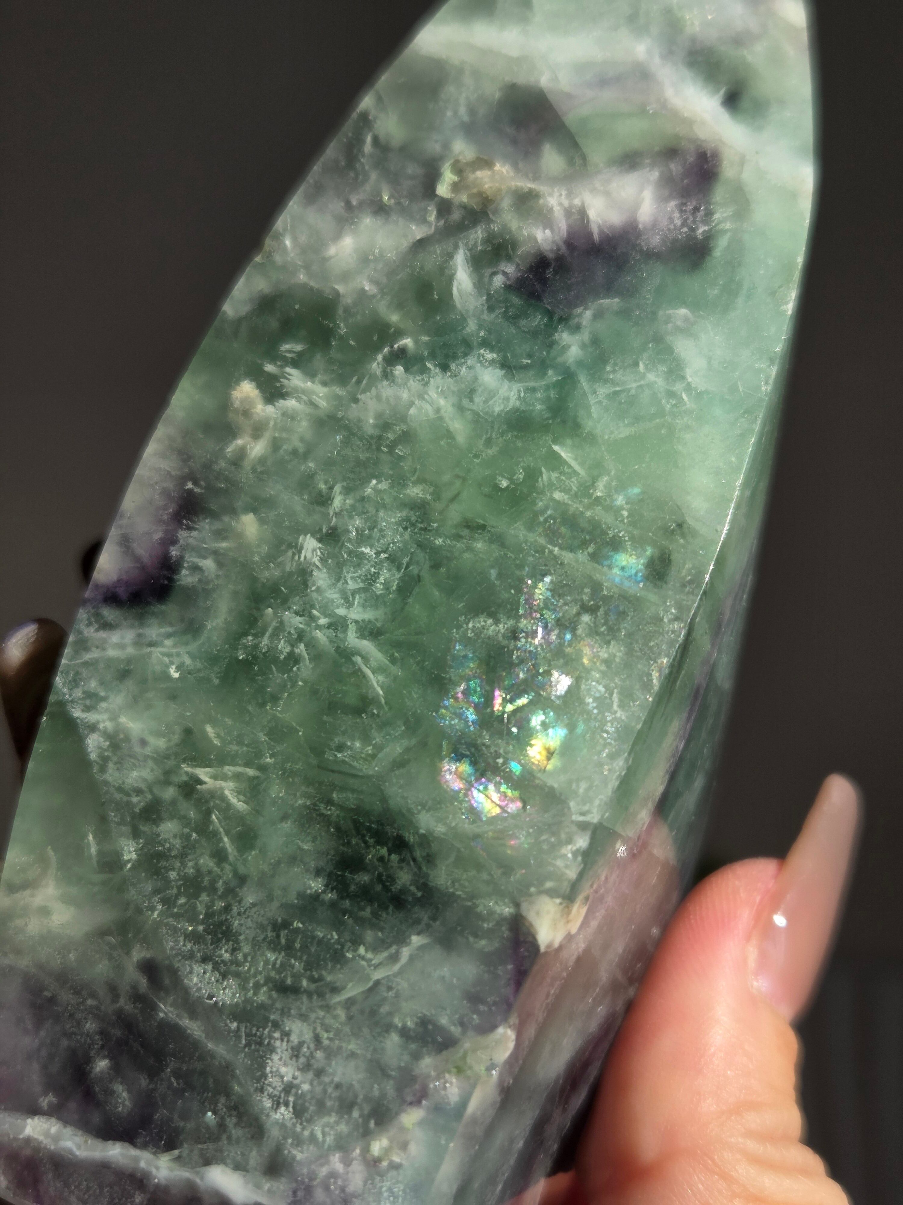 シュッとしたフォームに、綺麗なグリーンとパープルとホワイトで層がとても綺麗なフローライトオブジェ。