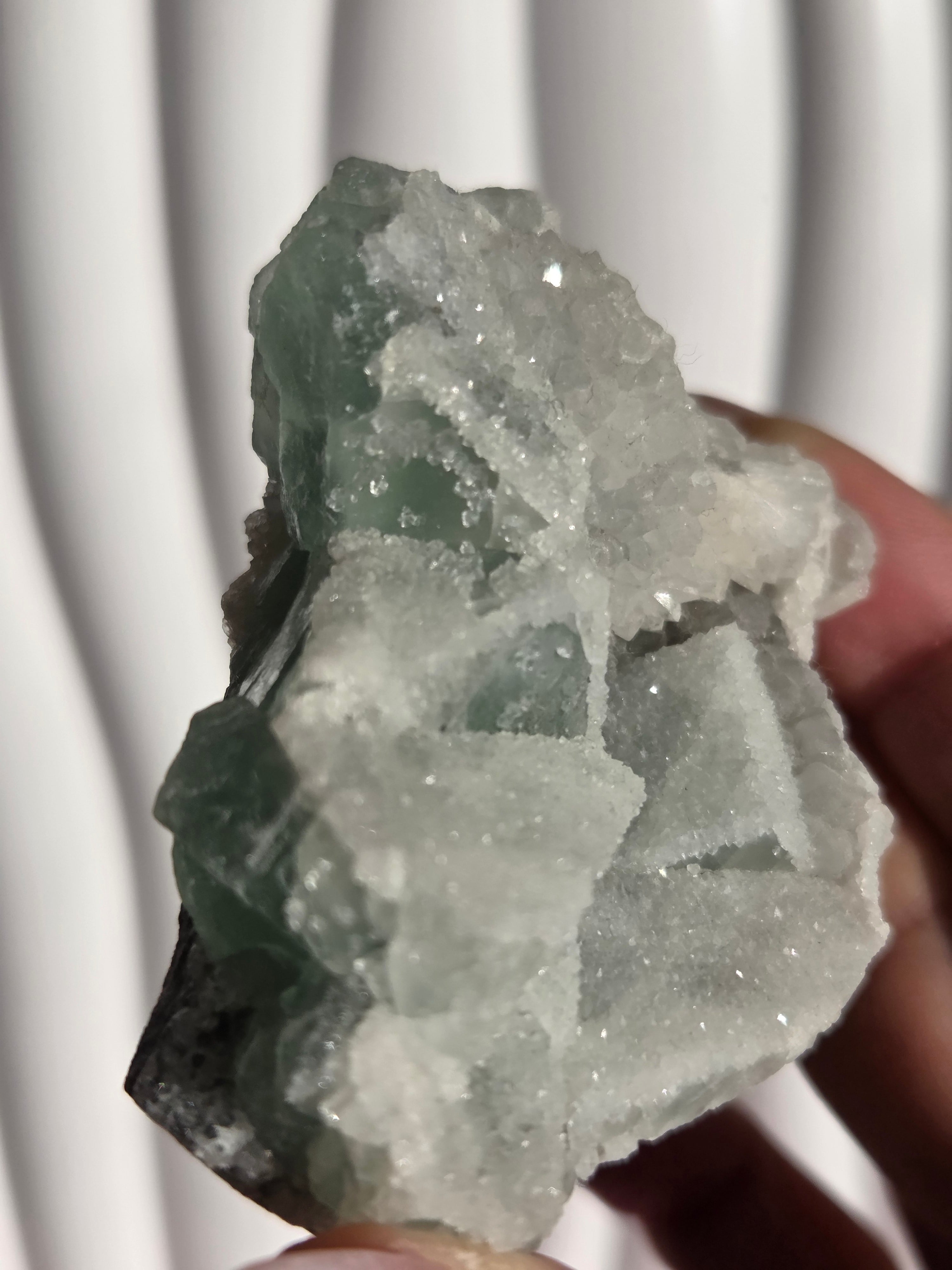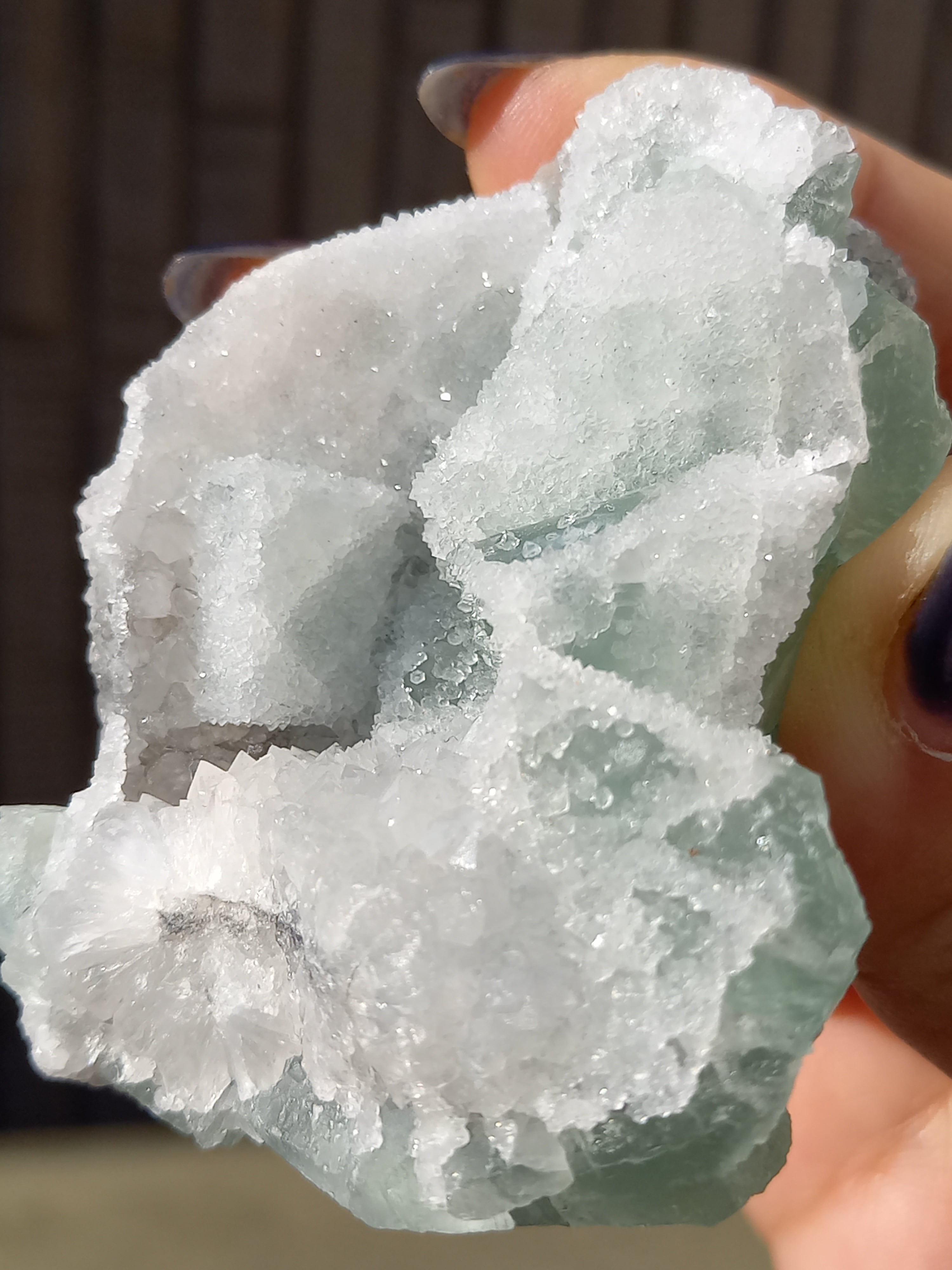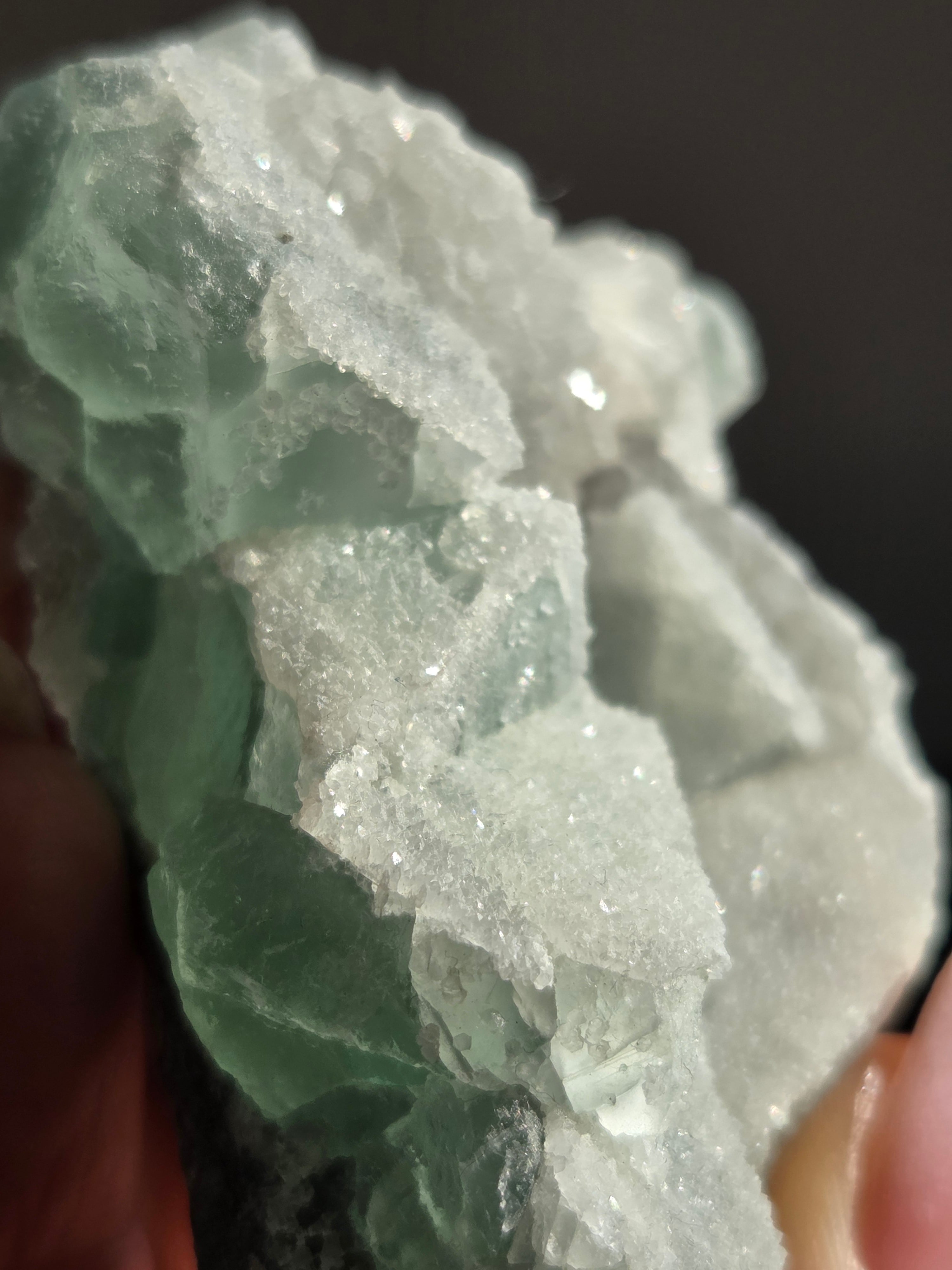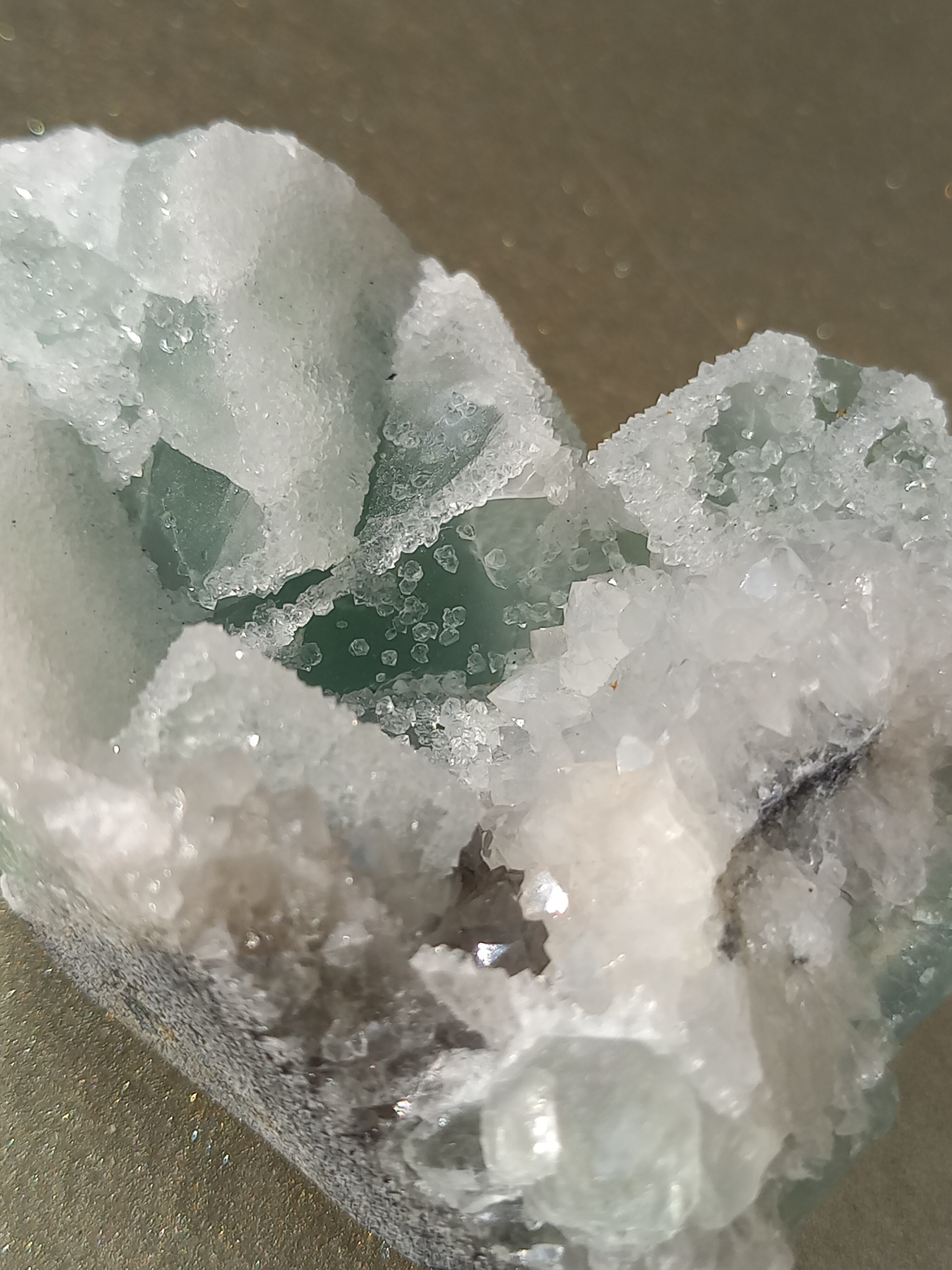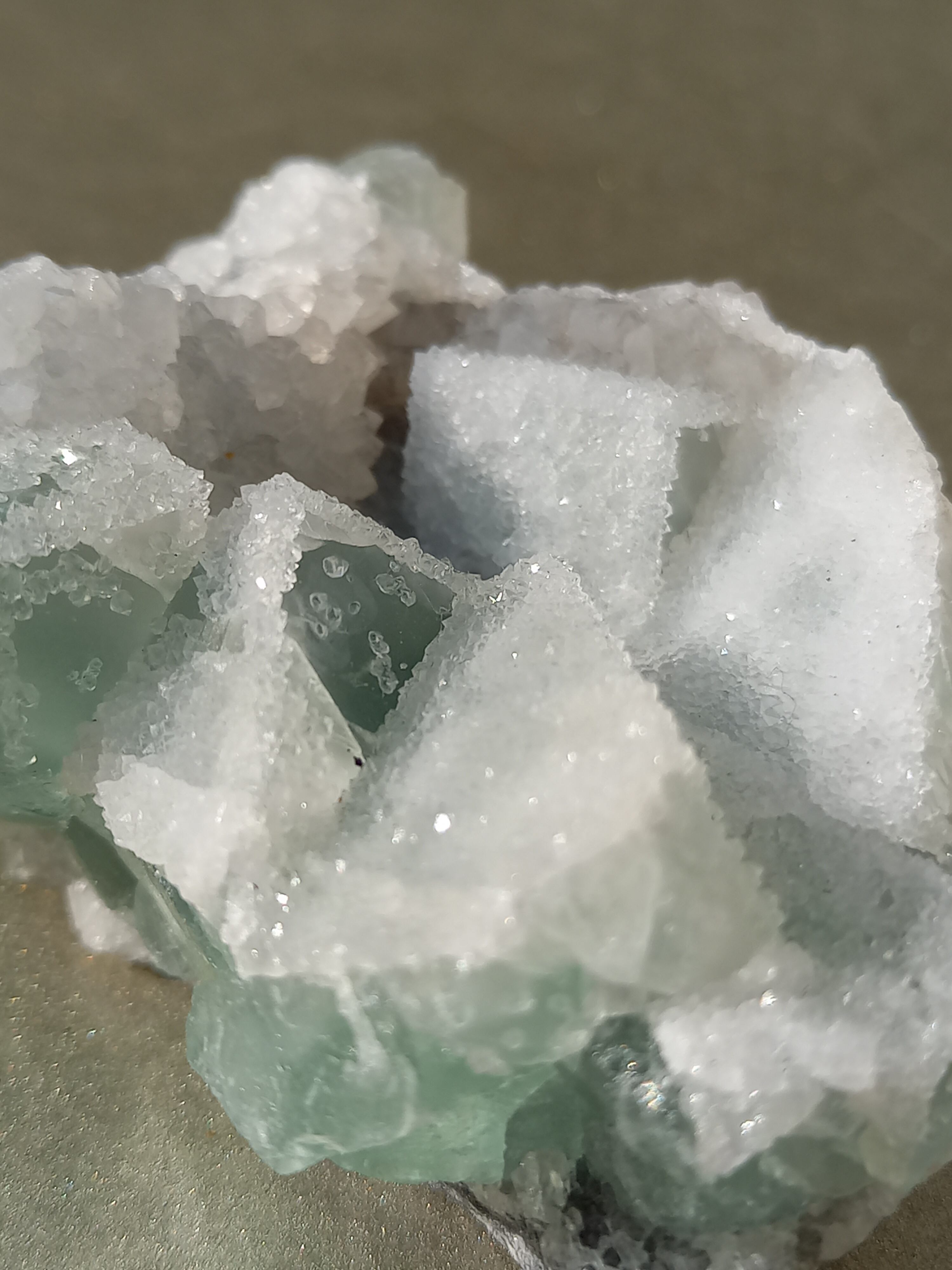 グリーンフローライトの上に雪が積もったように結晶が付いており、上から見ても横から見ても、とても可愛い色味です。