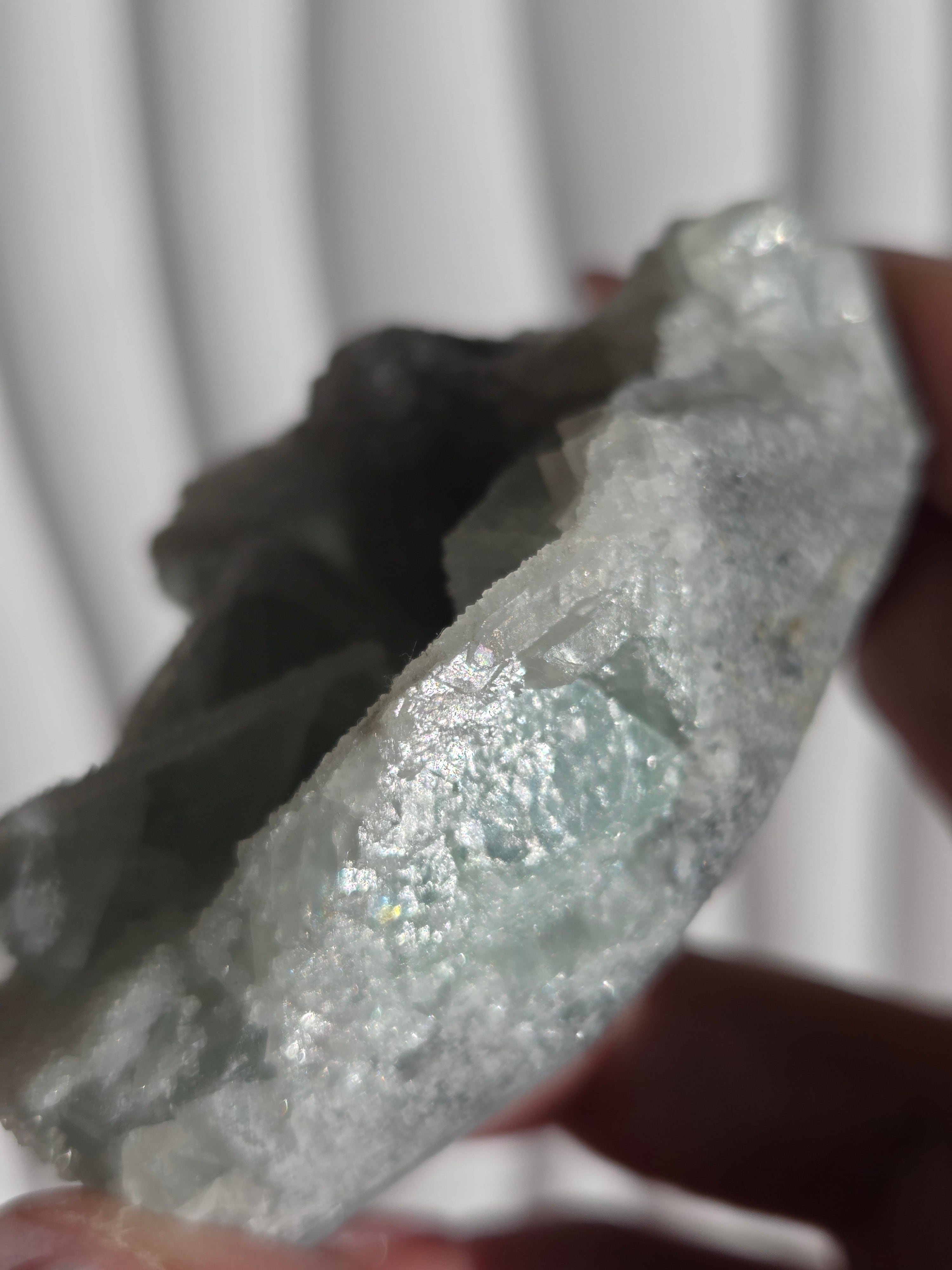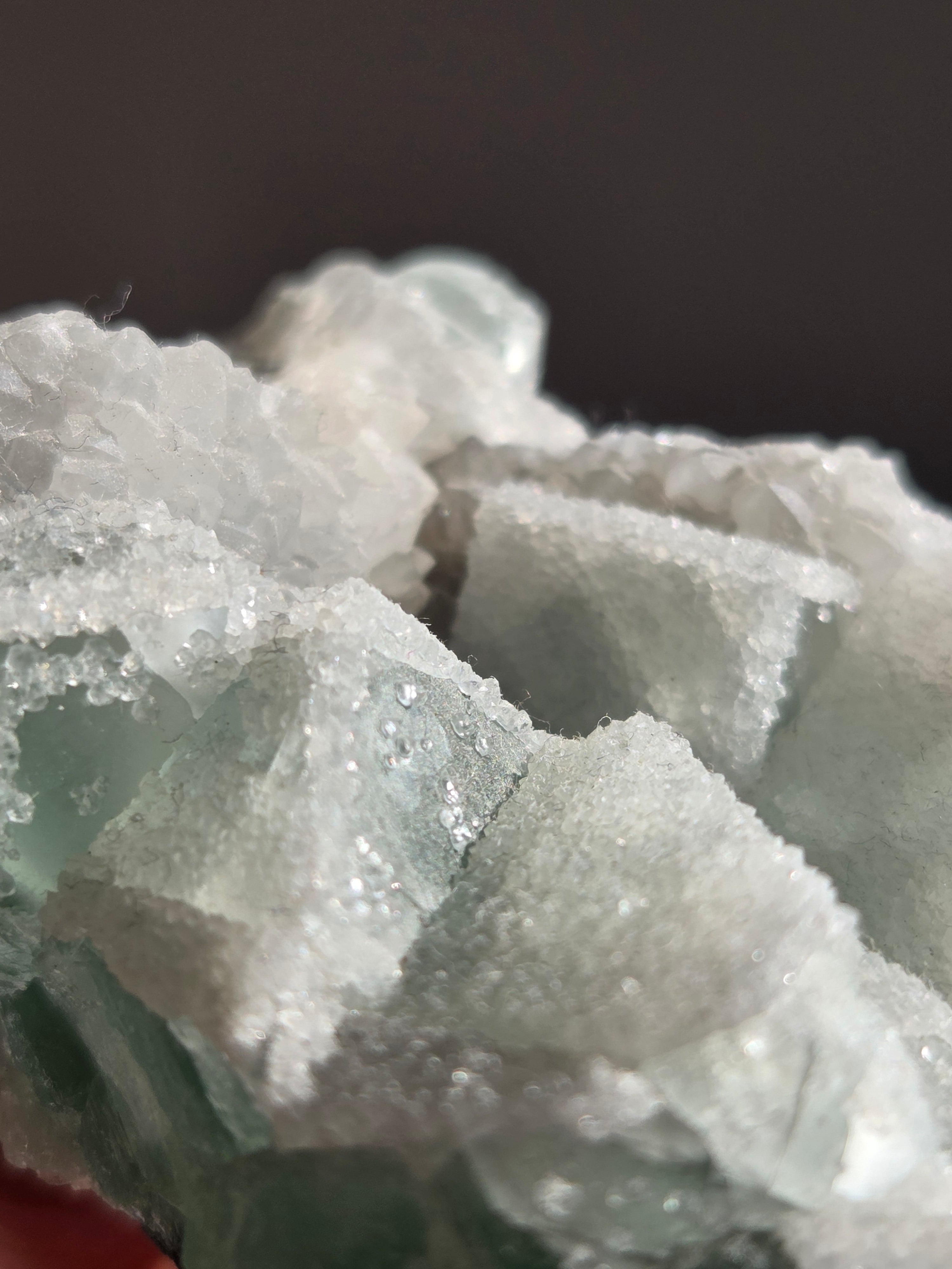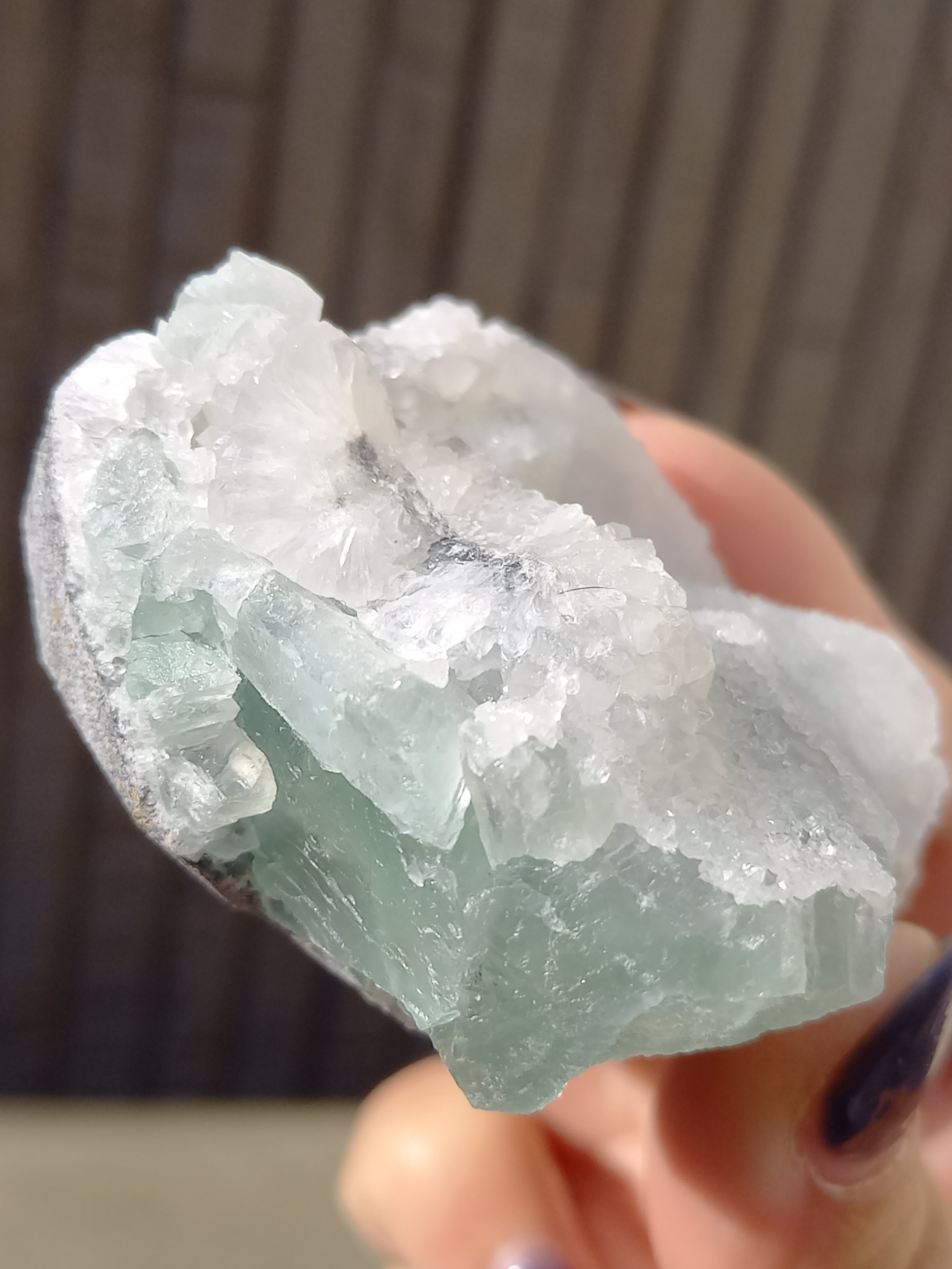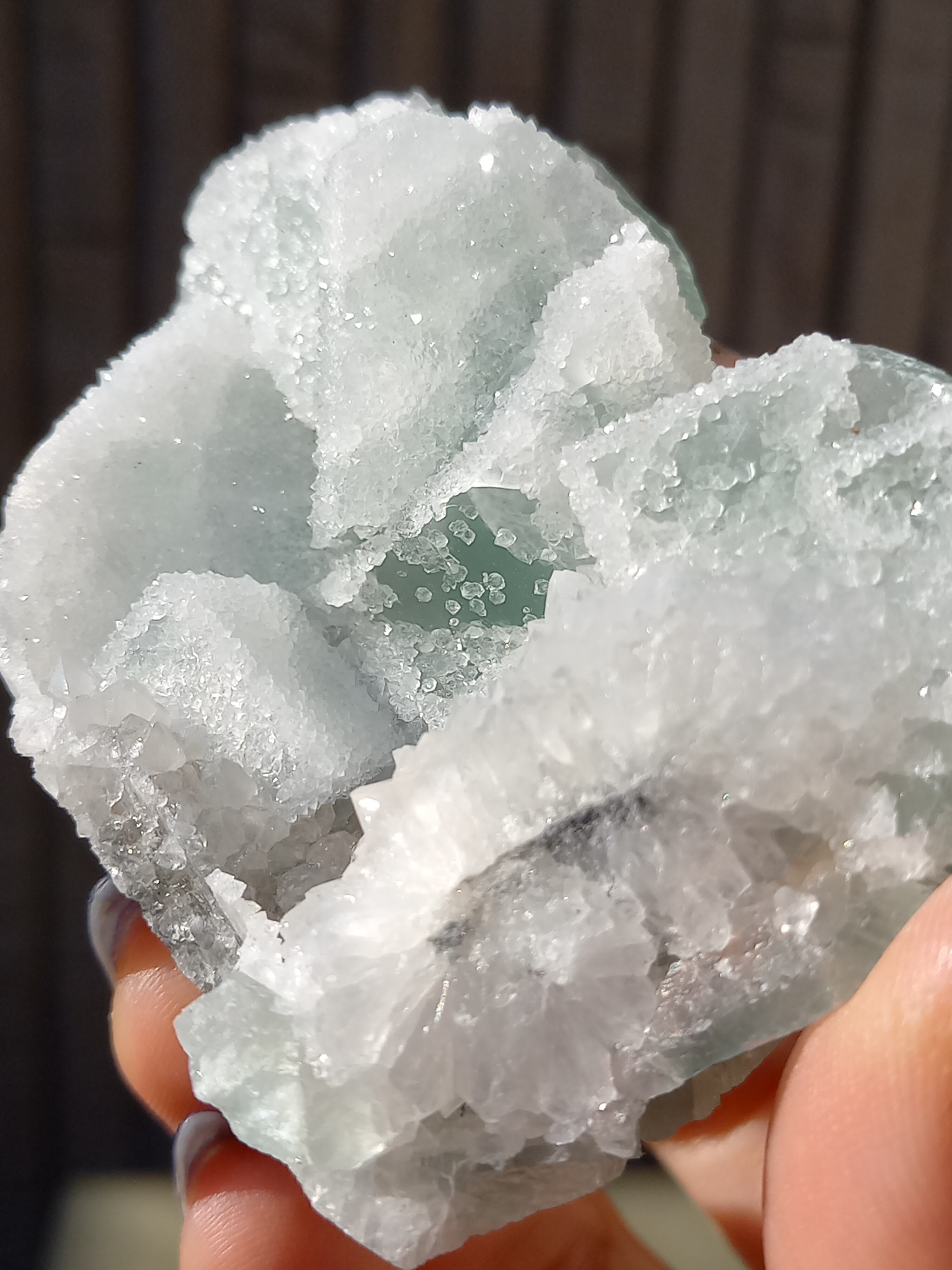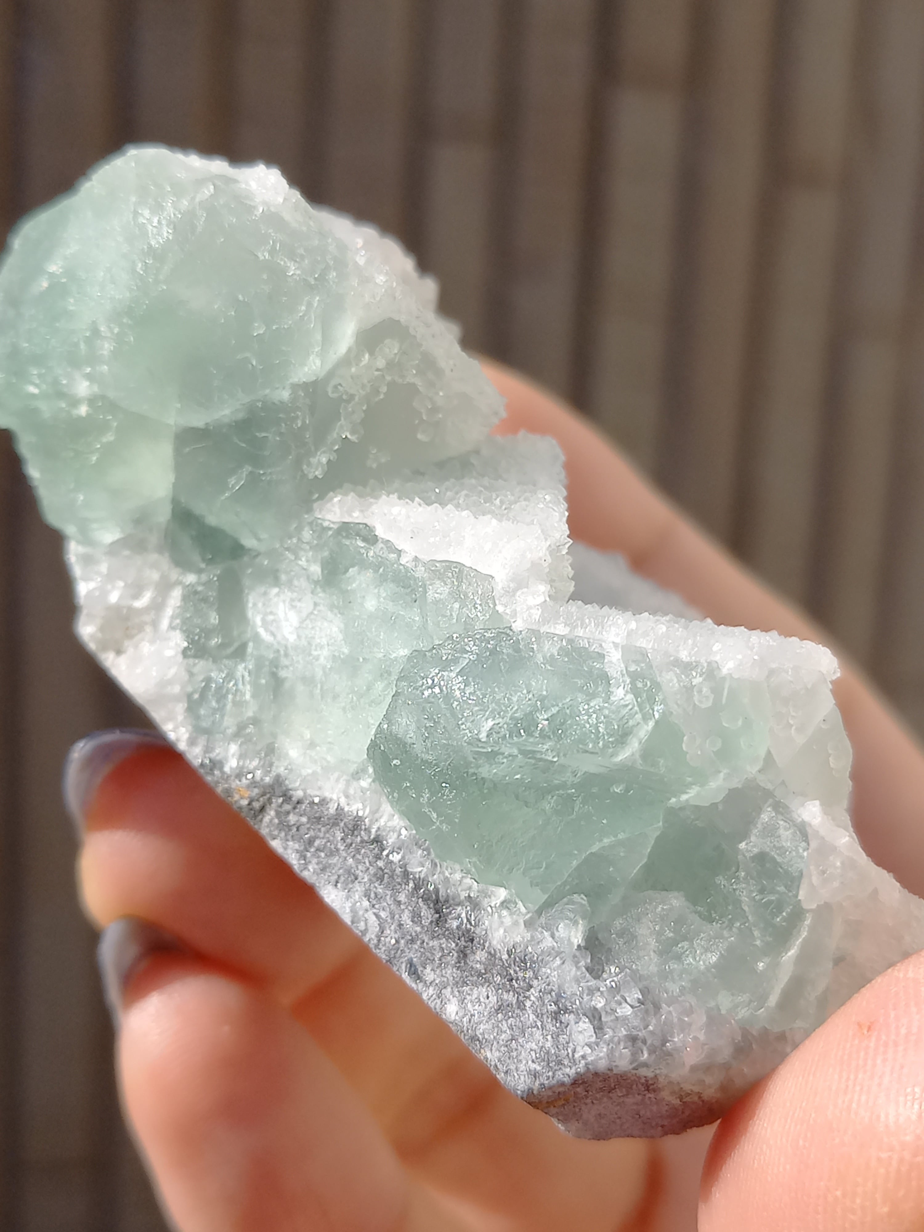 グリーンフローライトの上に雪が積もったように結晶が付いており、上から見ても横から見ても、とても可愛い色味です。