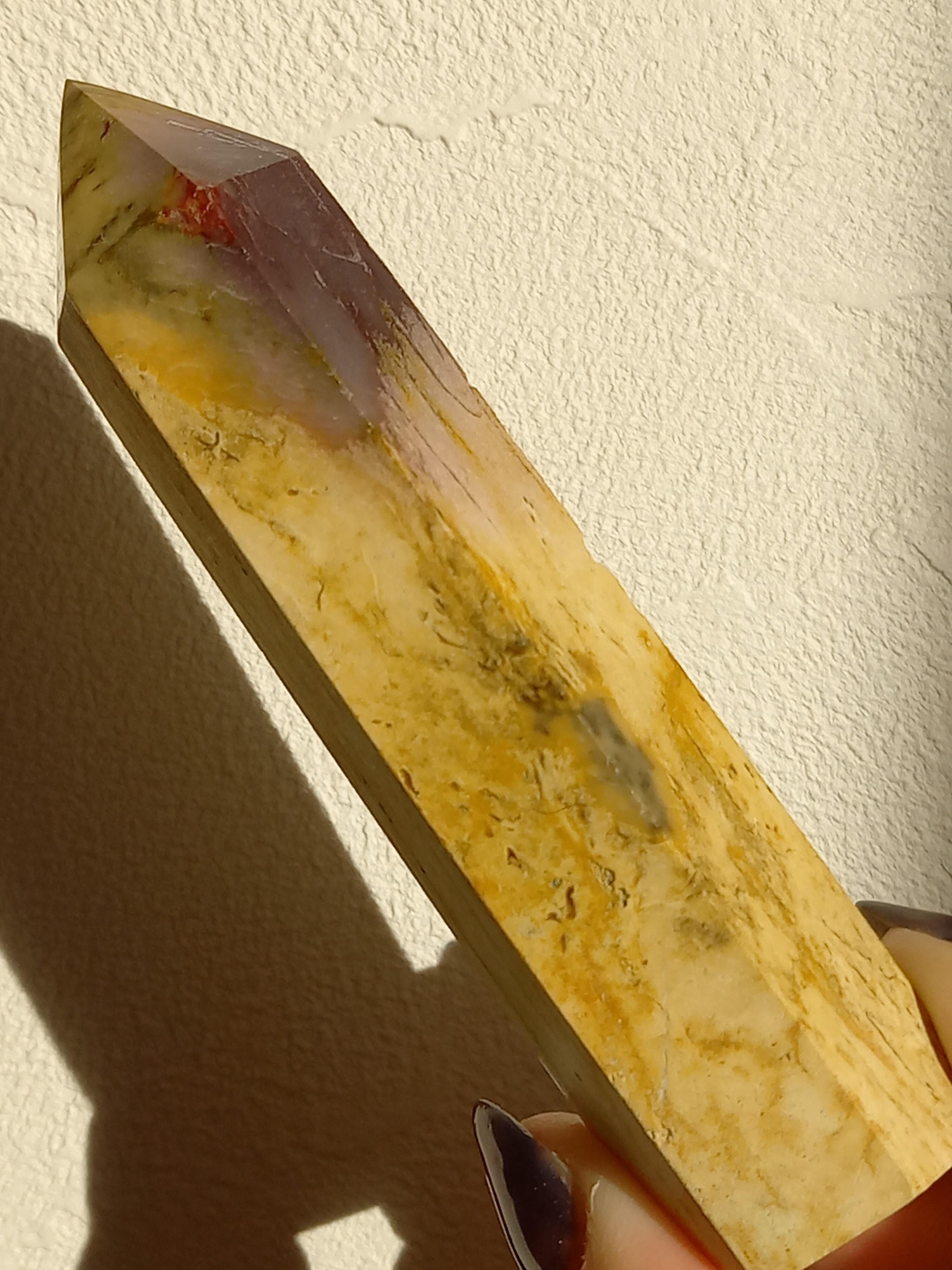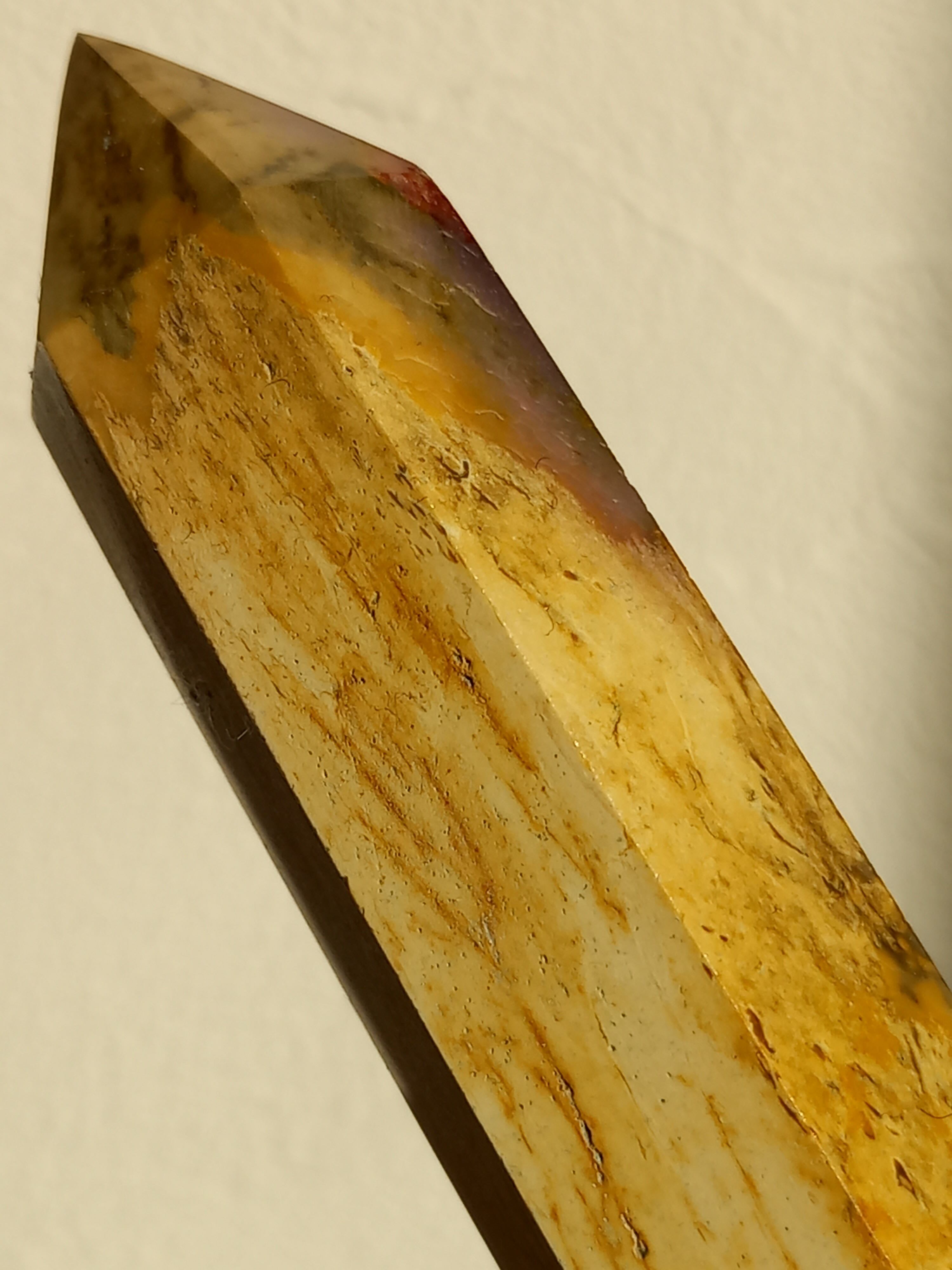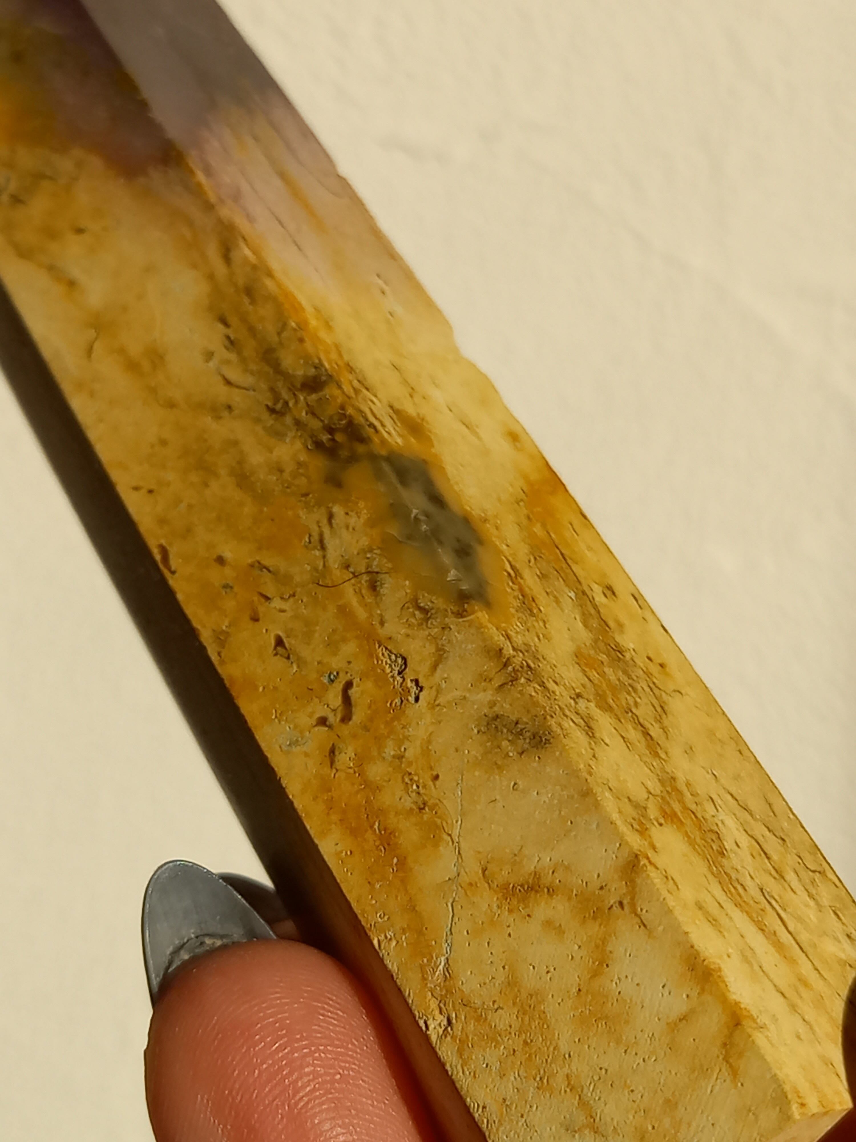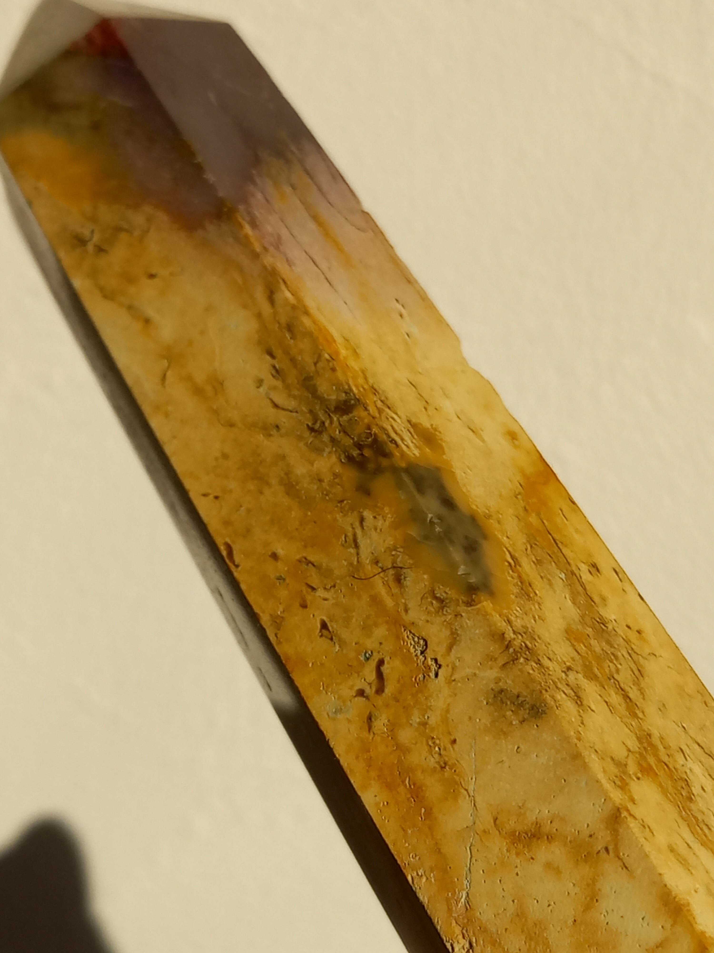 カラシ色に、イエロー、パープル、ホワイトと色味が入り、まるでキャンパスにアートを描かれたような、そんな雰囲気のある子です。