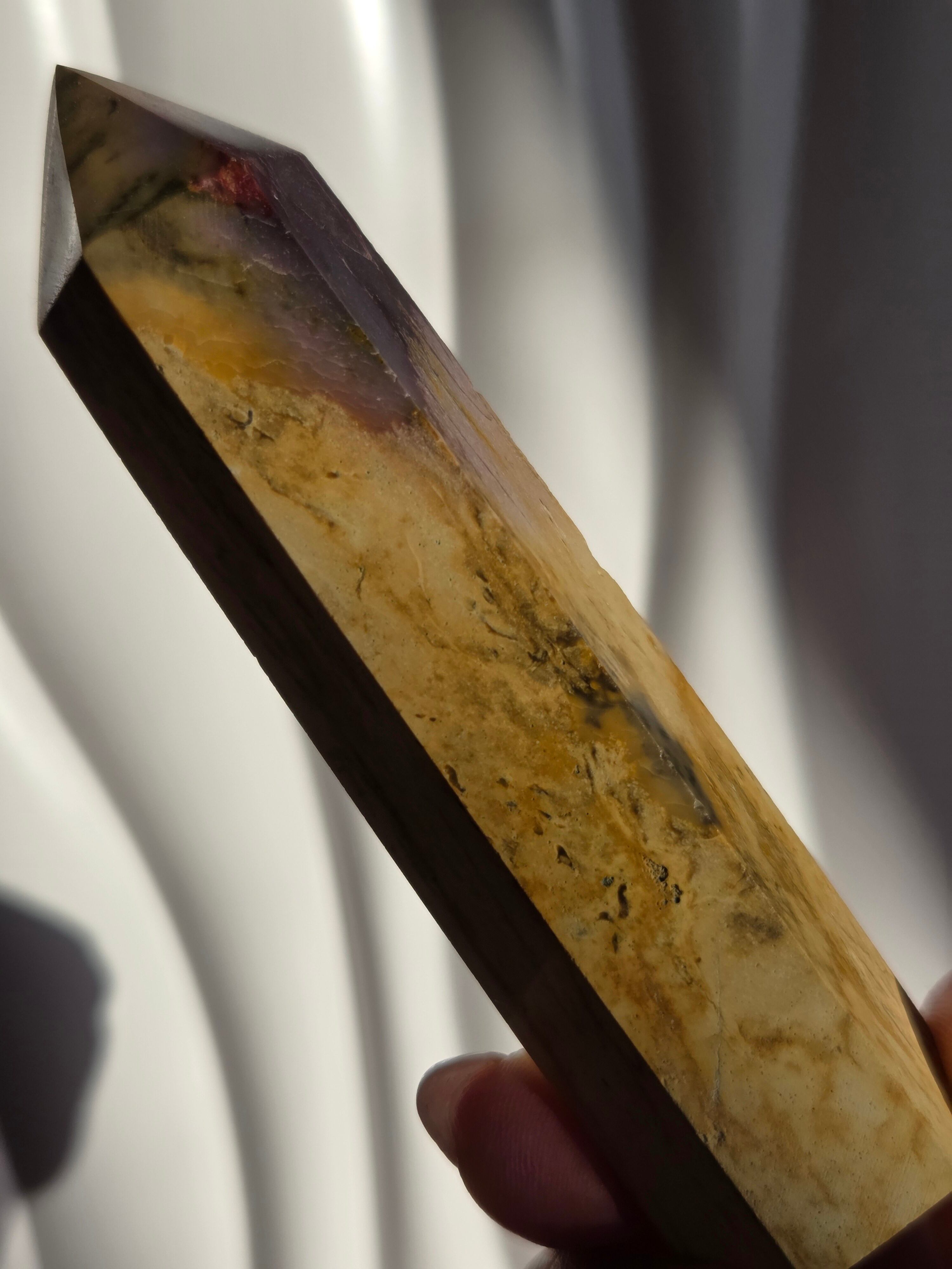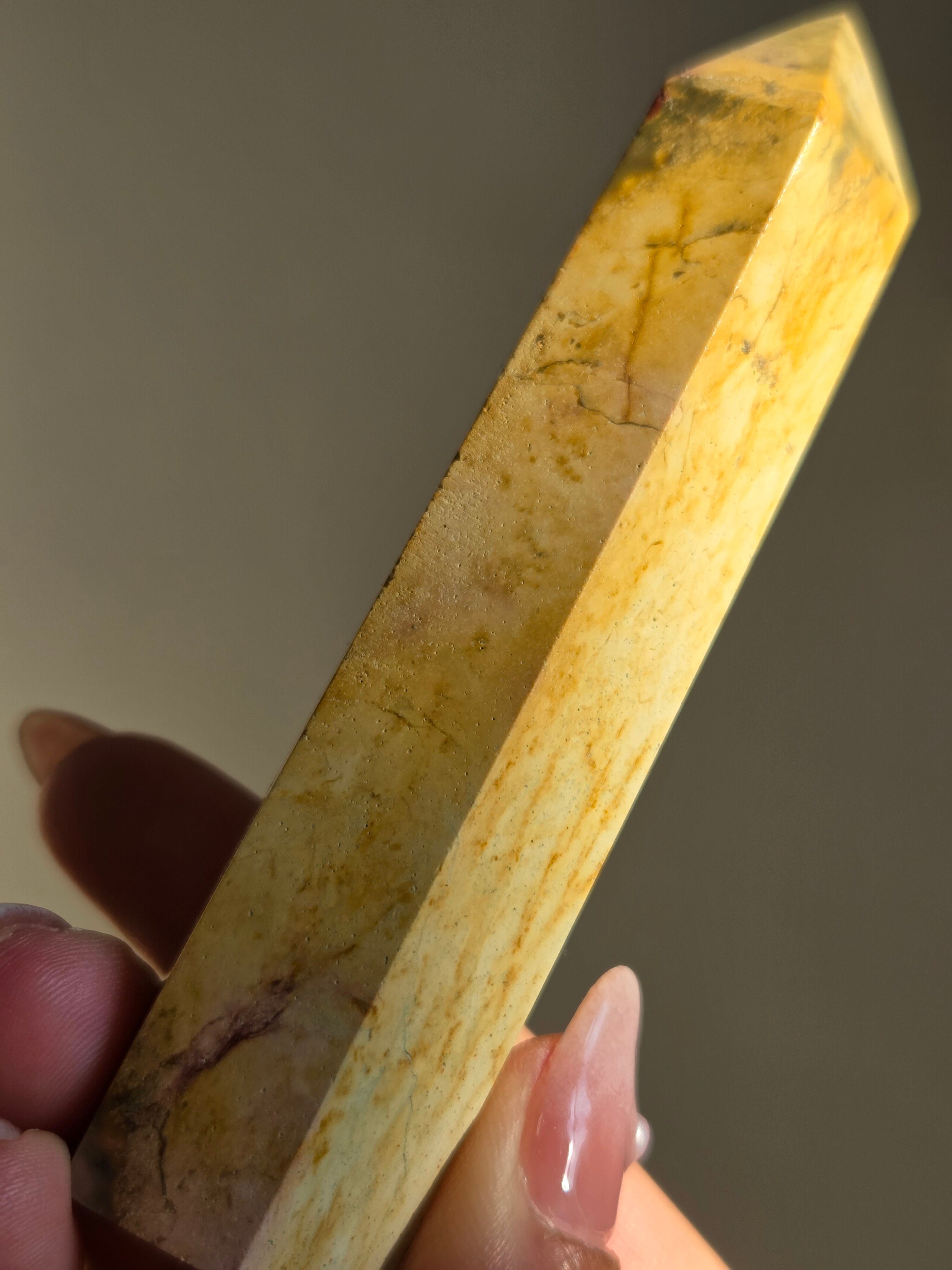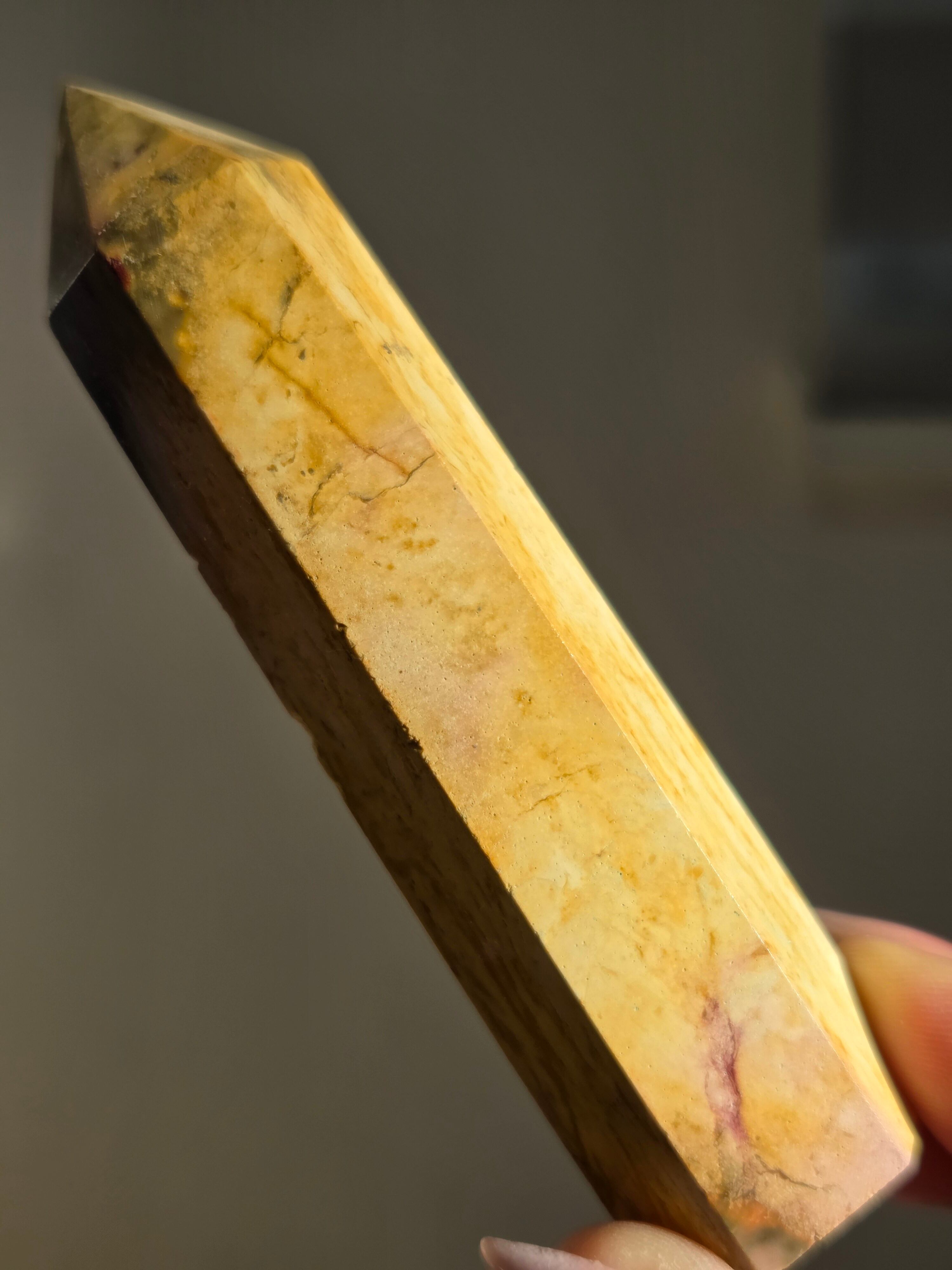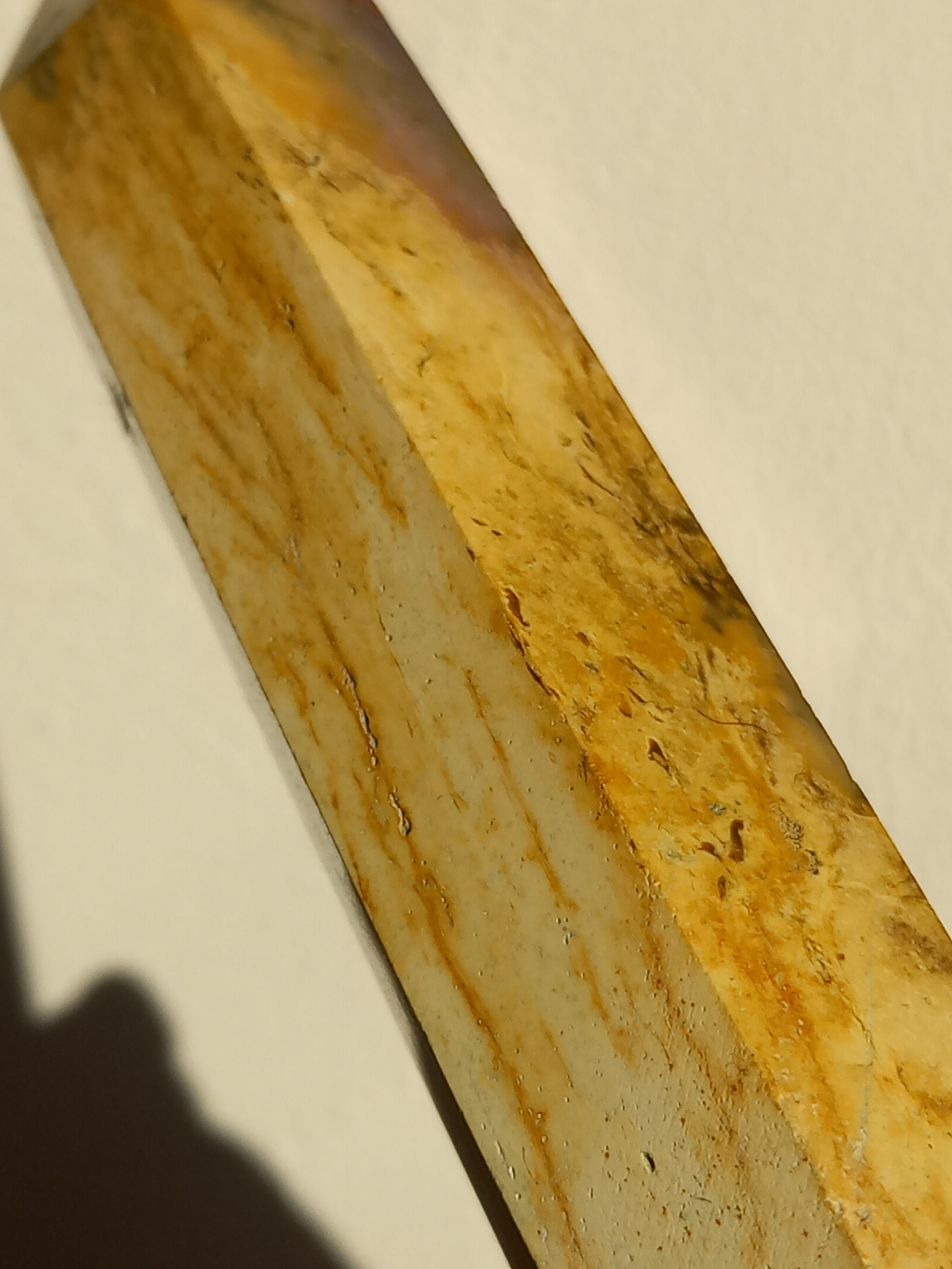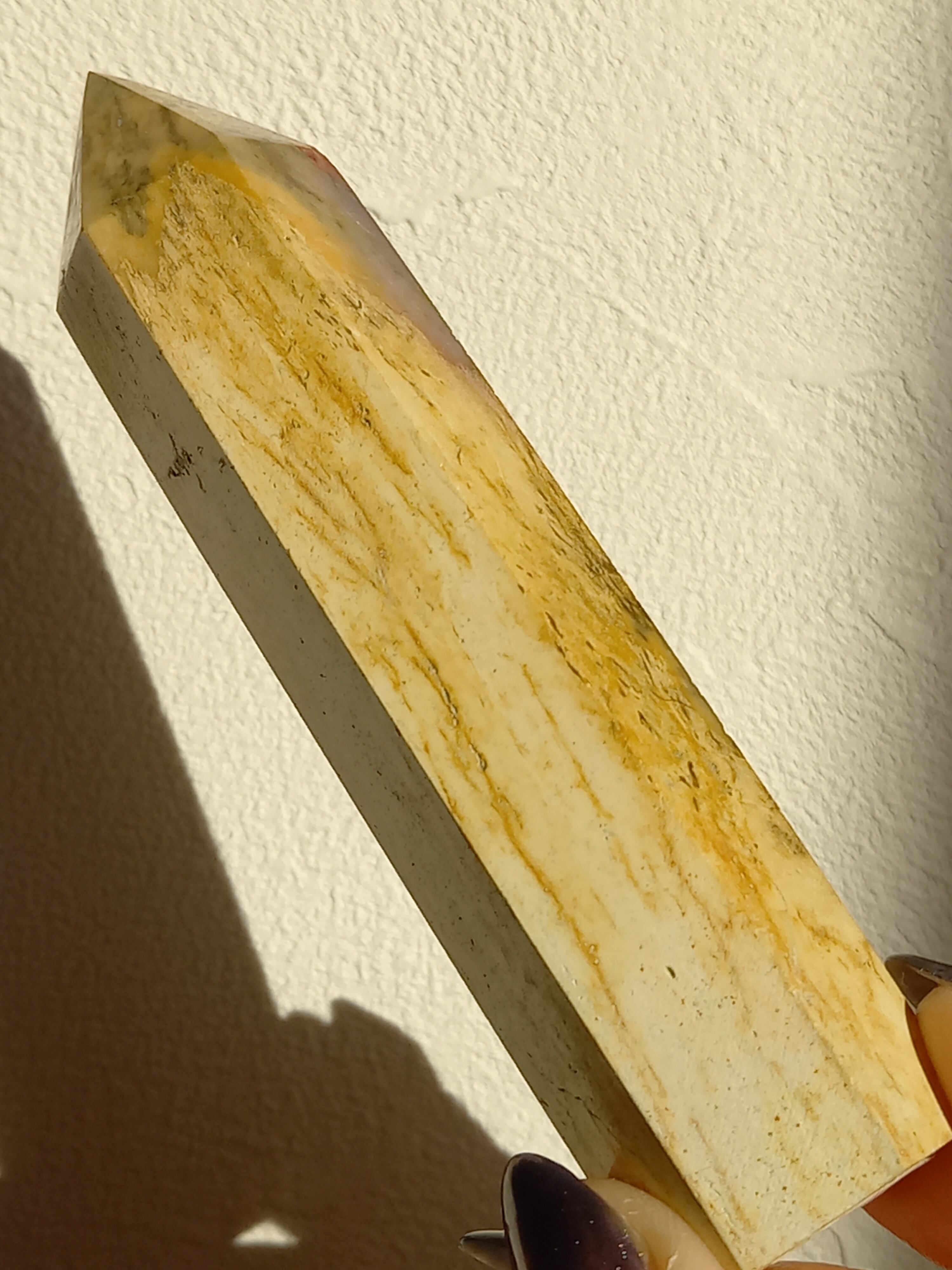 カラシ色に、イエロー、パープル、ホワイトと色味が入り、まるでキャンパスにアートを描かれたような、そんな雰囲気のある子です。