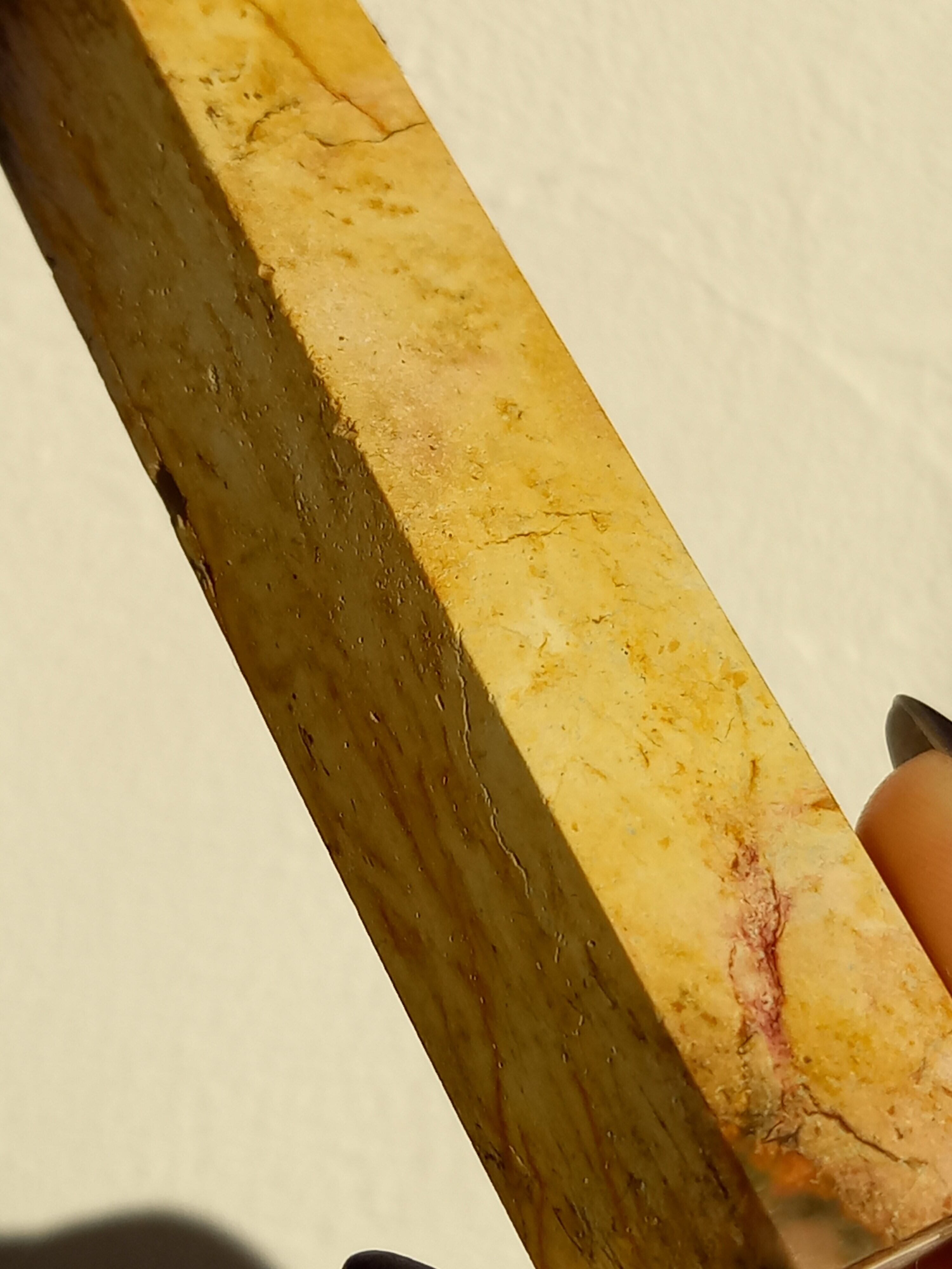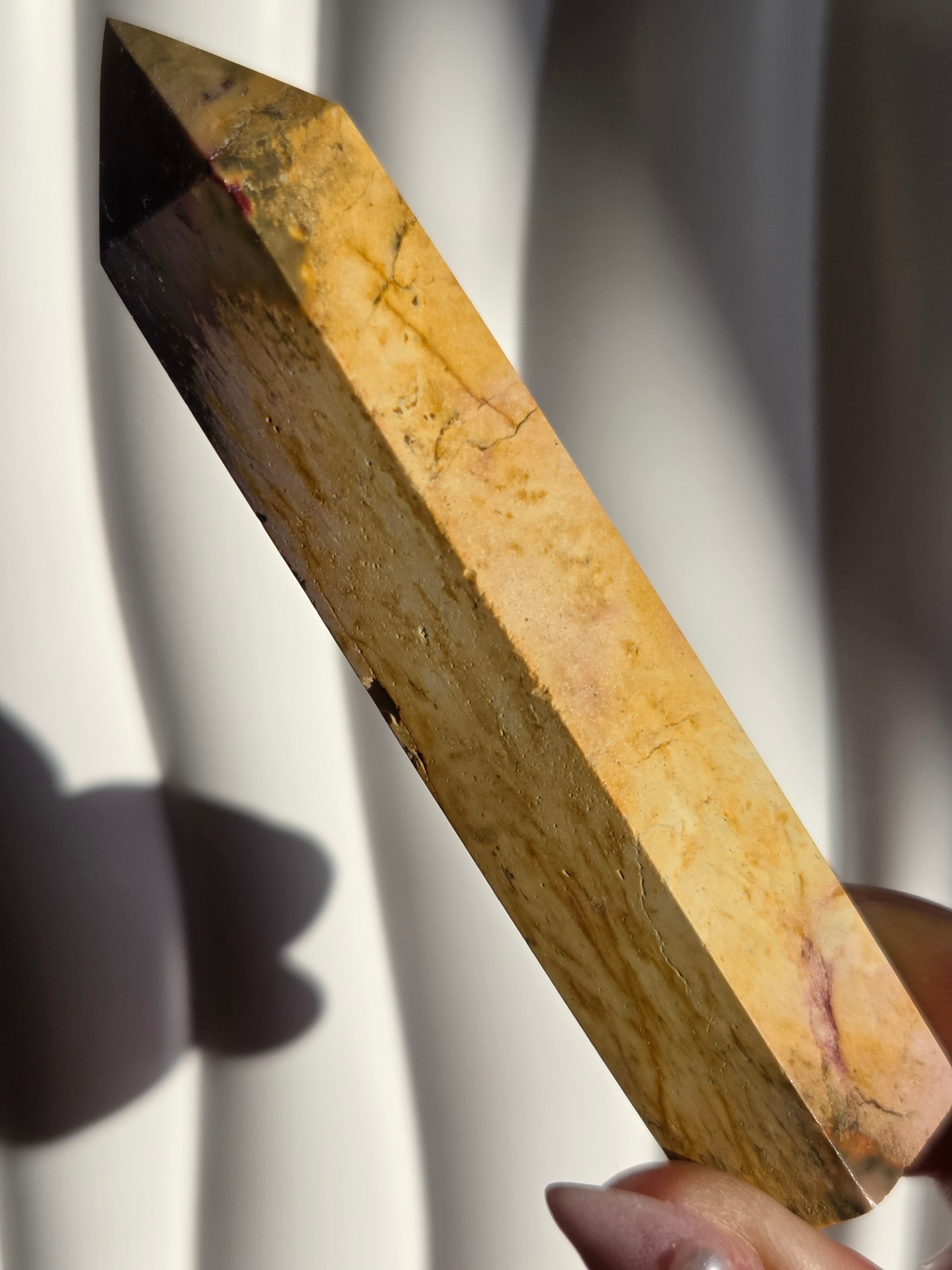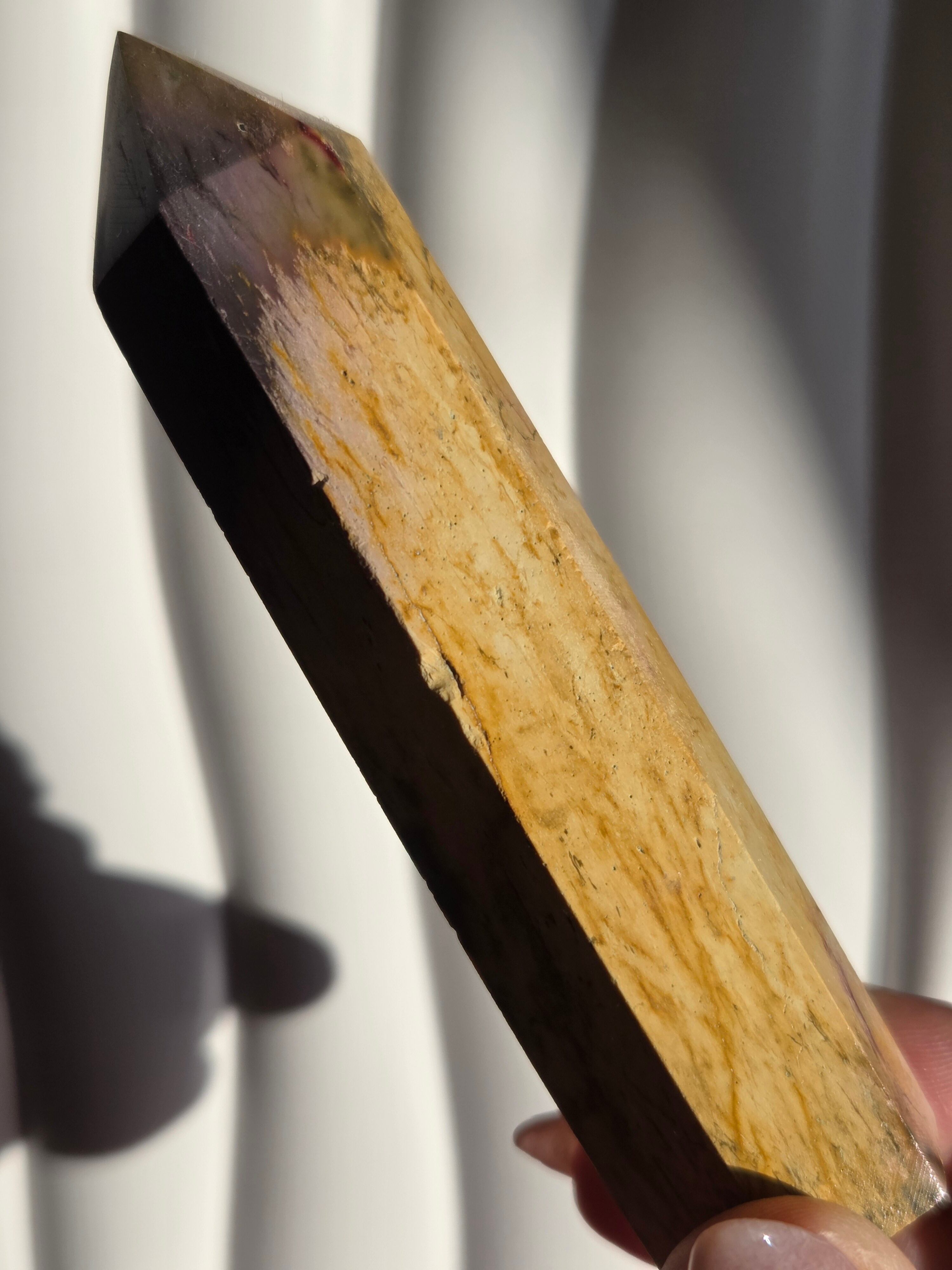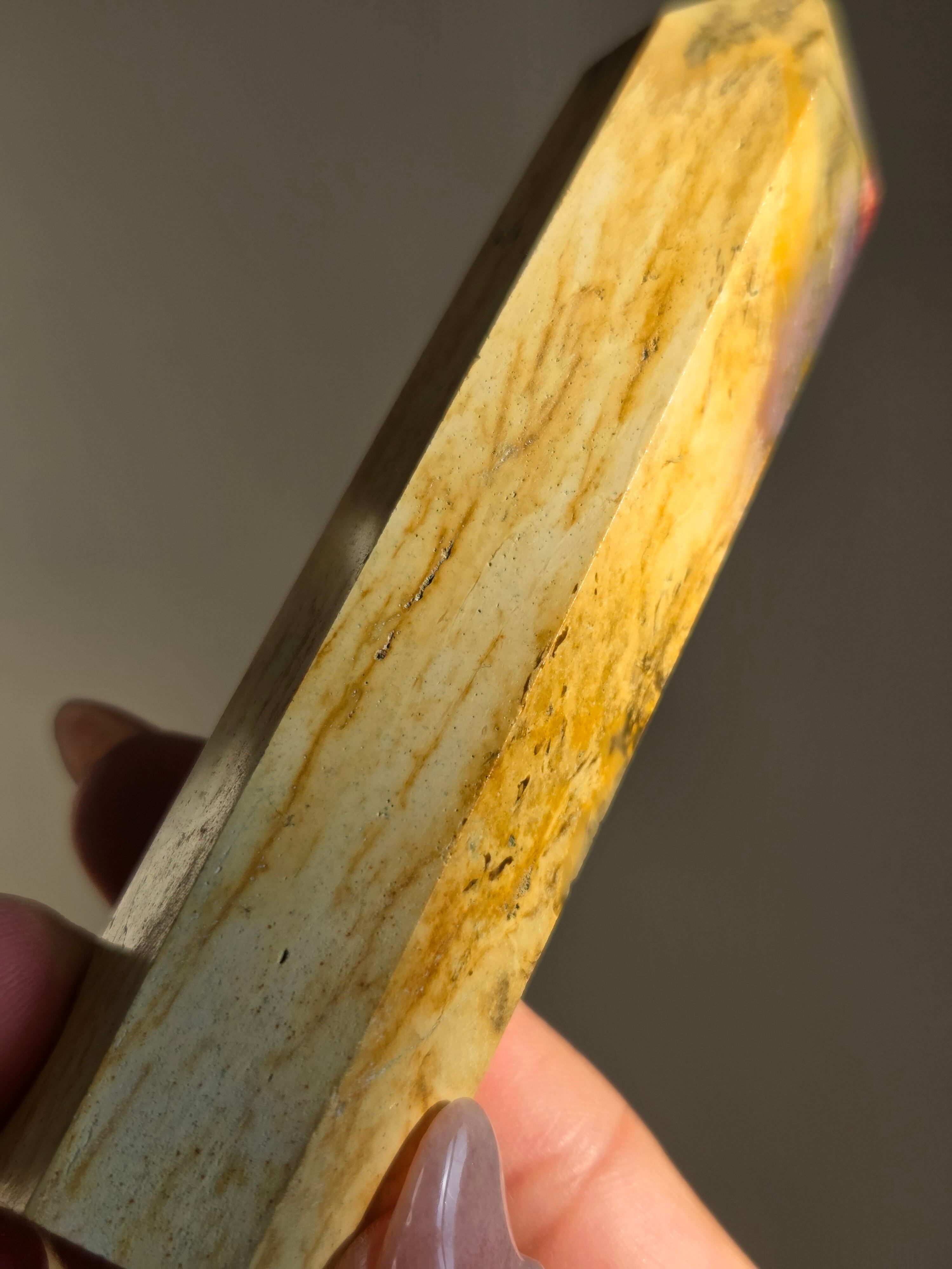 カラシ色に、イエロー、パープル、ホワイトと色味が入り、まるでキャンパスにアートを描かれたような、そんな雰囲気のある子です。