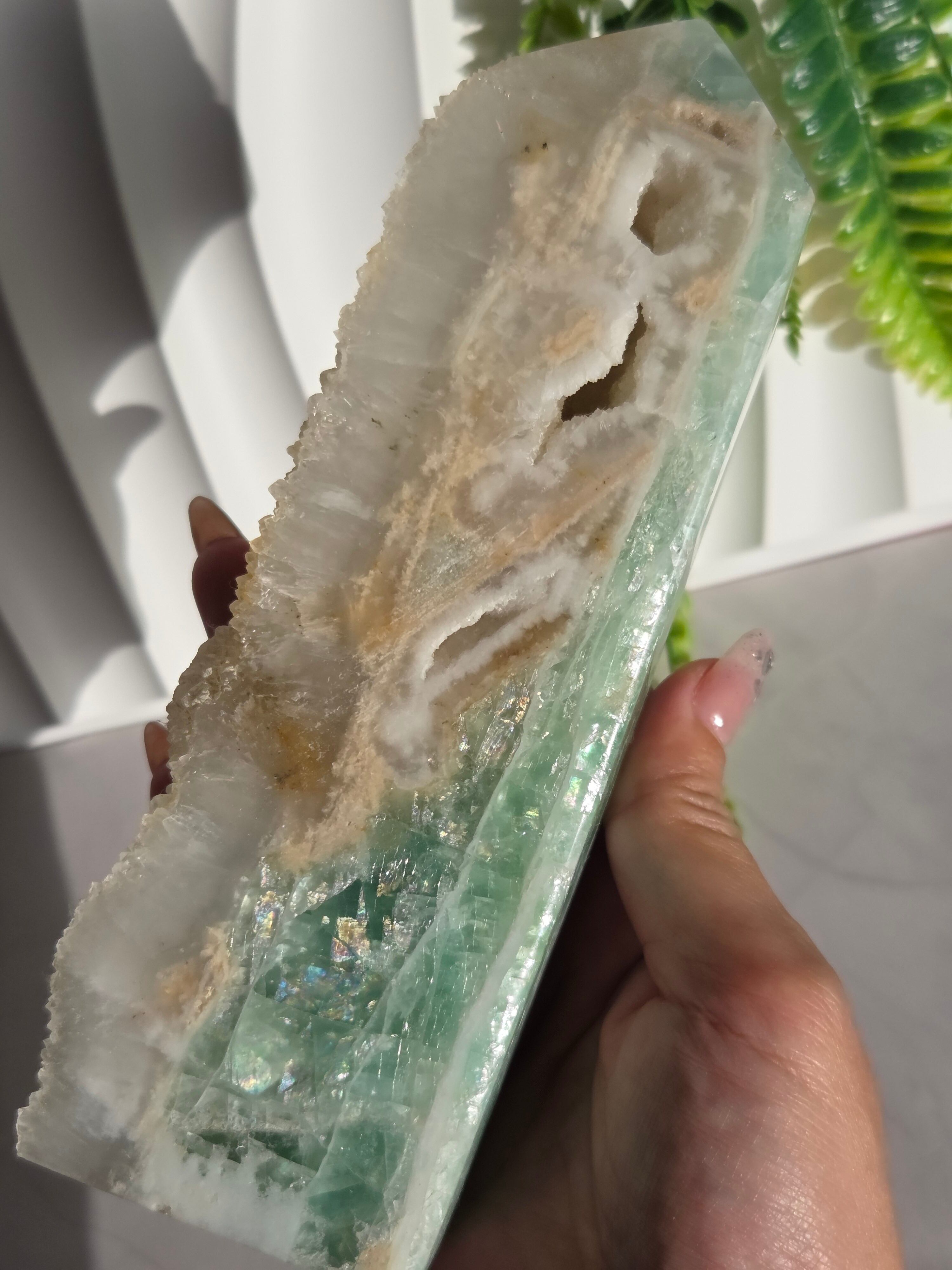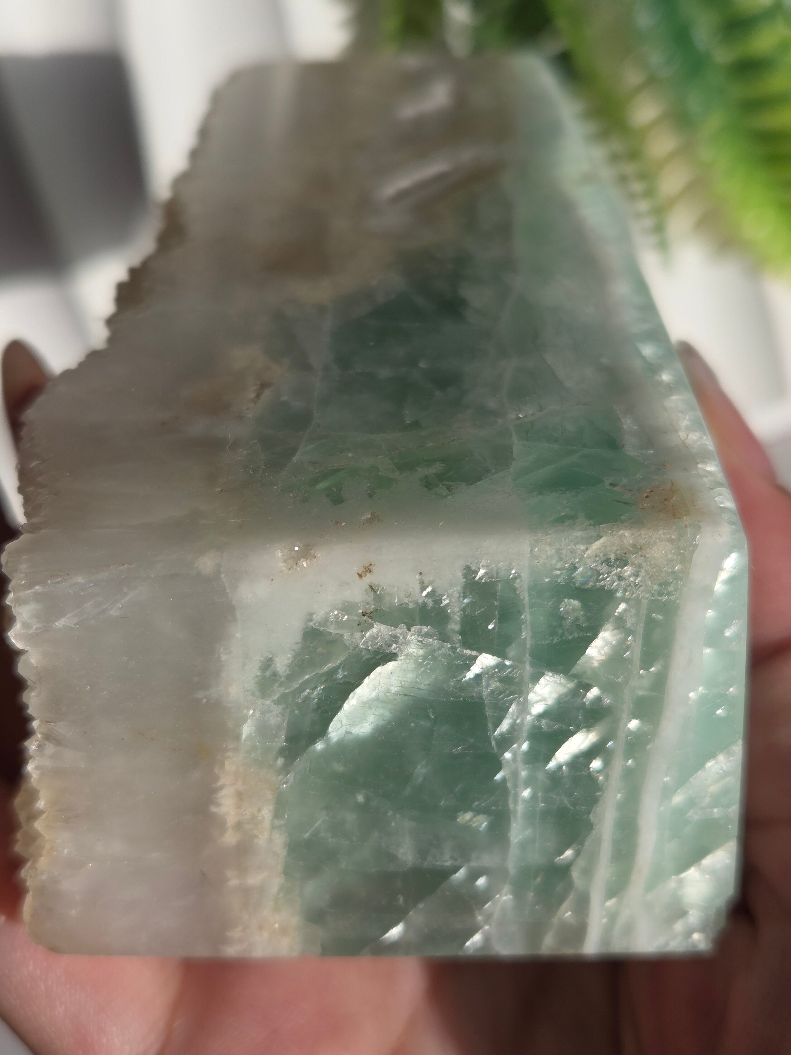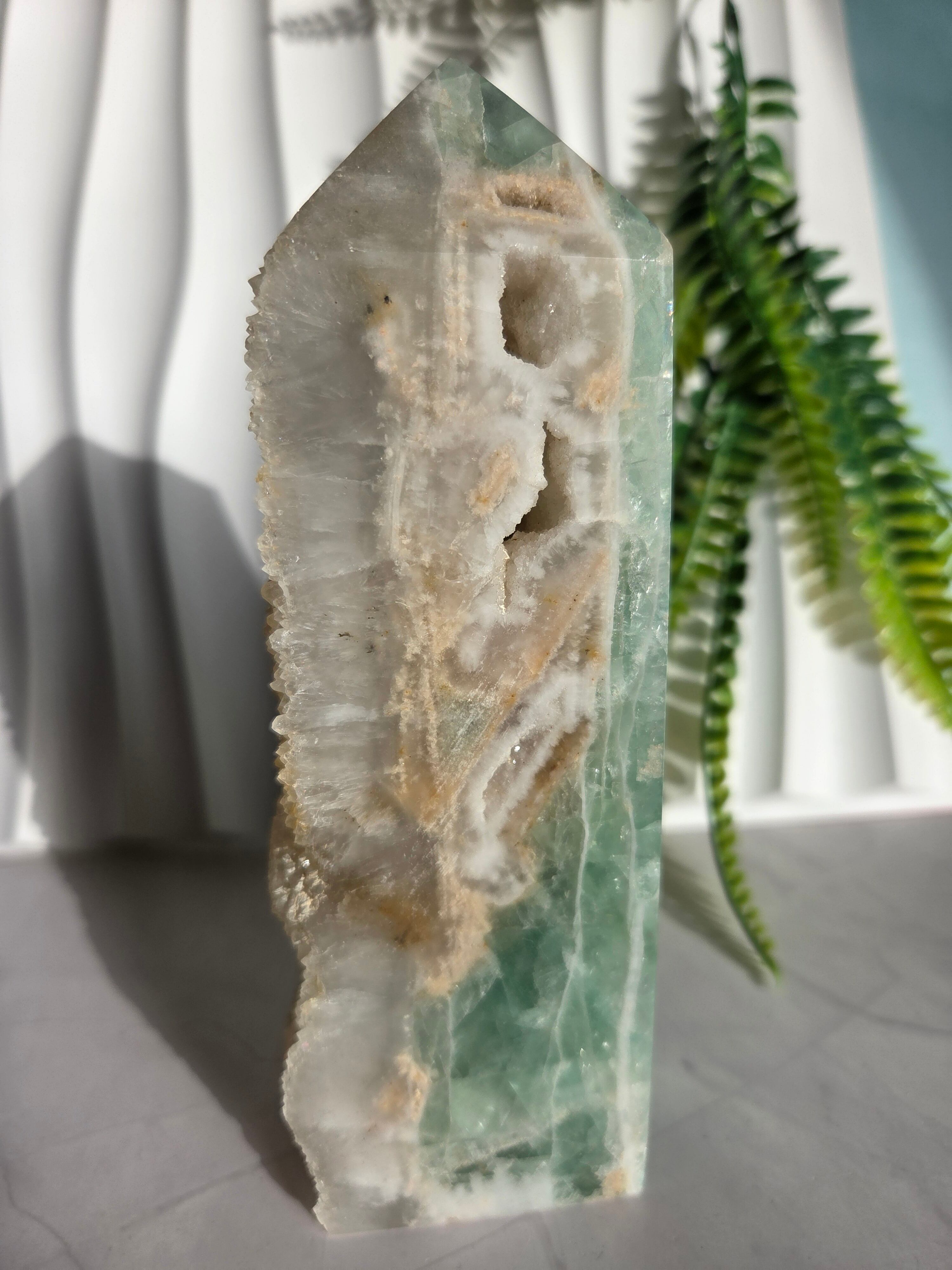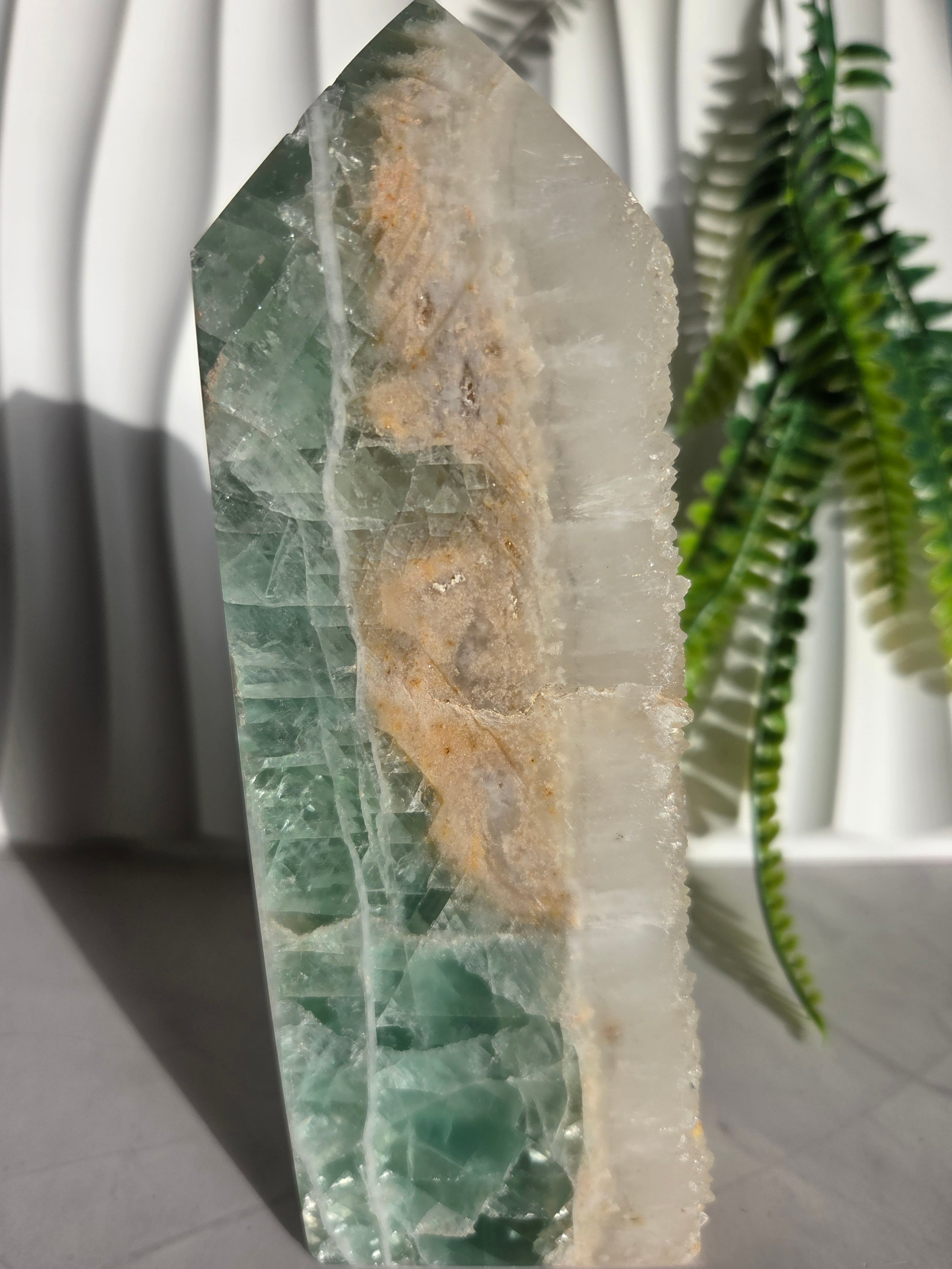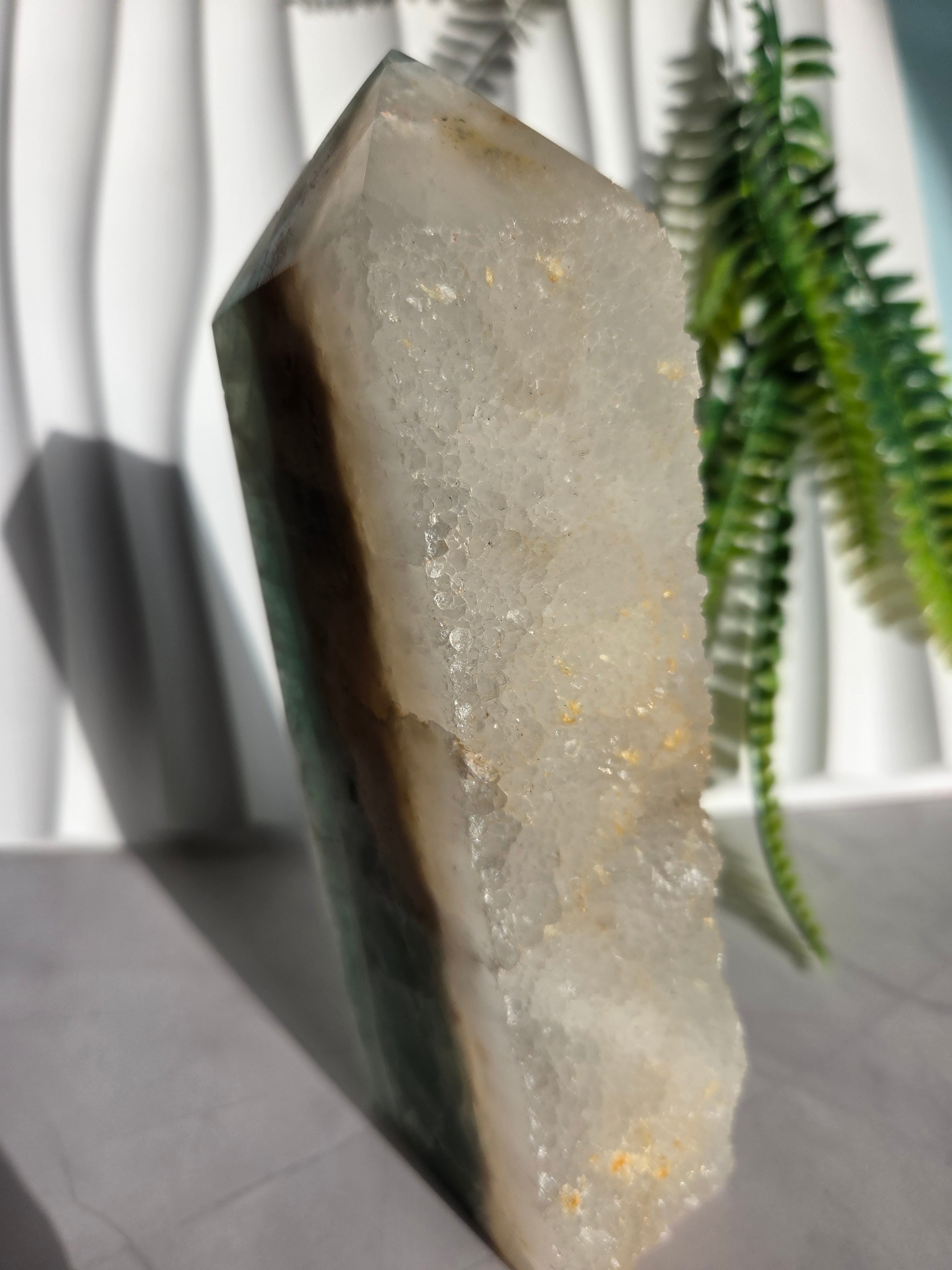 鮮やかなグリーンに、結晶面はポリッシュせず残しており、結晶面と、ポリッシュ部分と楽しめるタワーです。