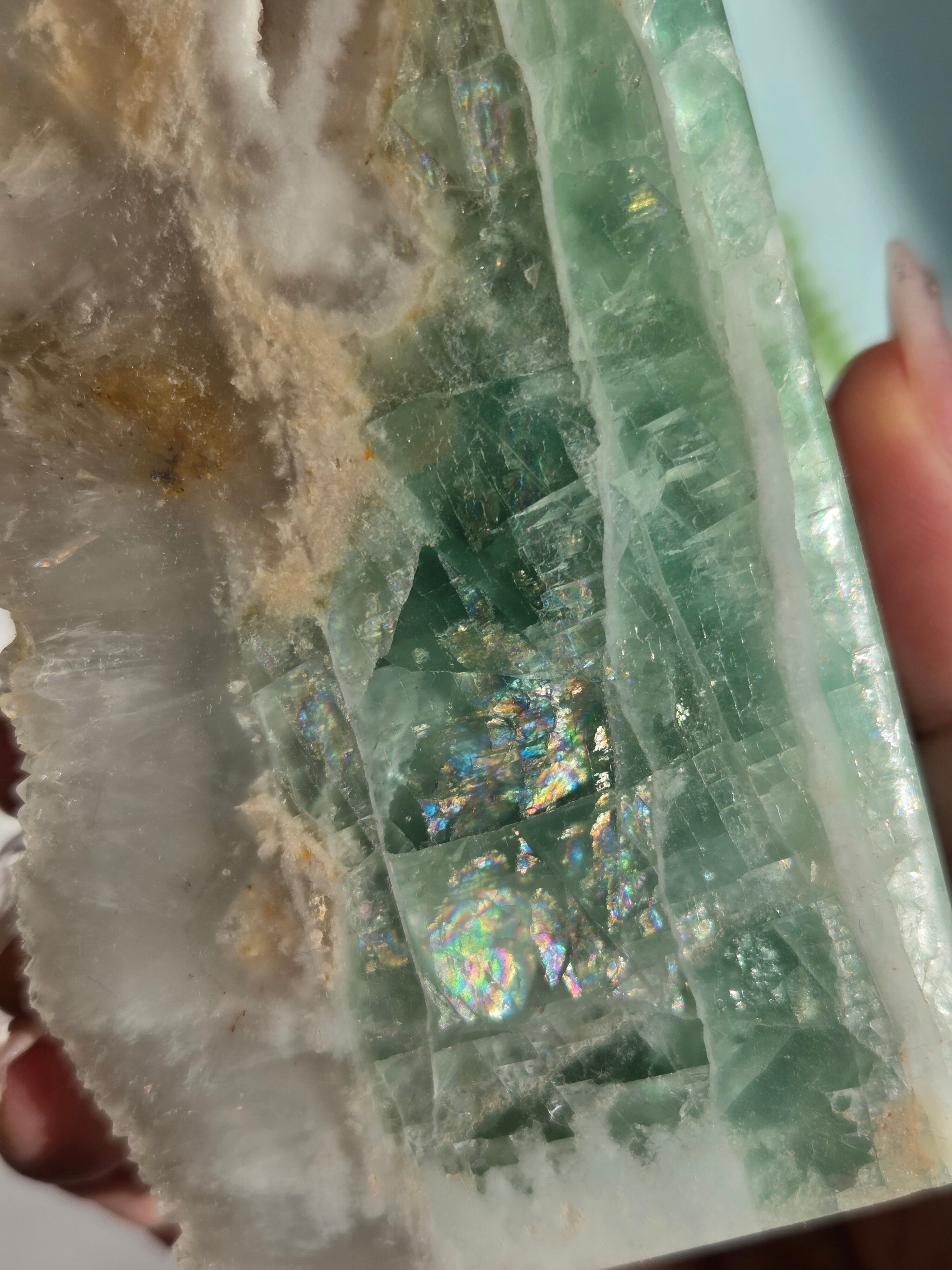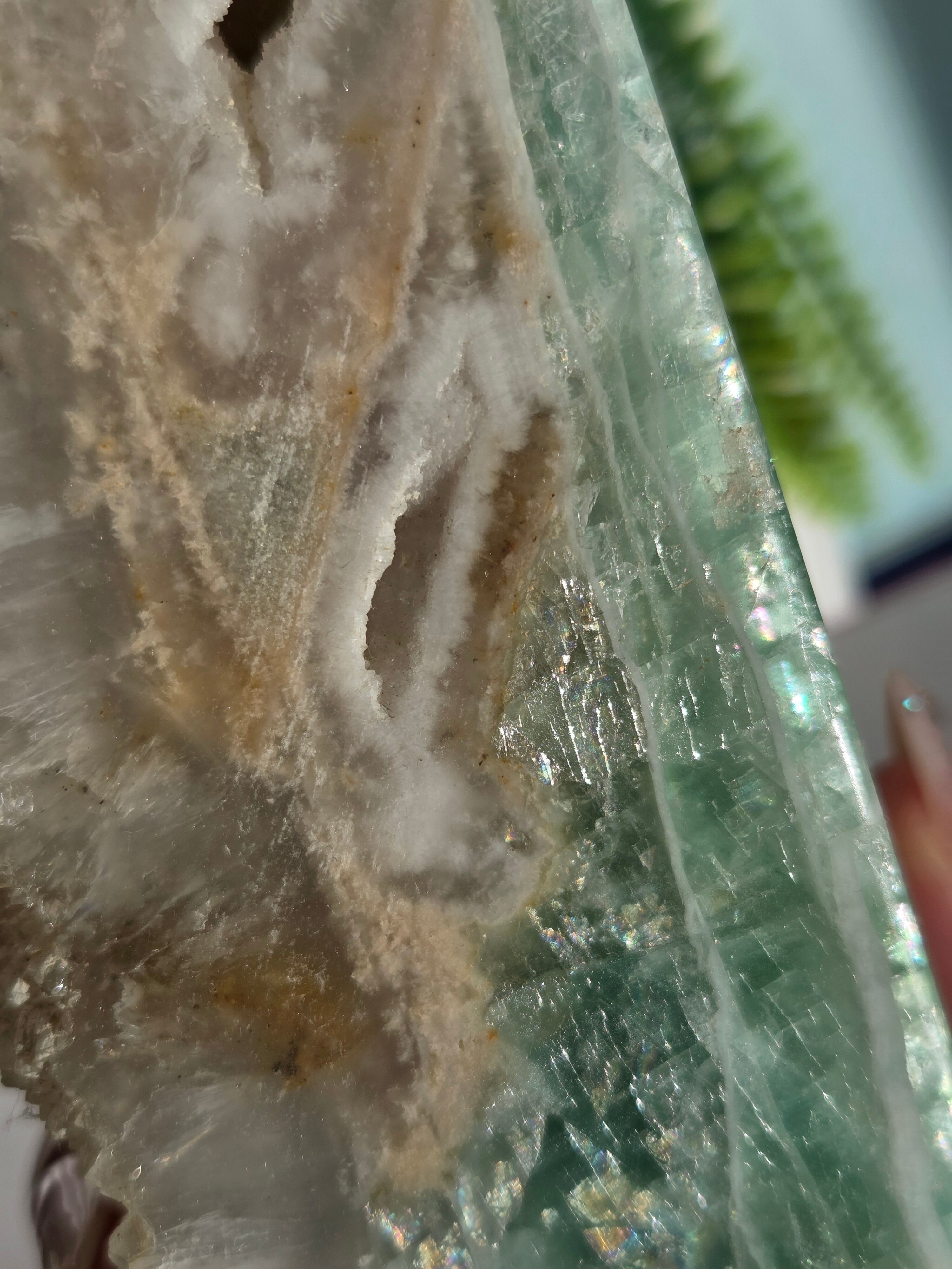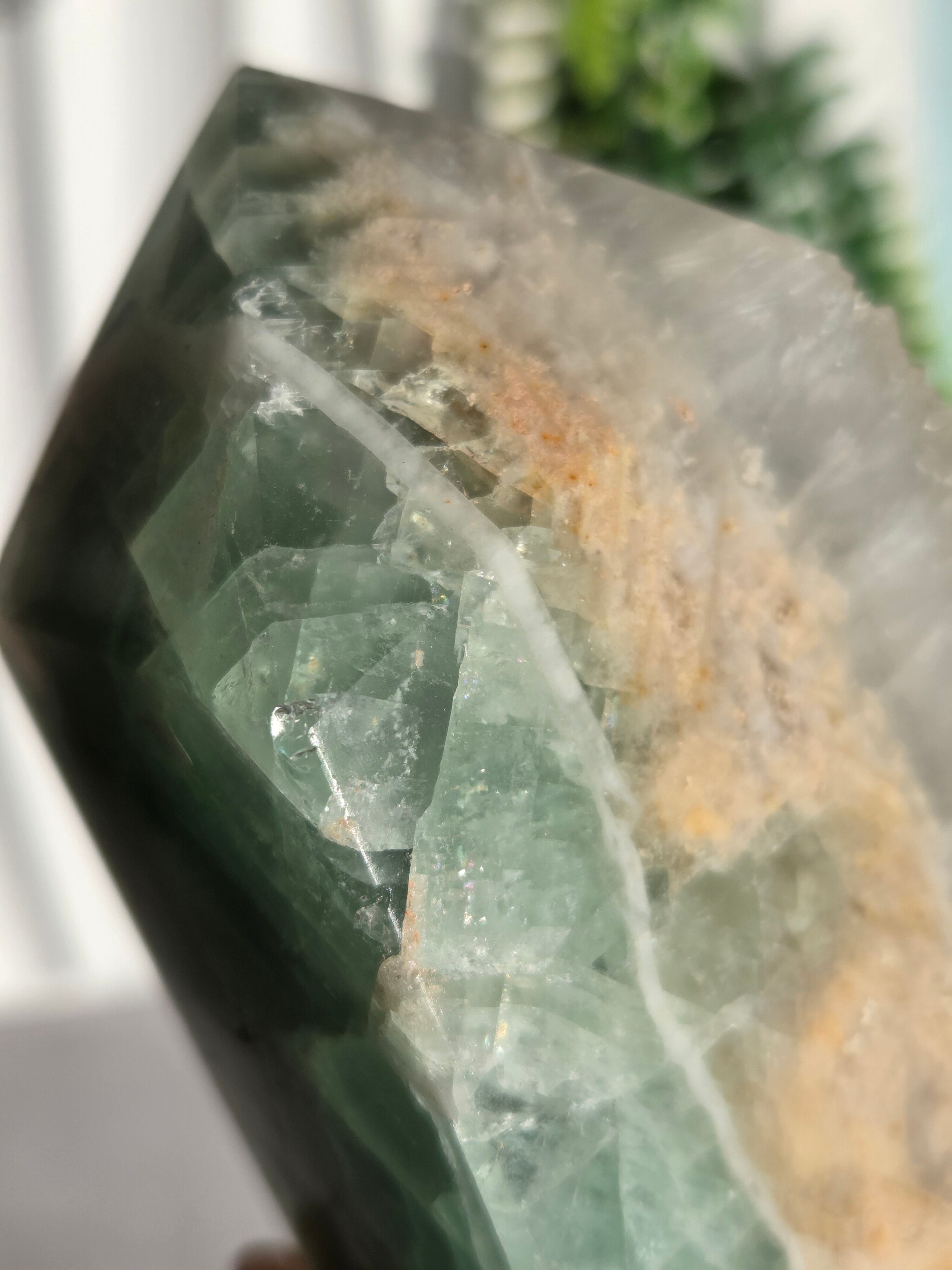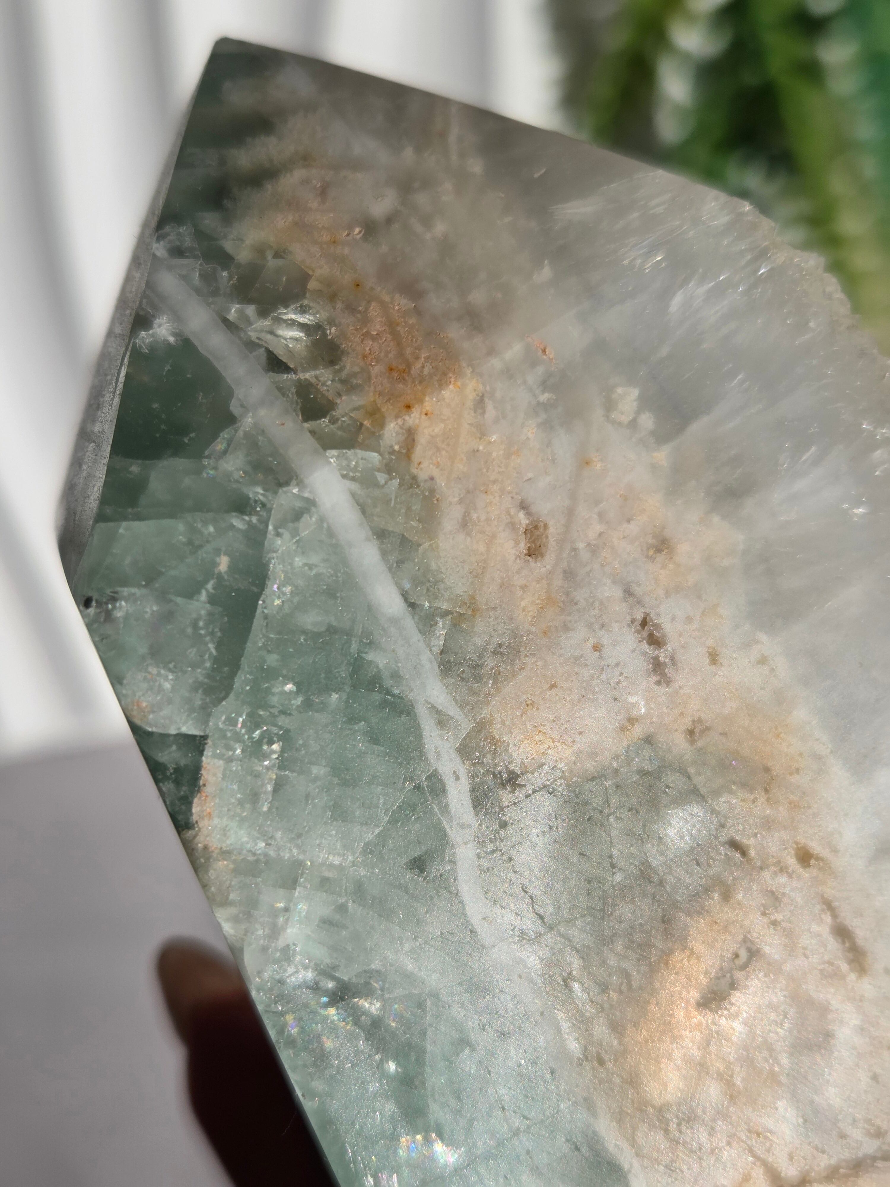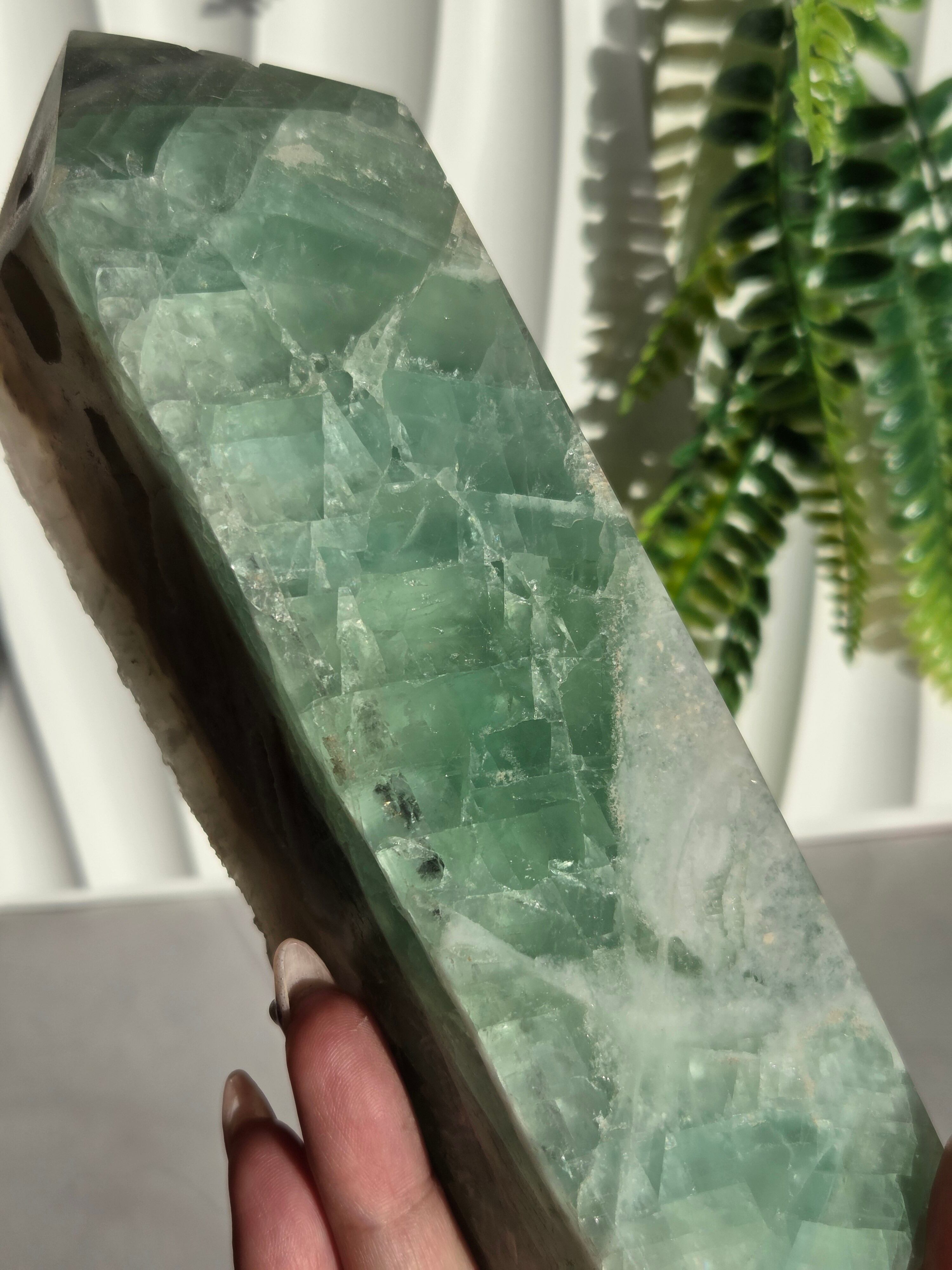 鮮やかなグリーンに、結晶面はポリッシュせず残しており、結晶面と、ポリッシュ部分と楽しめるタワーです。