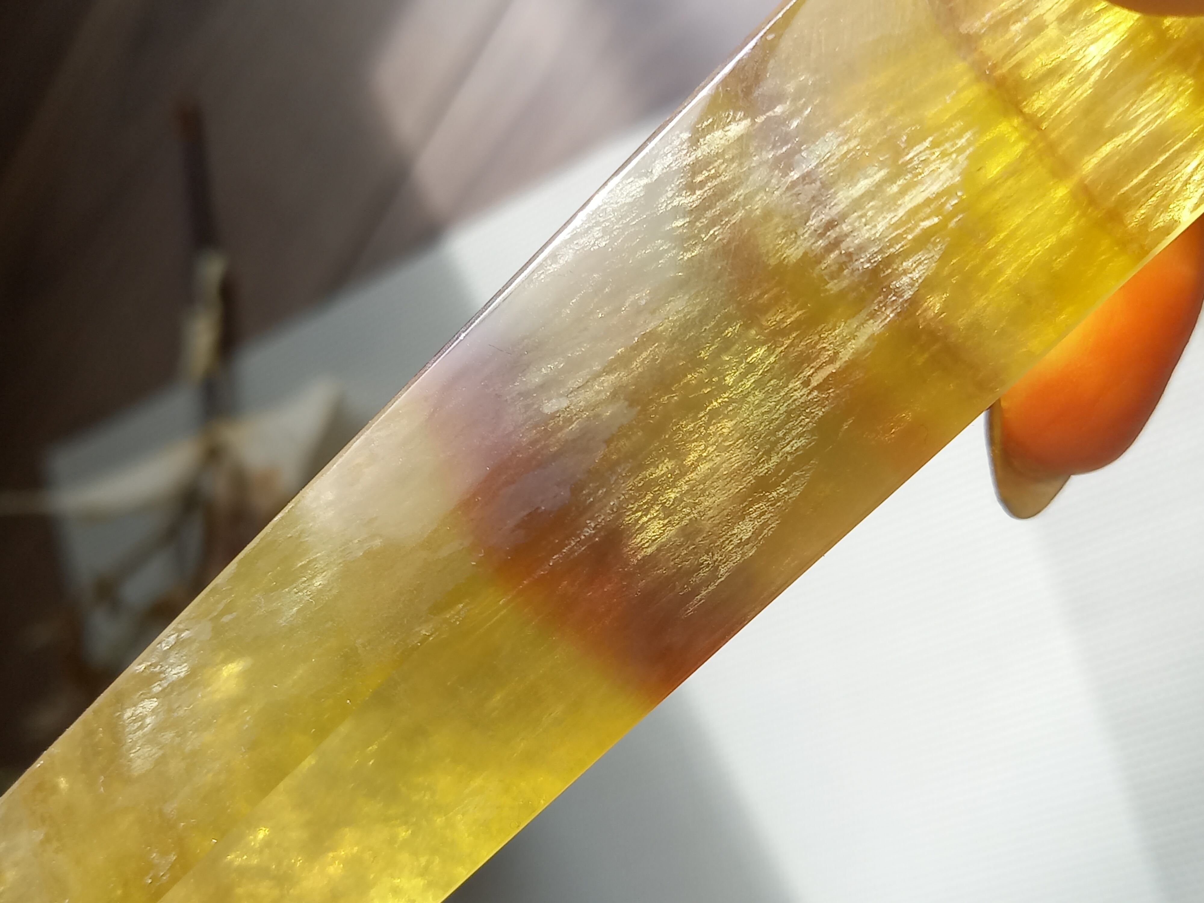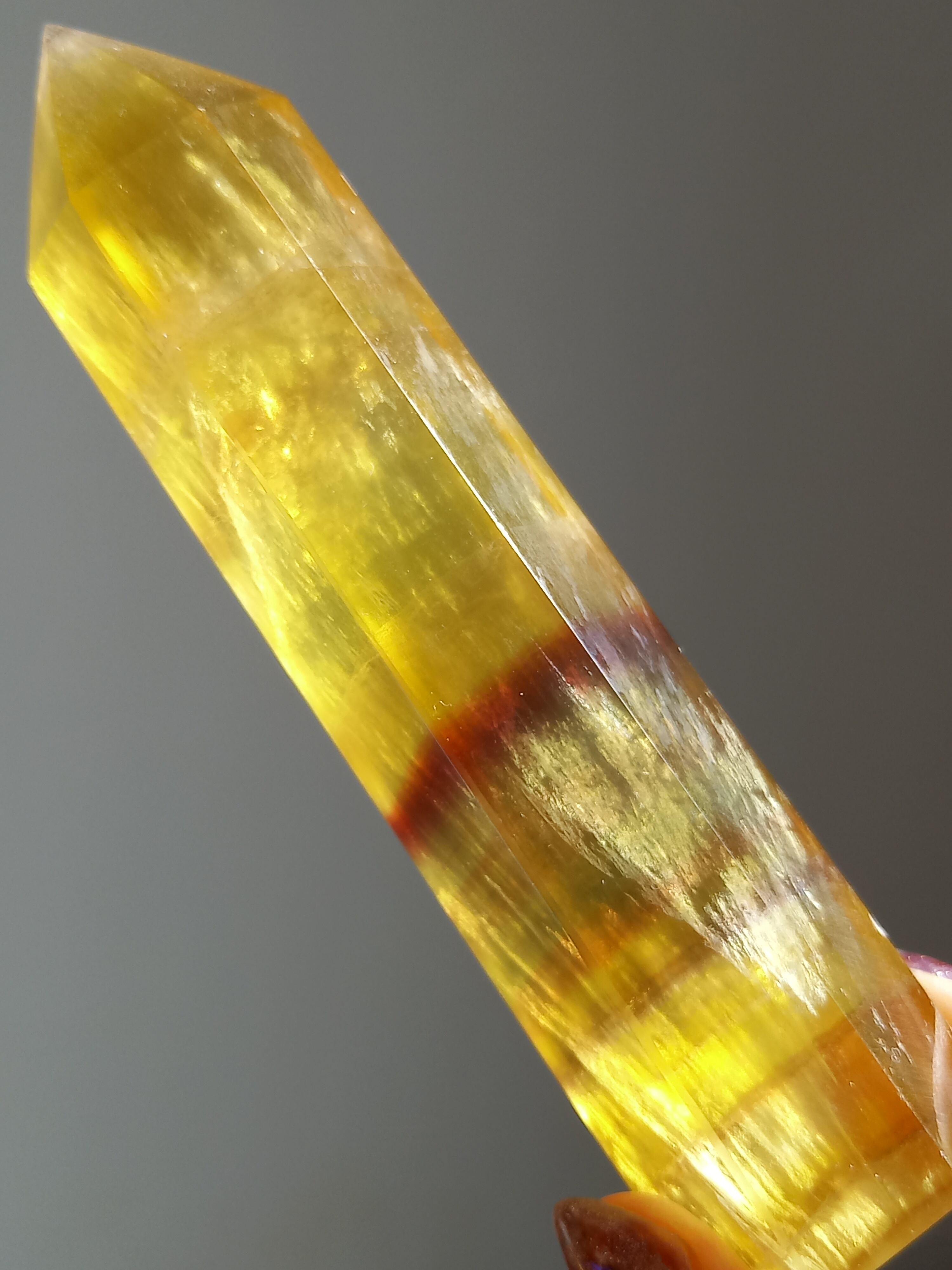 ビビットなビタミンイエロー×パープルカラーの縞模様の子です。各所に見られる透明感や、艶めきが素敵な子です。