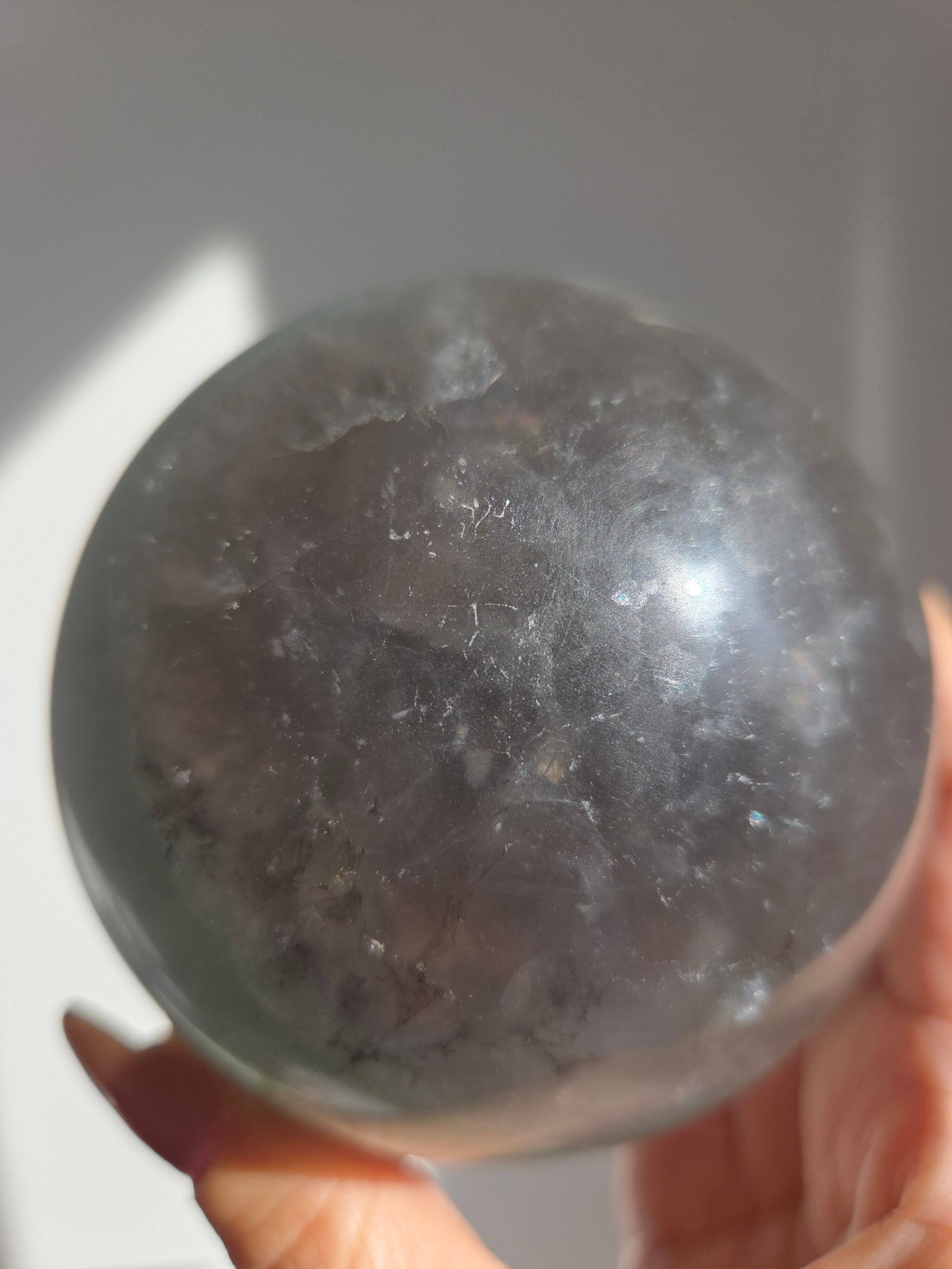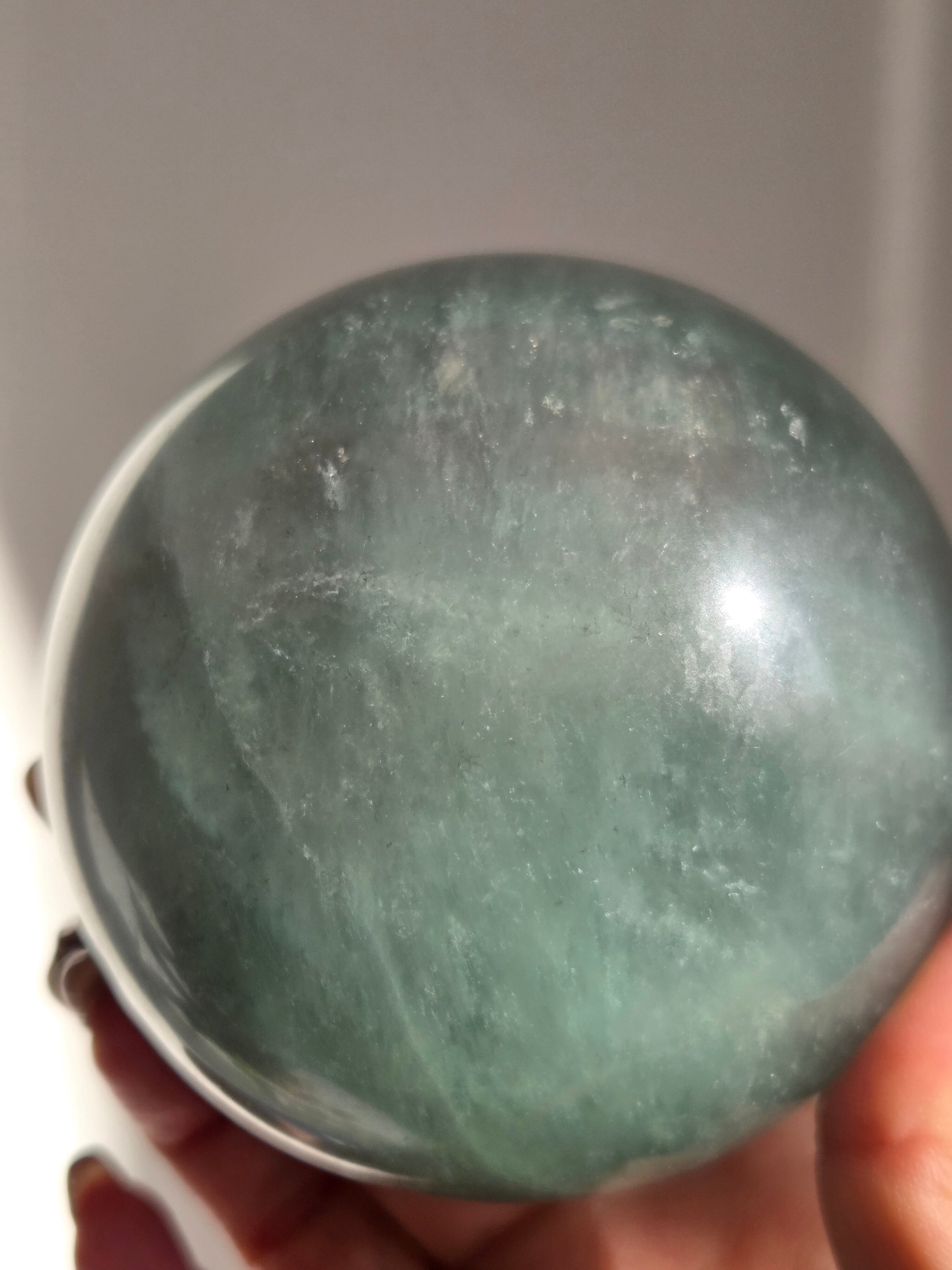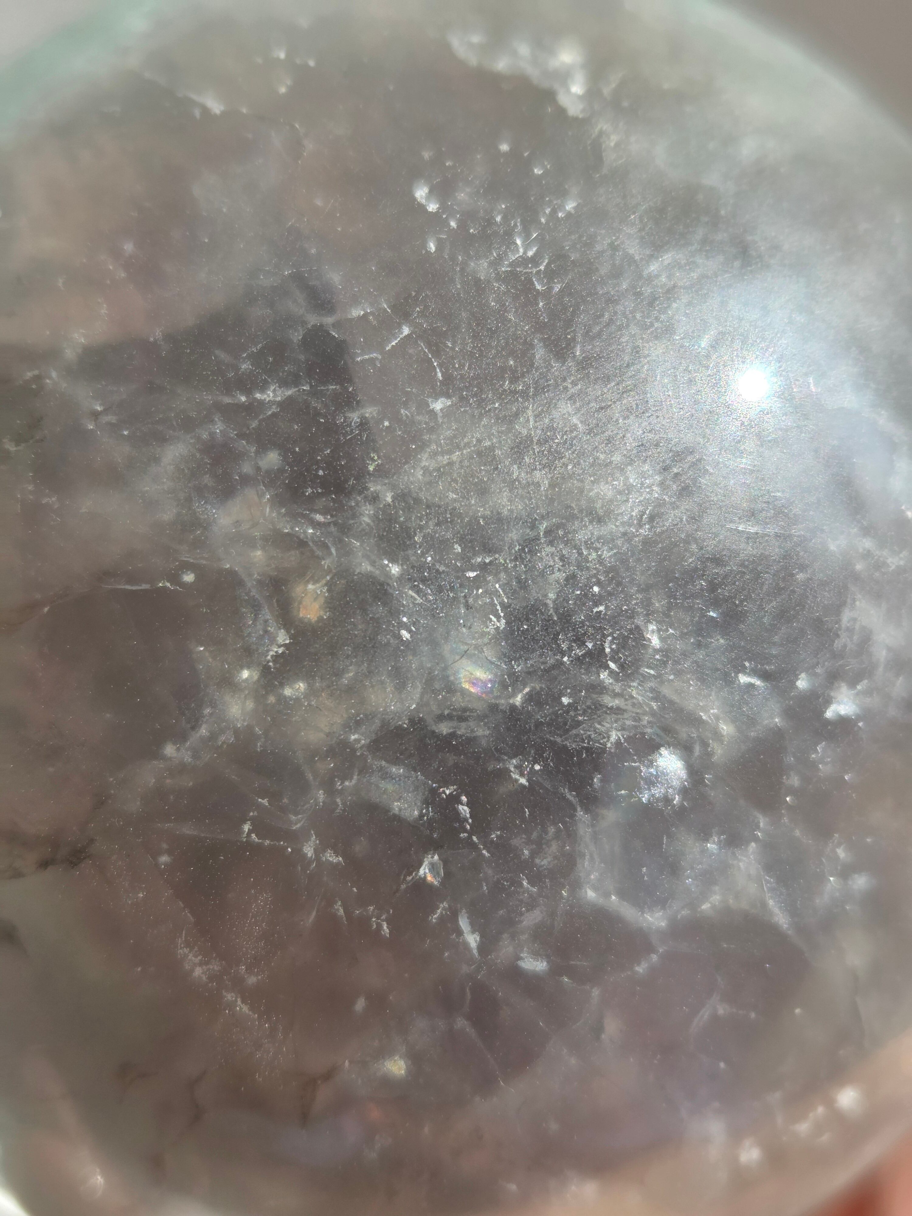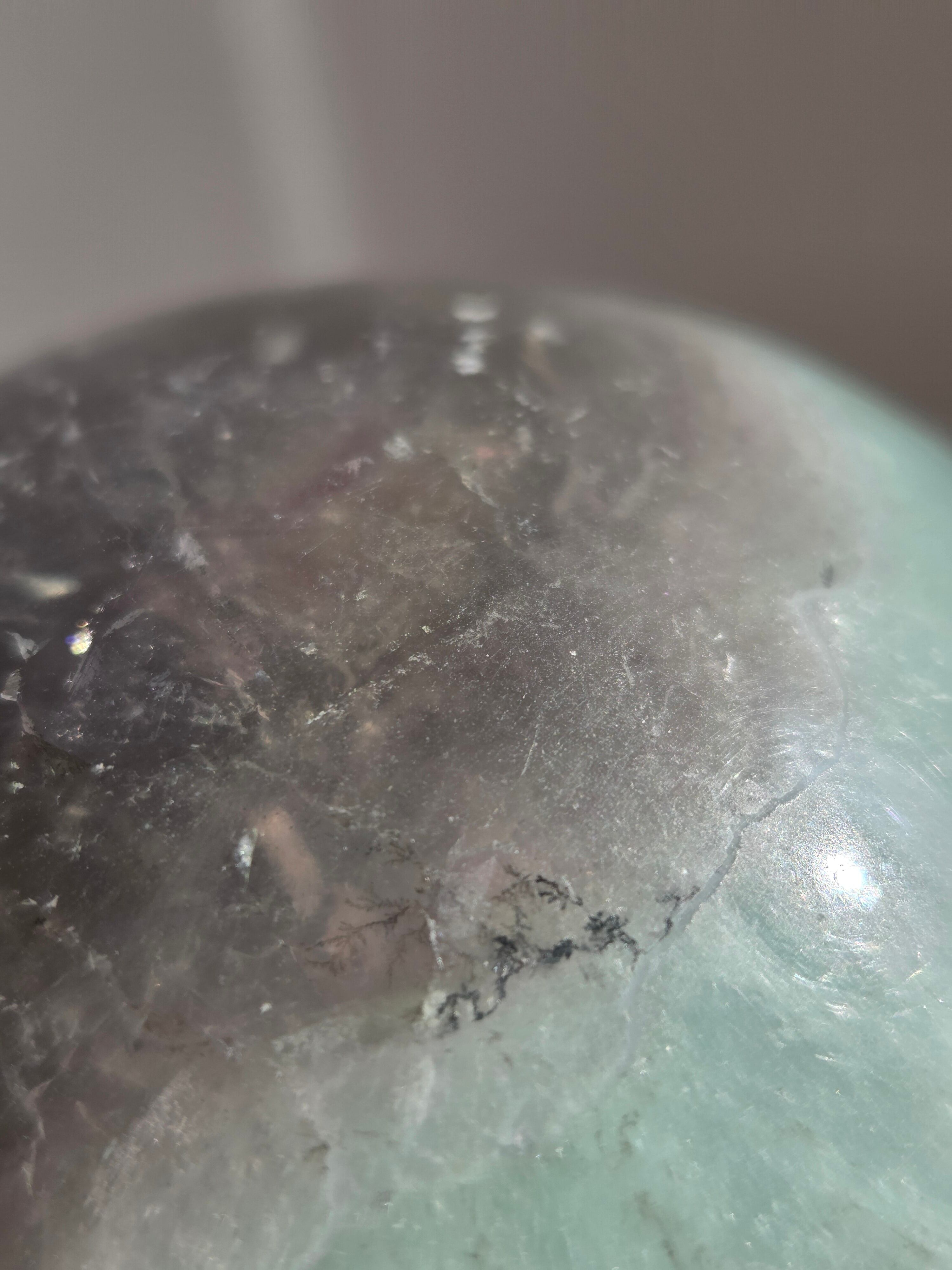 マイカの煌めきや、グリーンフローライトの層も美しいです。所々入り込んだデンドリも可愛いらしいビックサイズの迫力あるスフィアです。