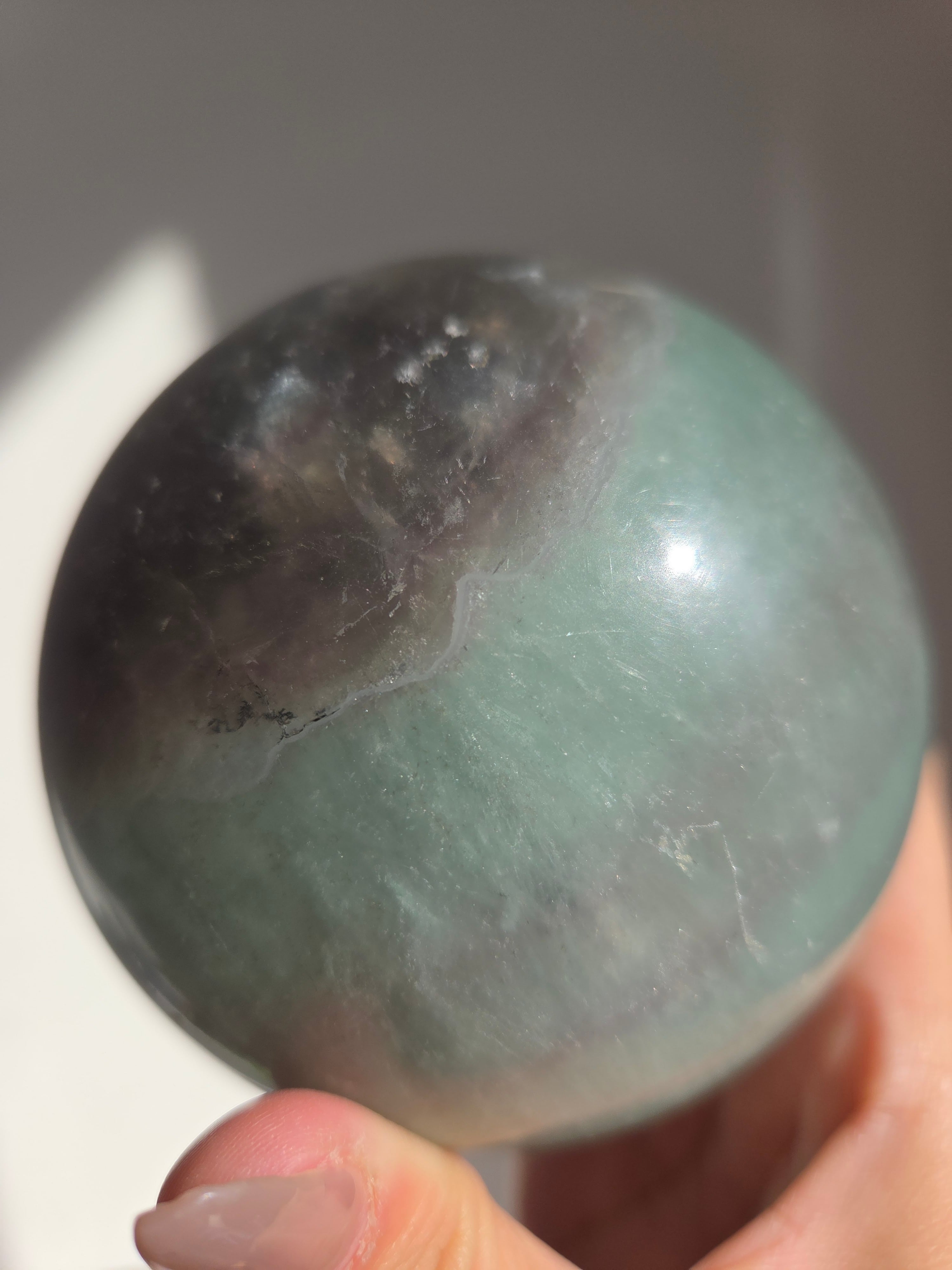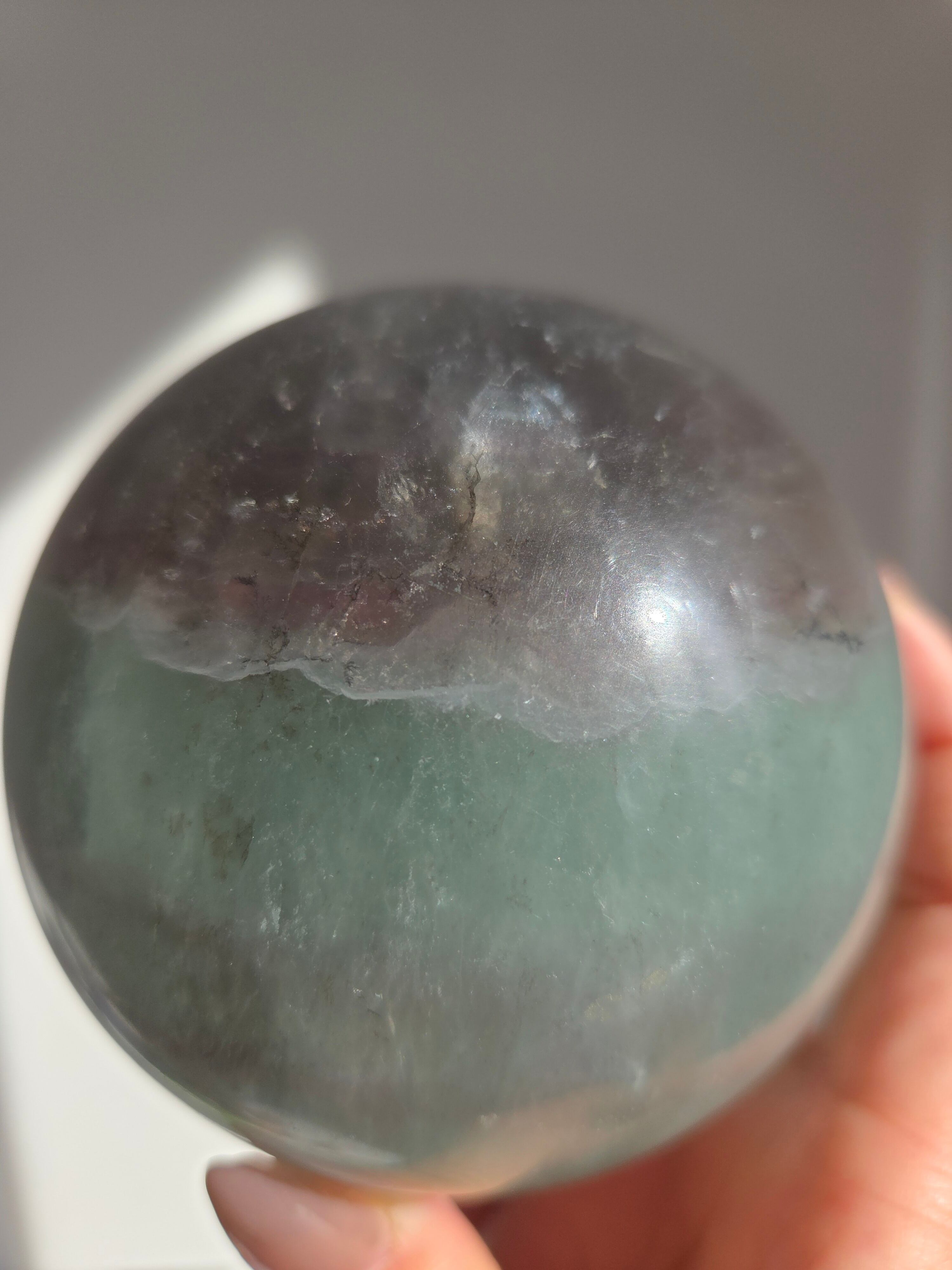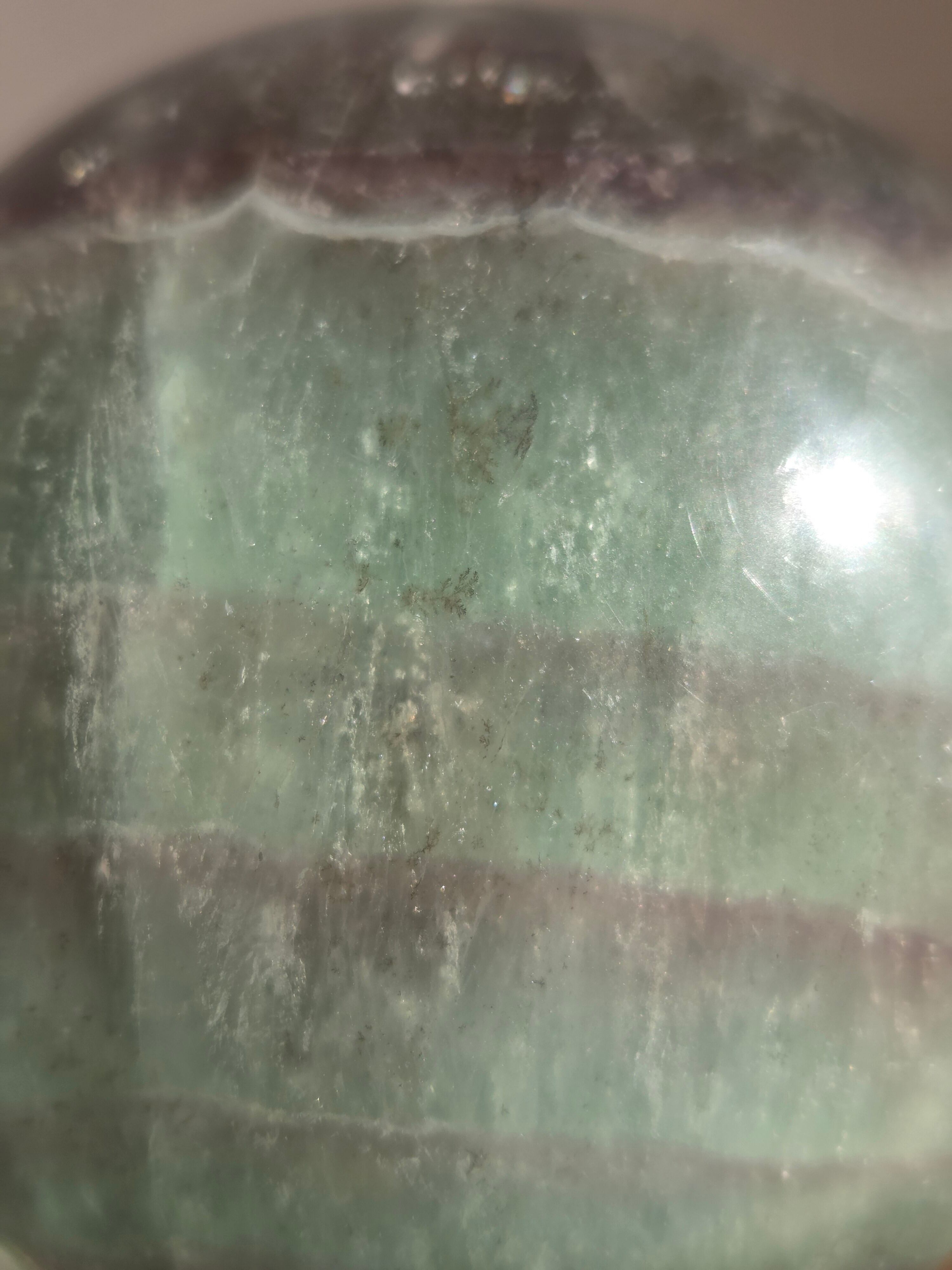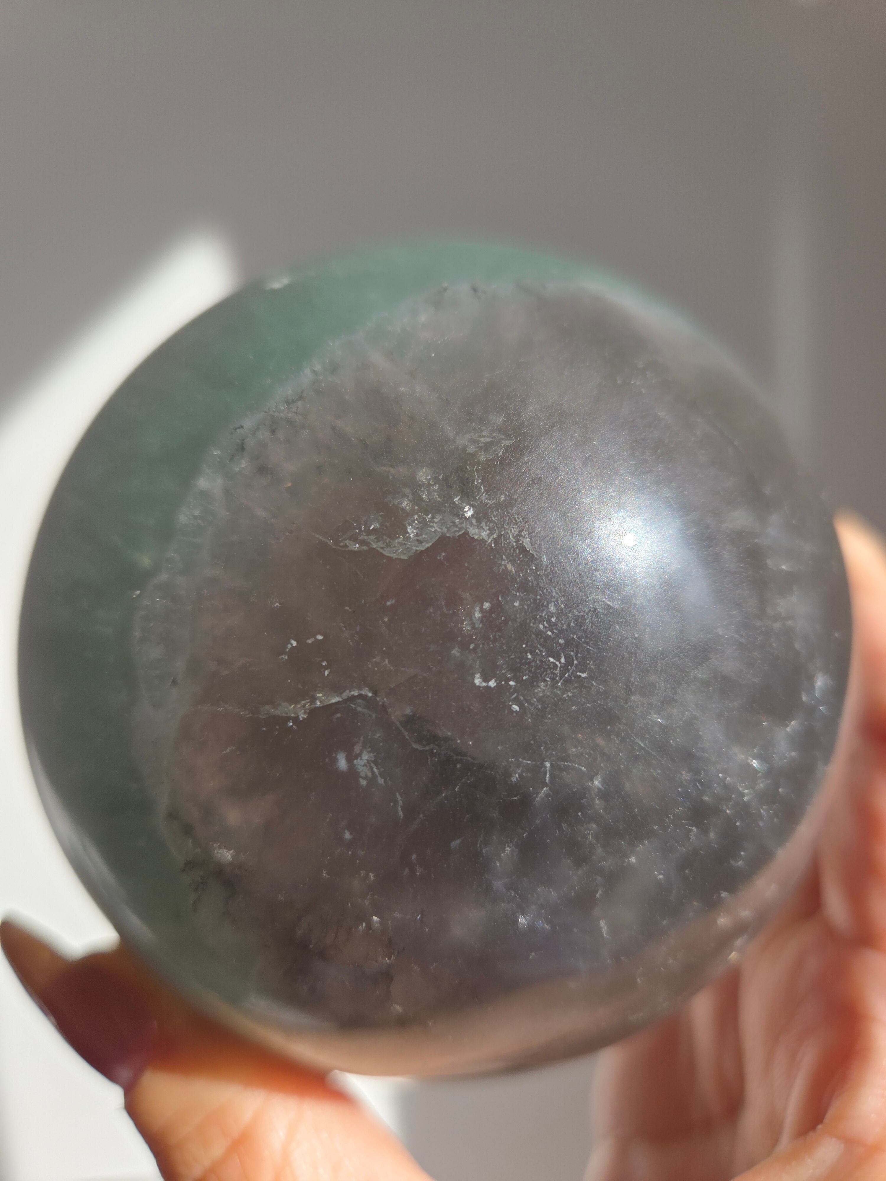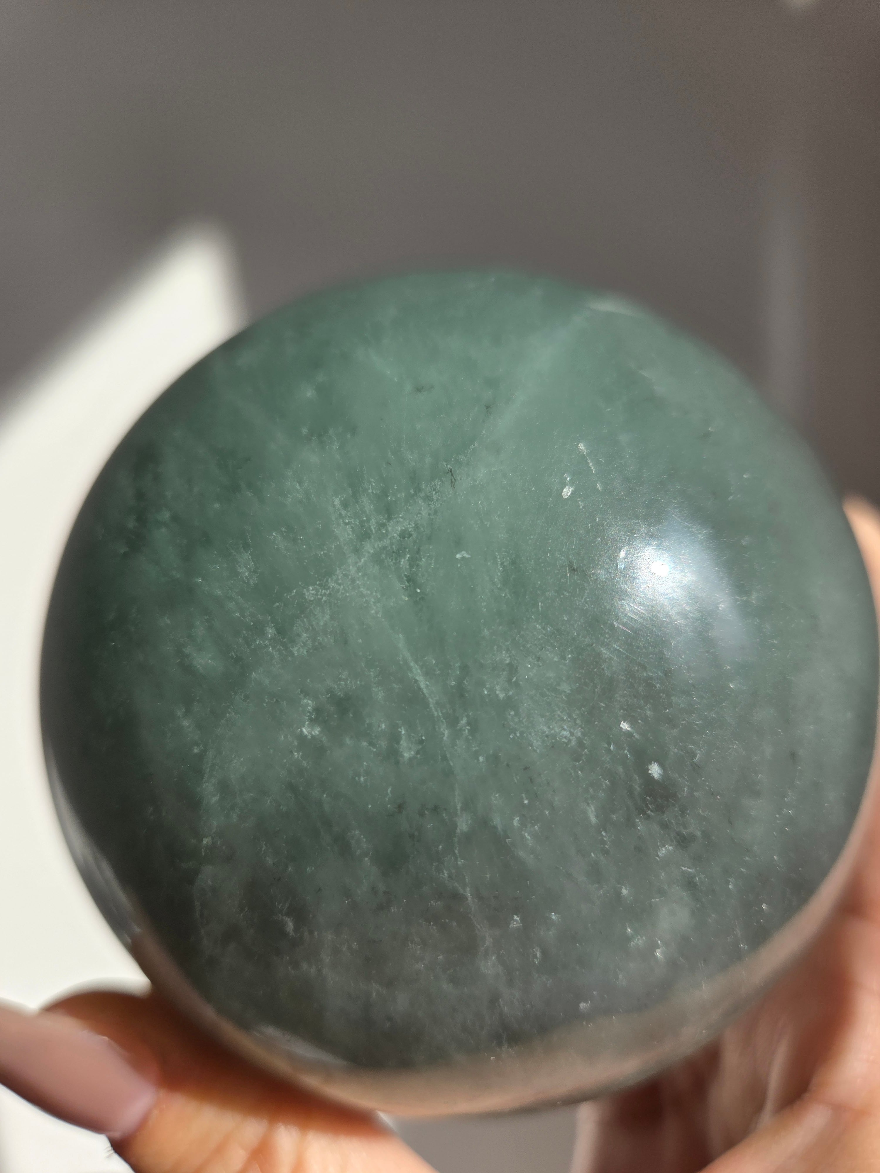 マイカの煌めきや、グリーンフローライトの層も美しいです。所々入り込んだデンドリも可愛いらしいビックサイズの迫力あるスフィアです。